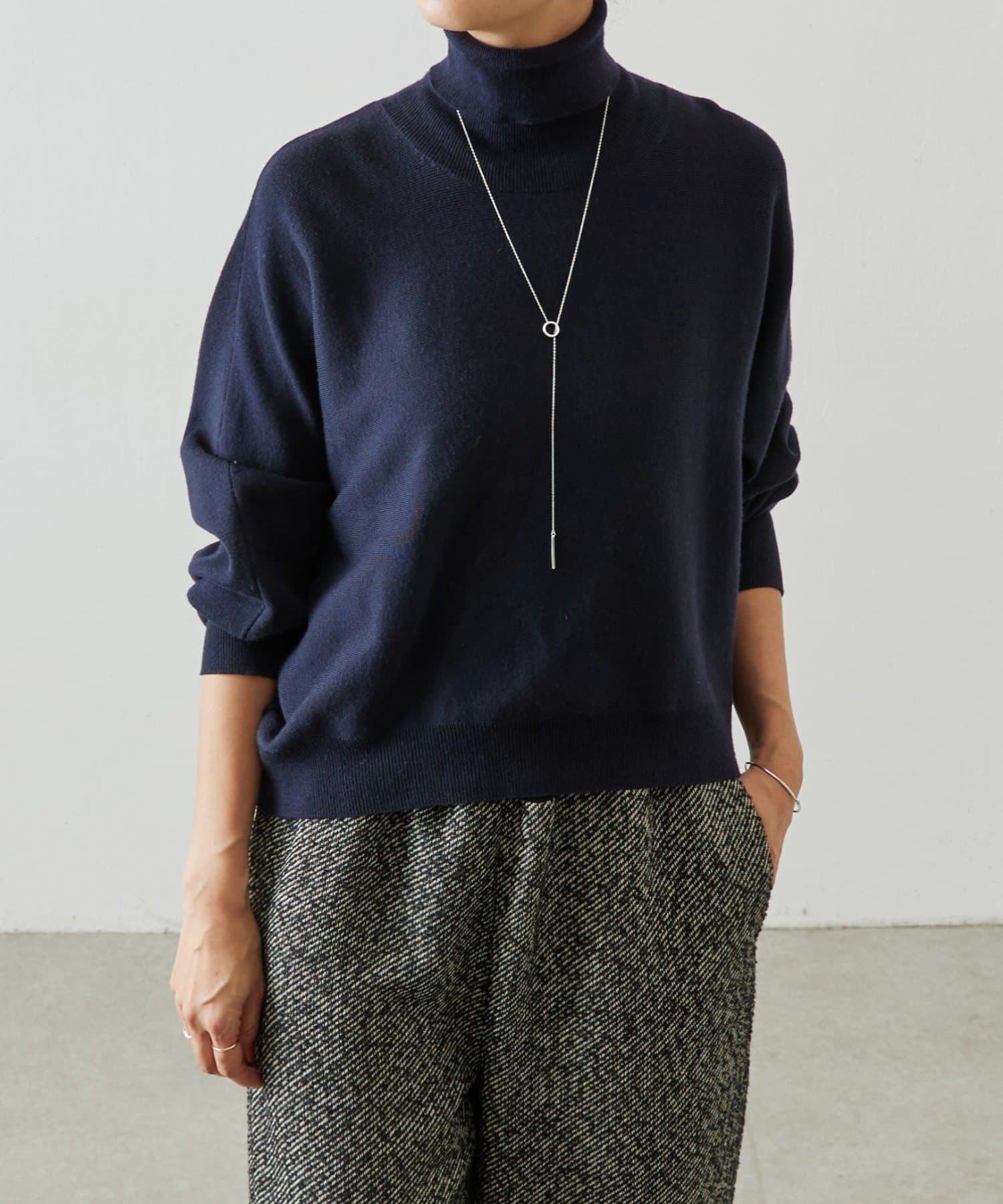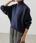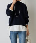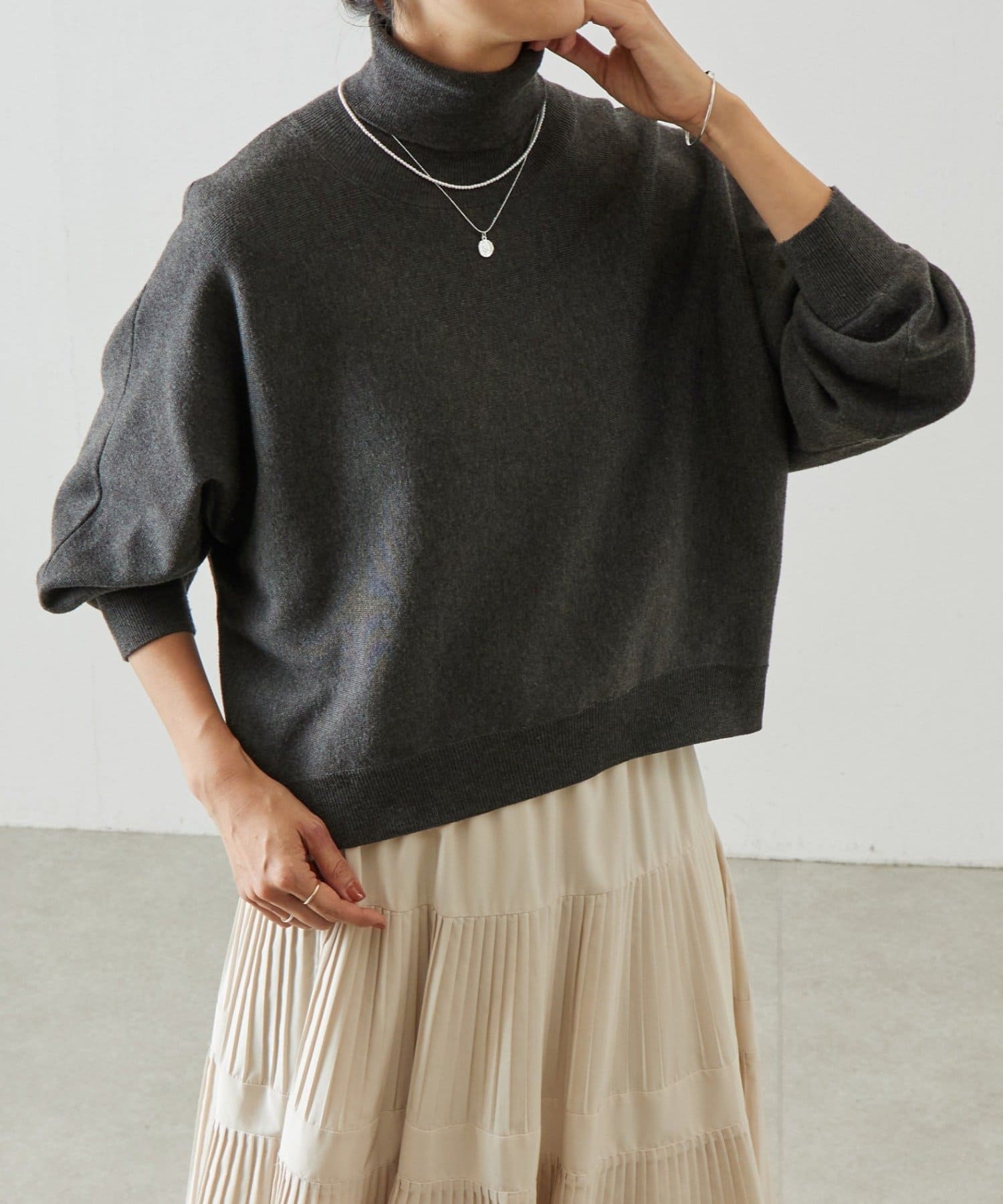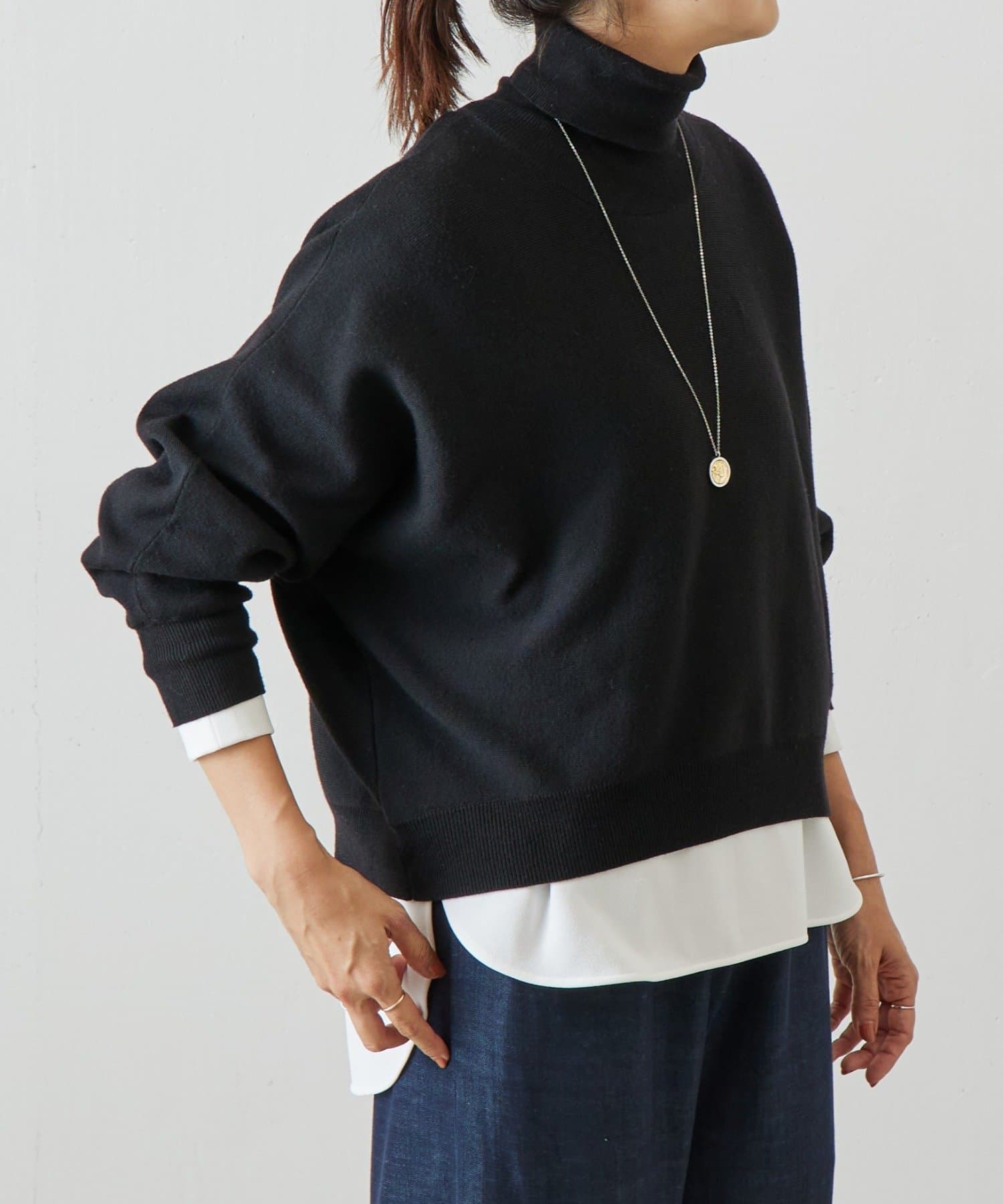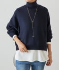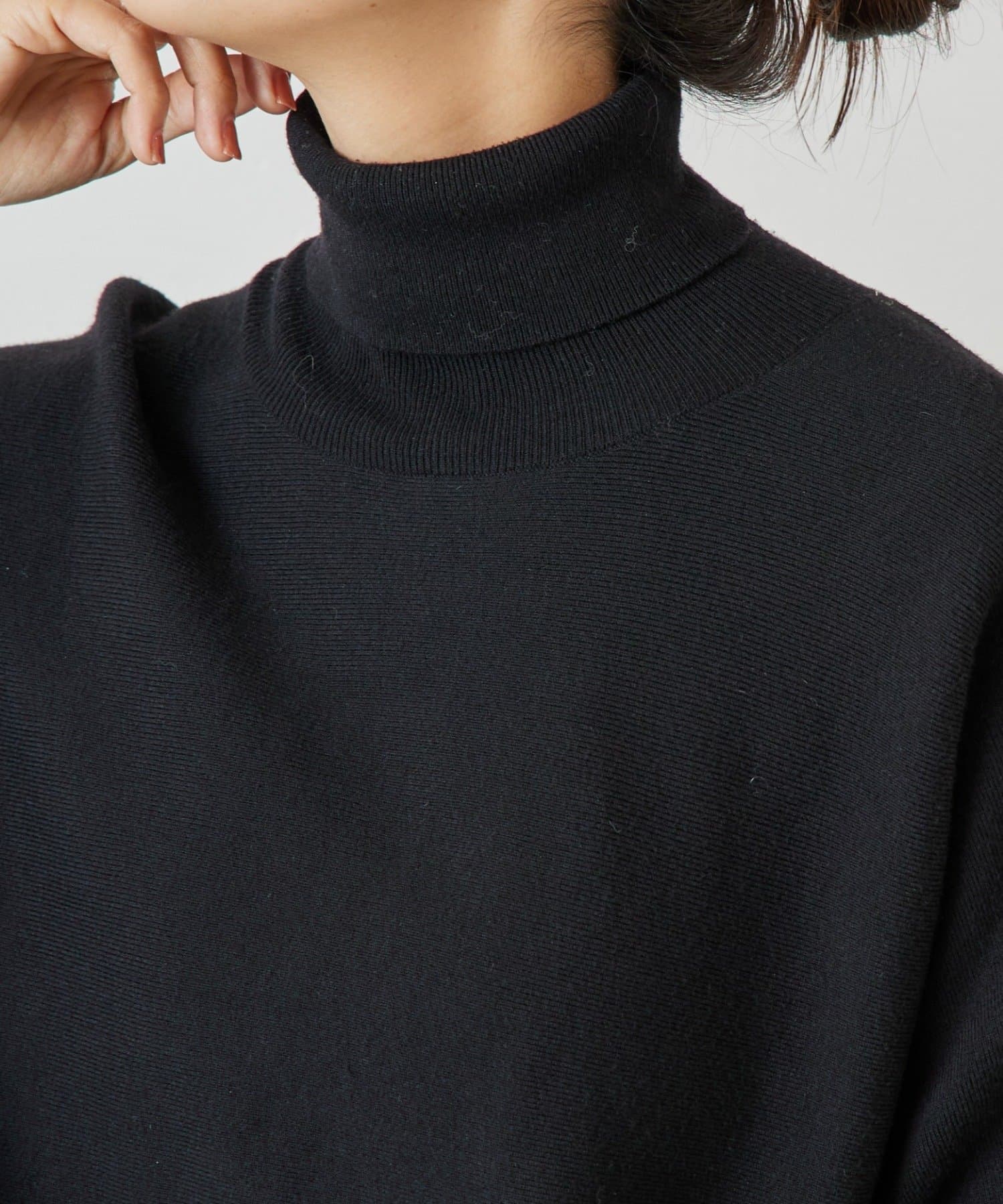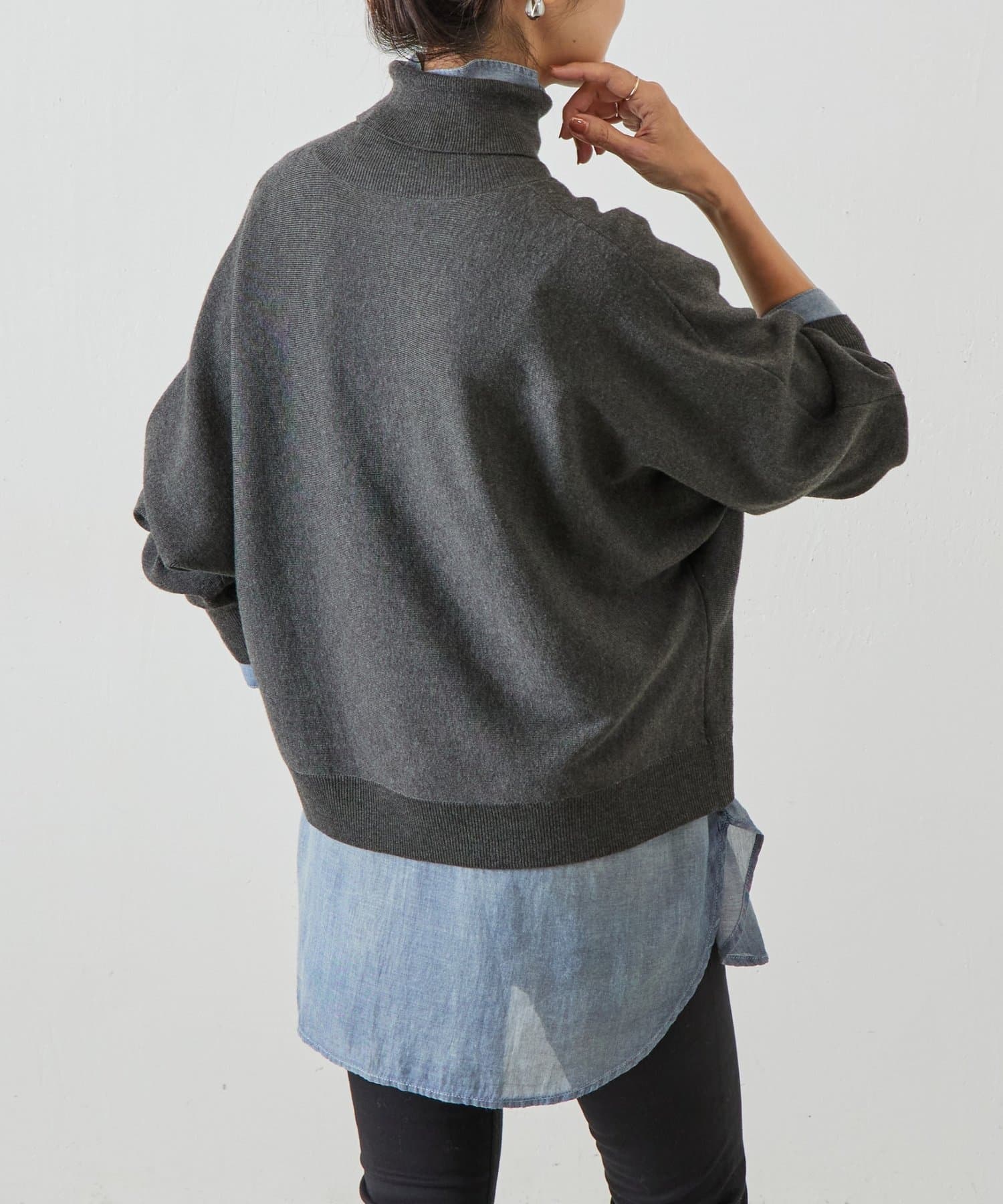 ベーシックな形で着回しやすい、ハイネックのドルマンニット。