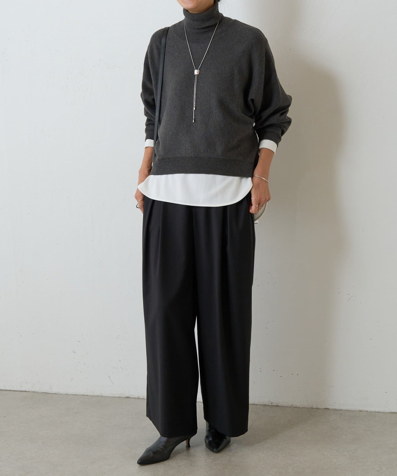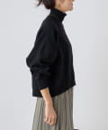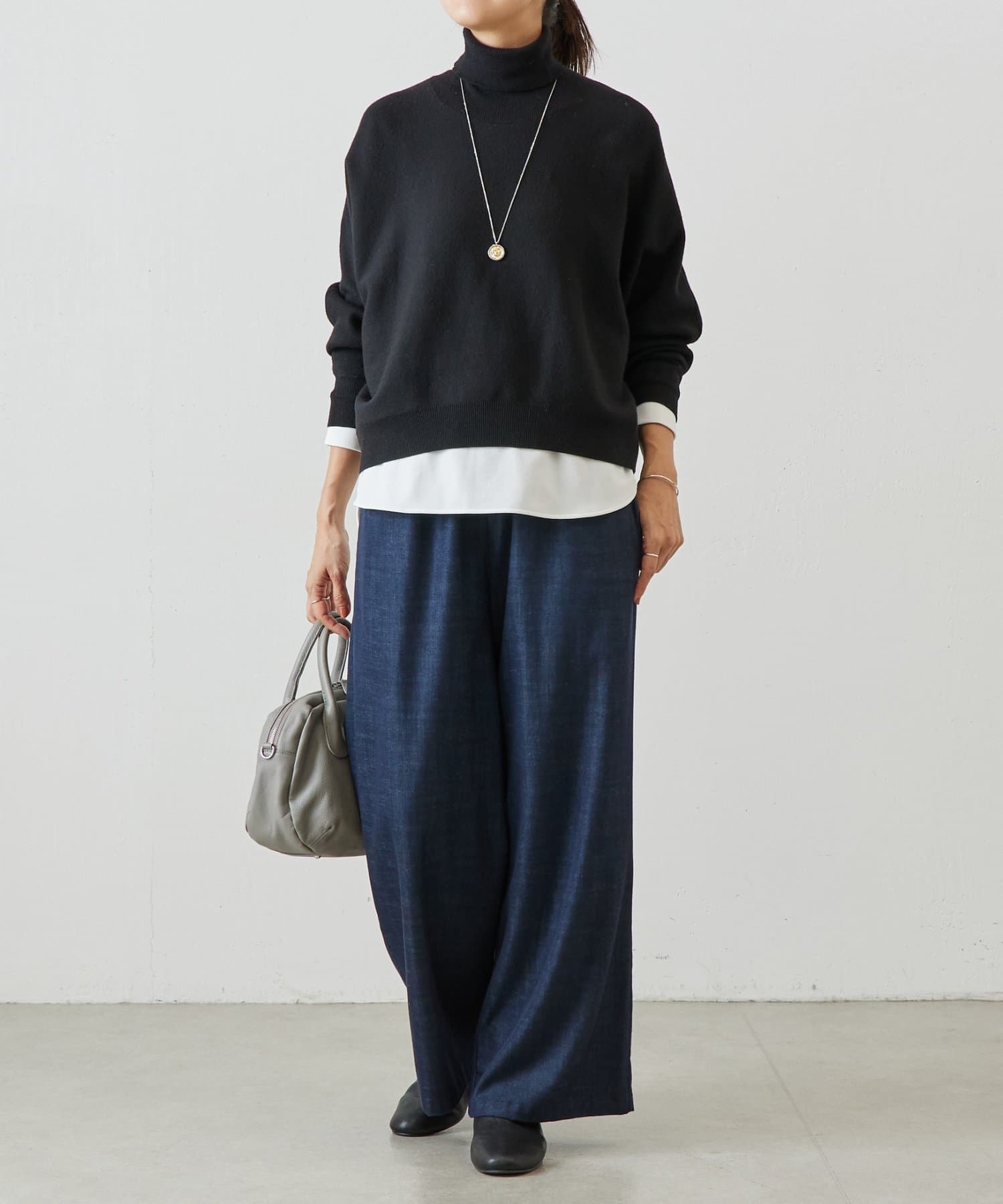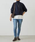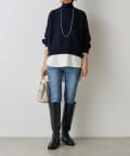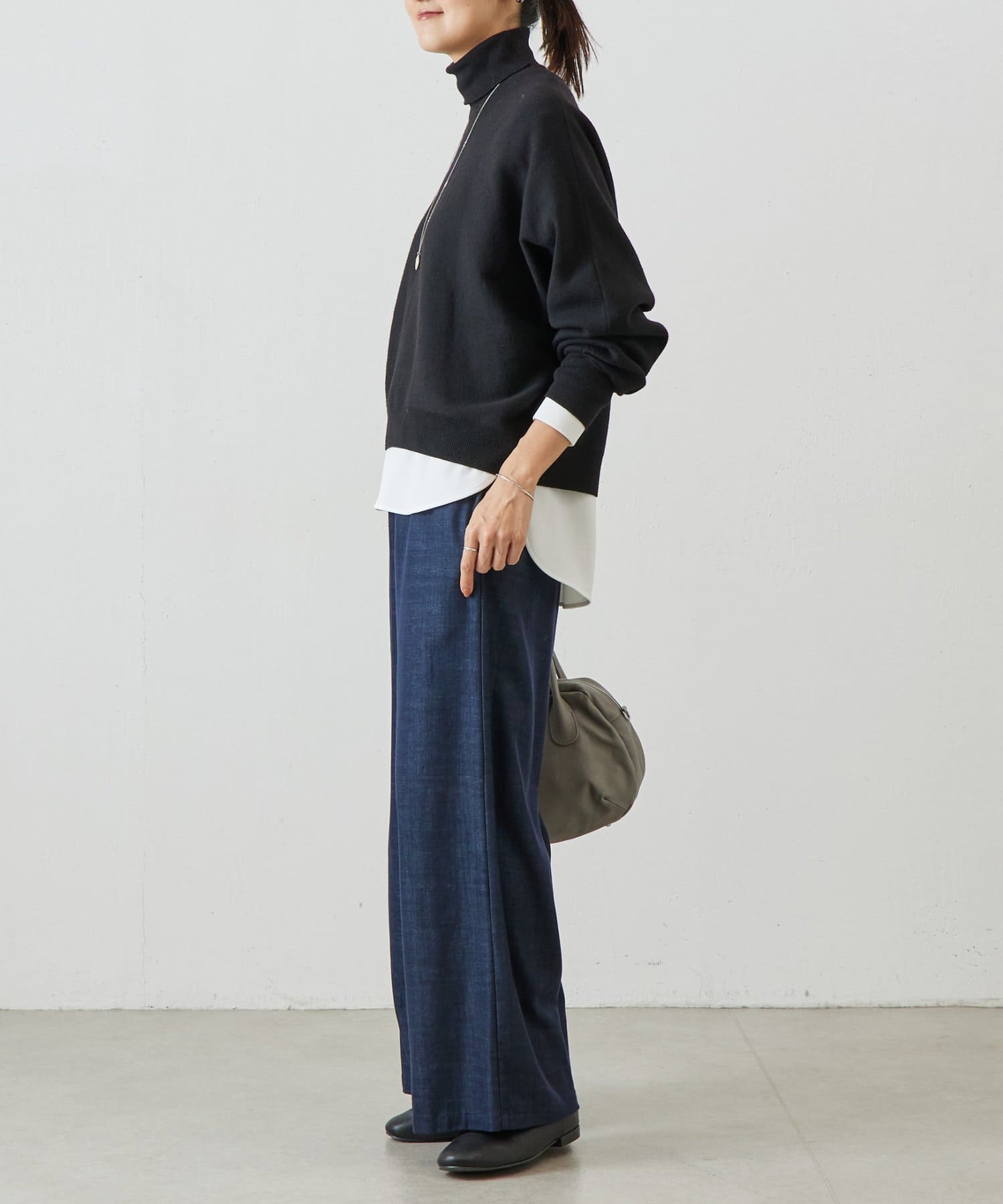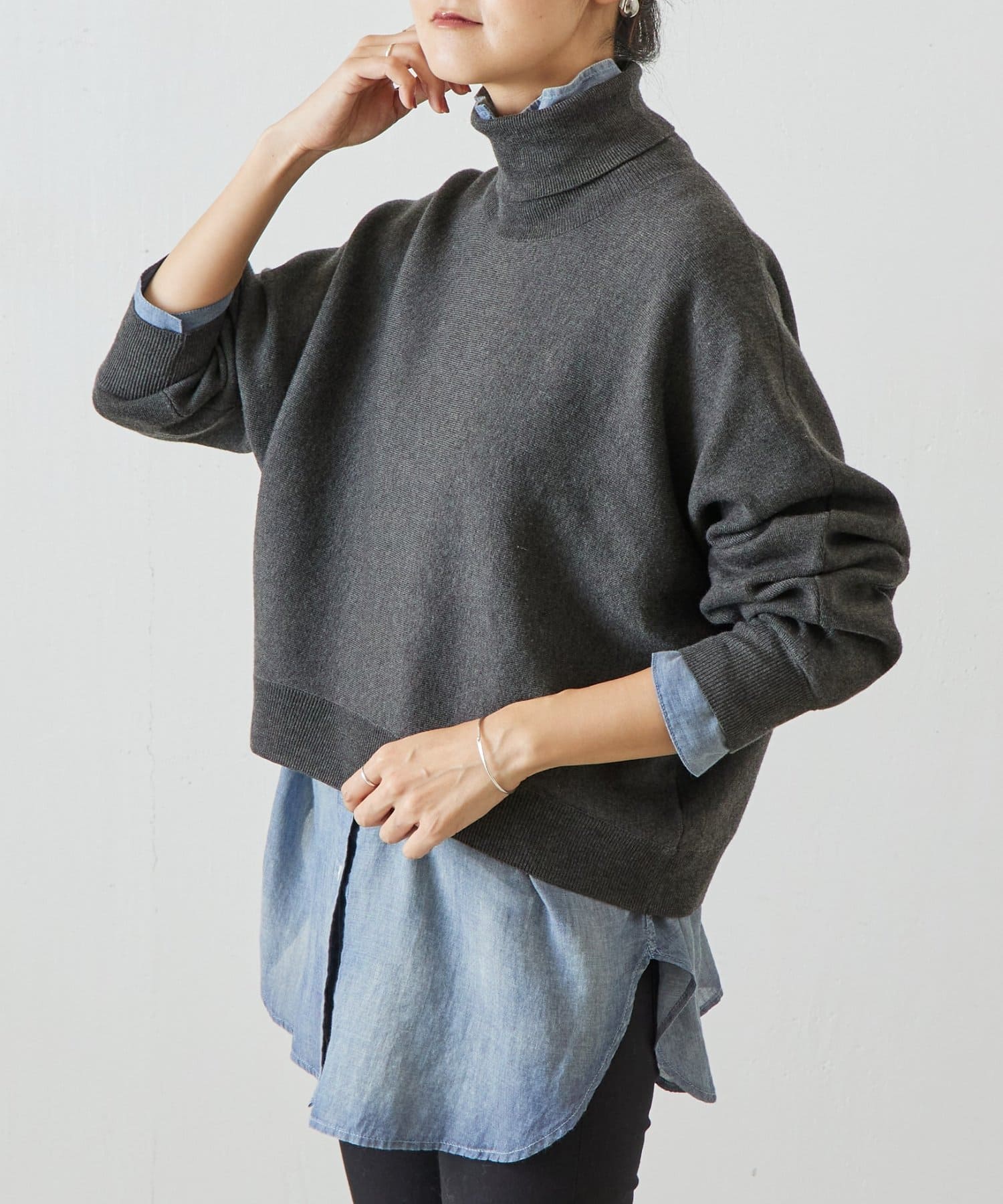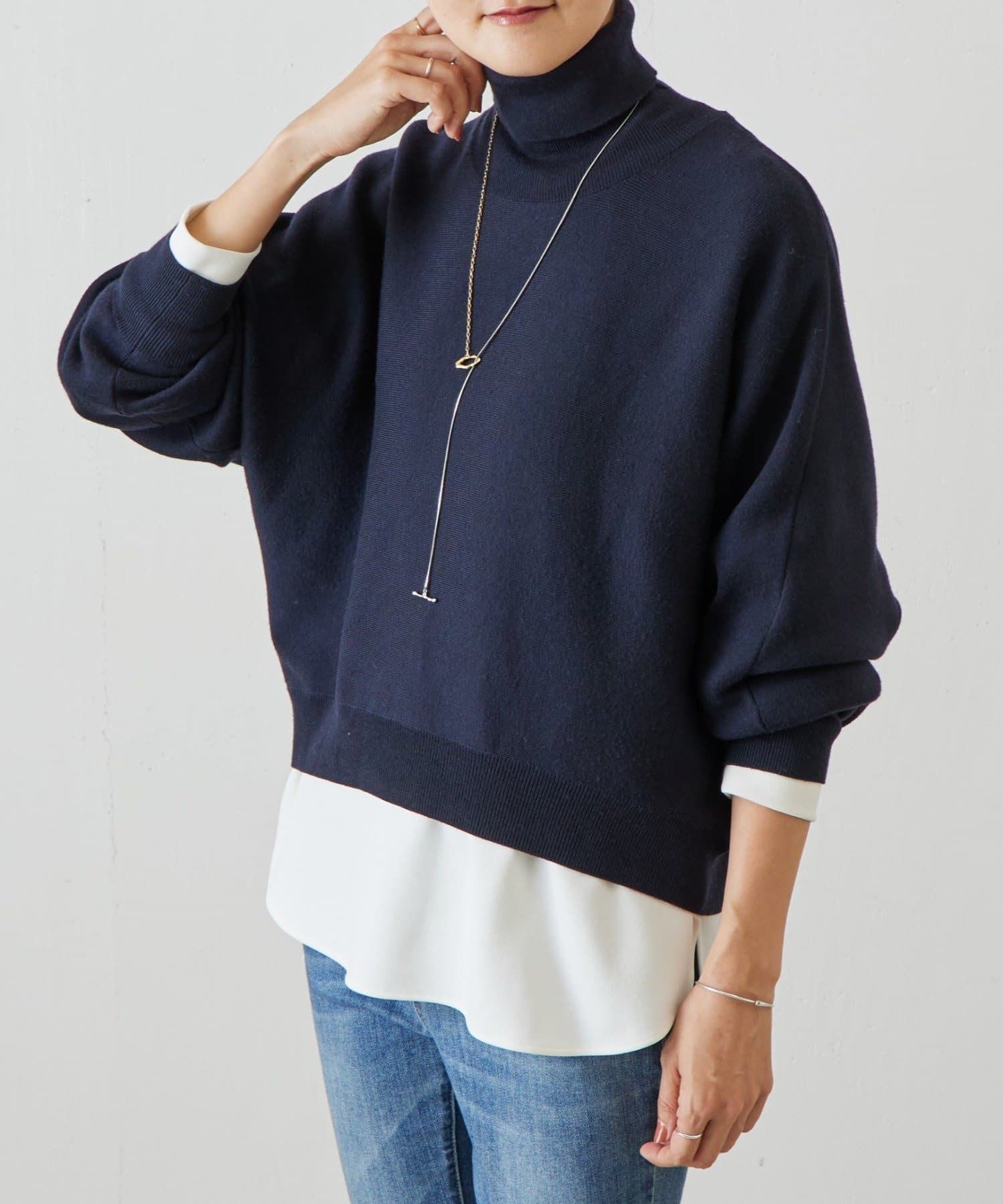 ベーシックな形で着回しやすい、ハイネックのドルマンニット。