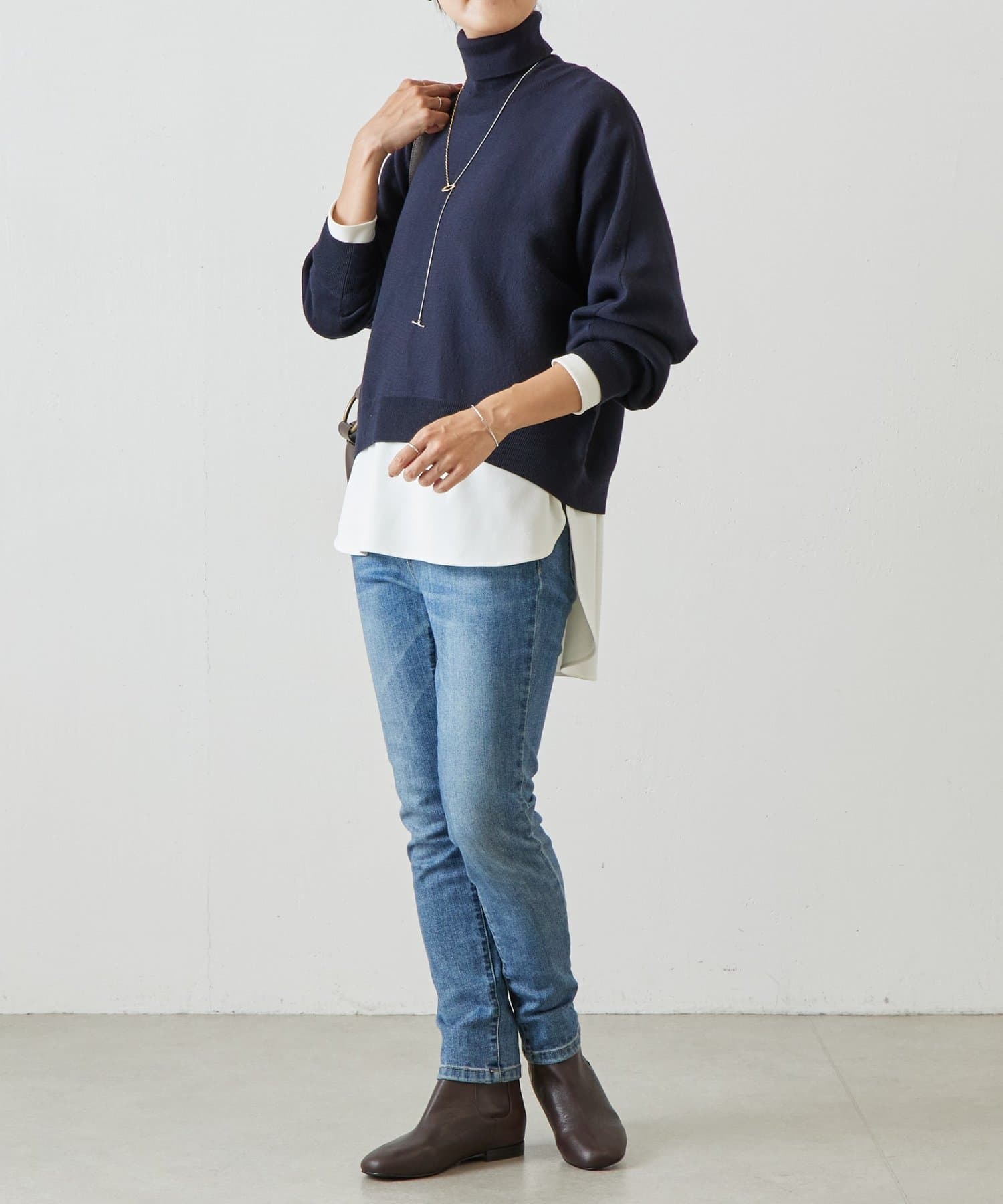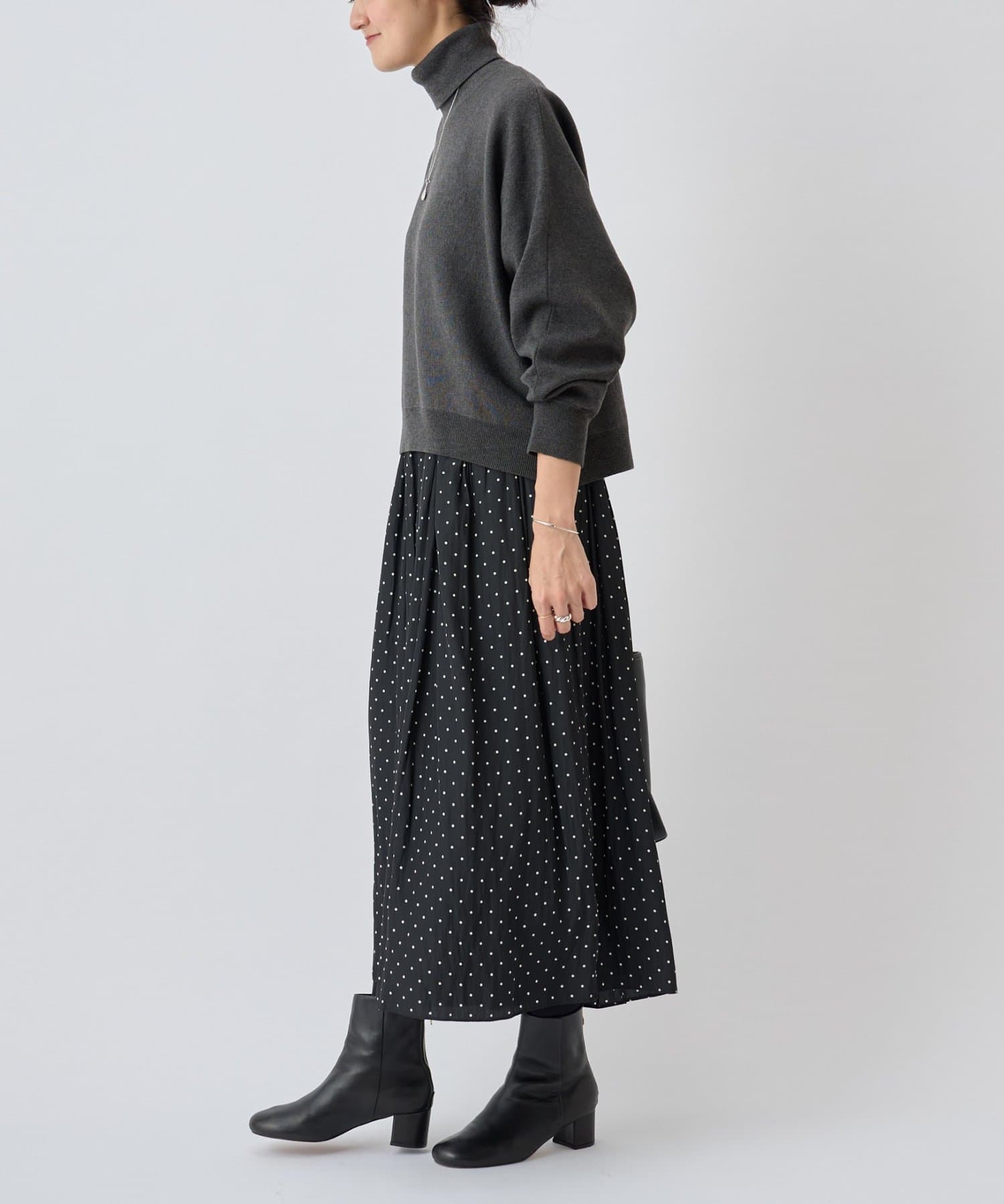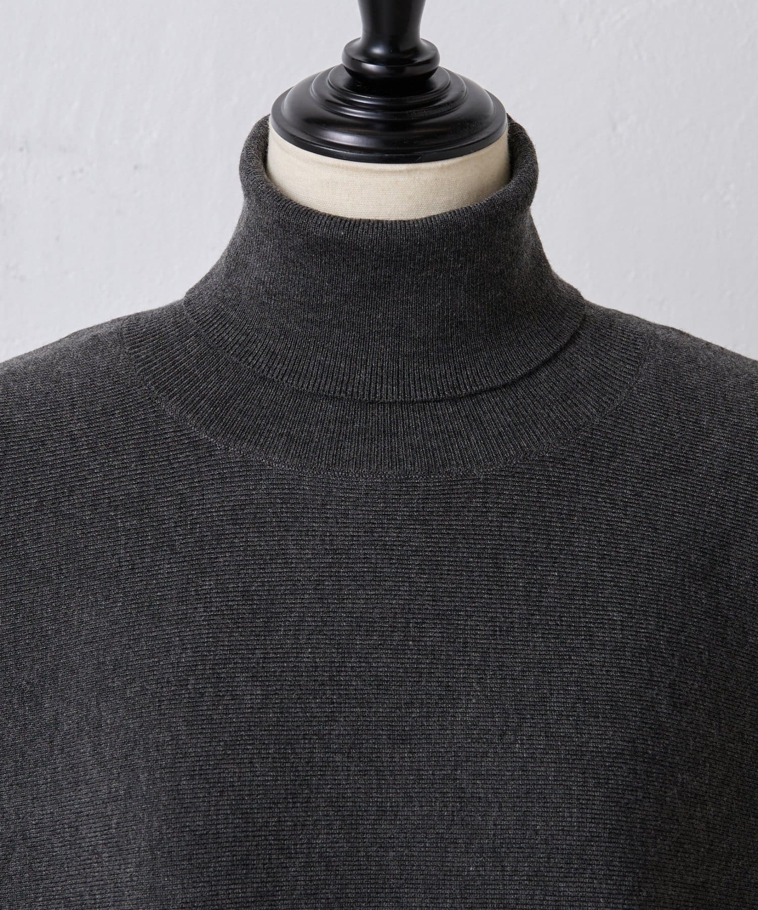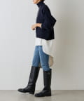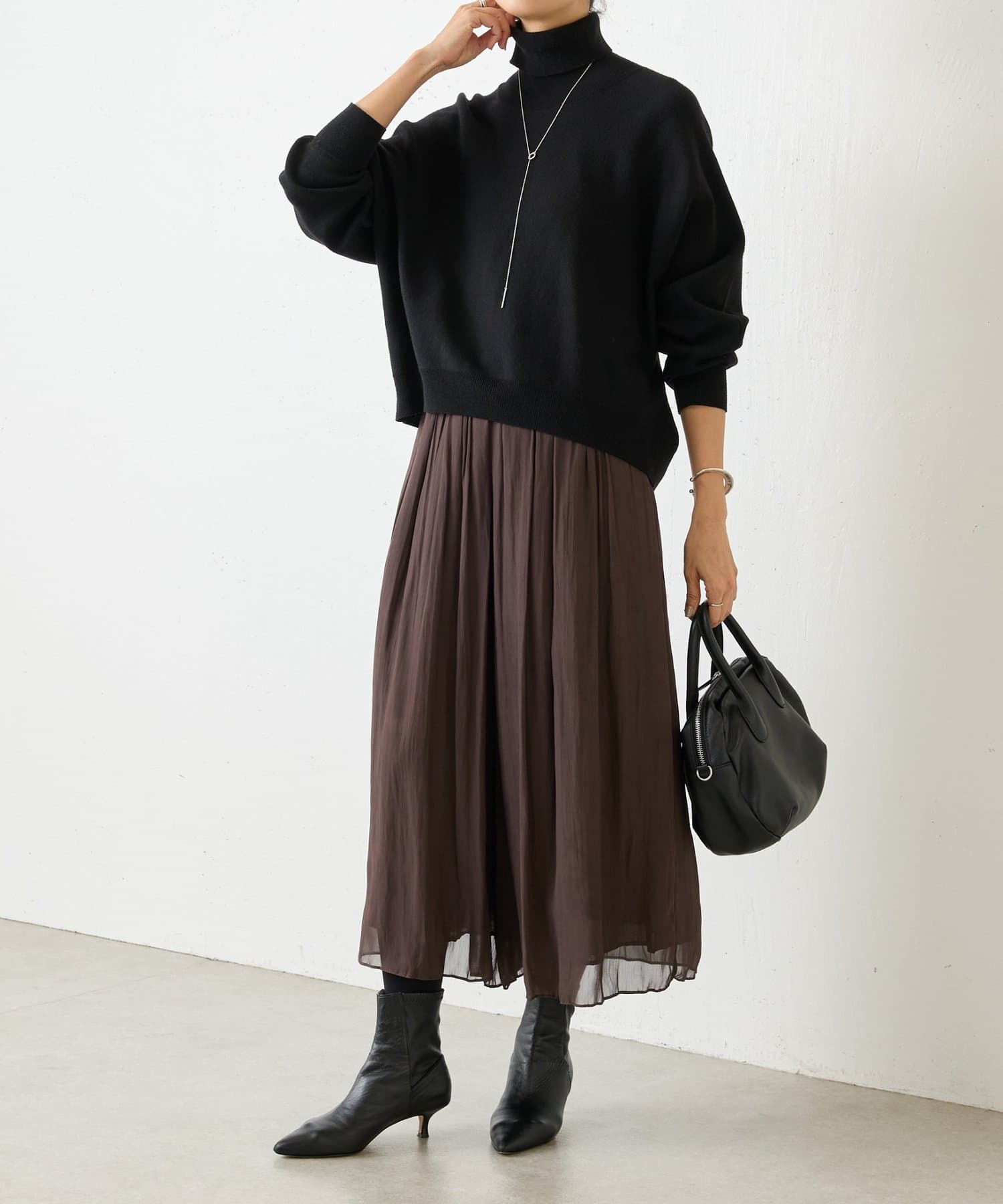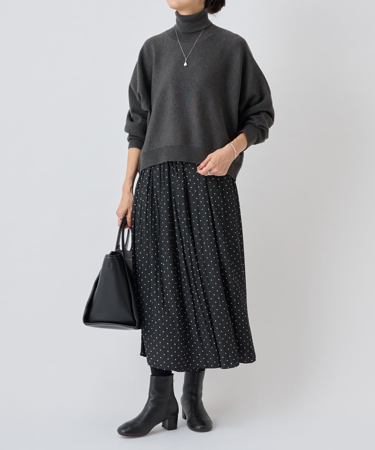 ベーシックな形で着回しやすい、ハイネックのドルマンニット。