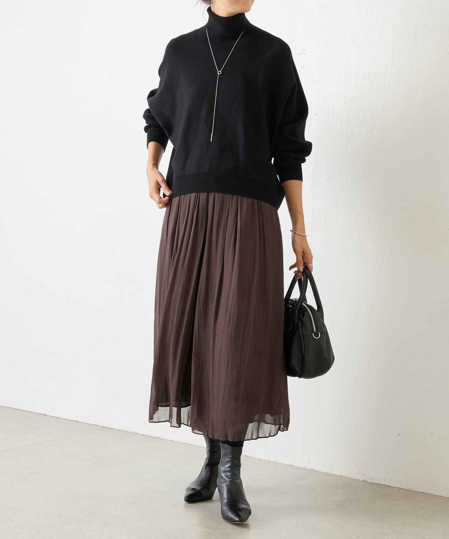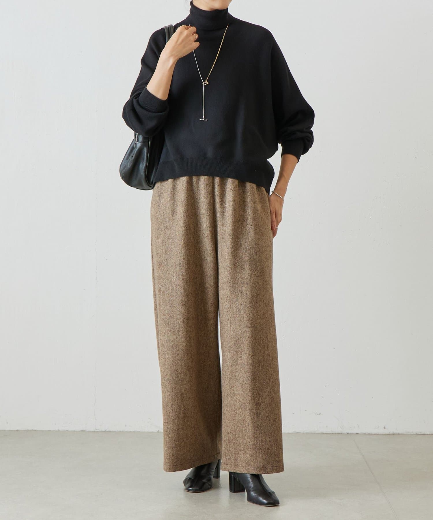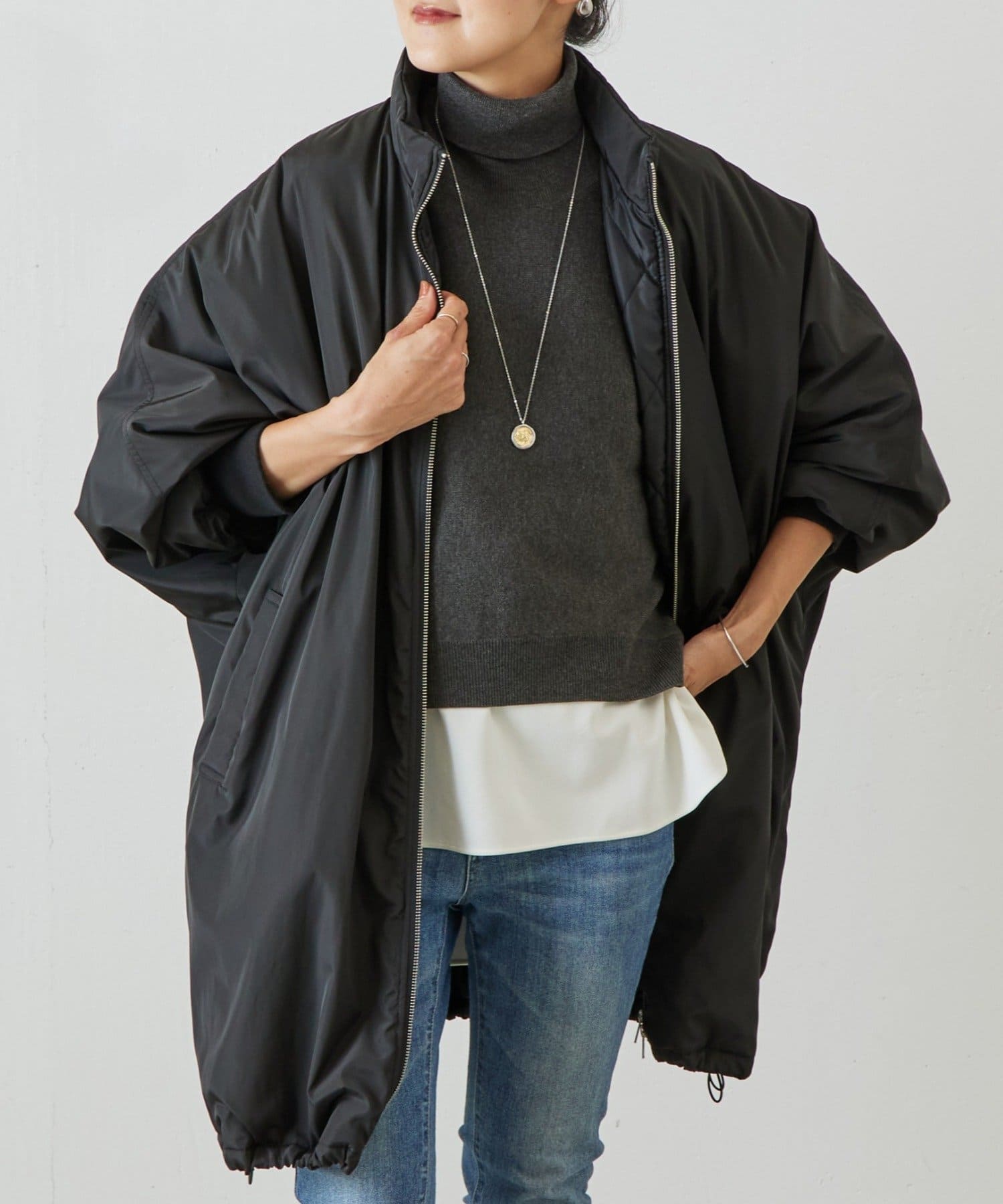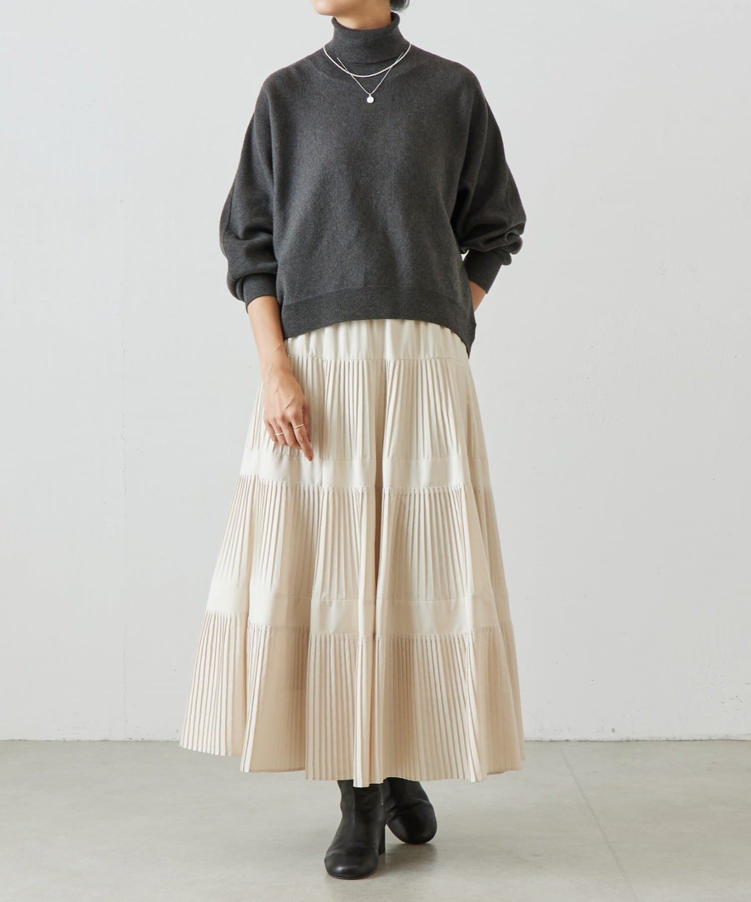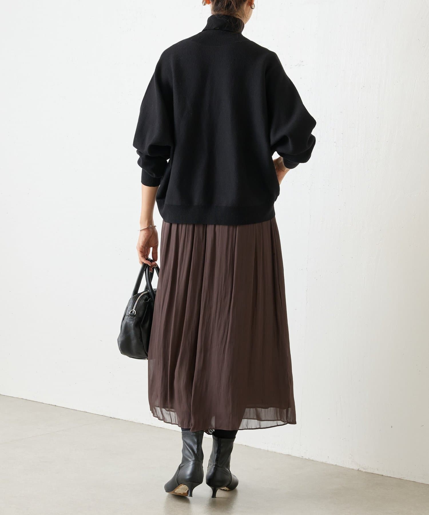 ベーシックな形で着回しやすい、ハイネックのドルマンニット。