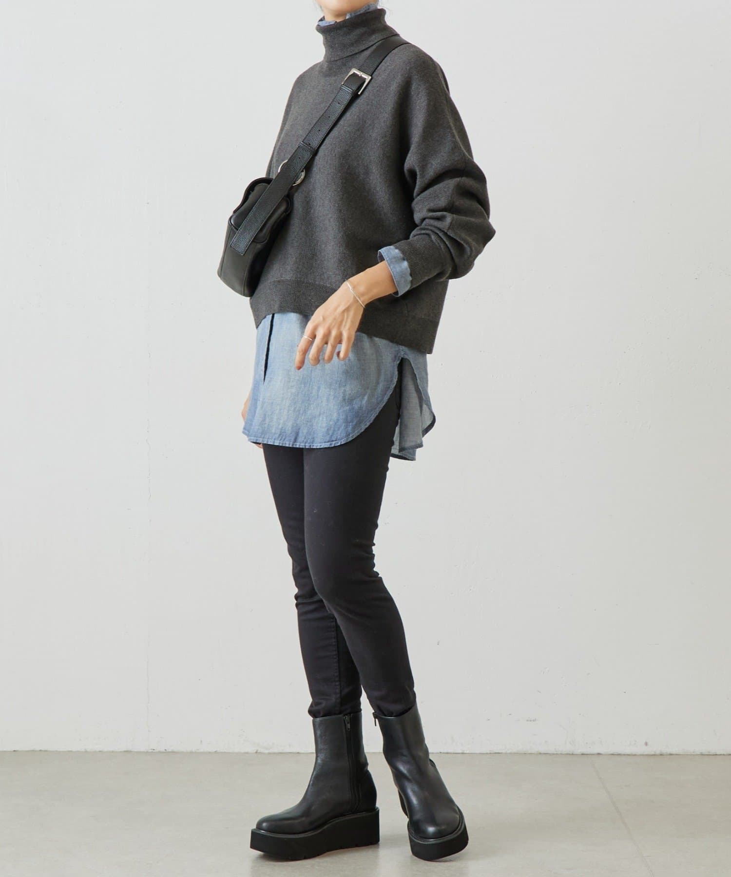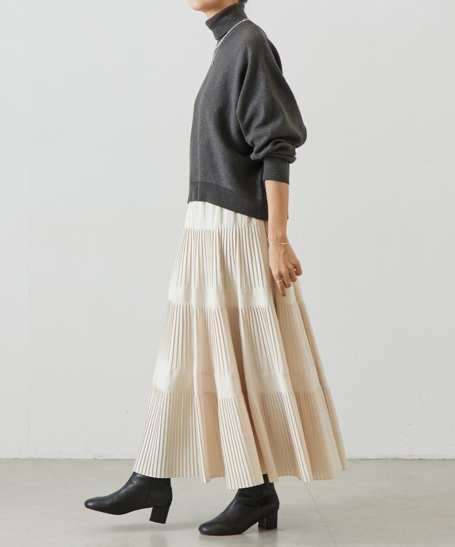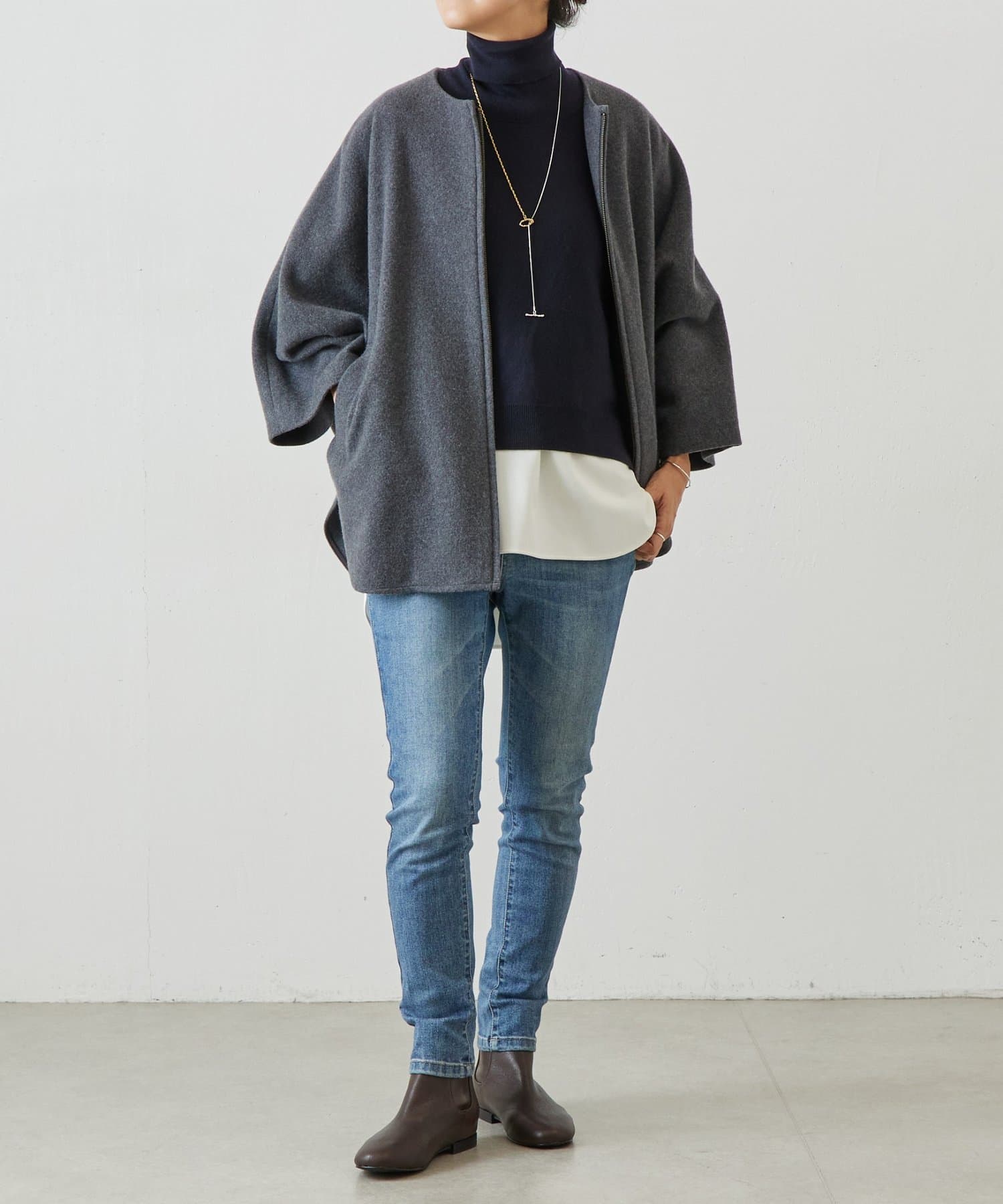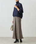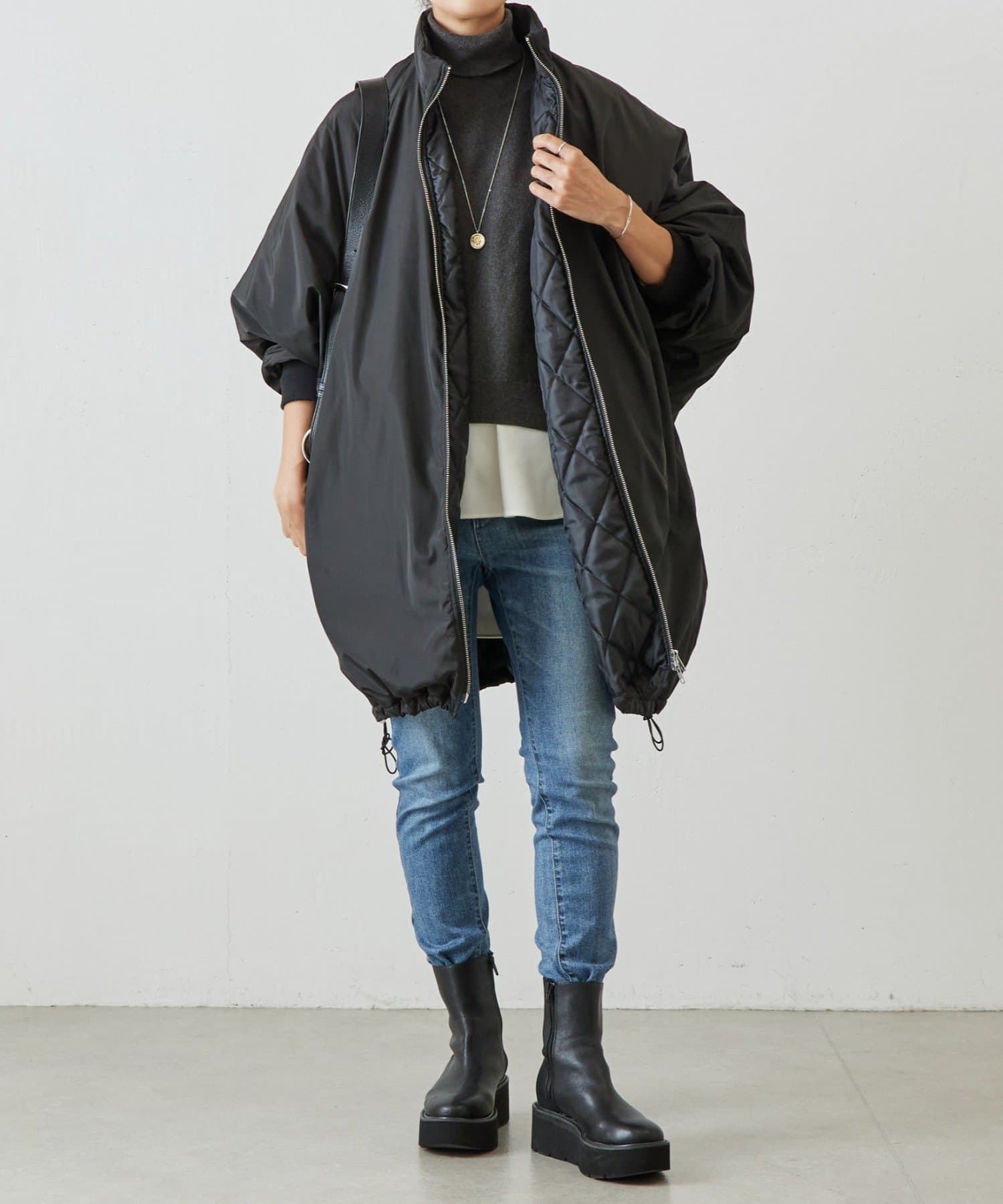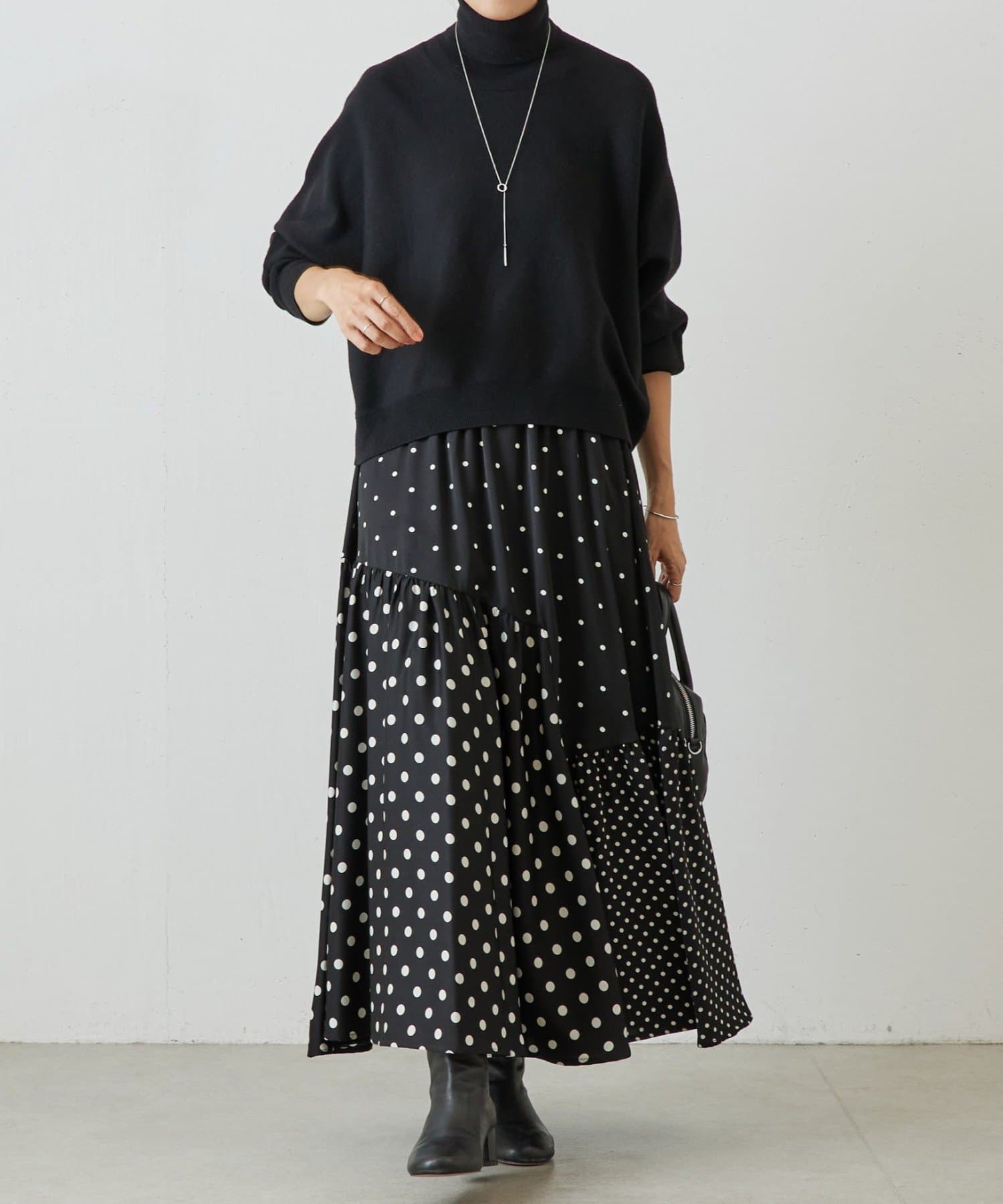 ベーシックな形で着回しやすい、ハイネックのドルマンニット。