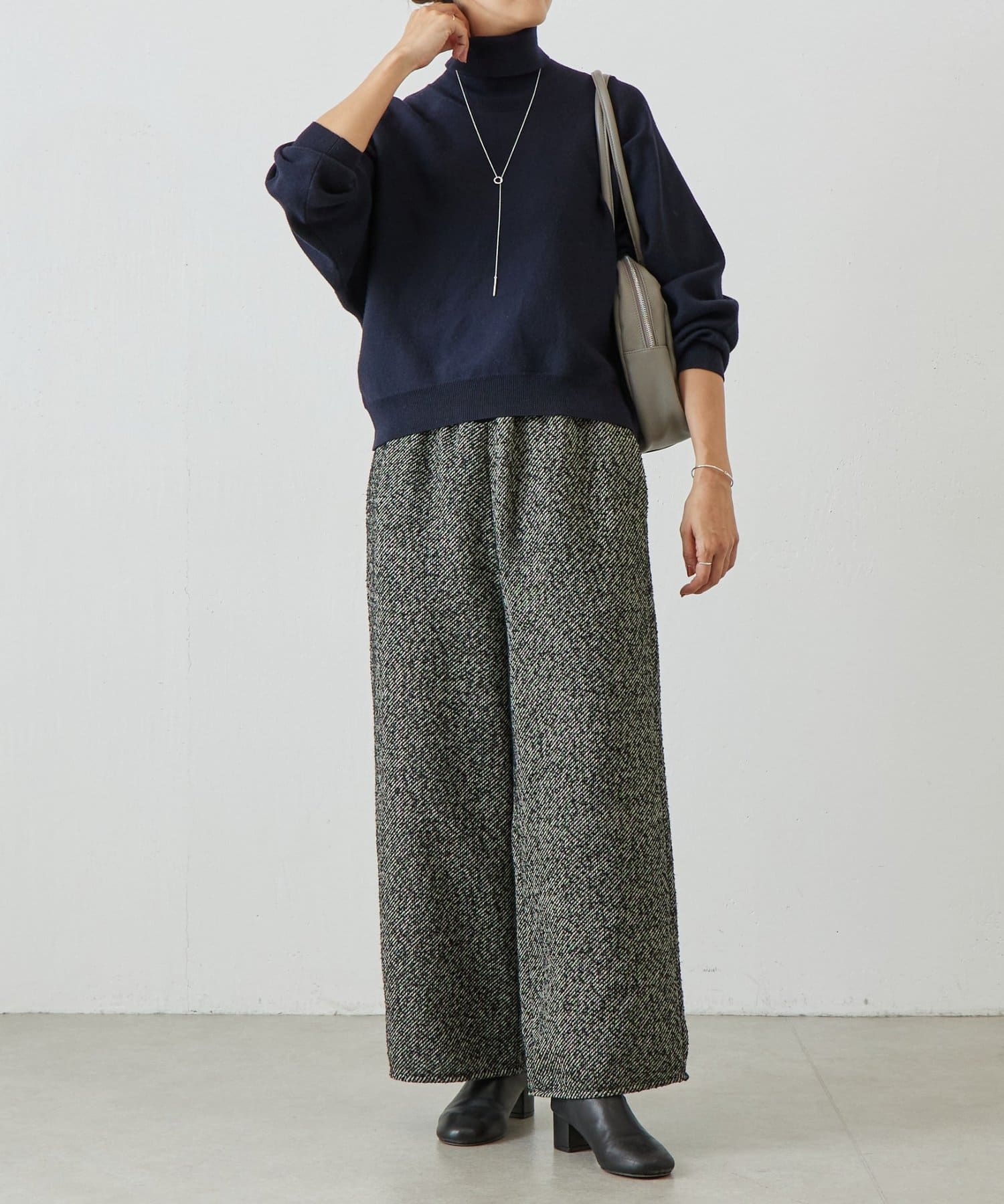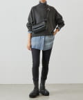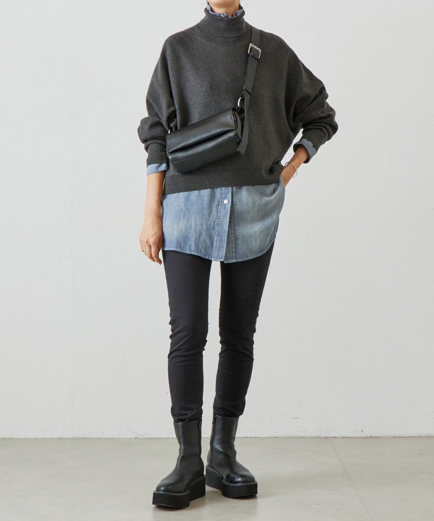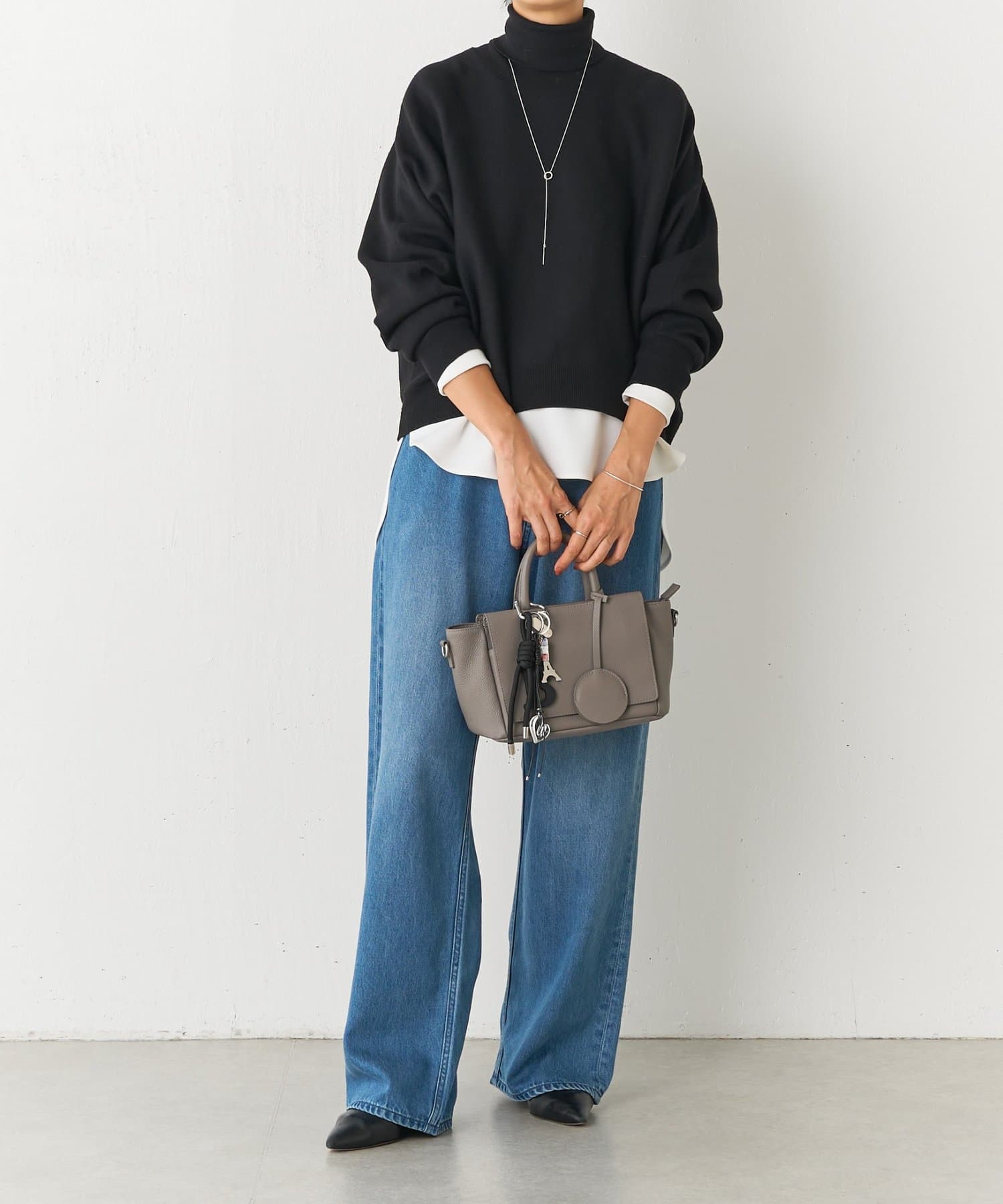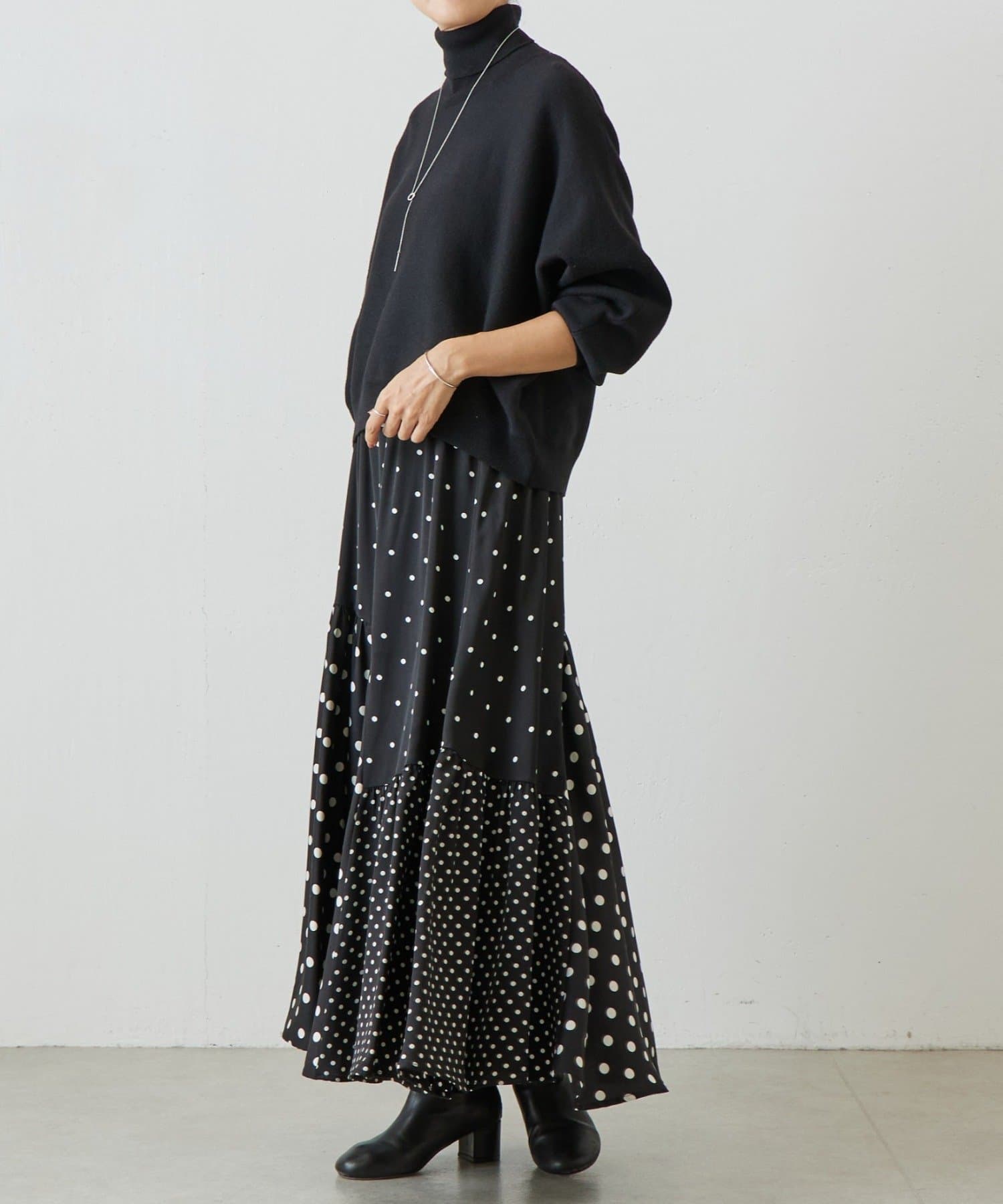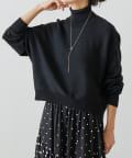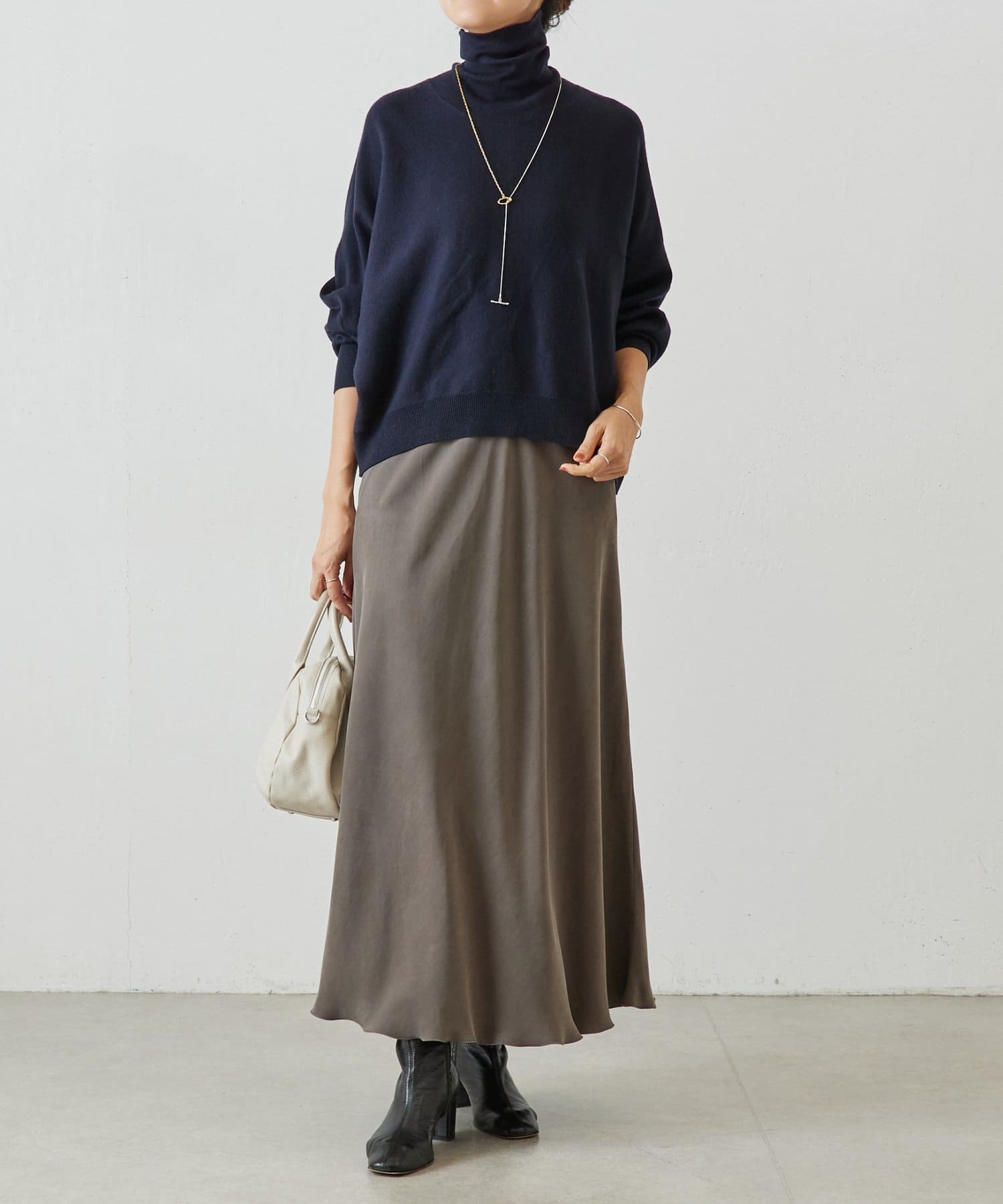 ベーシックな形で着回しやすい、ハイネックのドルマンニット。