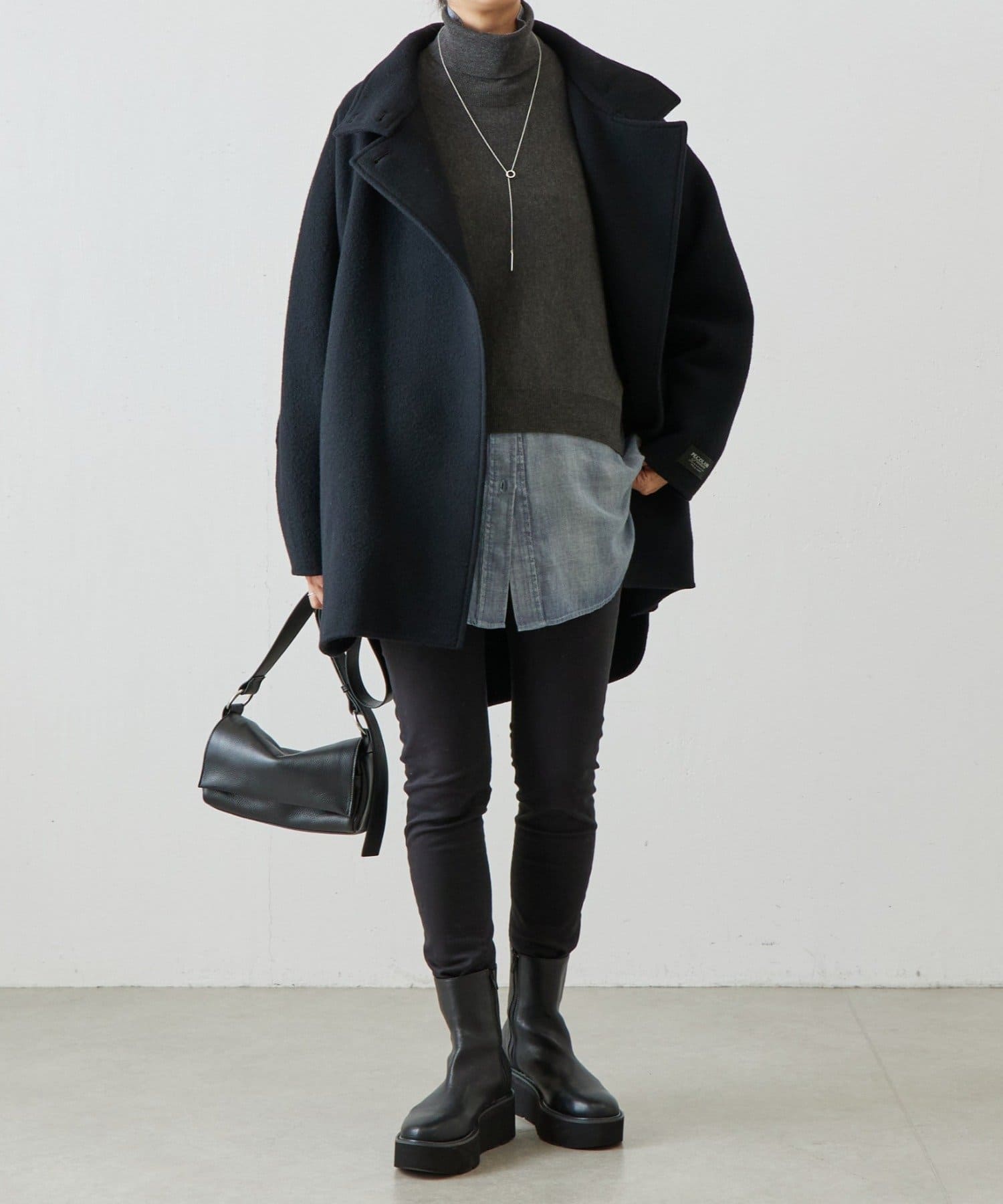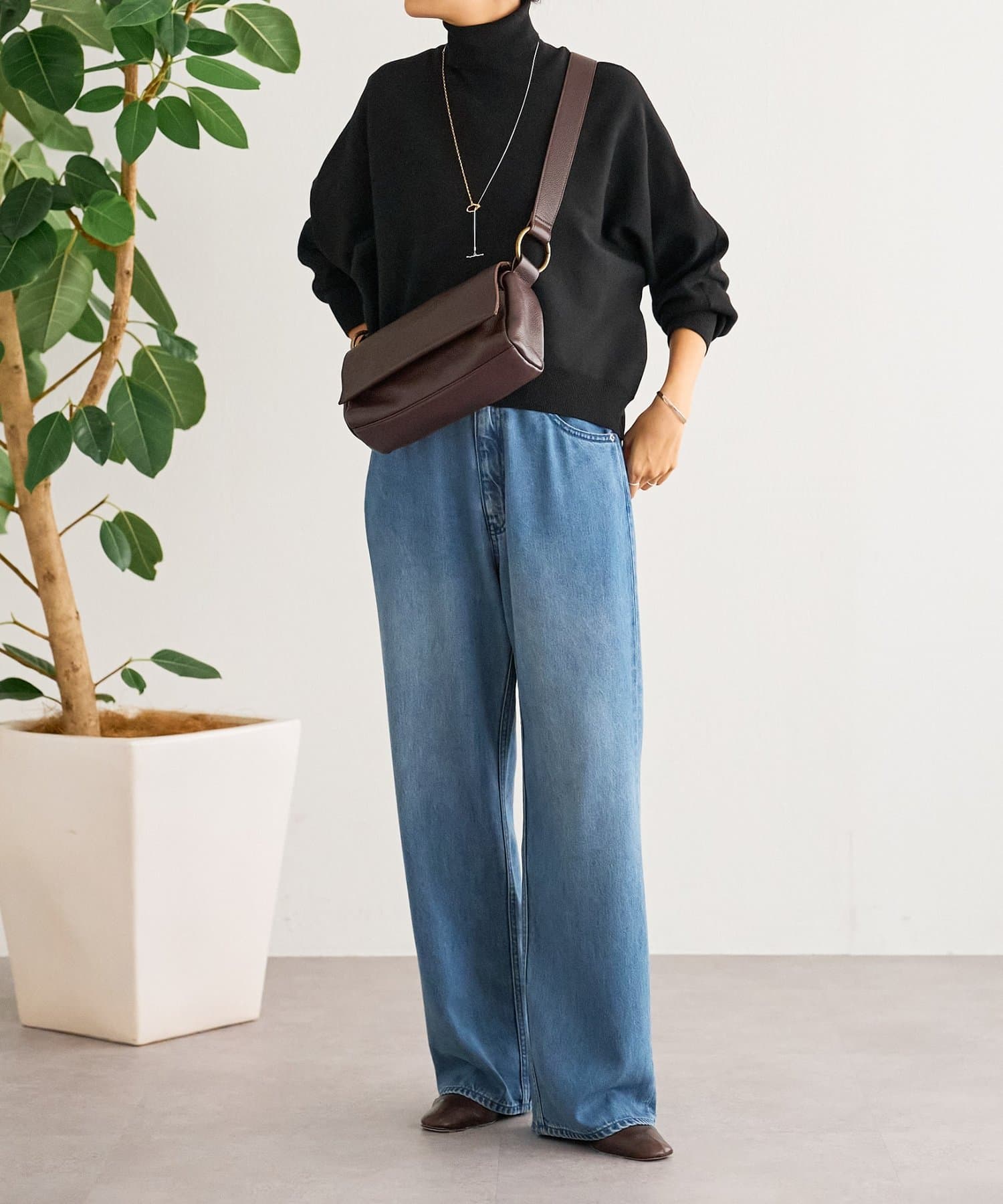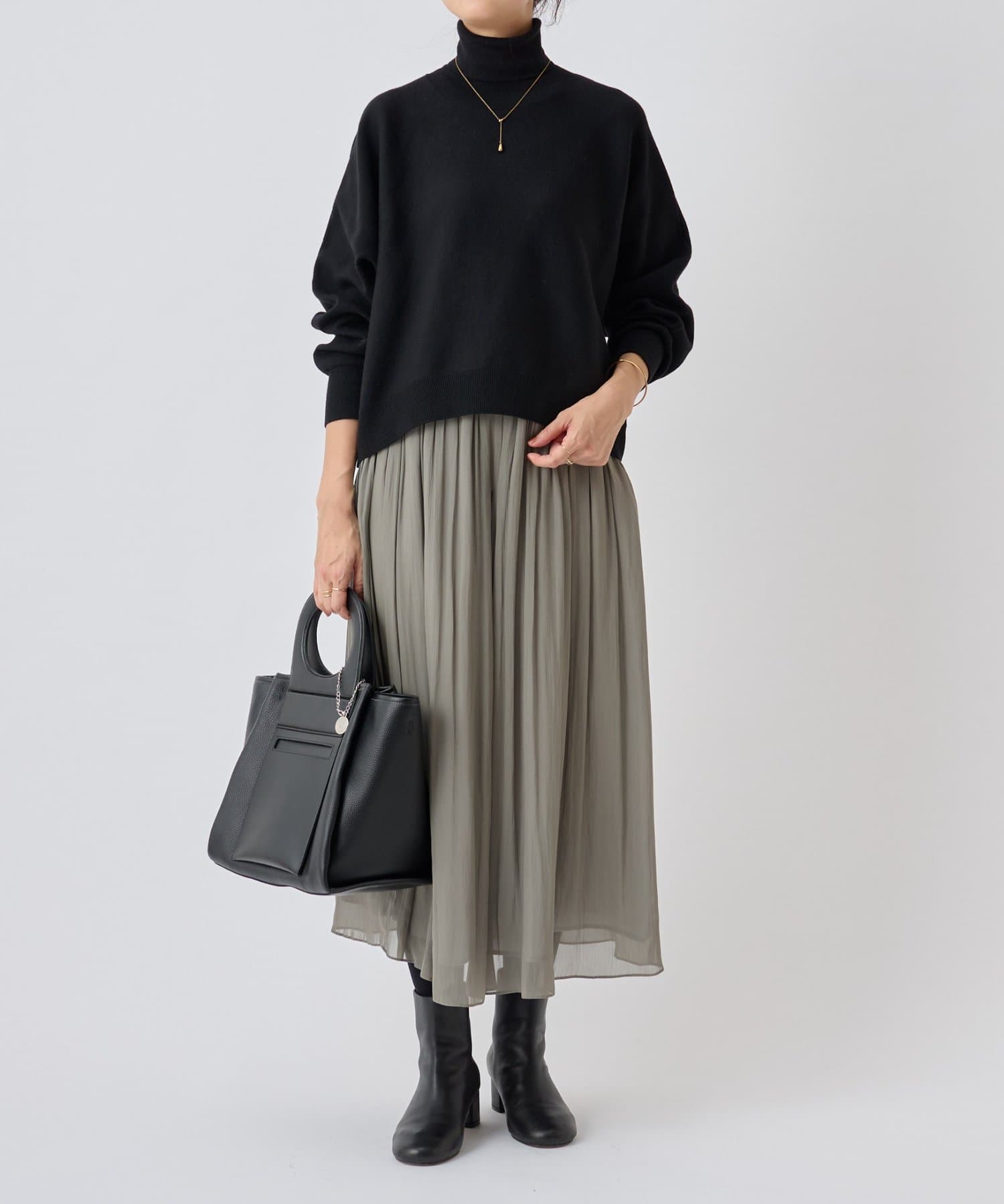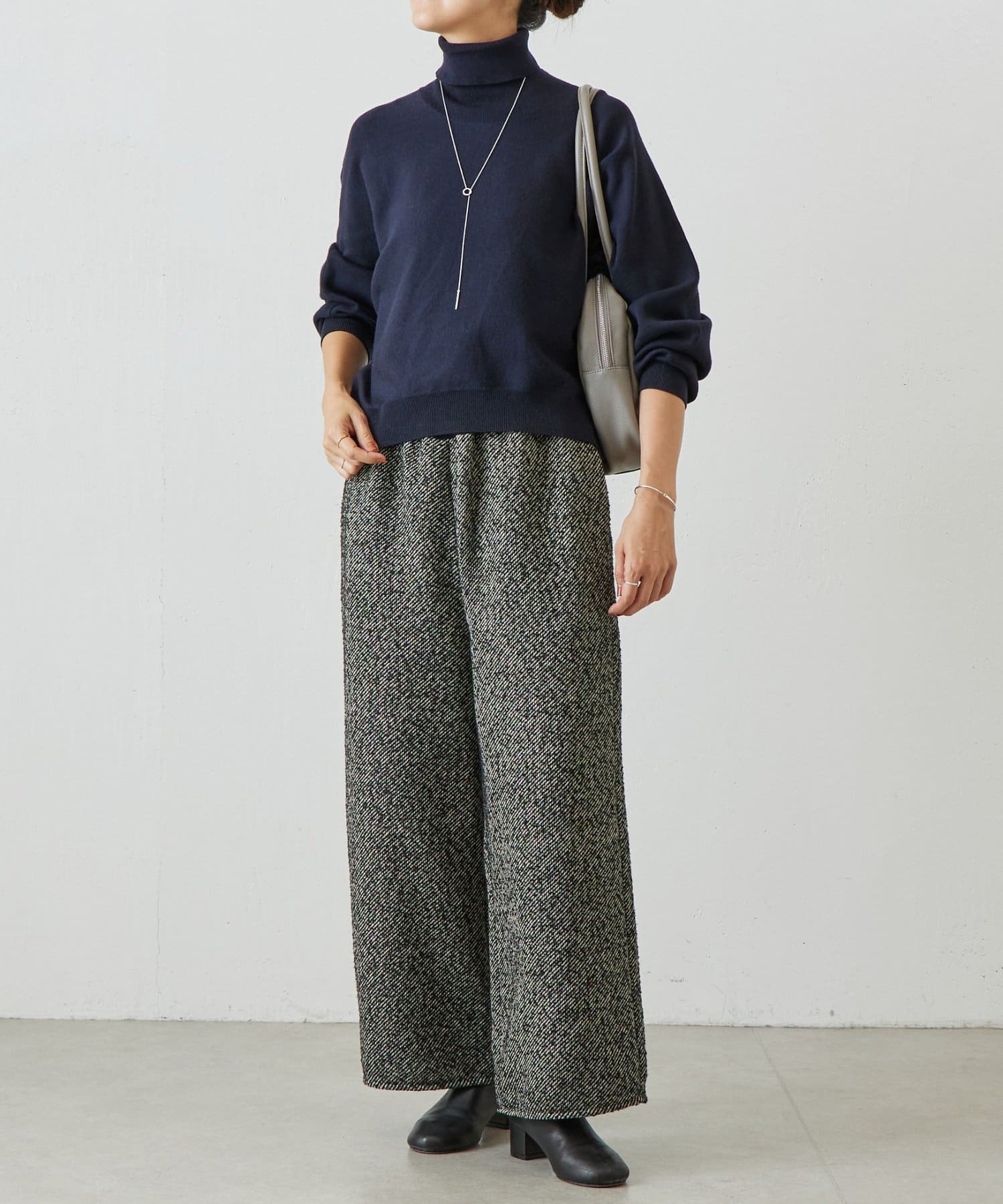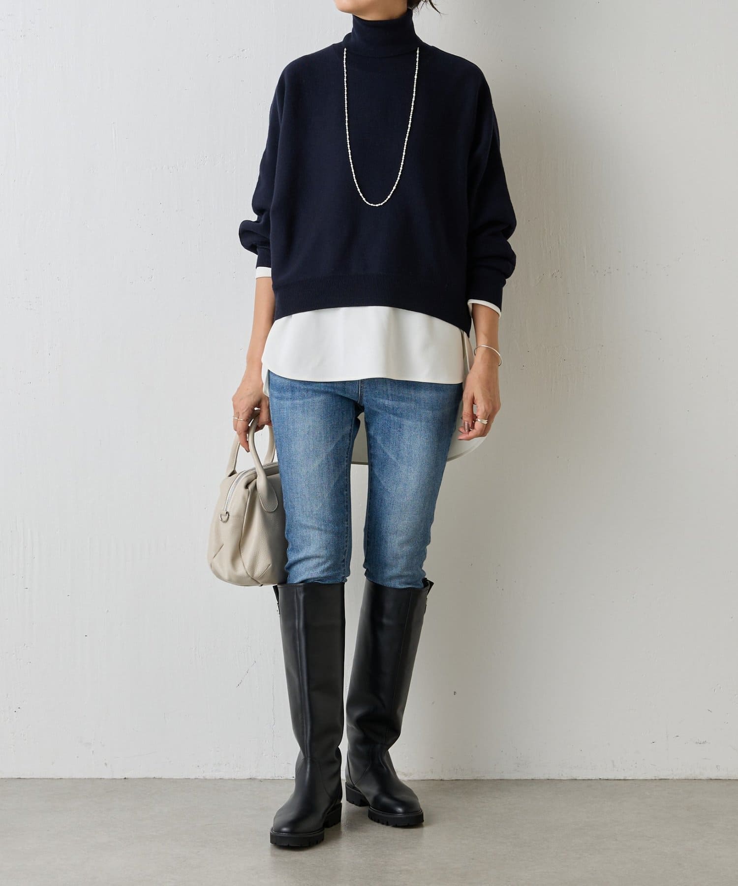 ベーシックな形で着回しやすい、ハイネックのドルマンニット。
