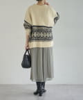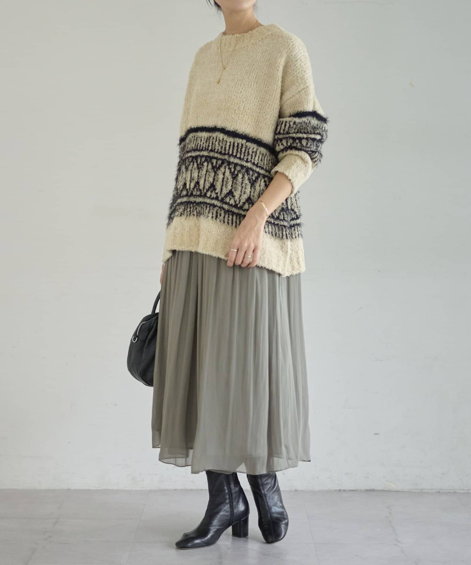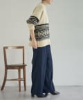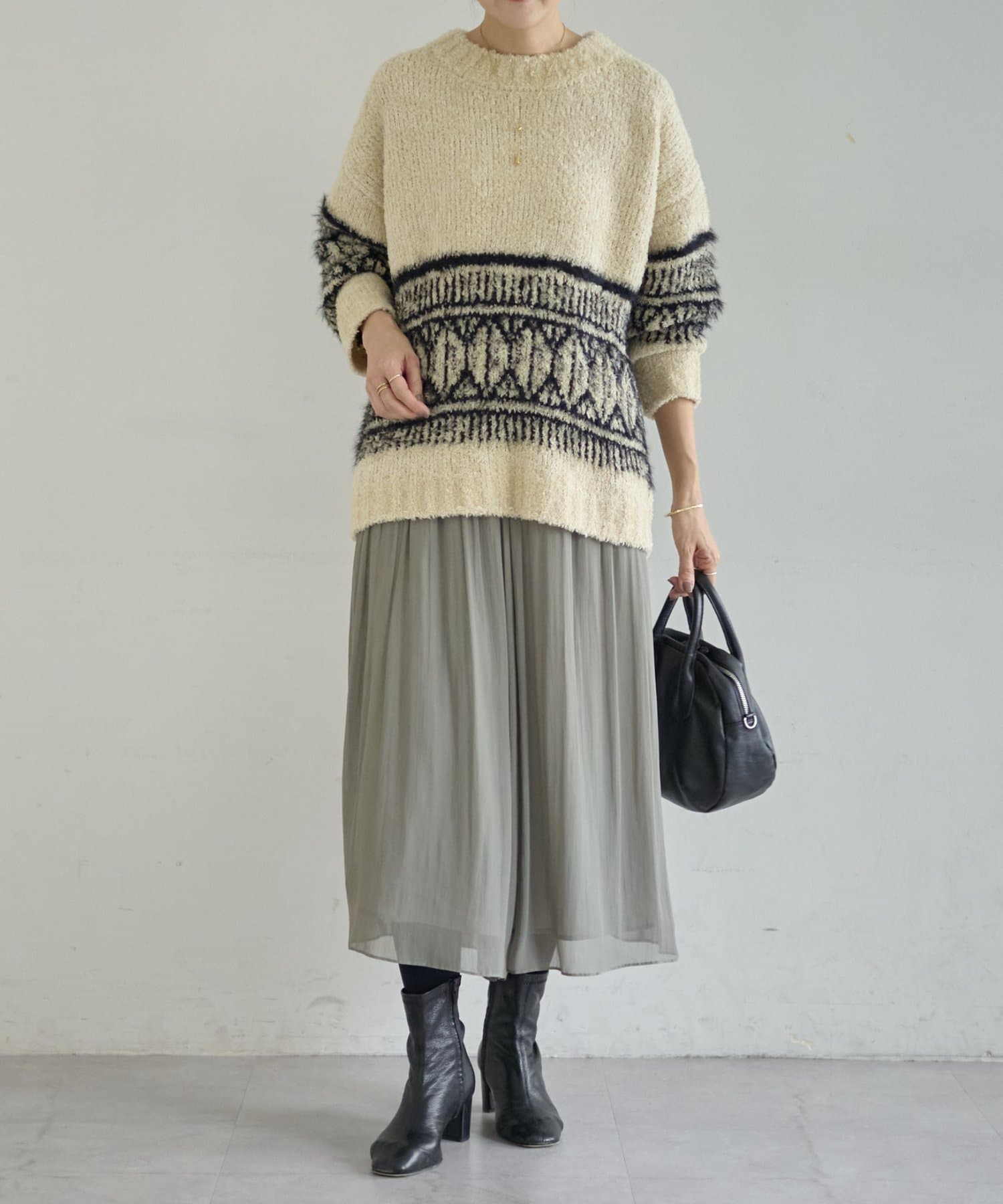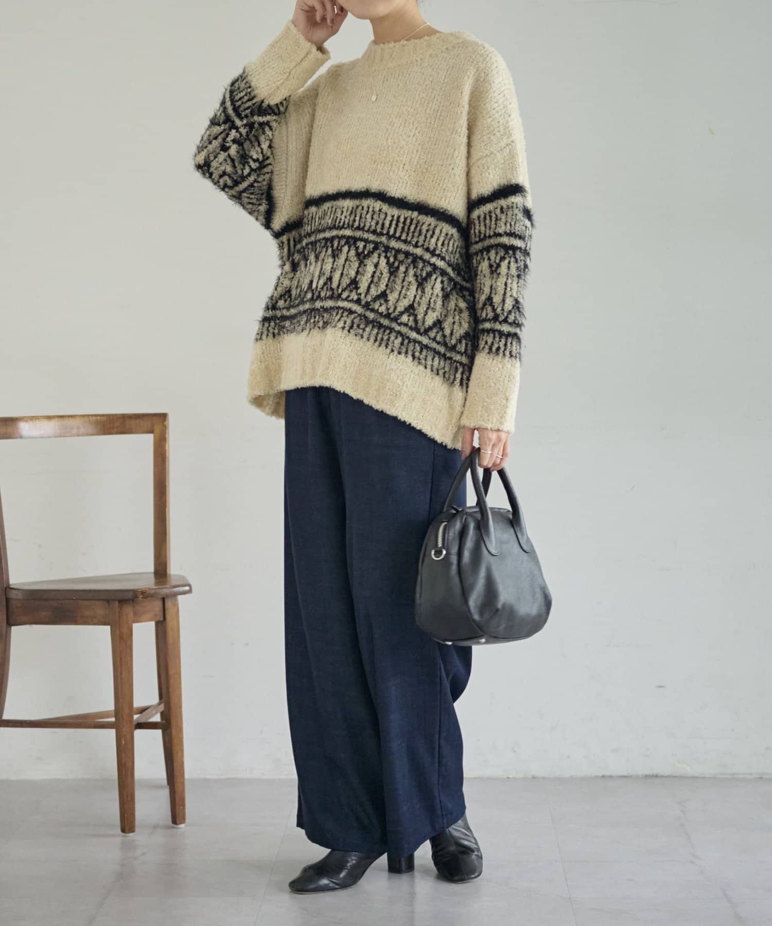 身頃と袖に大きくフェアアイル柄をあしらった、存在感のあるニットプルオーバー。