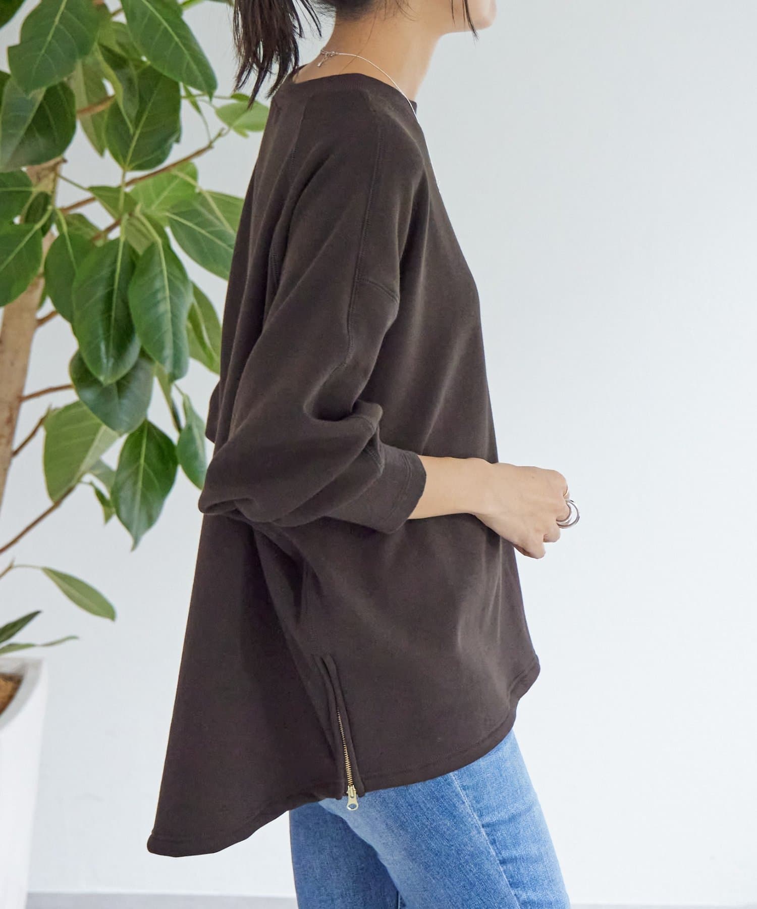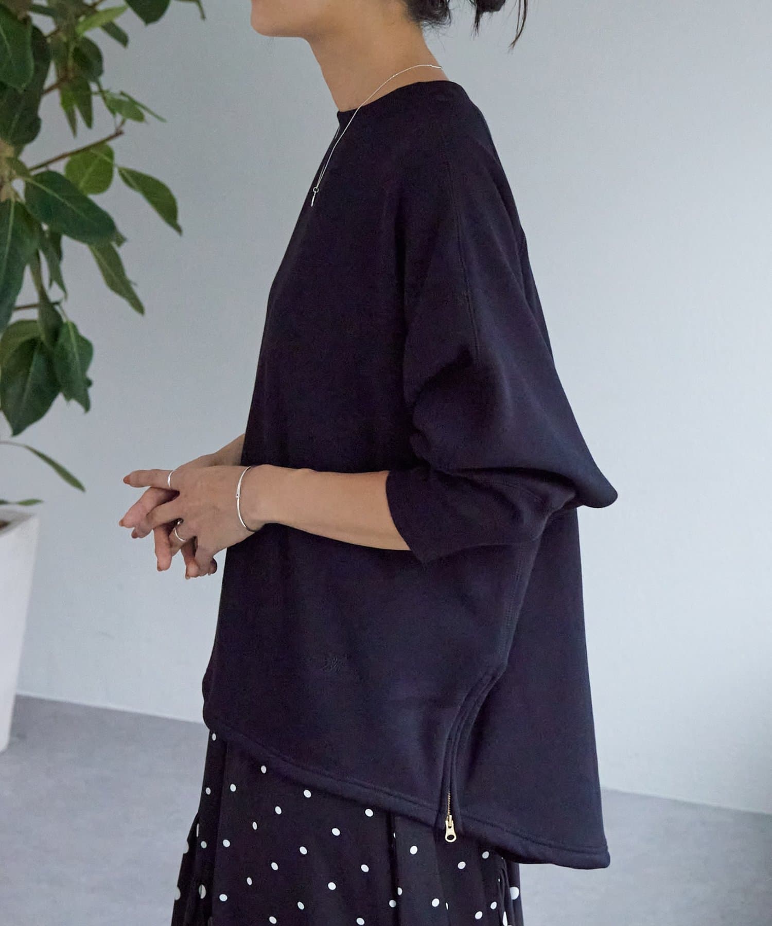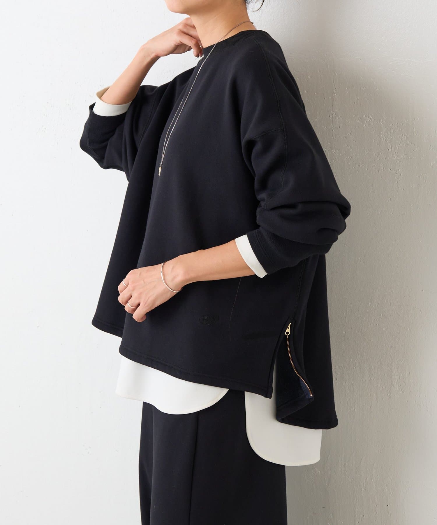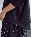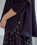 後ろ裾は緩やかなラウンドカットで、両サイドのゴールドジップを開けると軽やかな抜け感が。