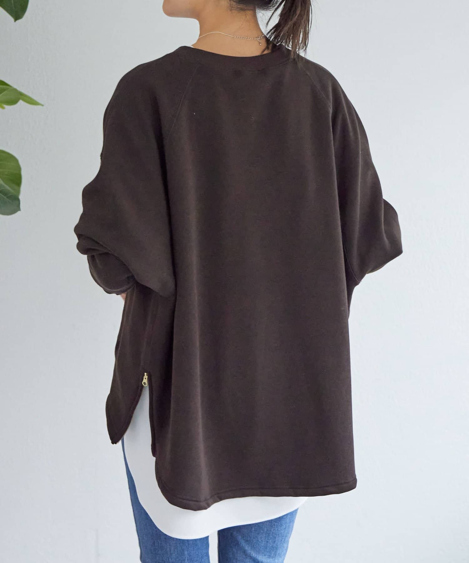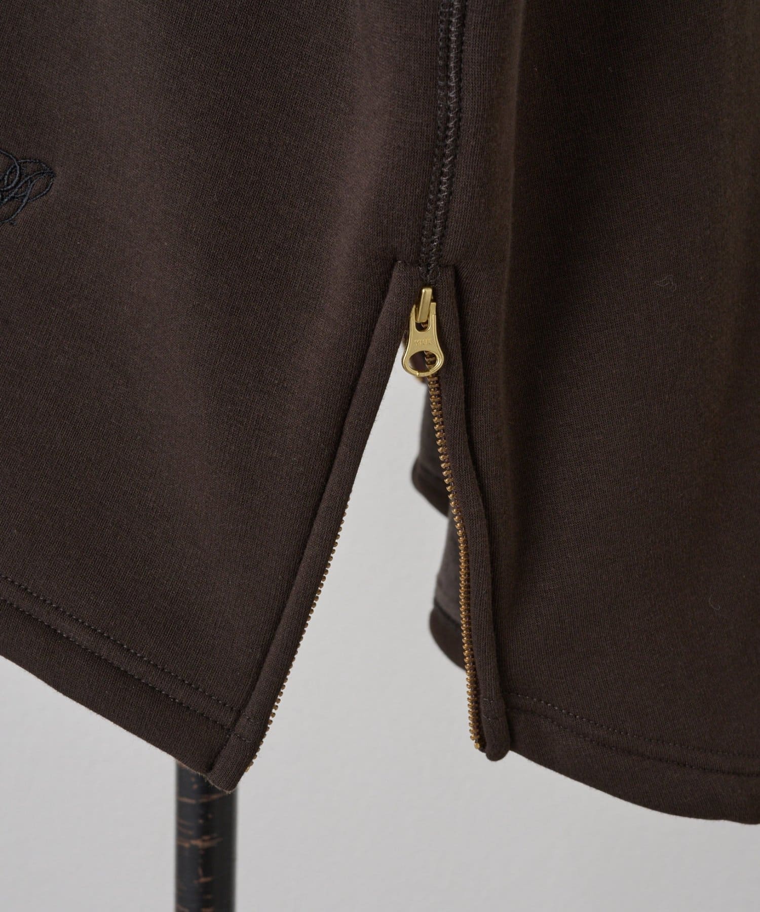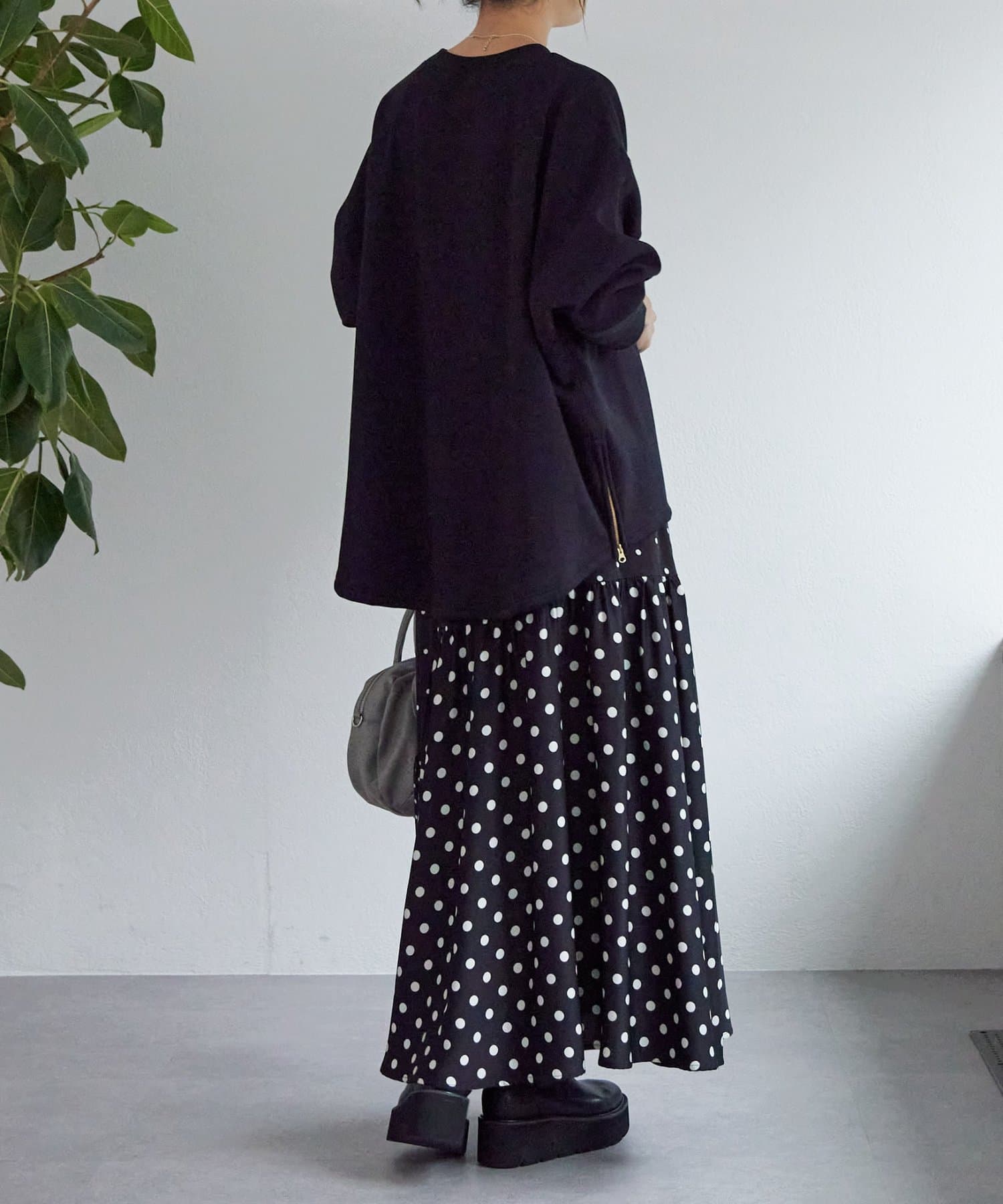 後ろ裾は緩やかなラウンドカットで、両サイドのゴールドジップを開けると軽やかな抜け感が。
