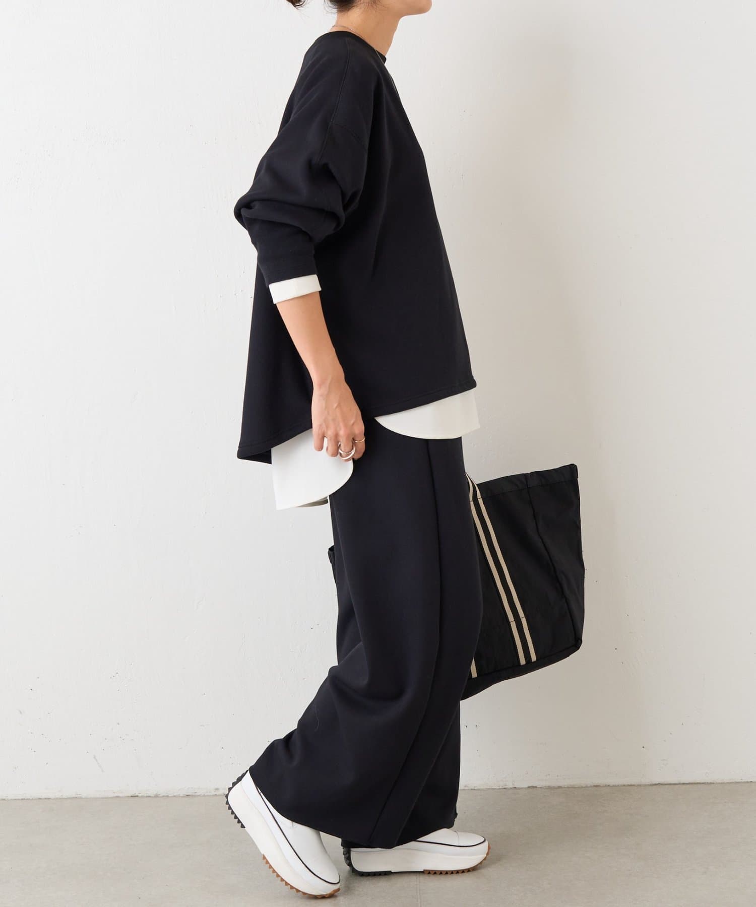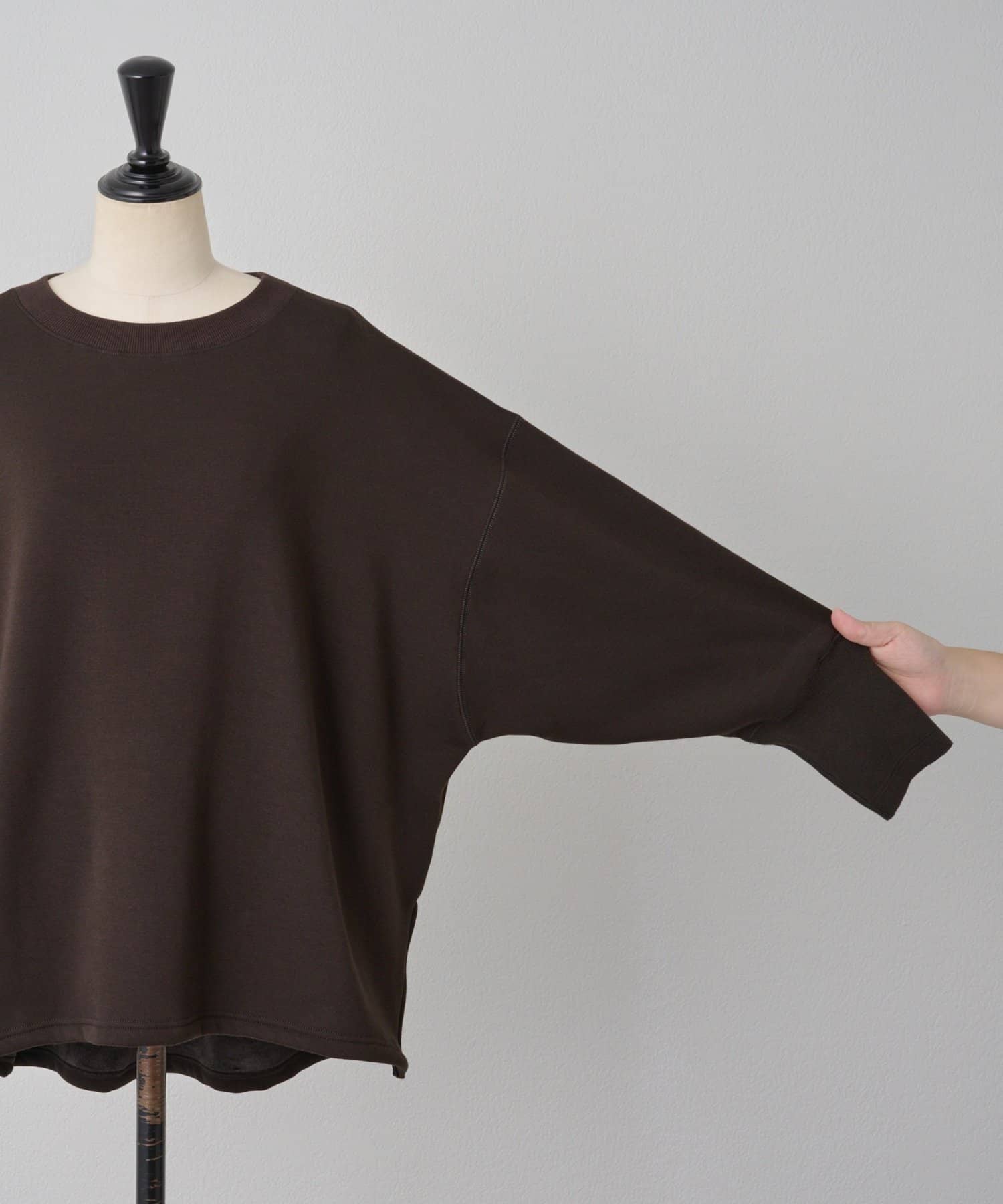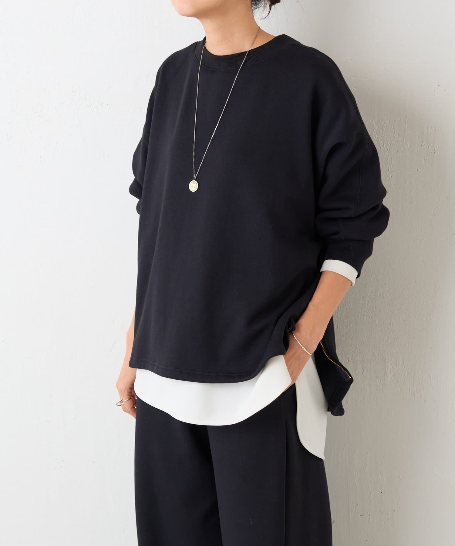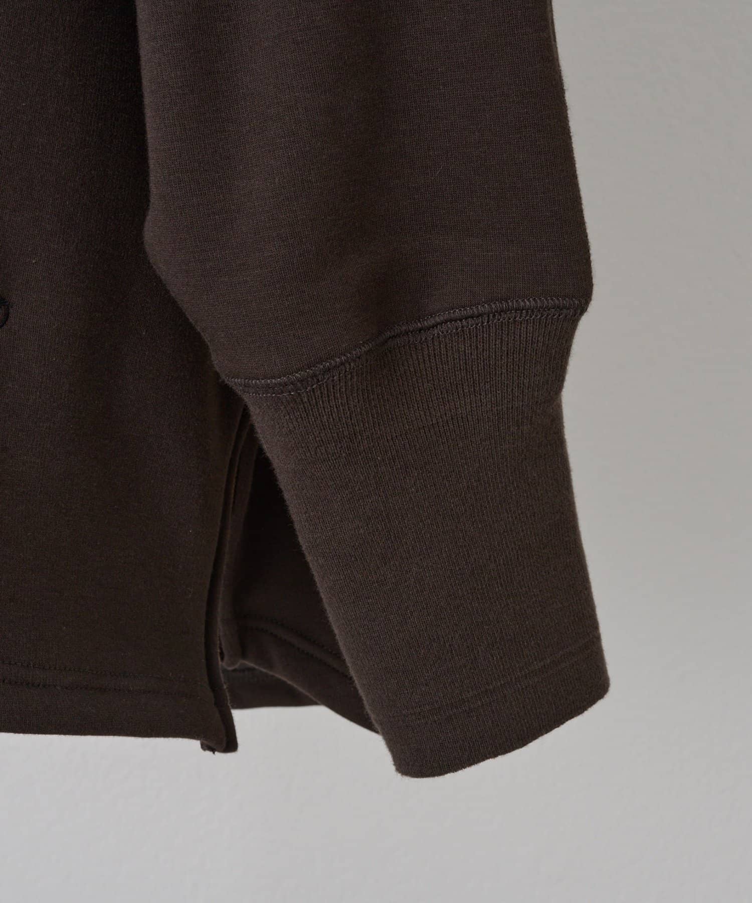 長めにとった袖口リブは、たくし上げても落ちにくく、自然な立体感を生み出します。