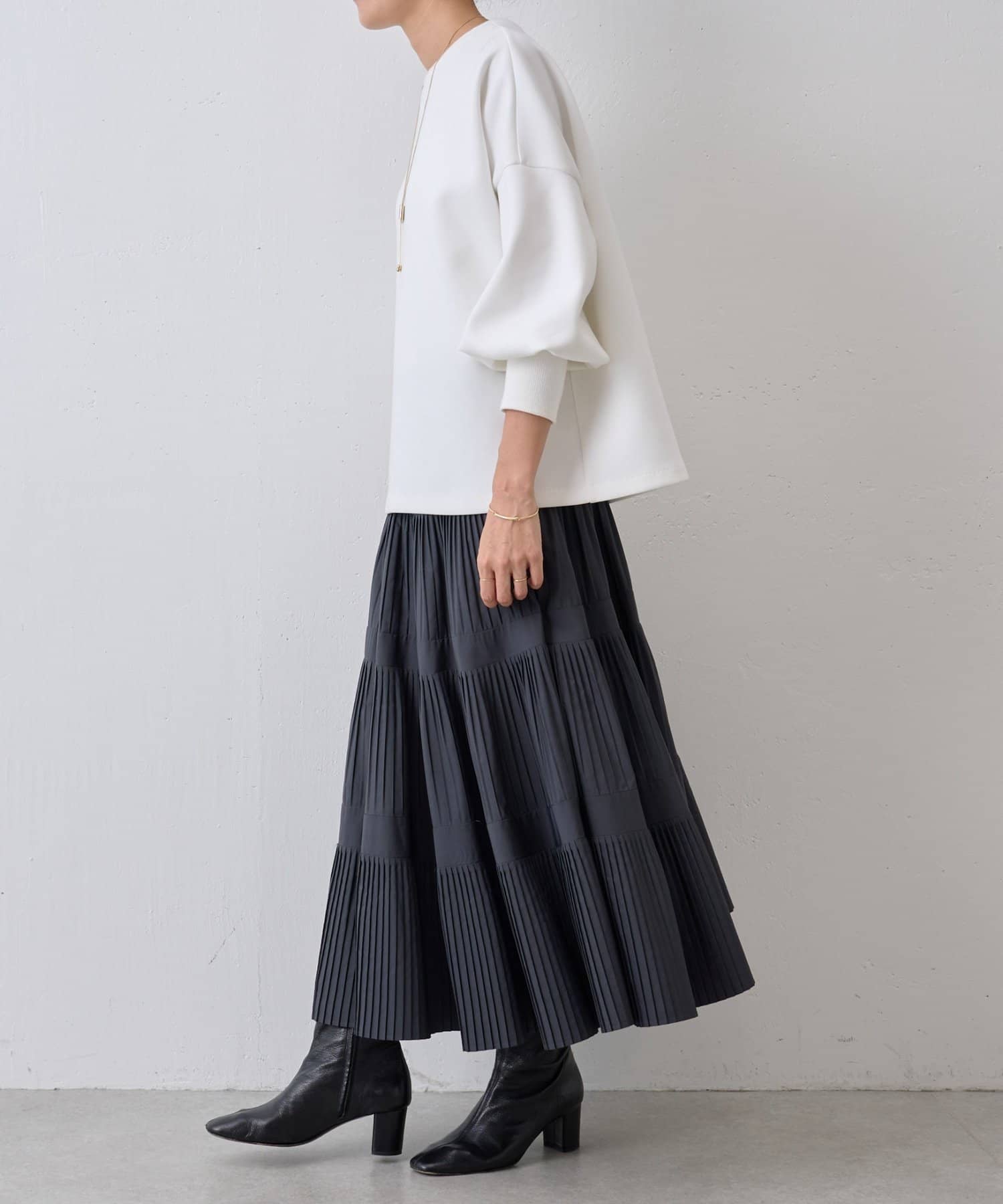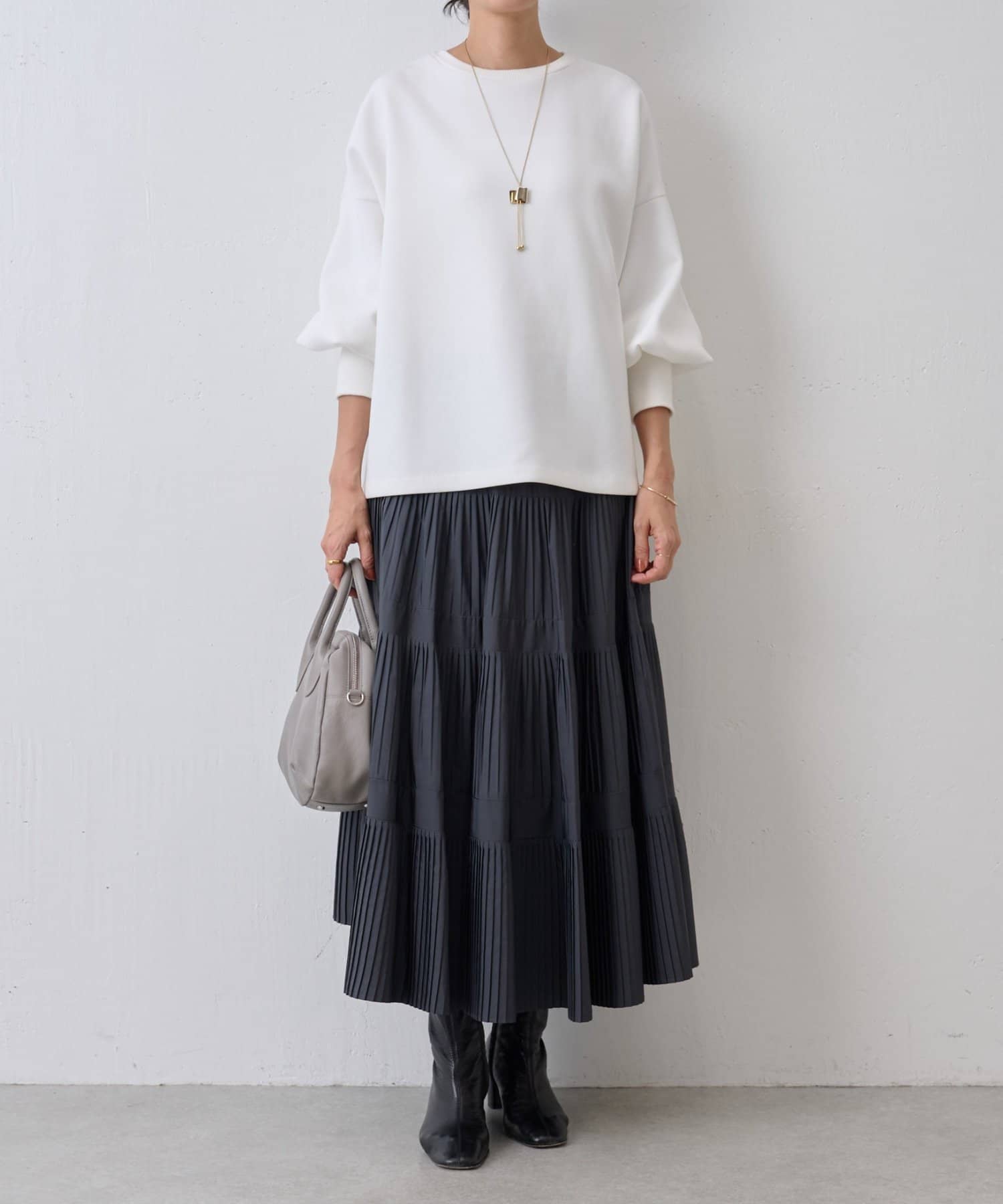 長めにとった袖口のリブで、パフ袖のバランスとふくらみを強調するデザインになっています。