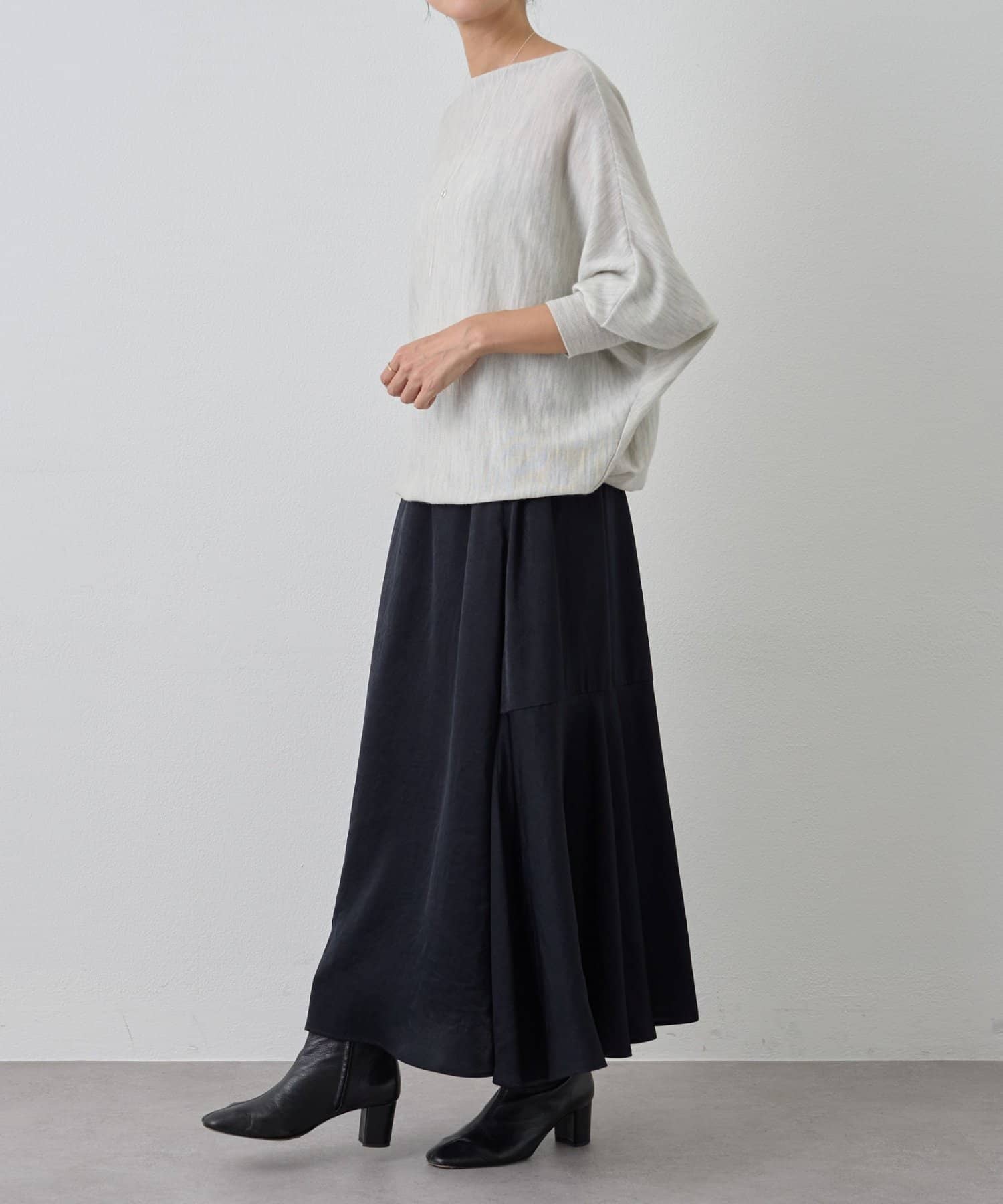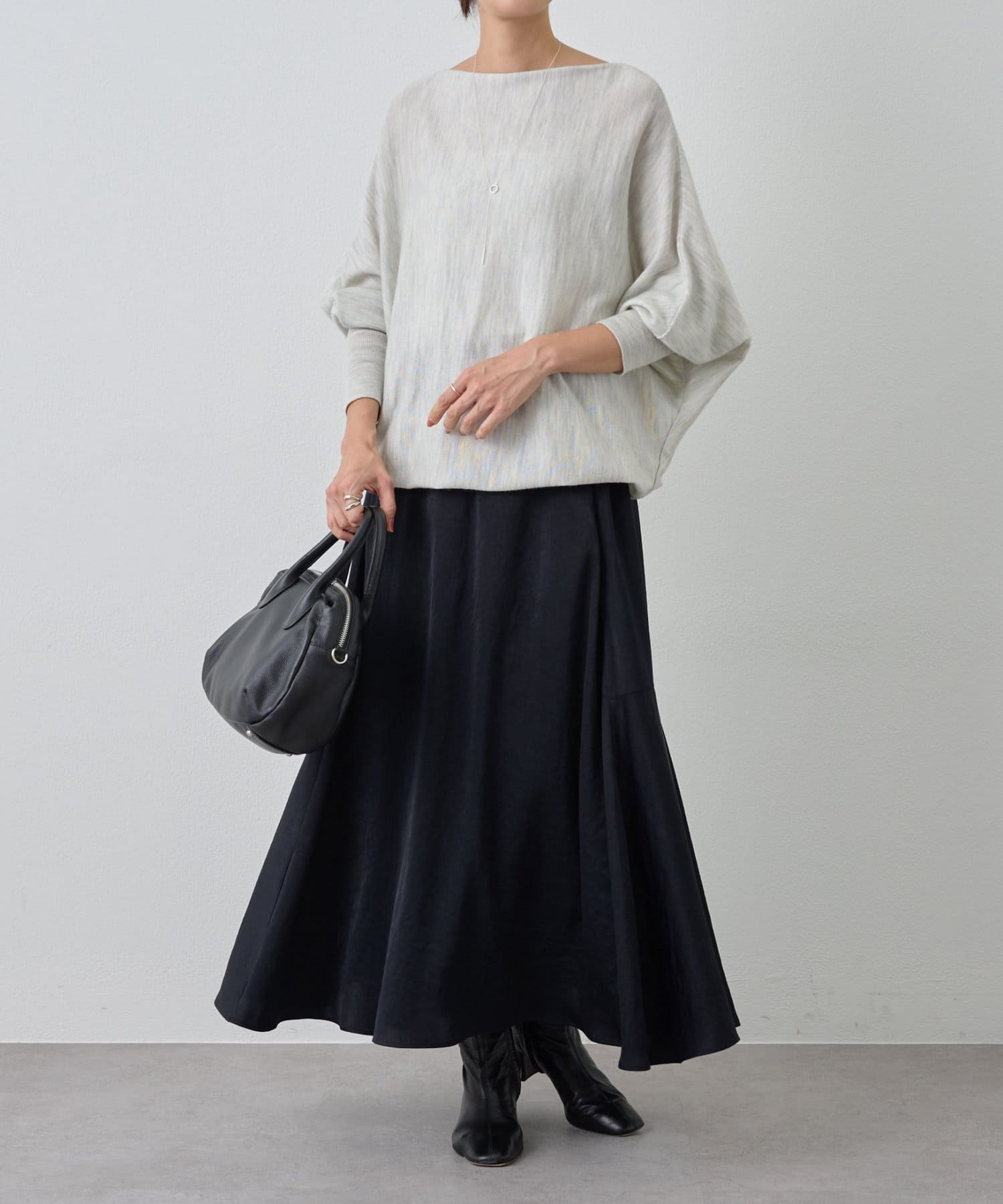 光沢感がある生地で軽さと艶をプラスしてくれるロングスカート。