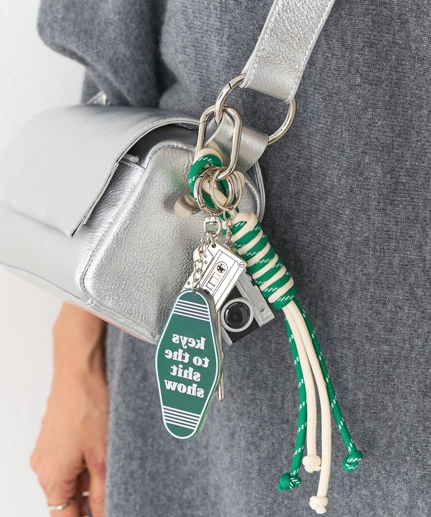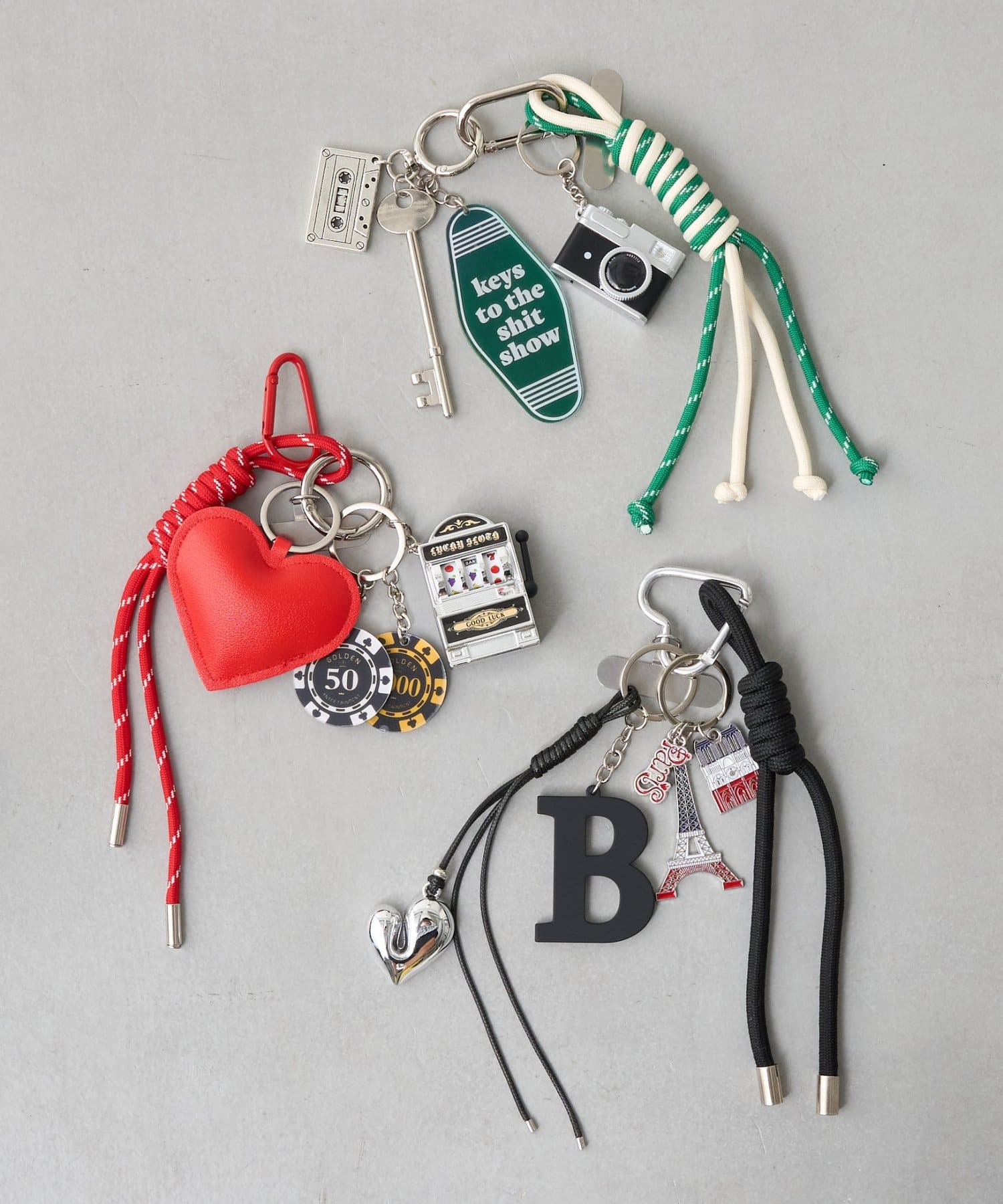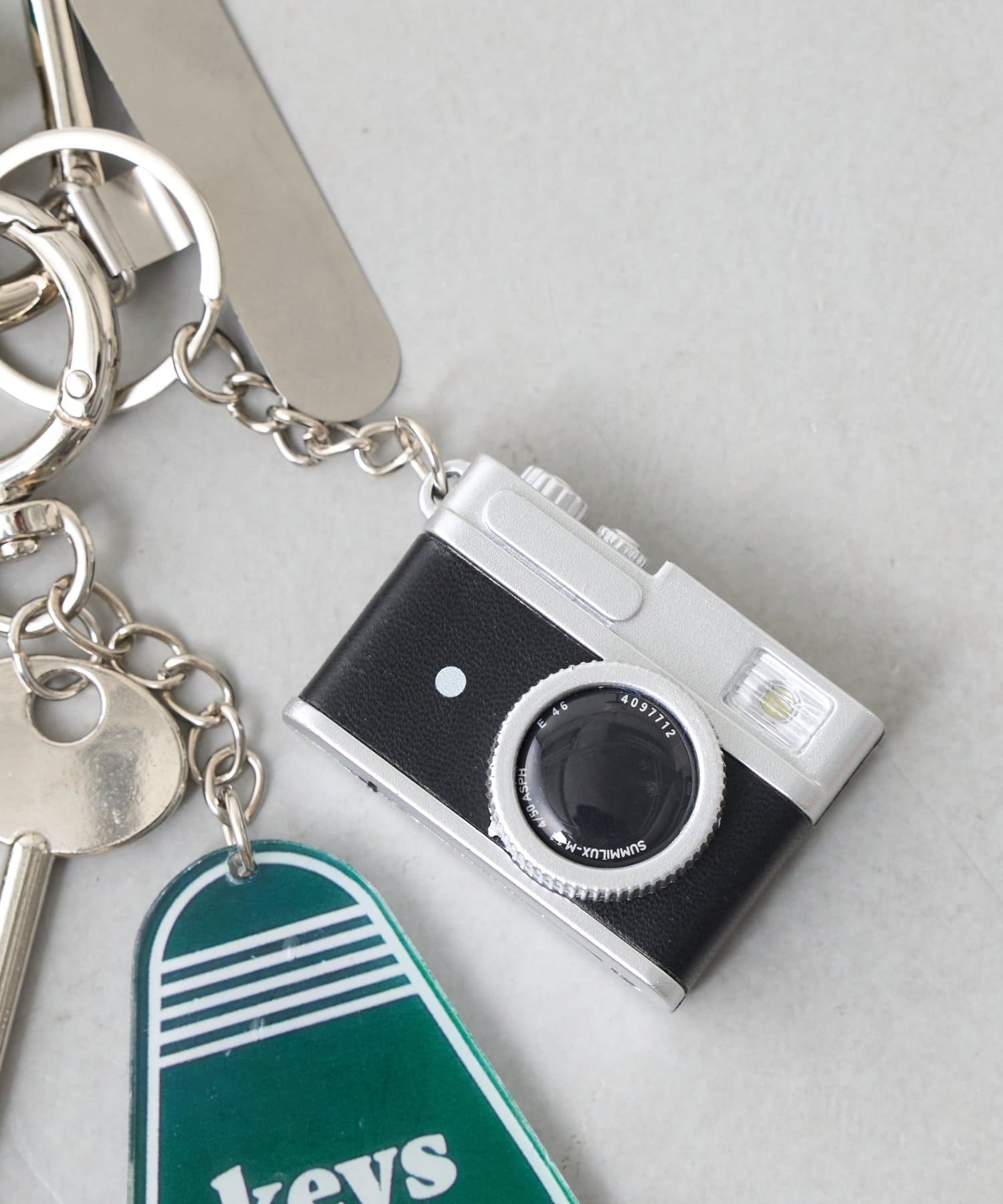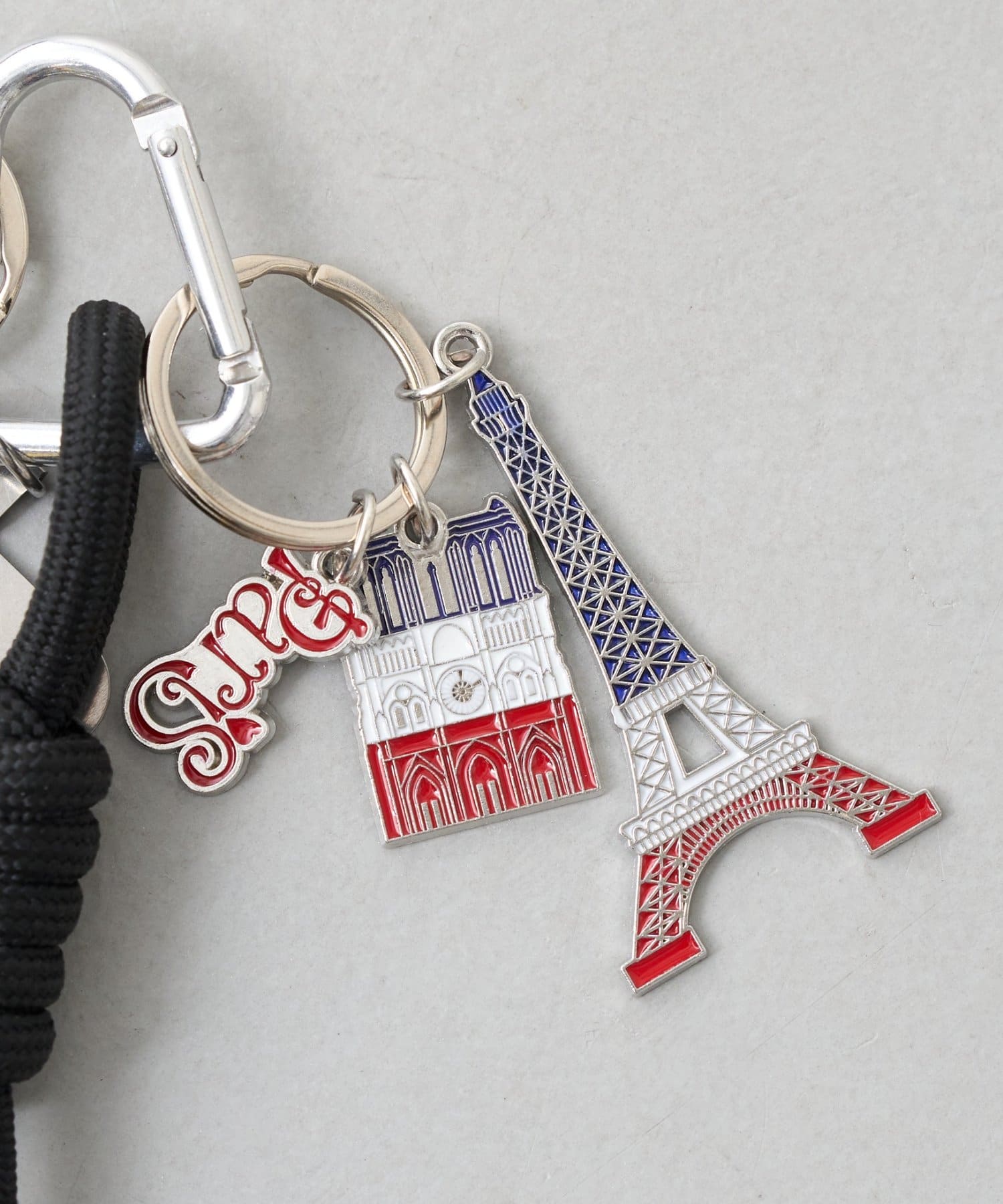 カメラ×カセット、エッフェル塔×ノートルダム大聖堂など、遊び心たっぷりののチャームを組み合わせたキーホルダー。