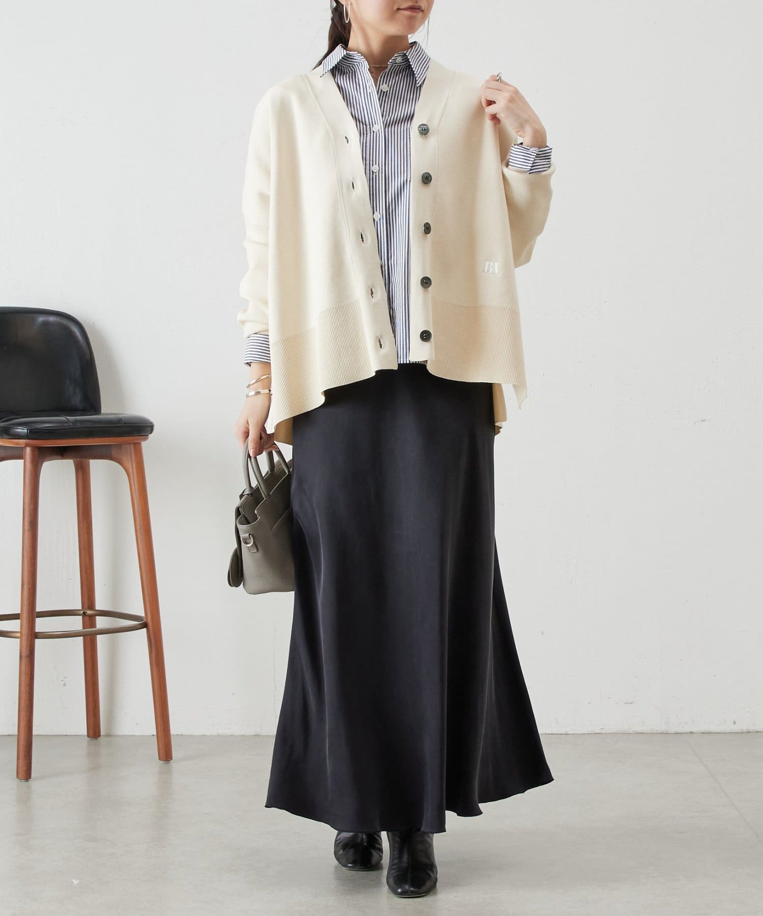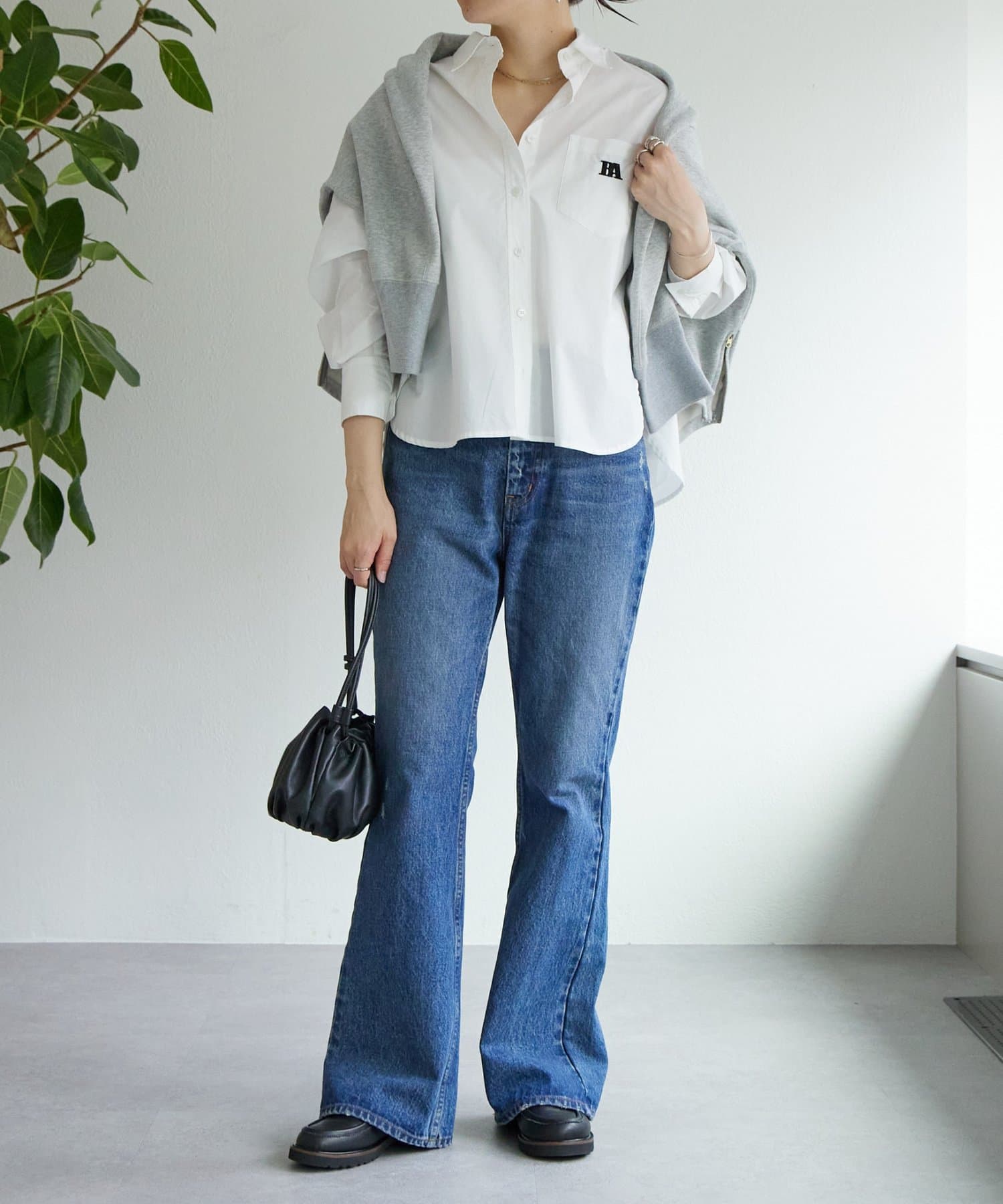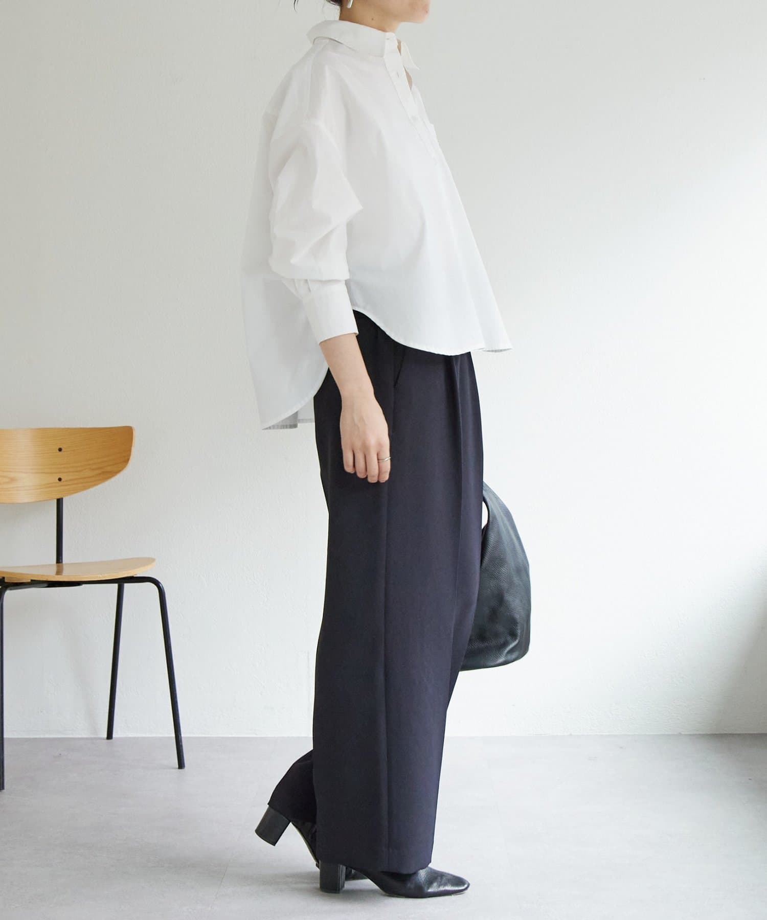 裾をインしなくてもバランスよく着られる着丈で、低身長の方にもすっきりと馴染む一枚です。