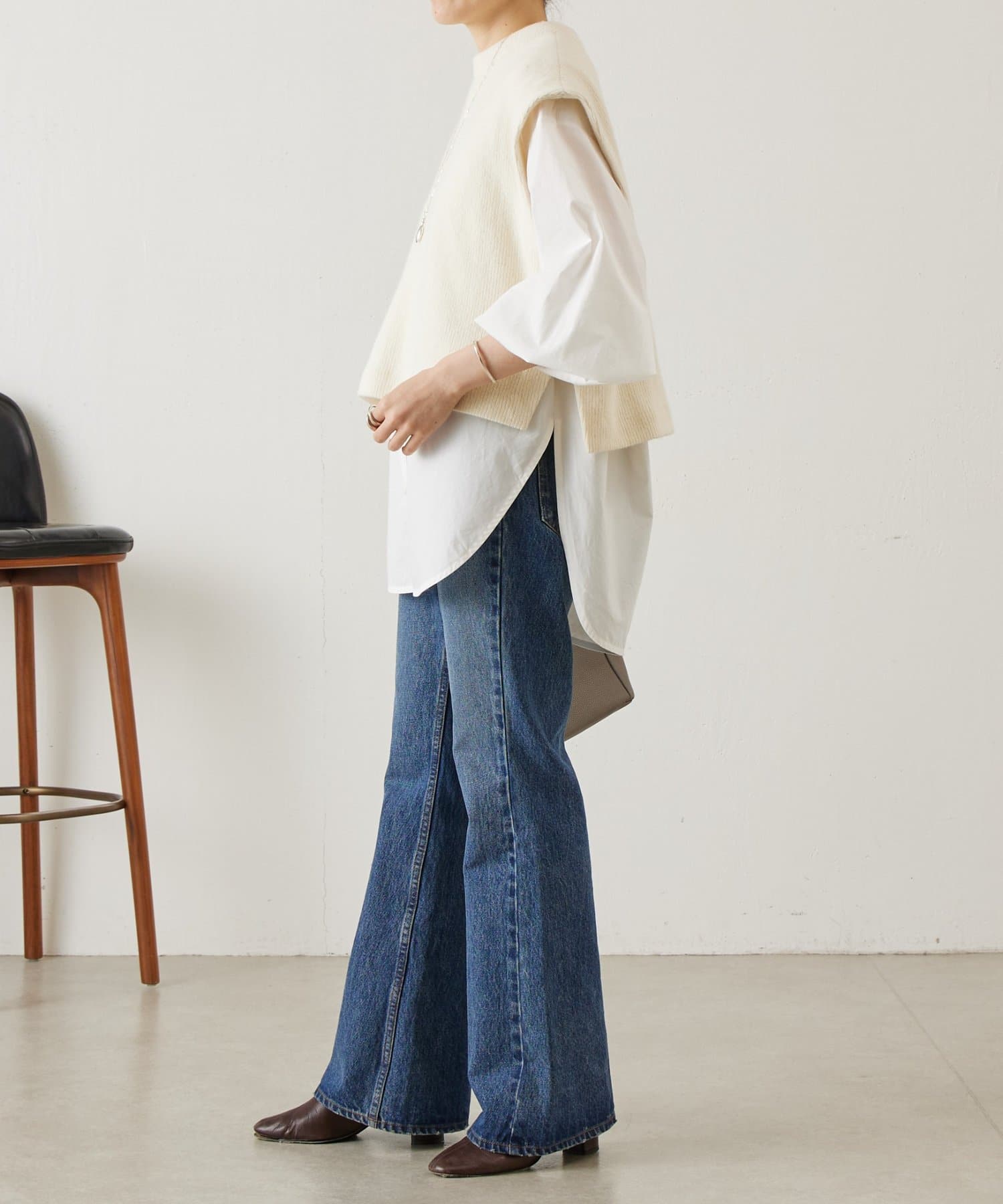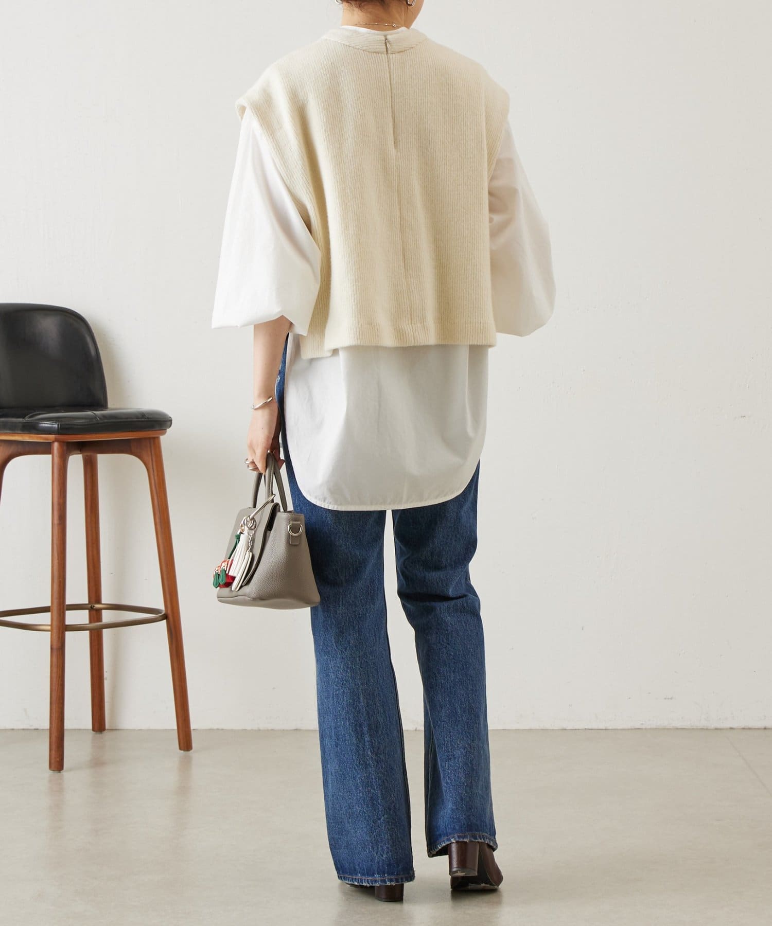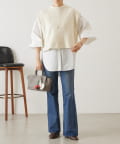 セットのジレはニット素材で、短めの着丈がシャツとのバランスを取りやすいデザイン。