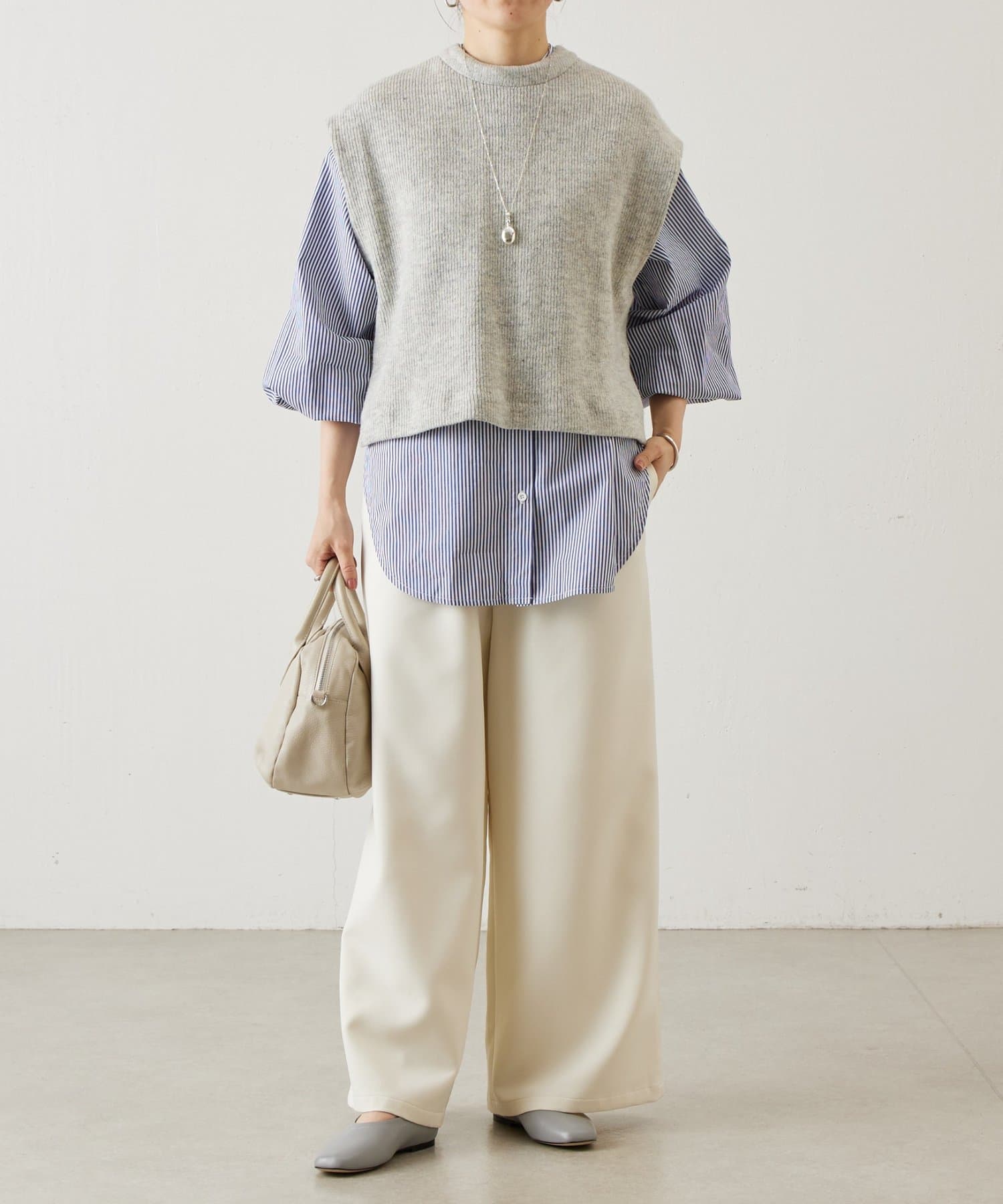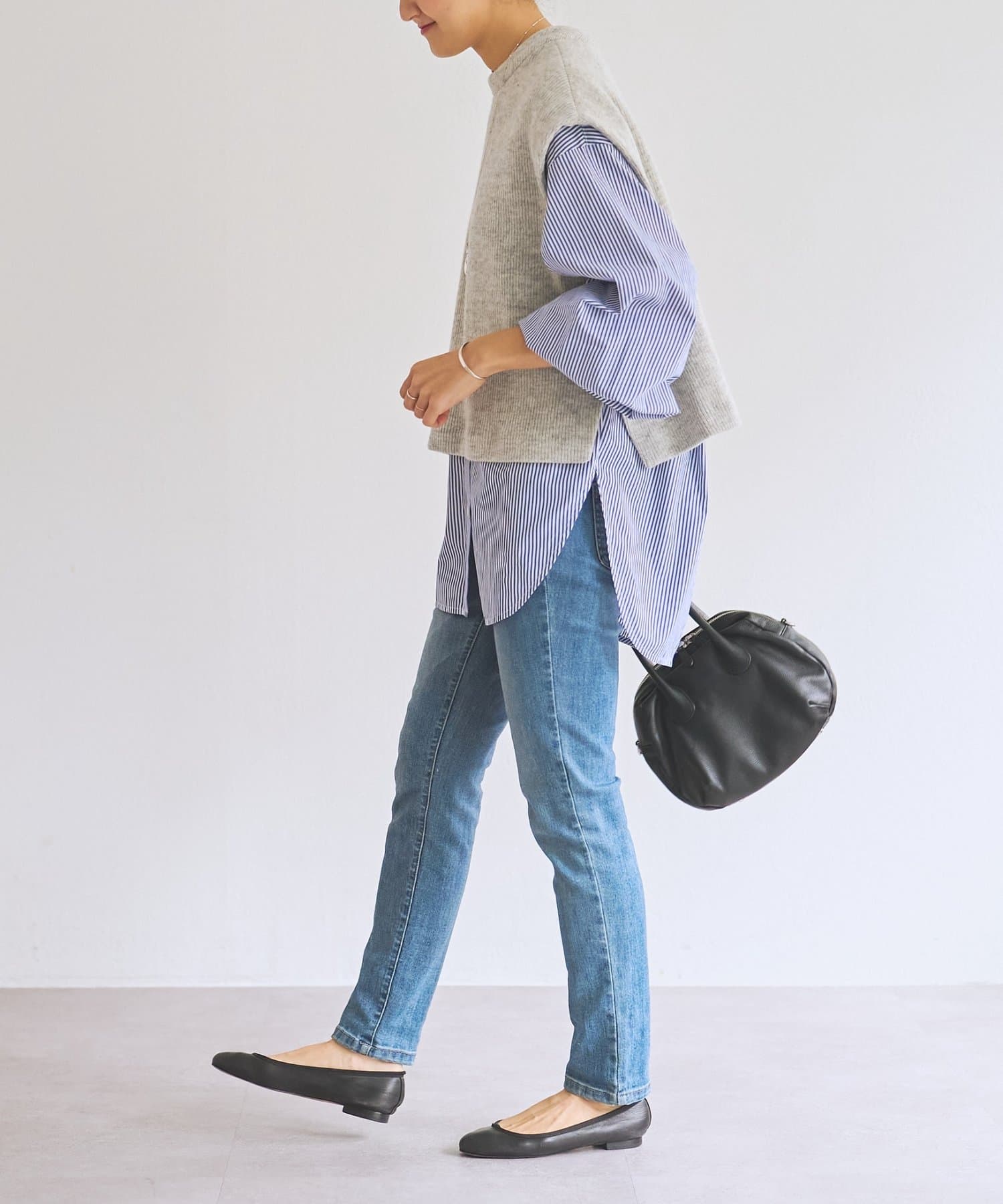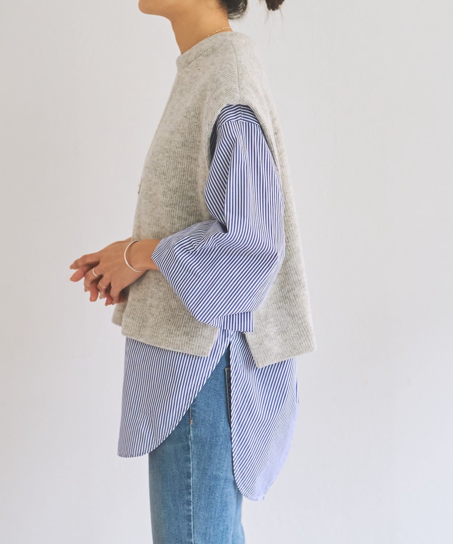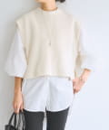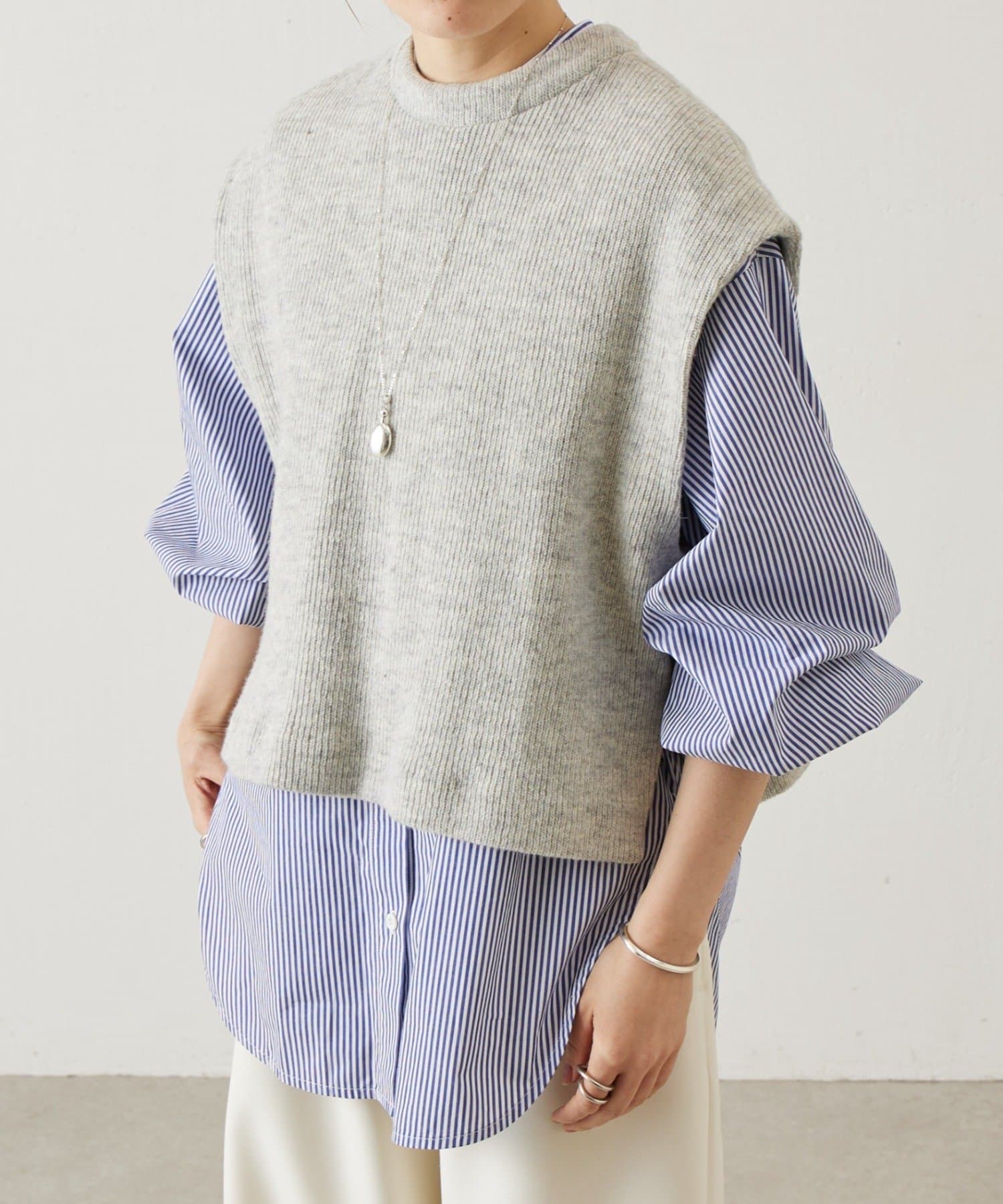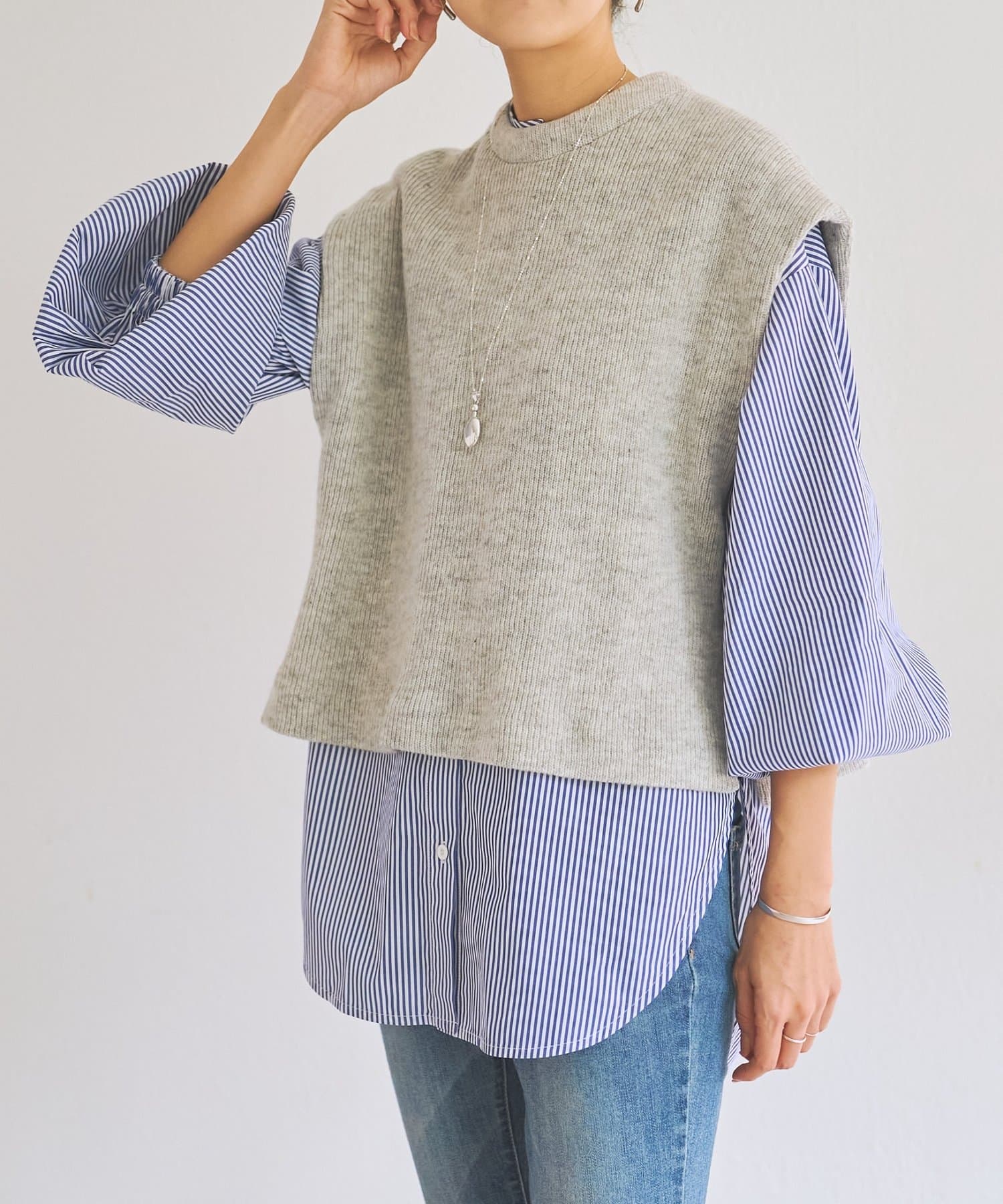 セットのジレはニット素材で、短めの着丈がシャツとのバランスを取りやすいデザイン。