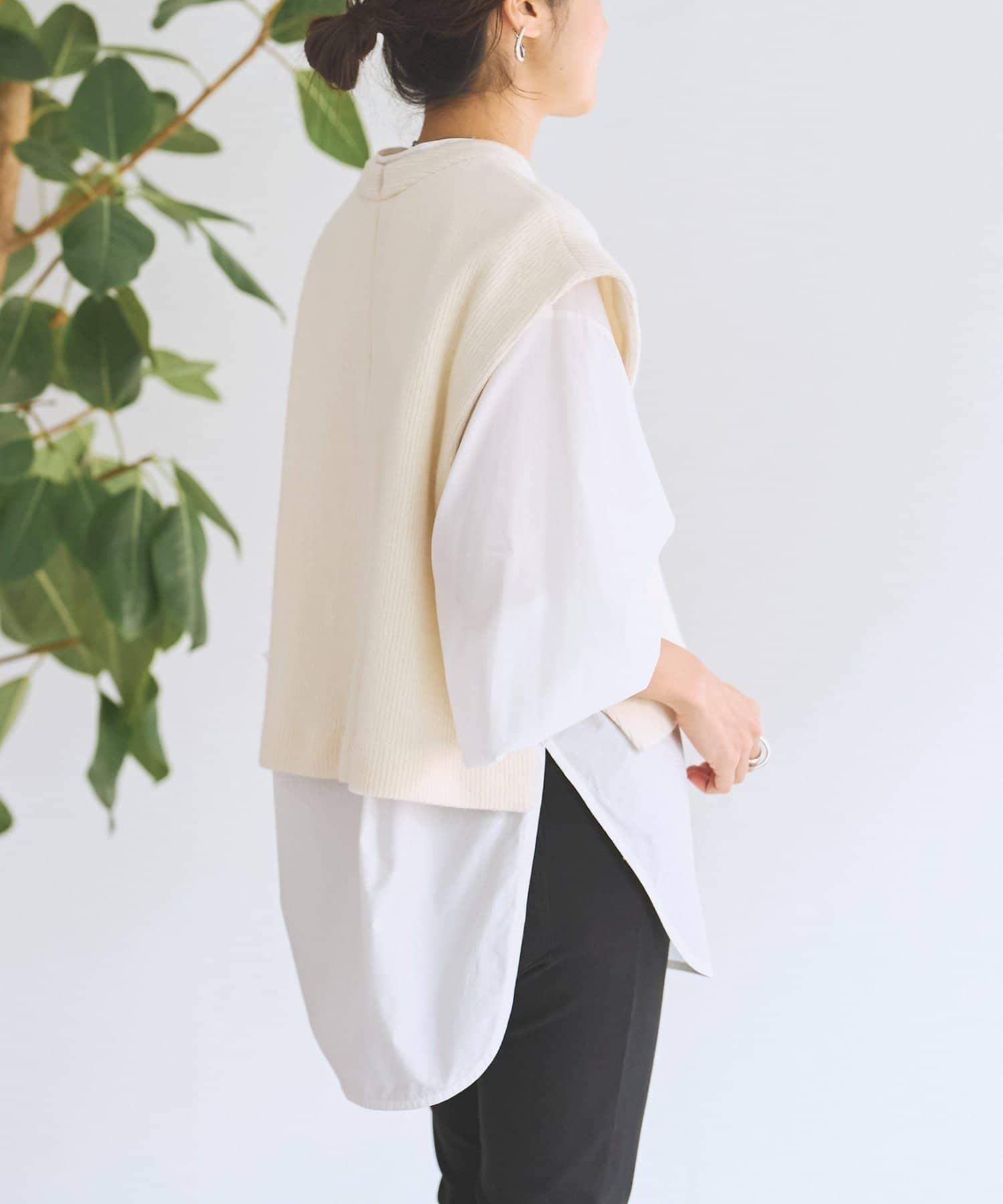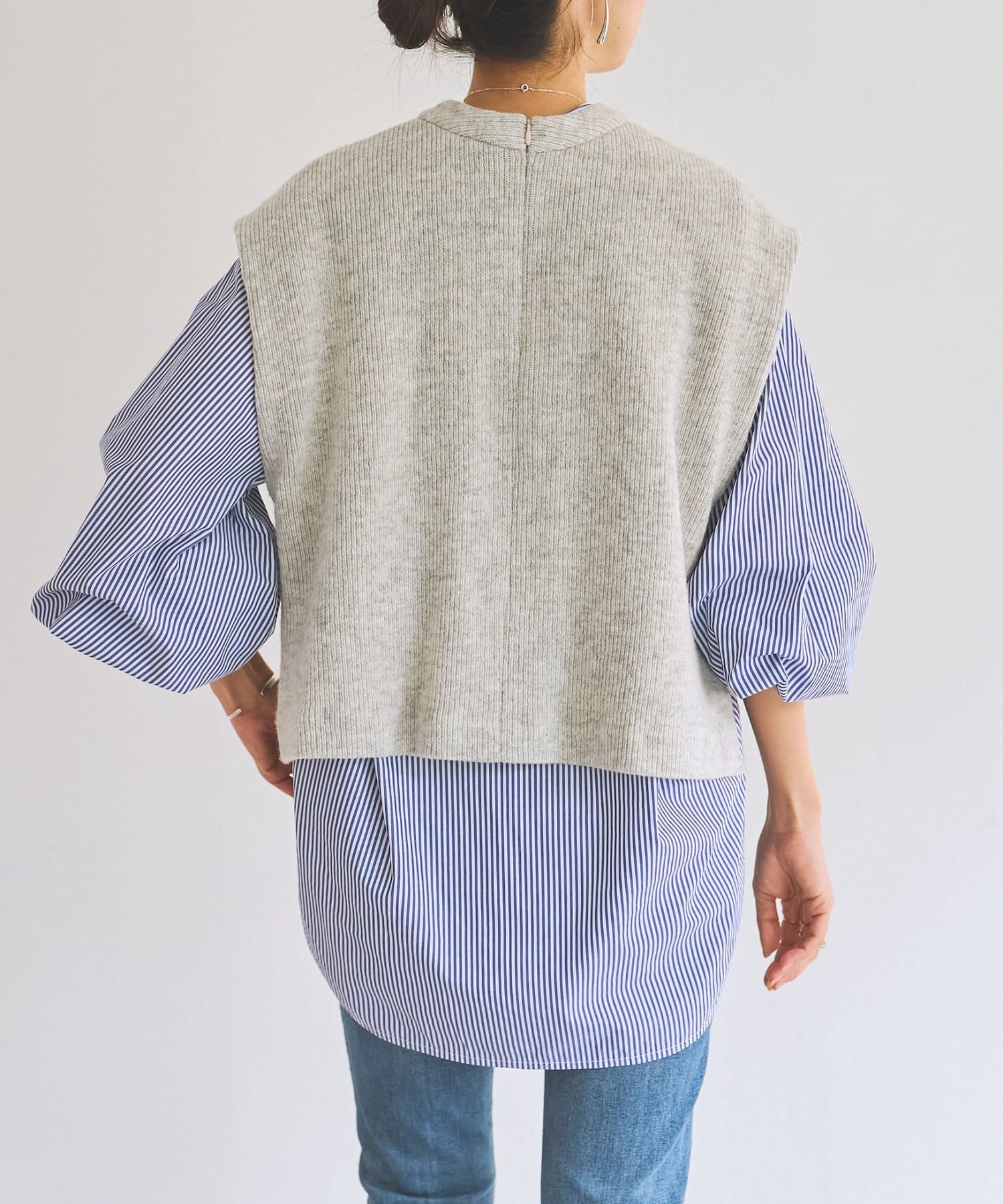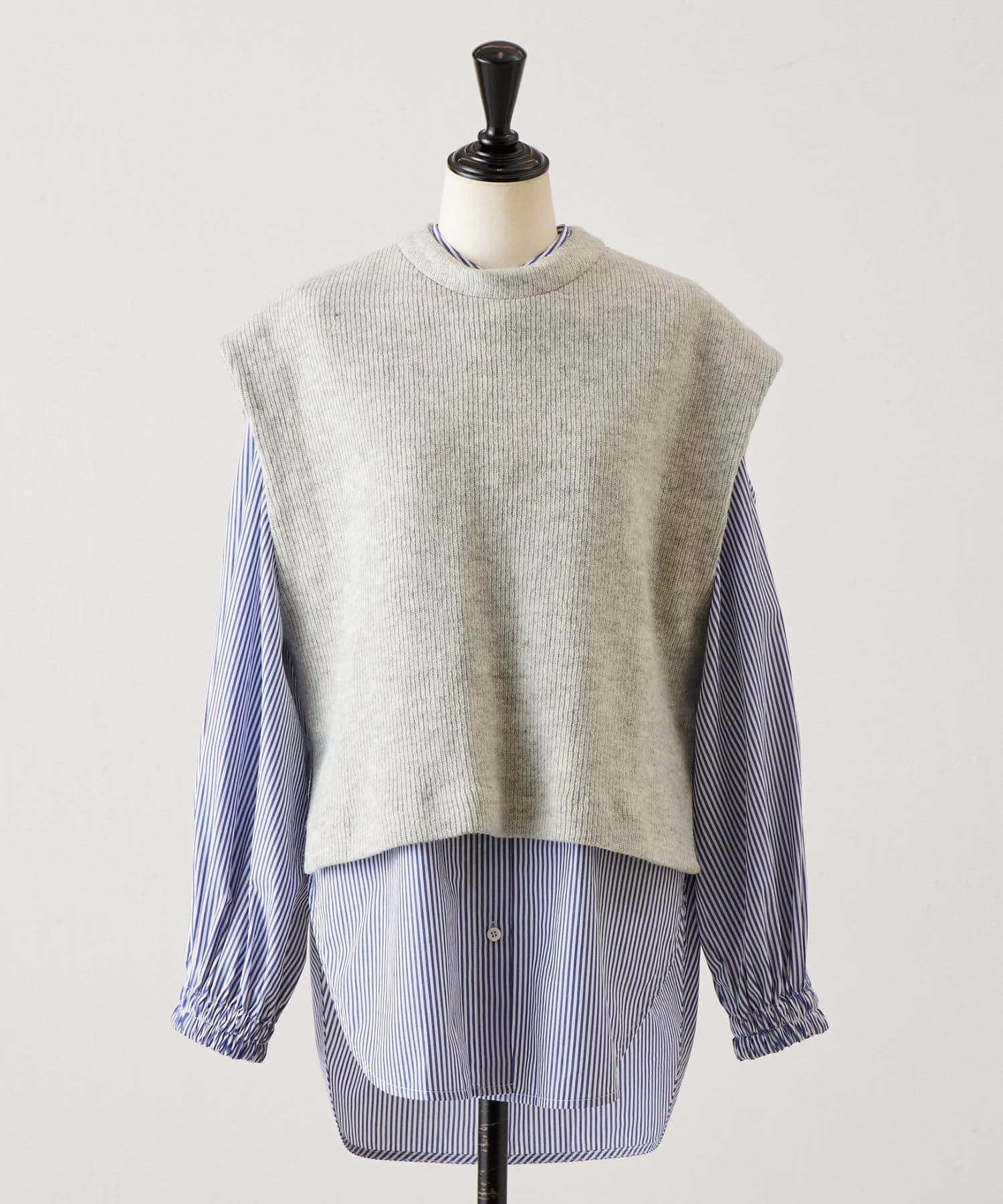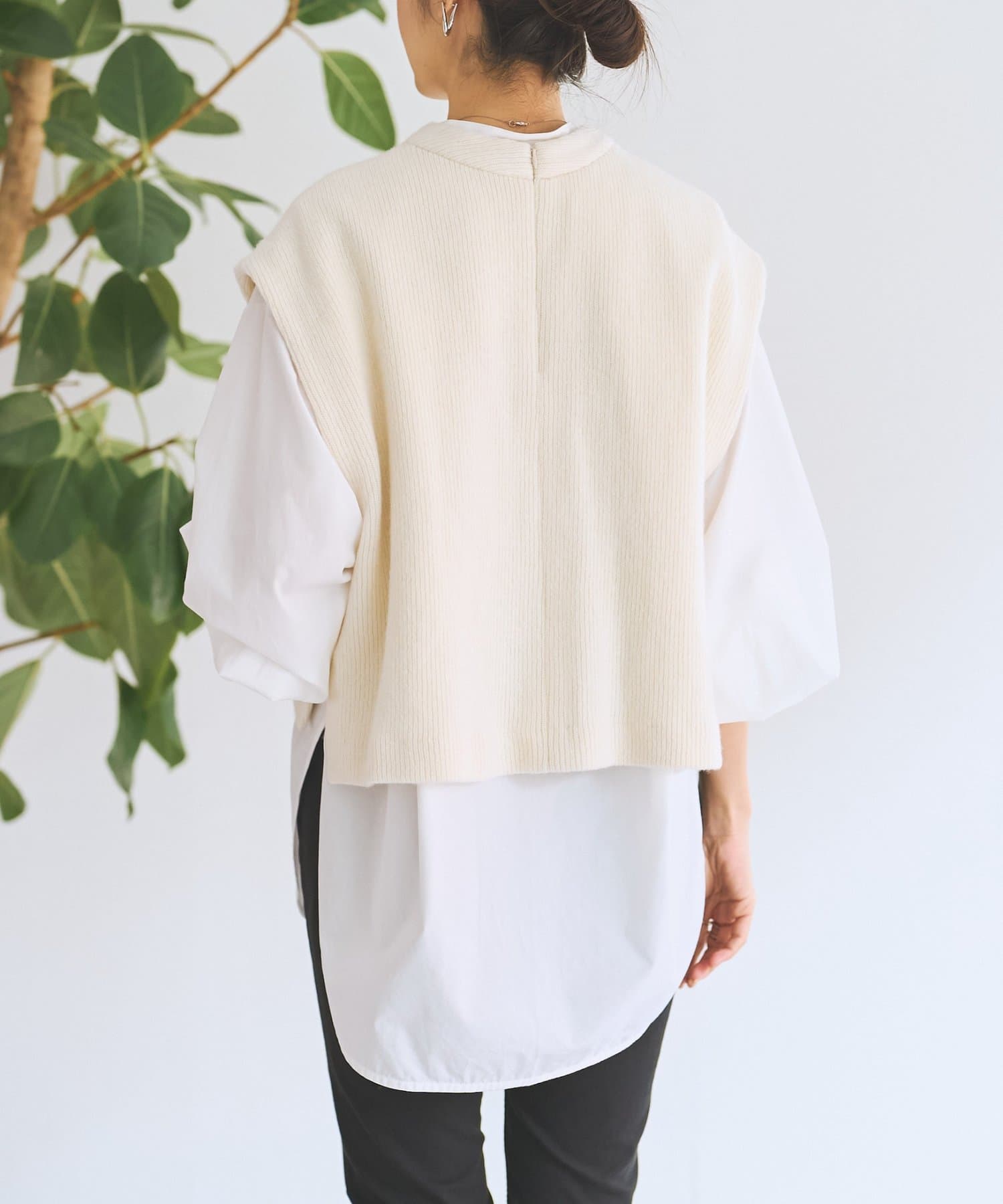 セットのジレはニット素材で、短めの着丈がシャツとのバランスを取りやすいデザイン。