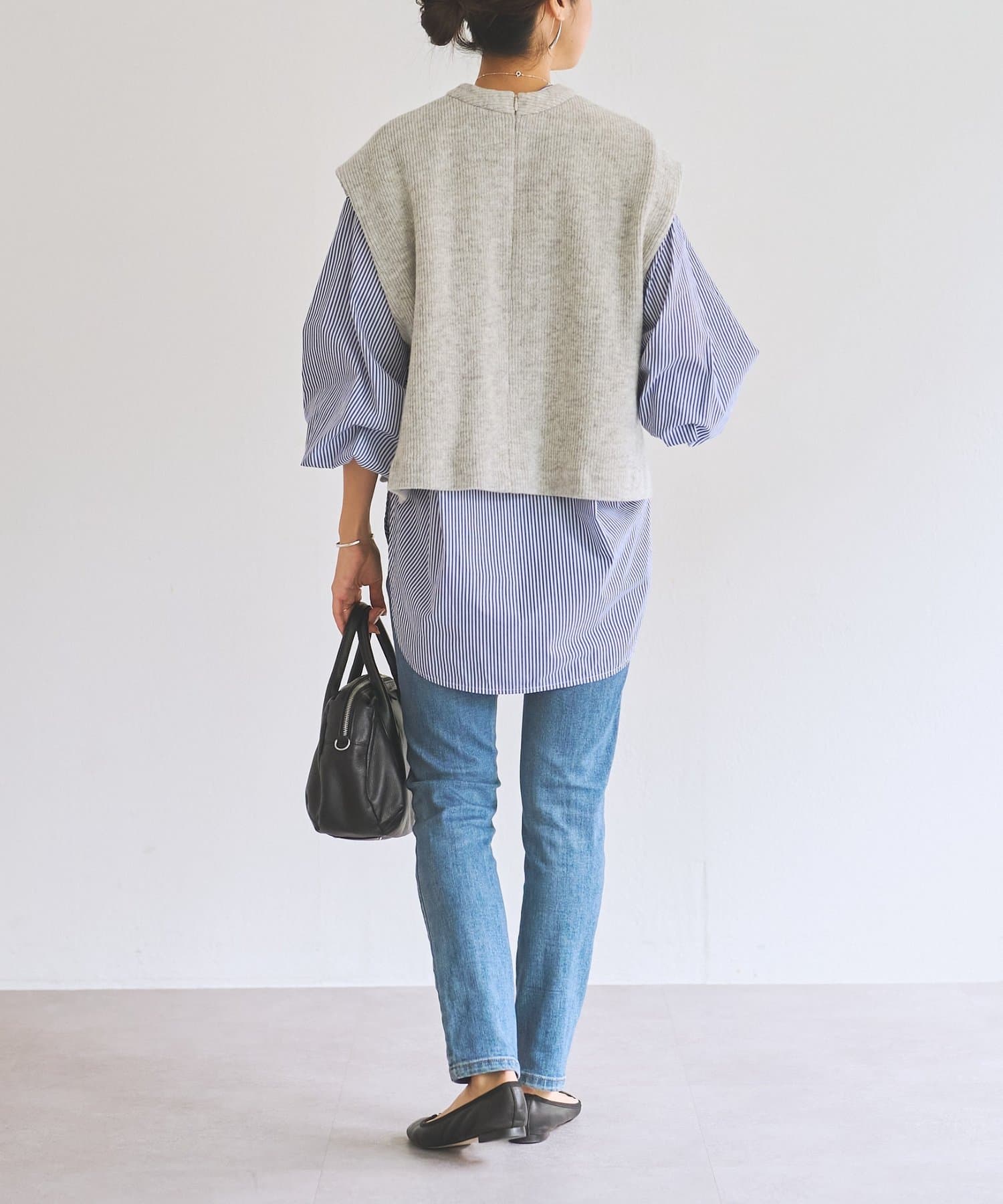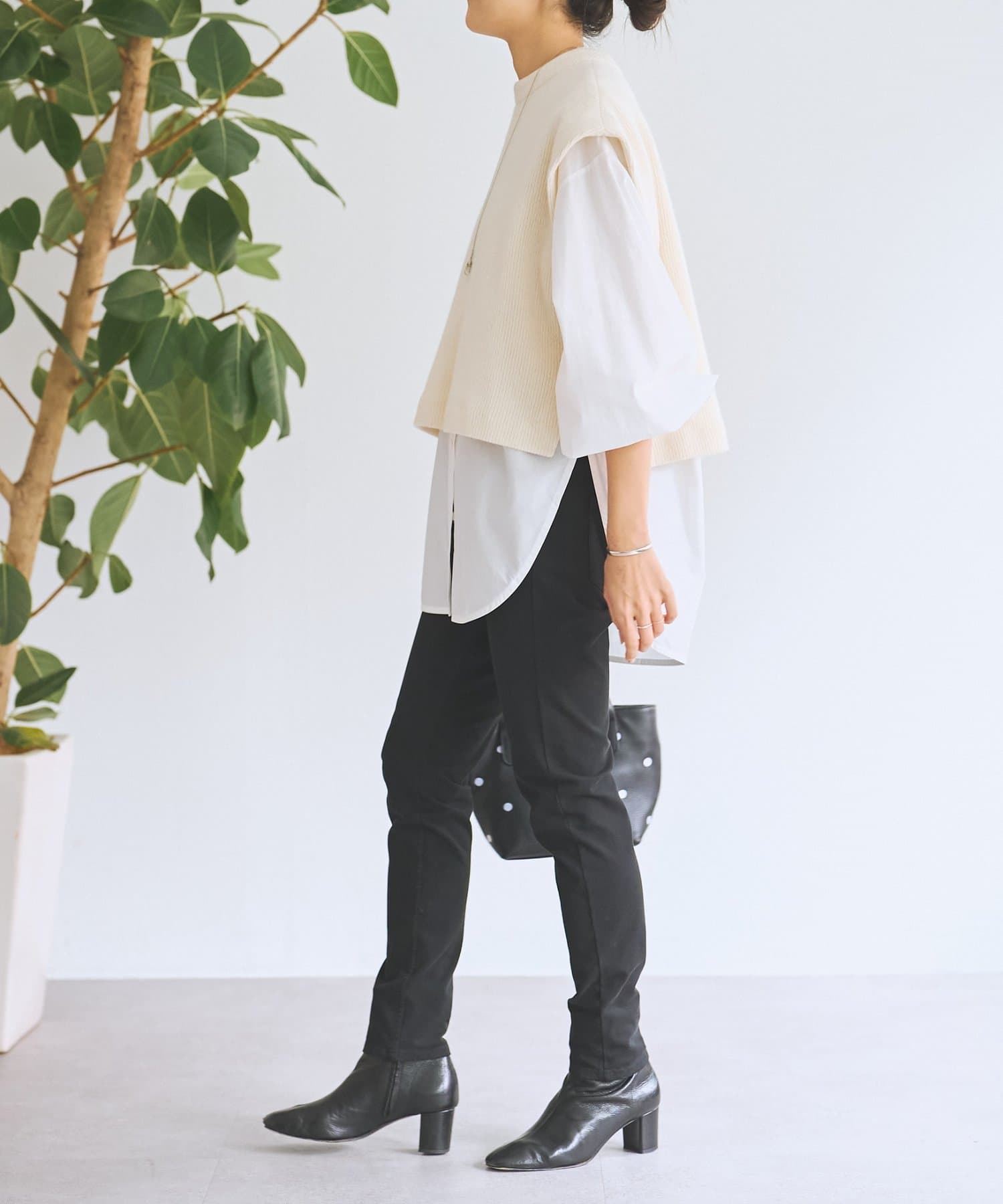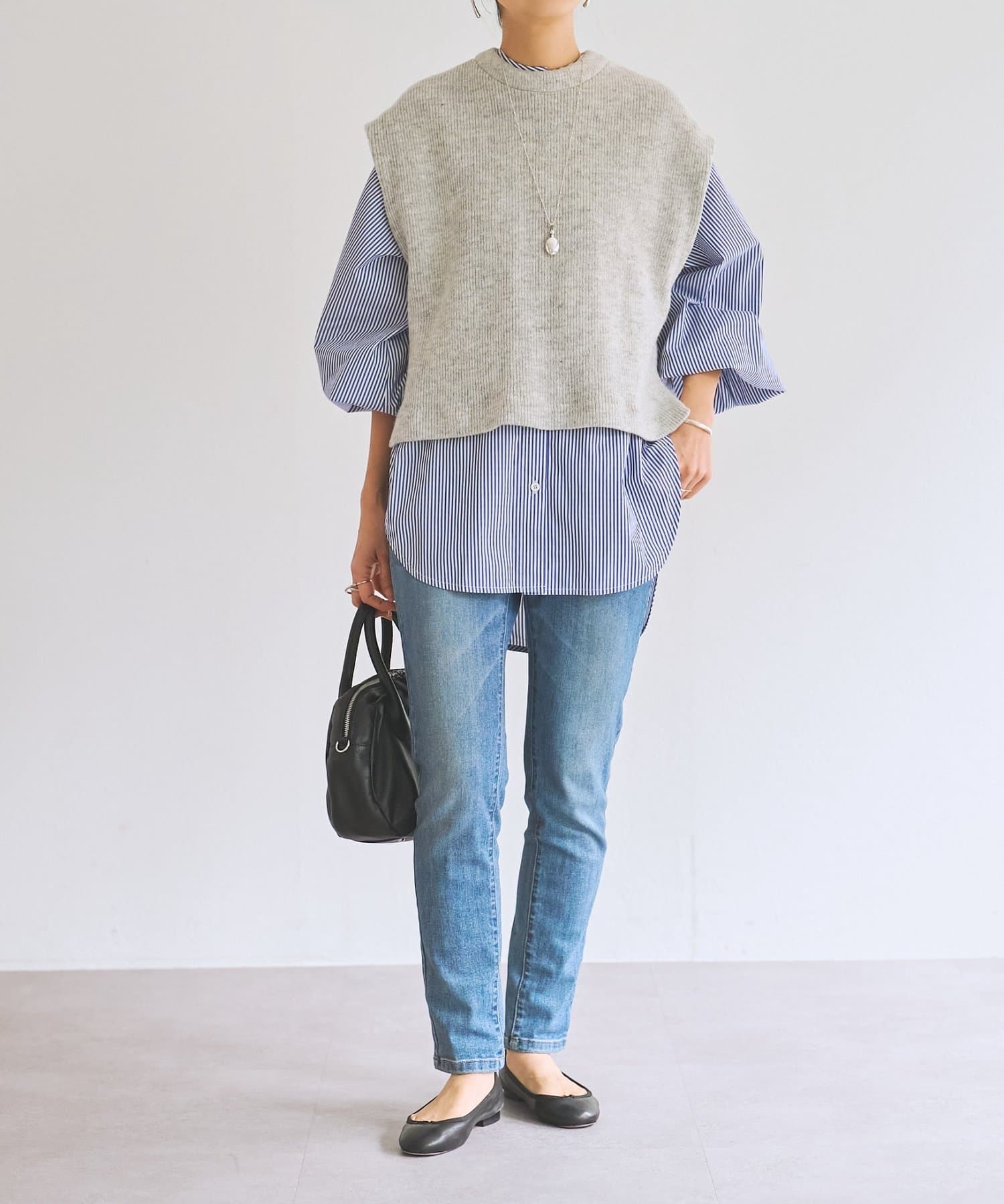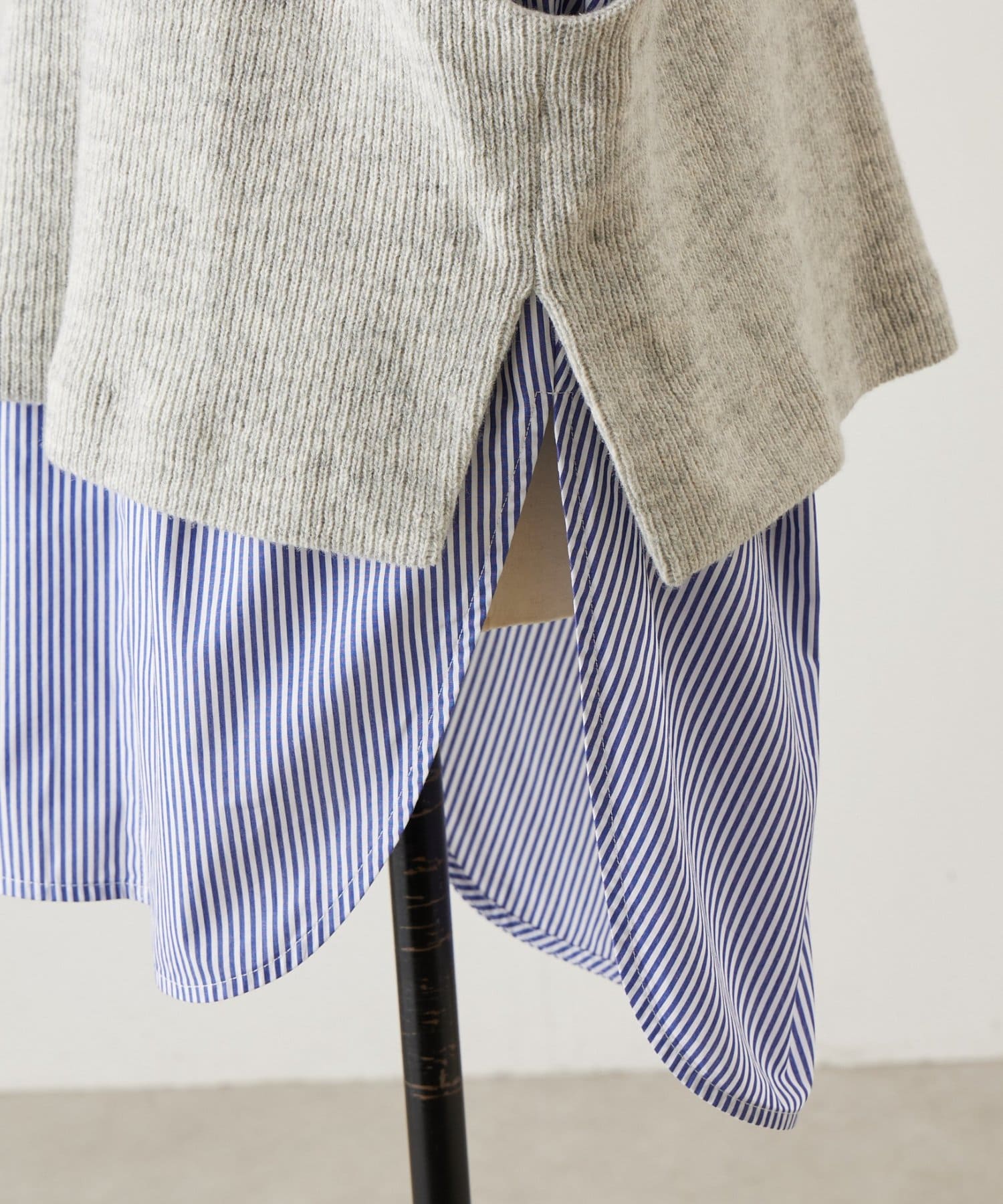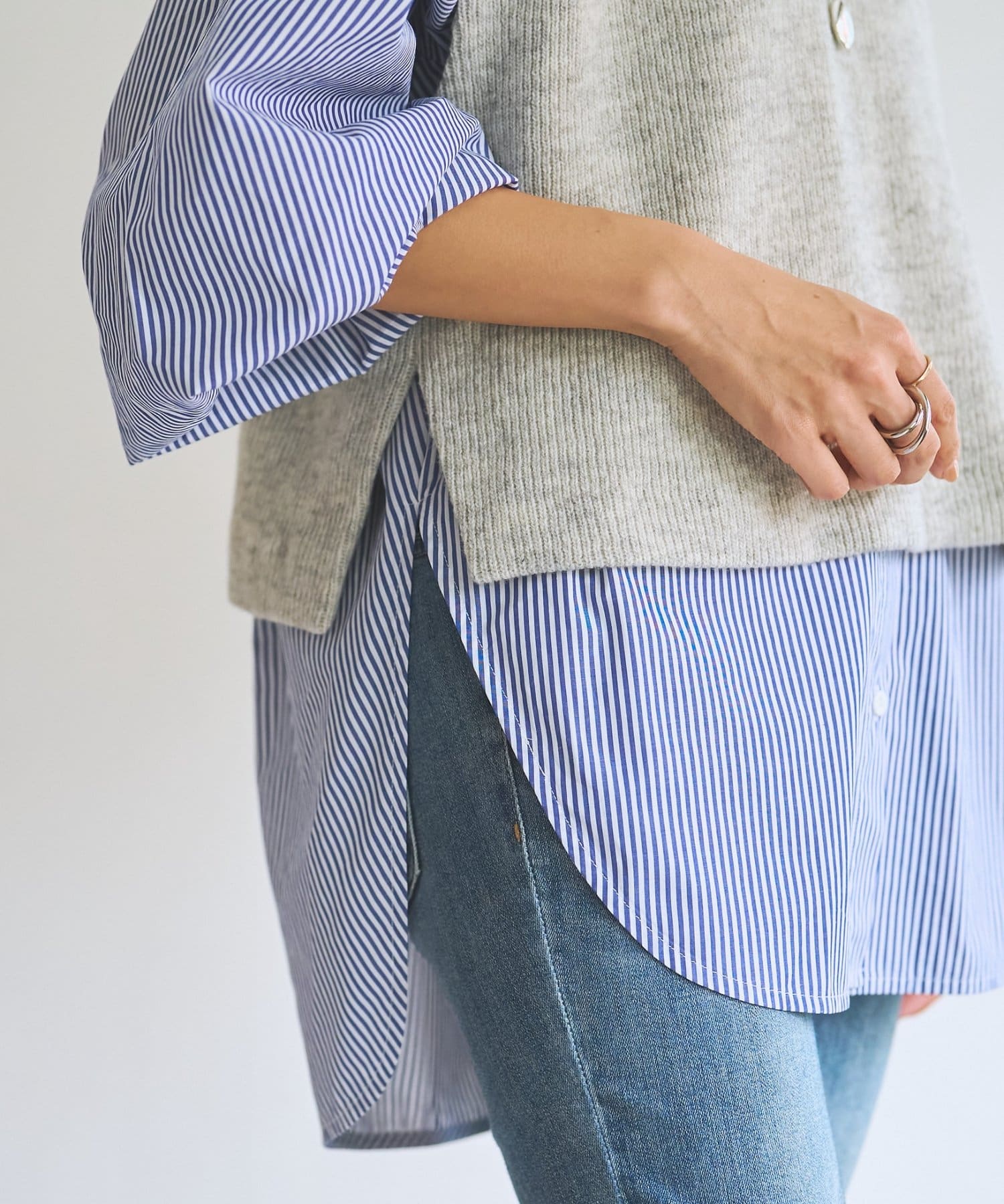 セットのジレはニット素材で、短めの着丈がシャツとのバランスを取りやすいデザイン。