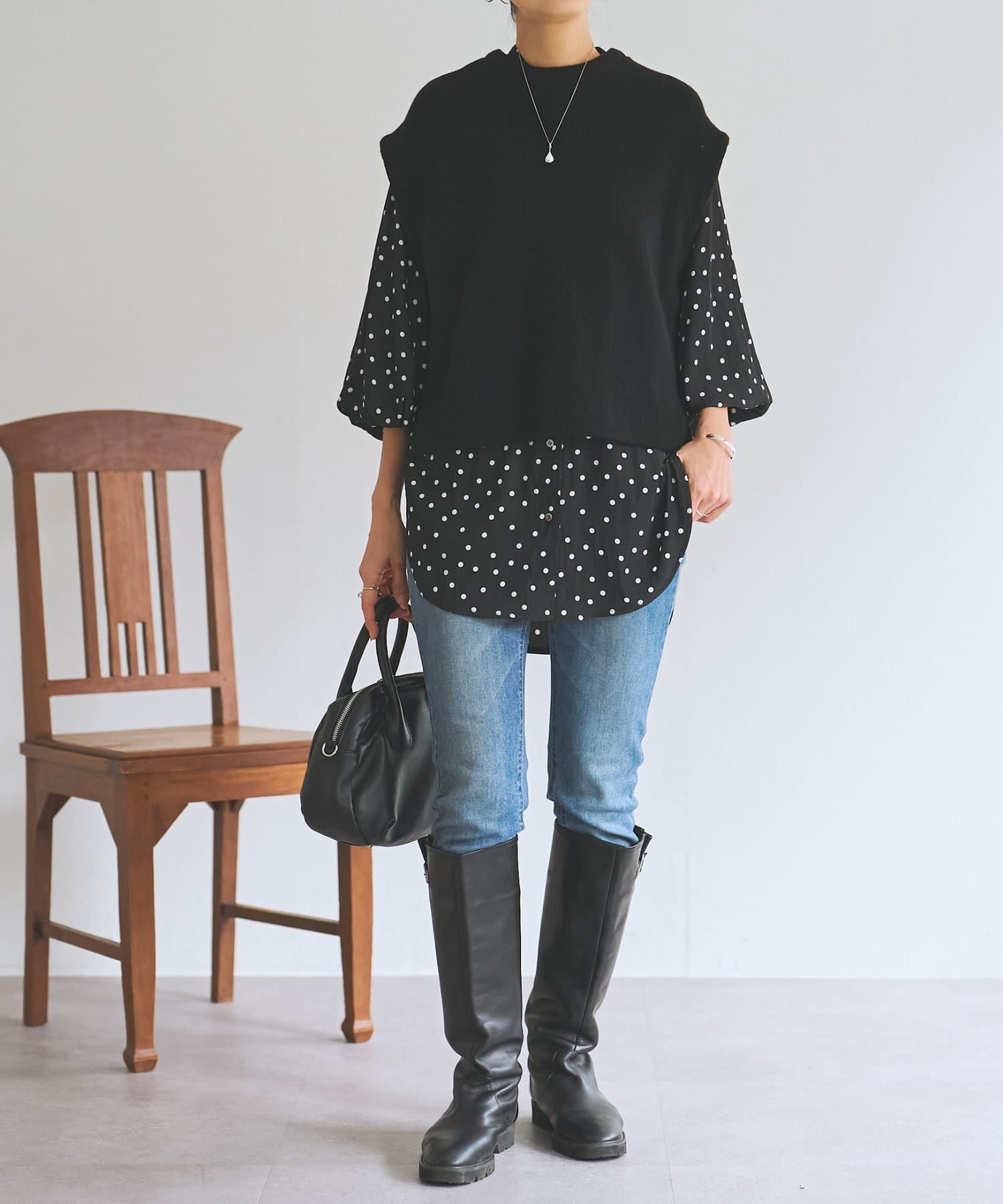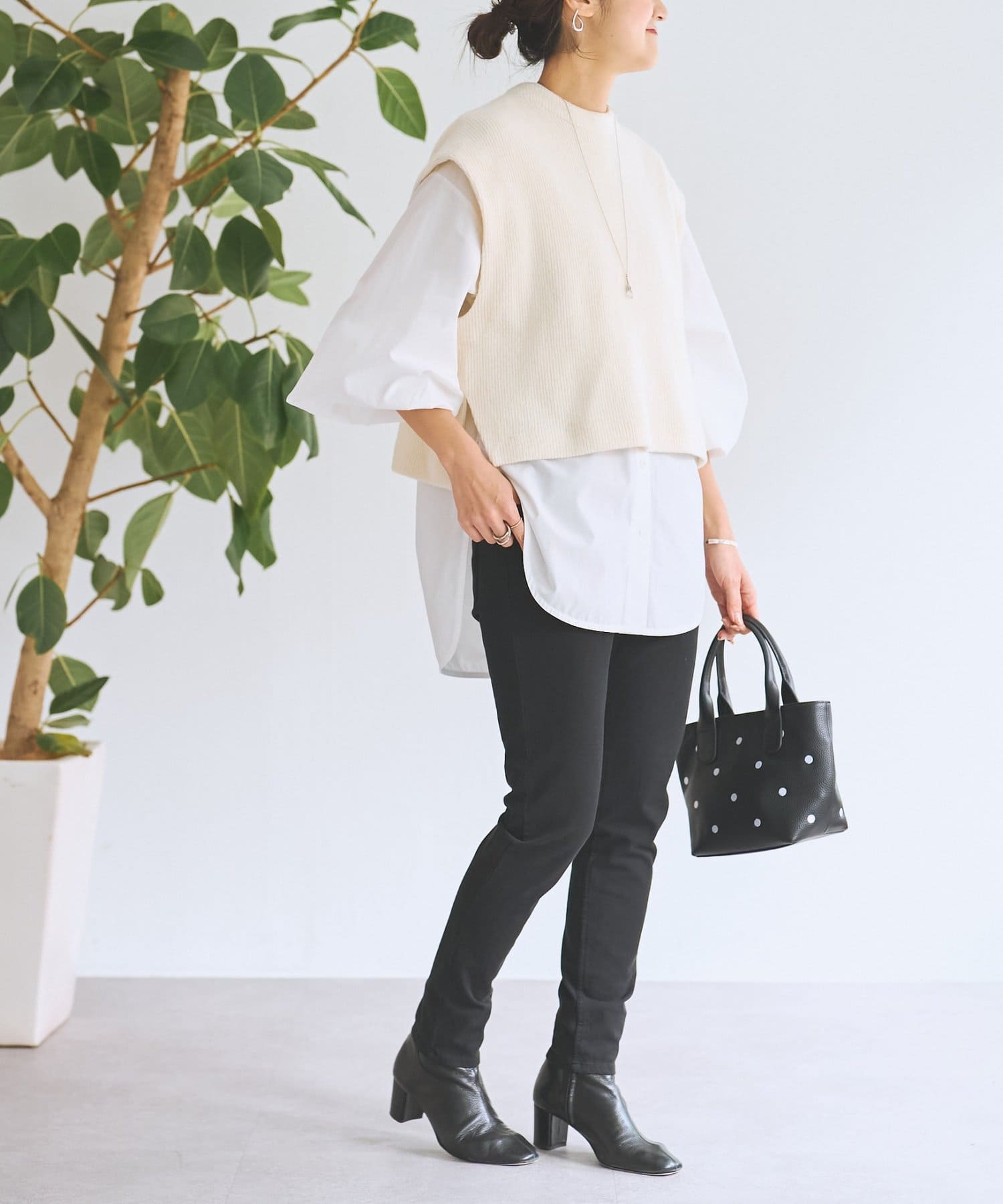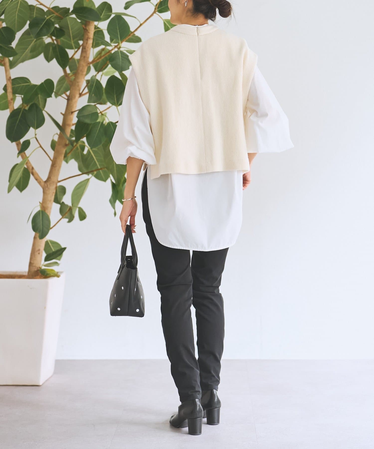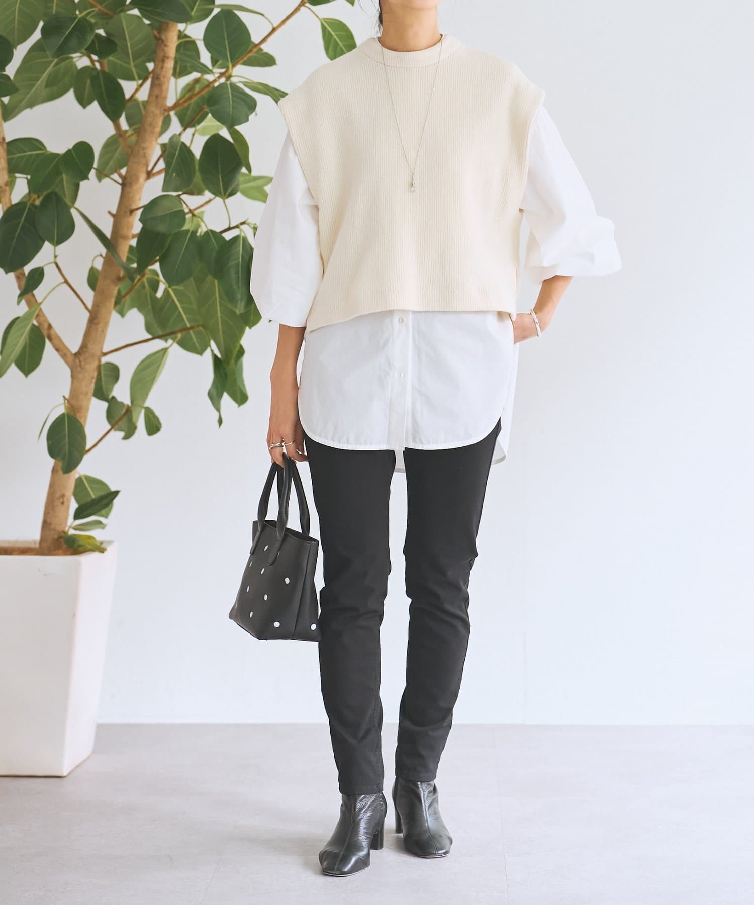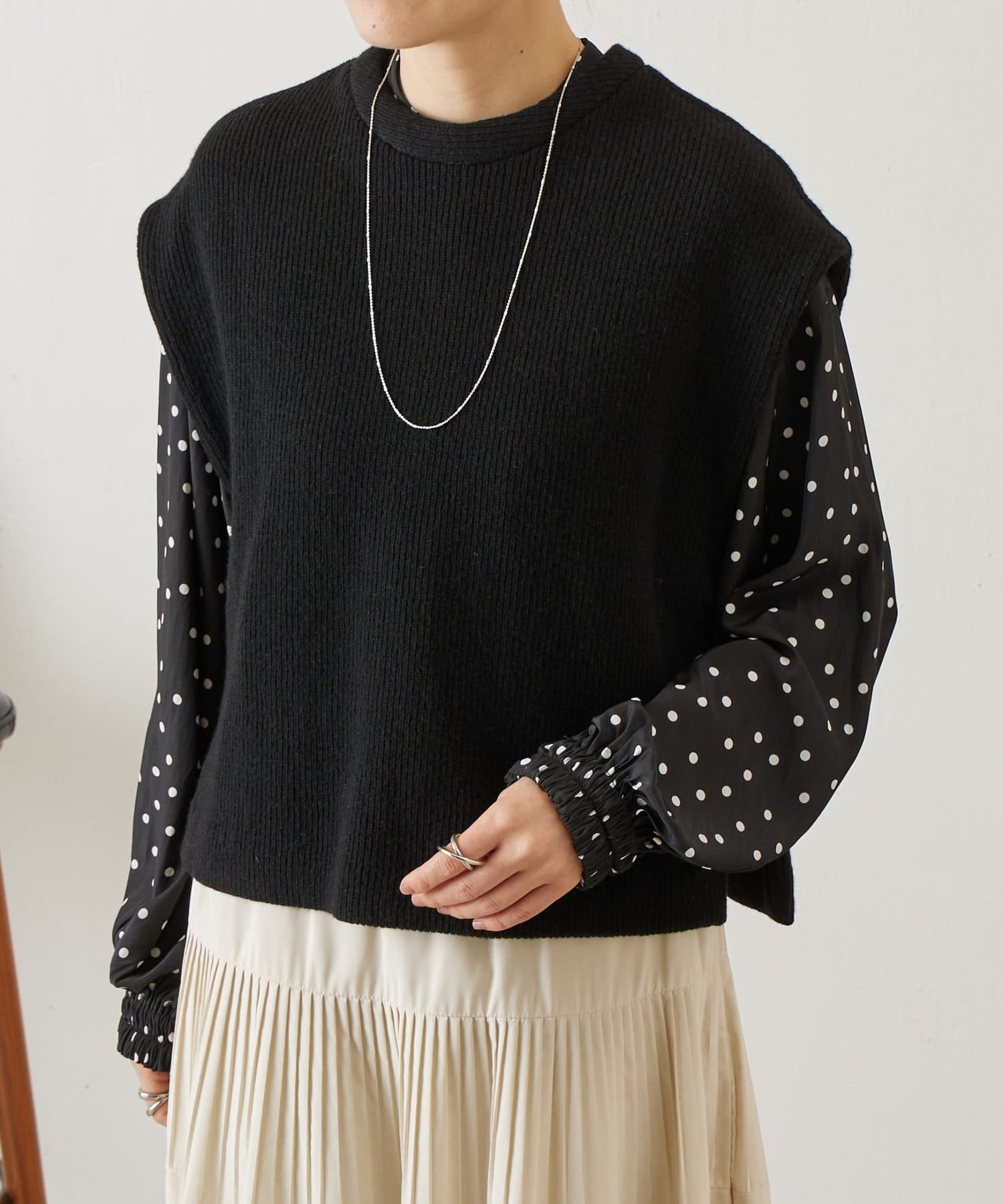 セットのジレはニット素材で、短めの着丈がシャツとのバランスを取りやすいデザイン。