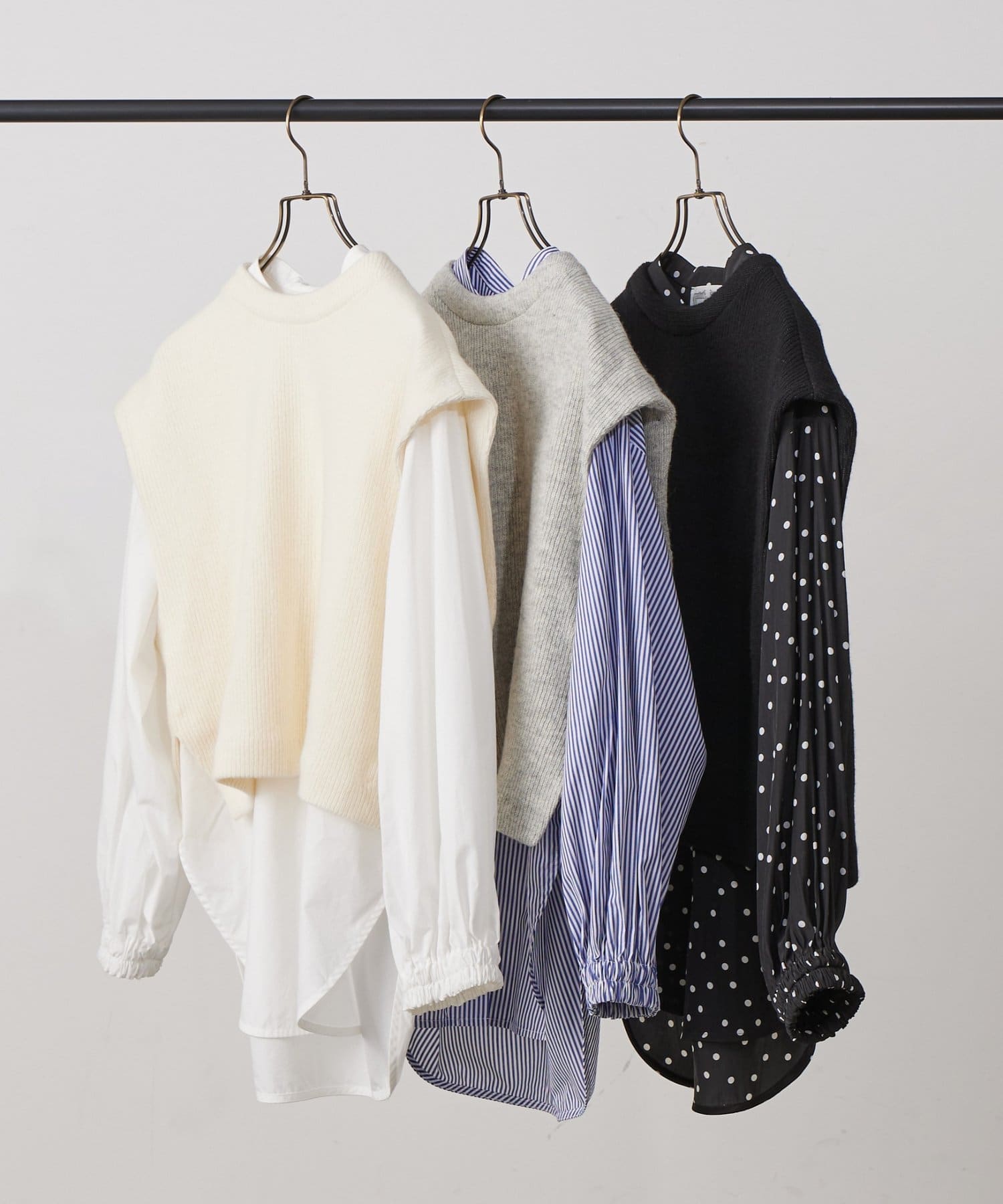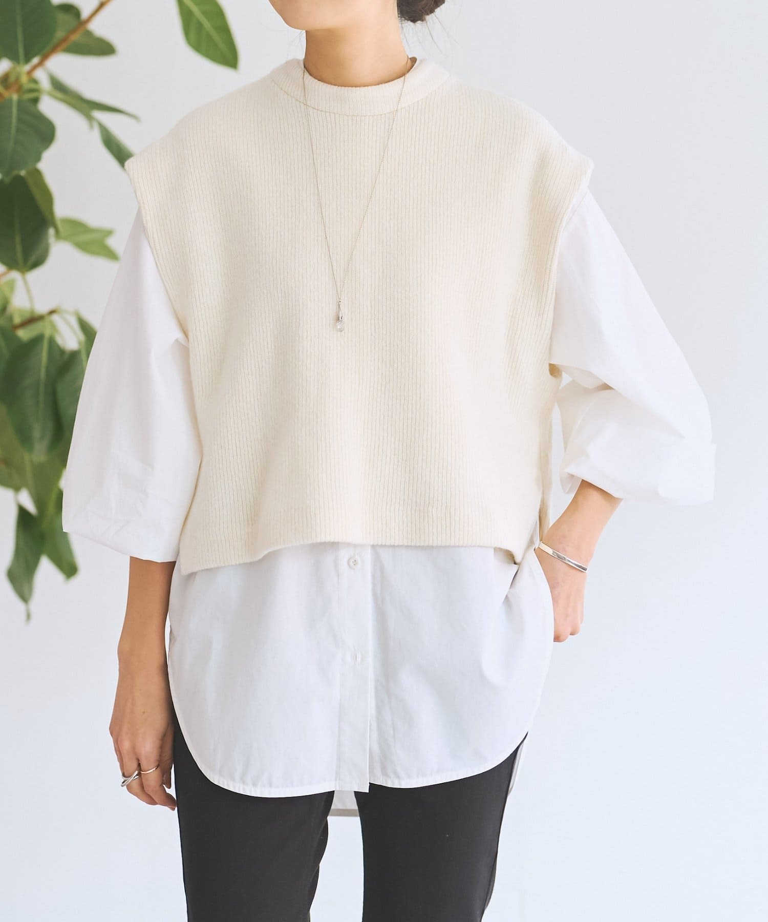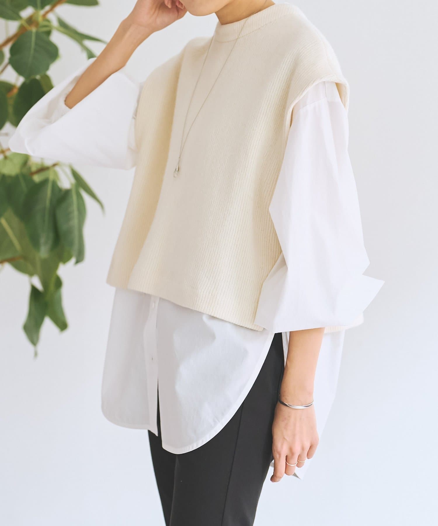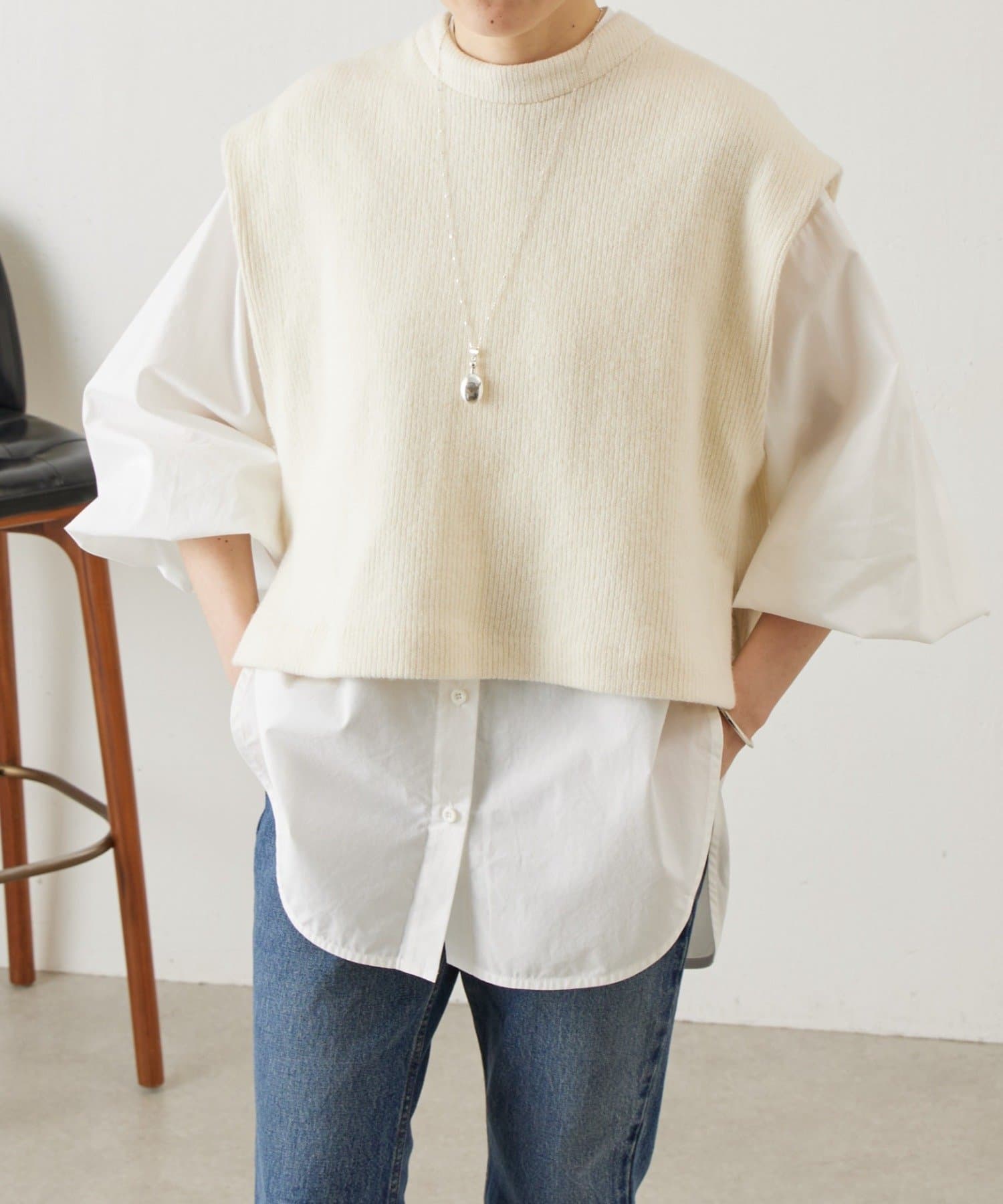 バンドカラーシャツにニットジレを組み合わせた着回し力抜群のセットアイテム。