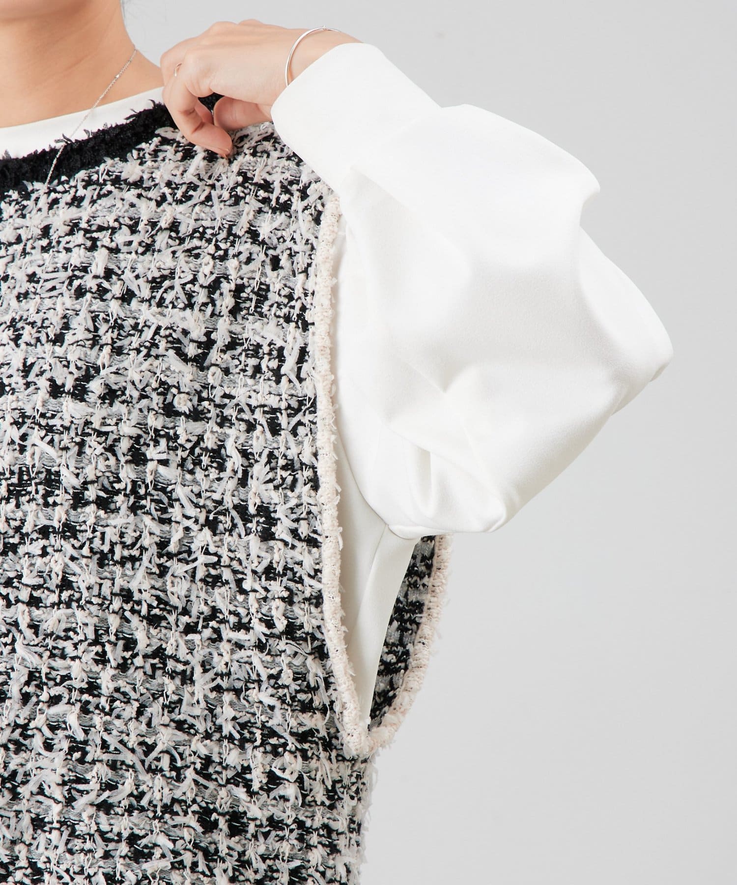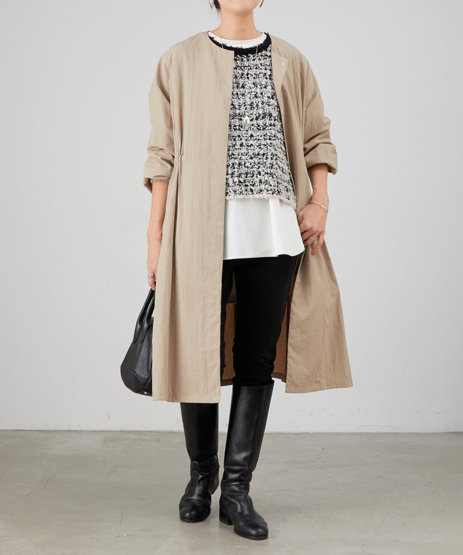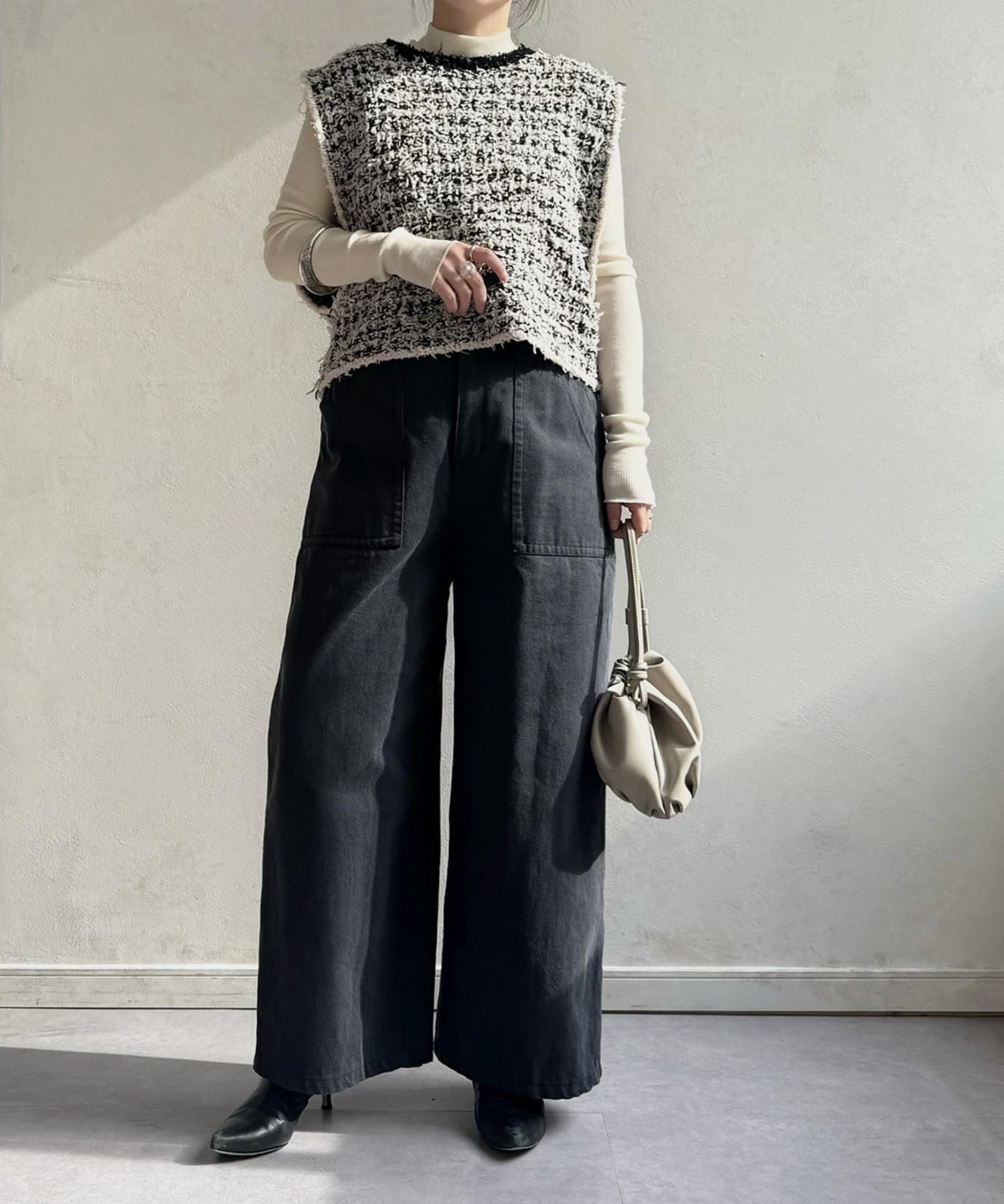 アームホールは広めに設定しているため、ドルマンスリーブのトップスにも重ねやすく、幅広いレイヤードに対応。