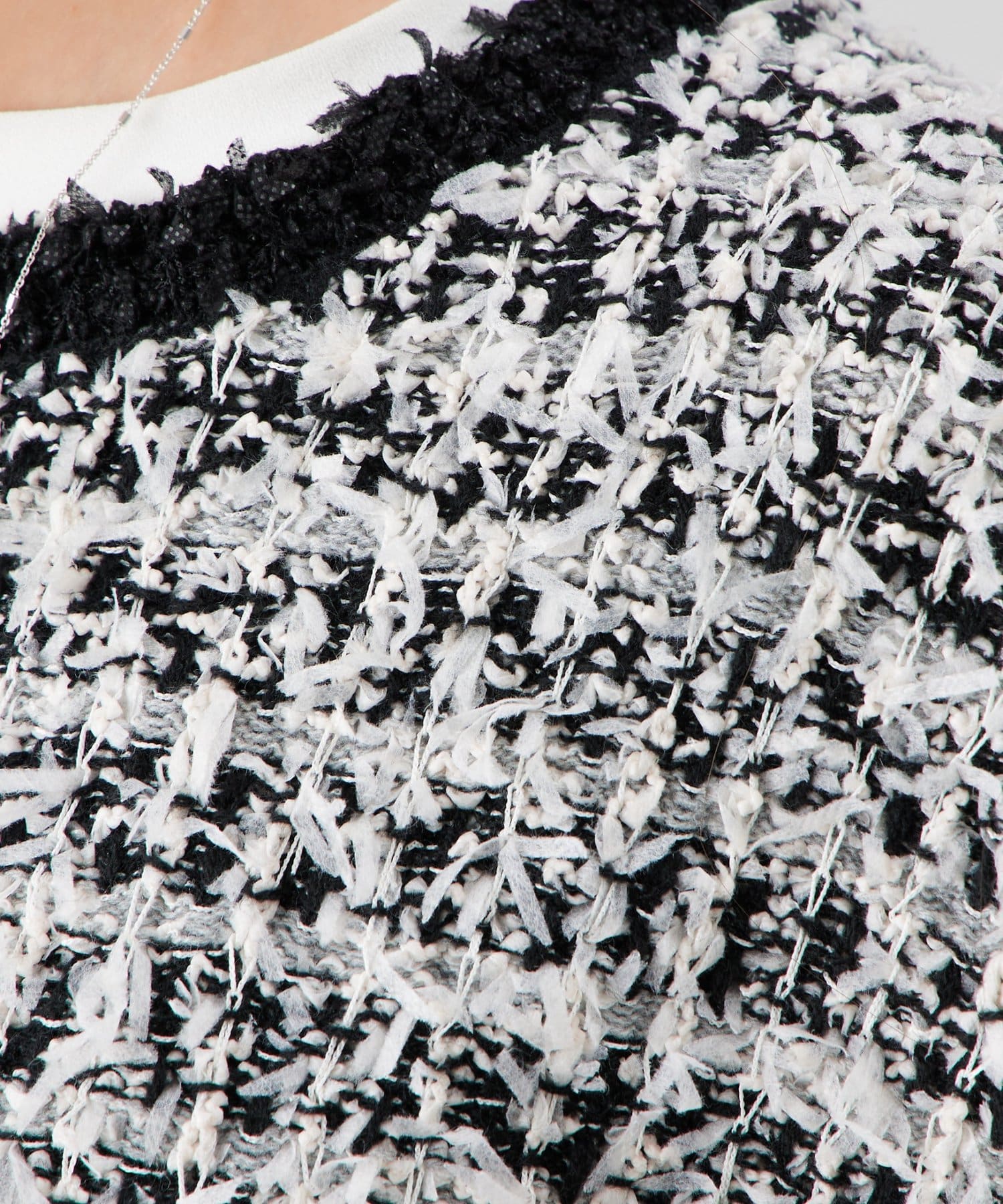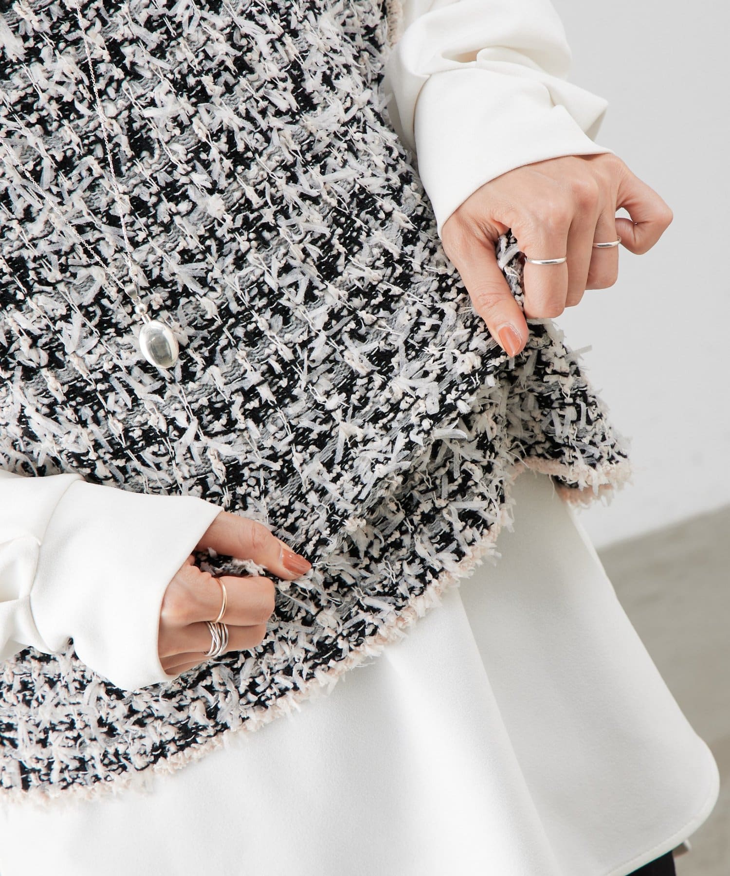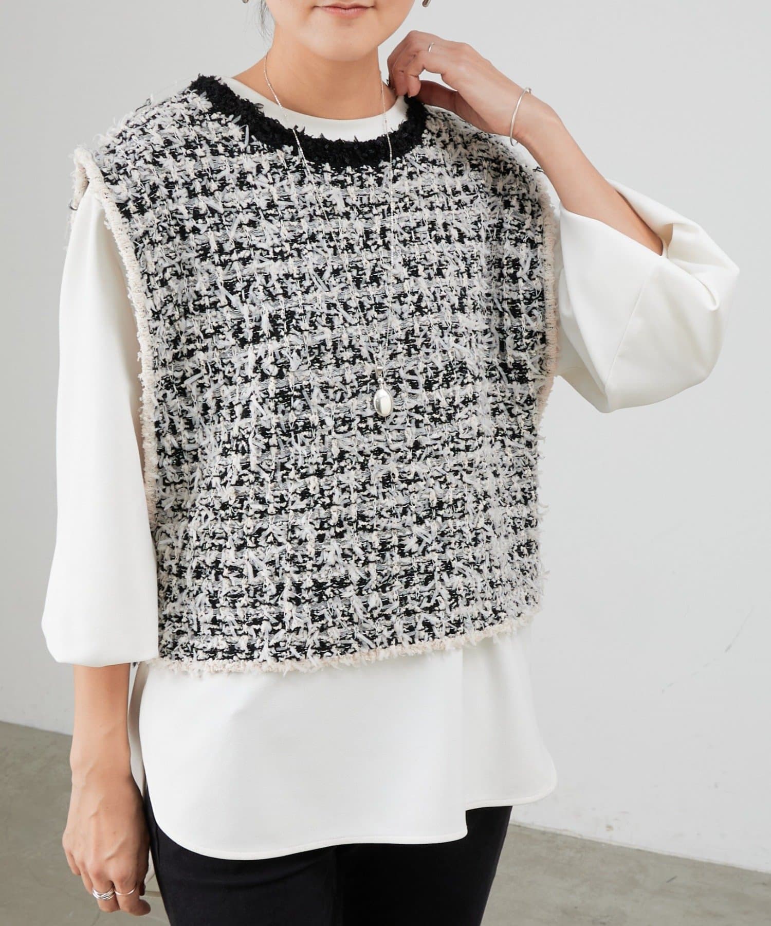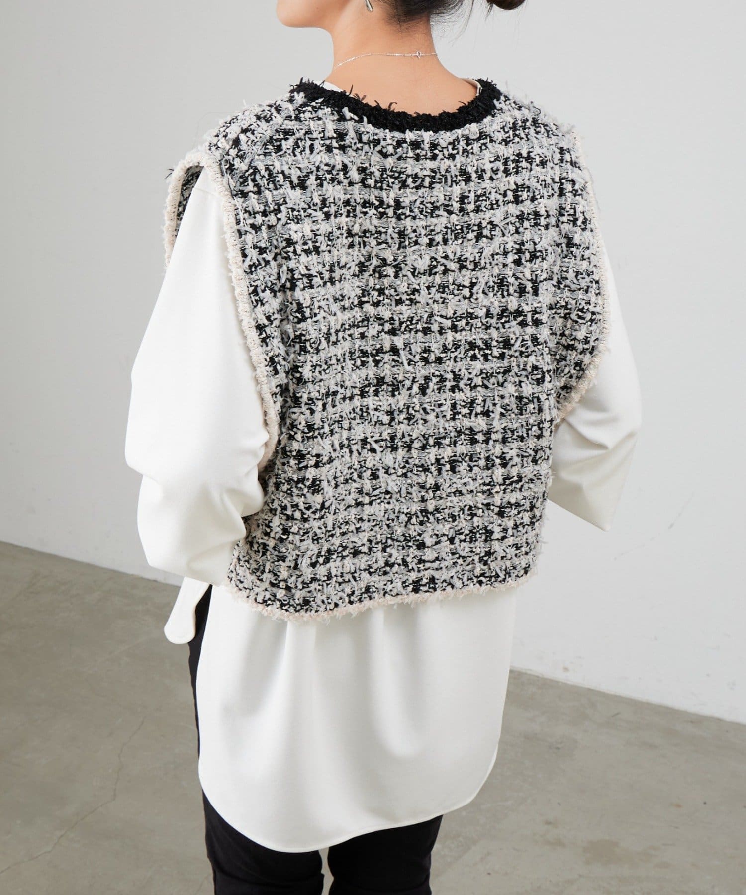 細切りのファンシーヤーンを編み込み、クラフト感のある表情に仕上げたツイード風ニットベスト。