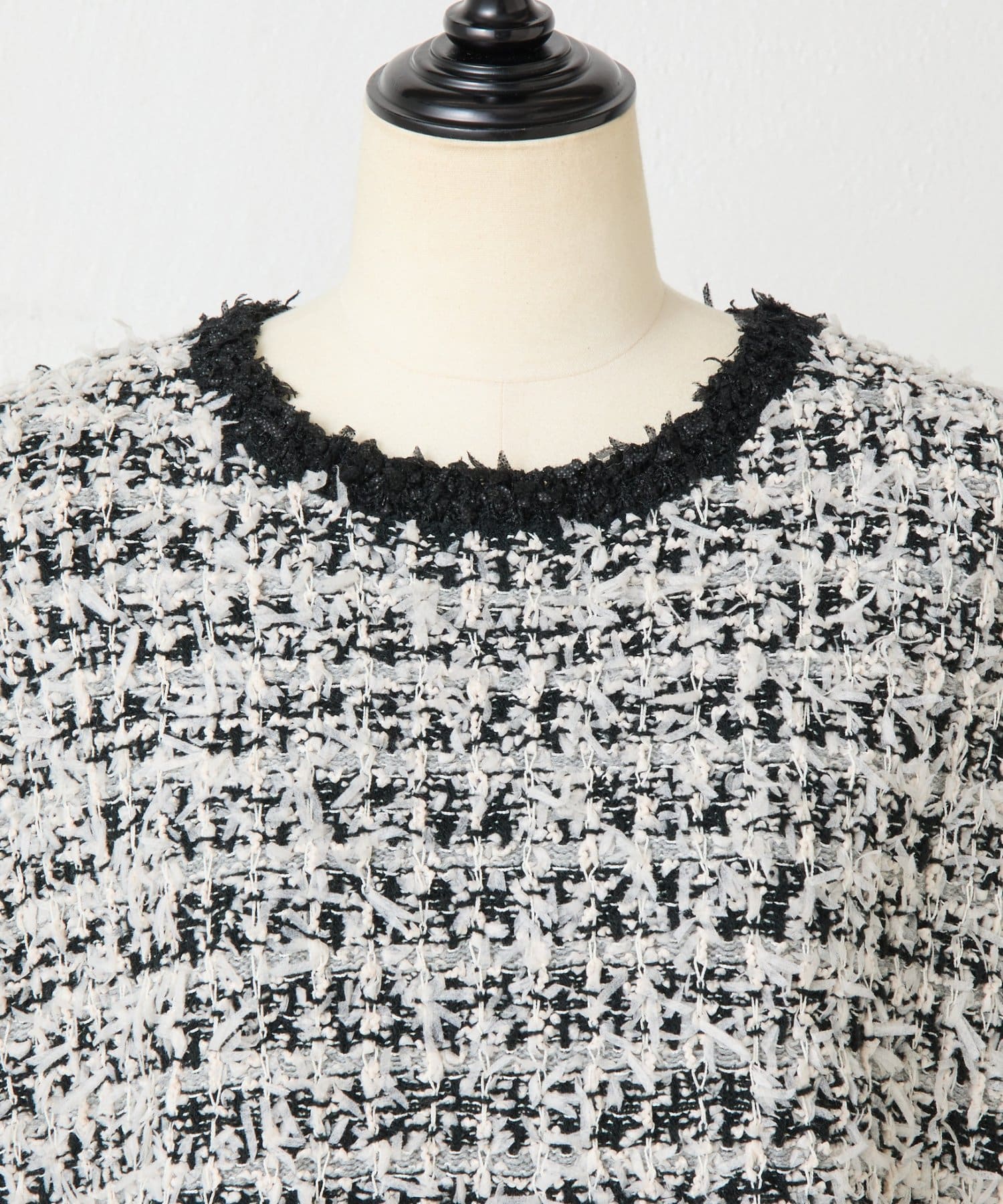 細切りのファンシーヤーンを編み込み、クラフト感のある表情に仕上げたツイード風ニットベスト。