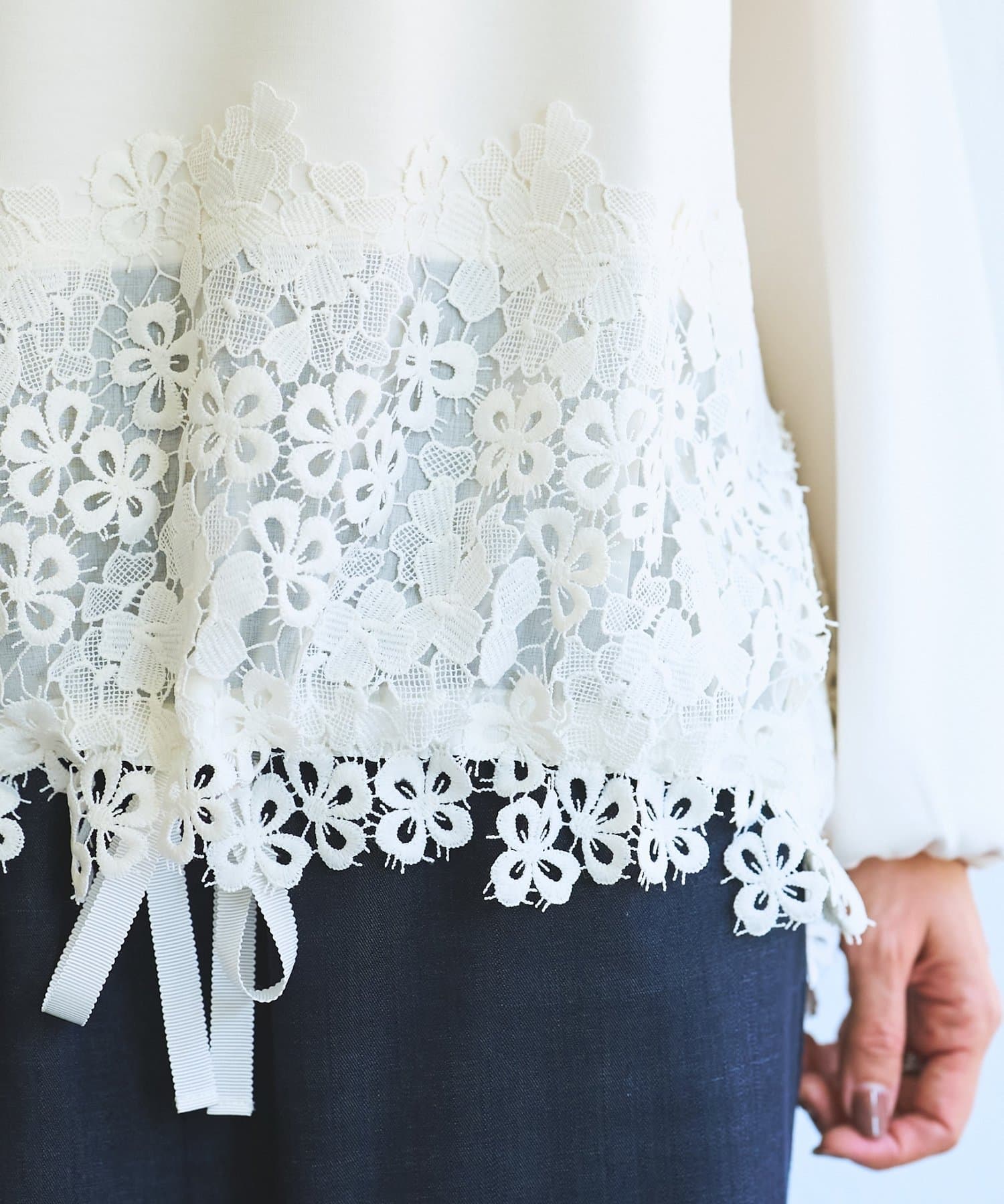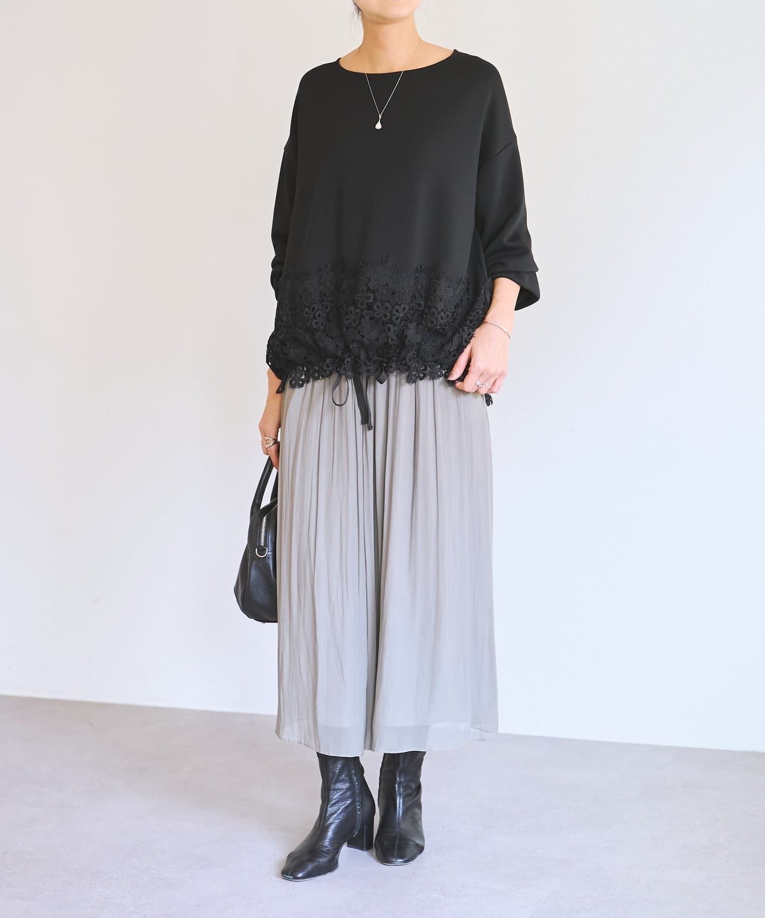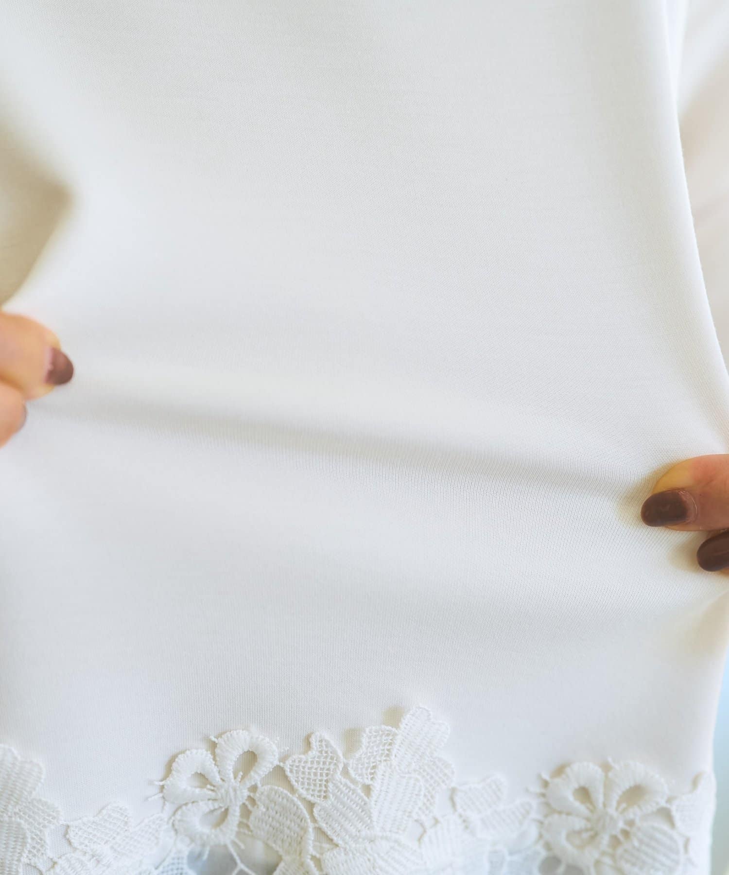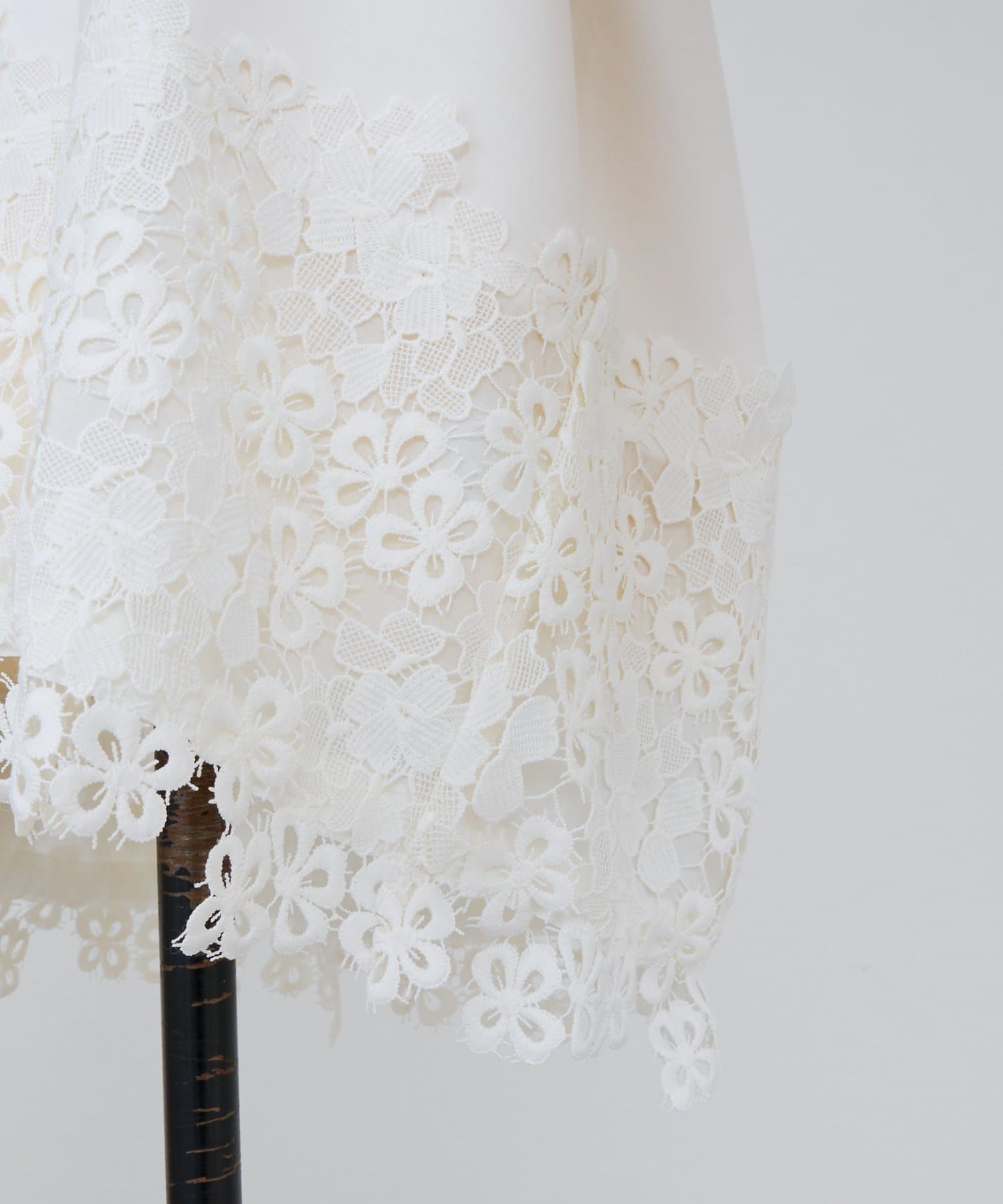 裾はシアー感のある生地に切り替え、その上に幅広のレースを重ねることで、ほどよい透け感が上品なアクセントに。