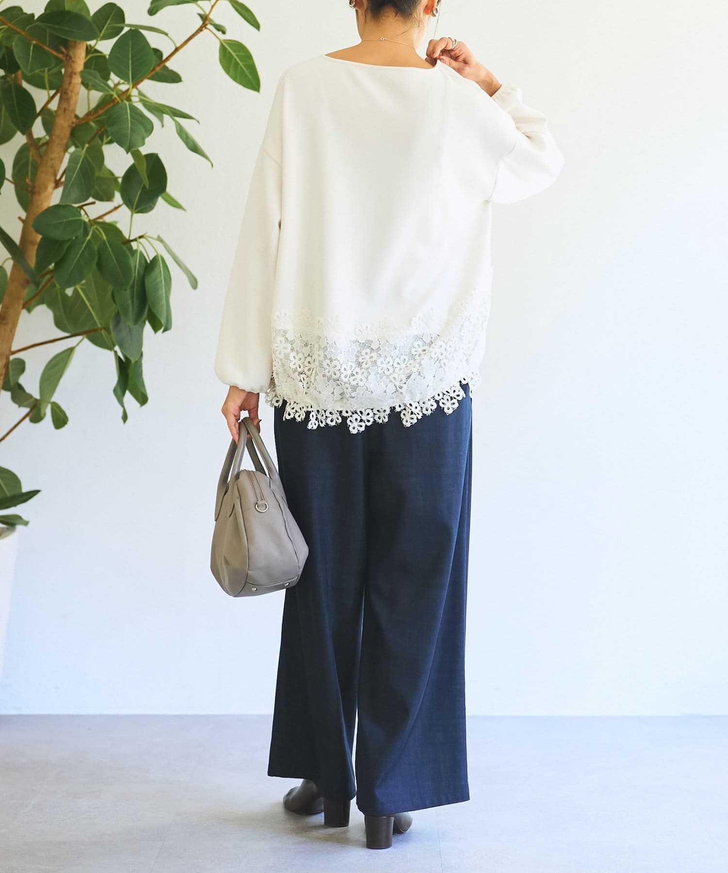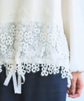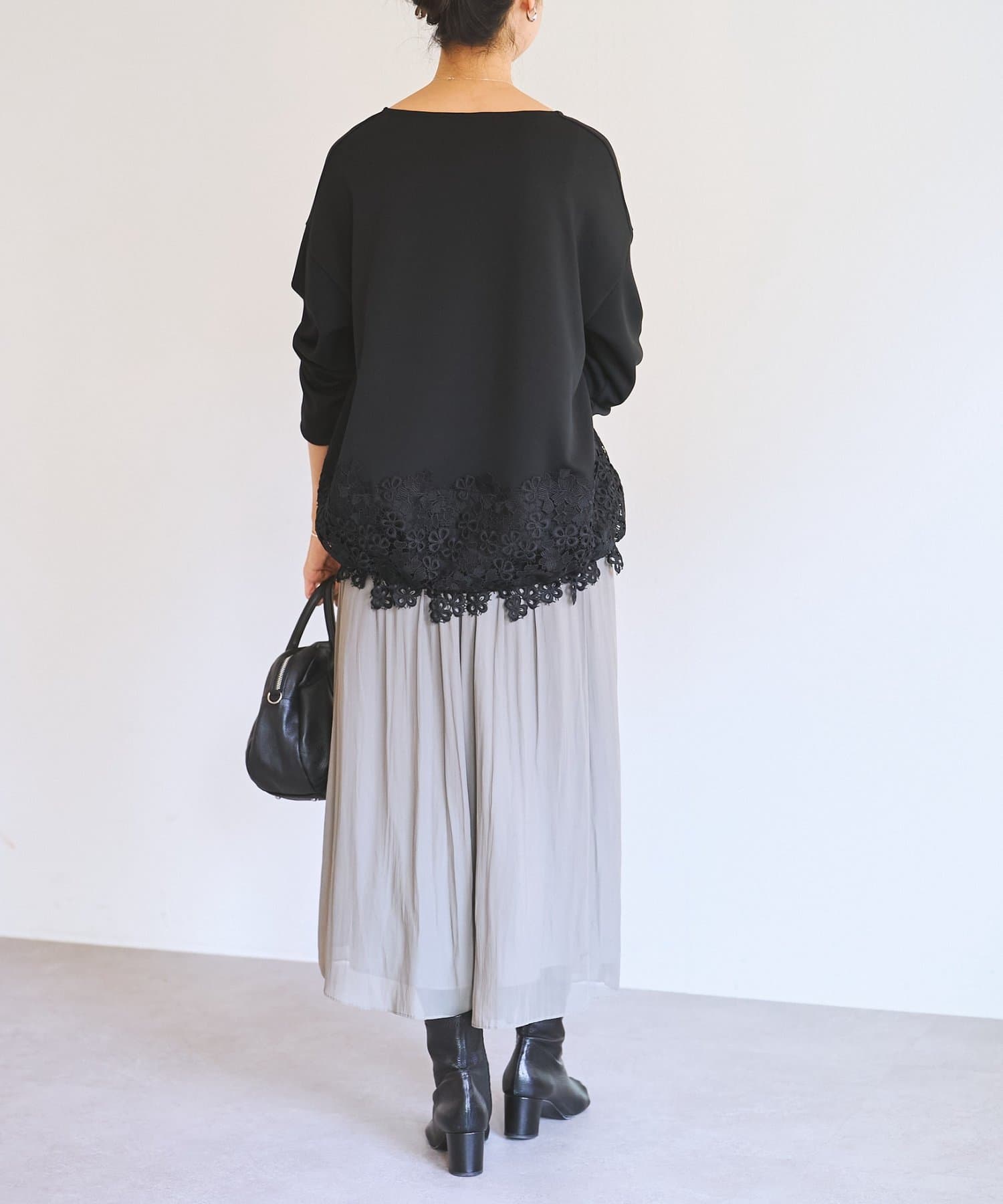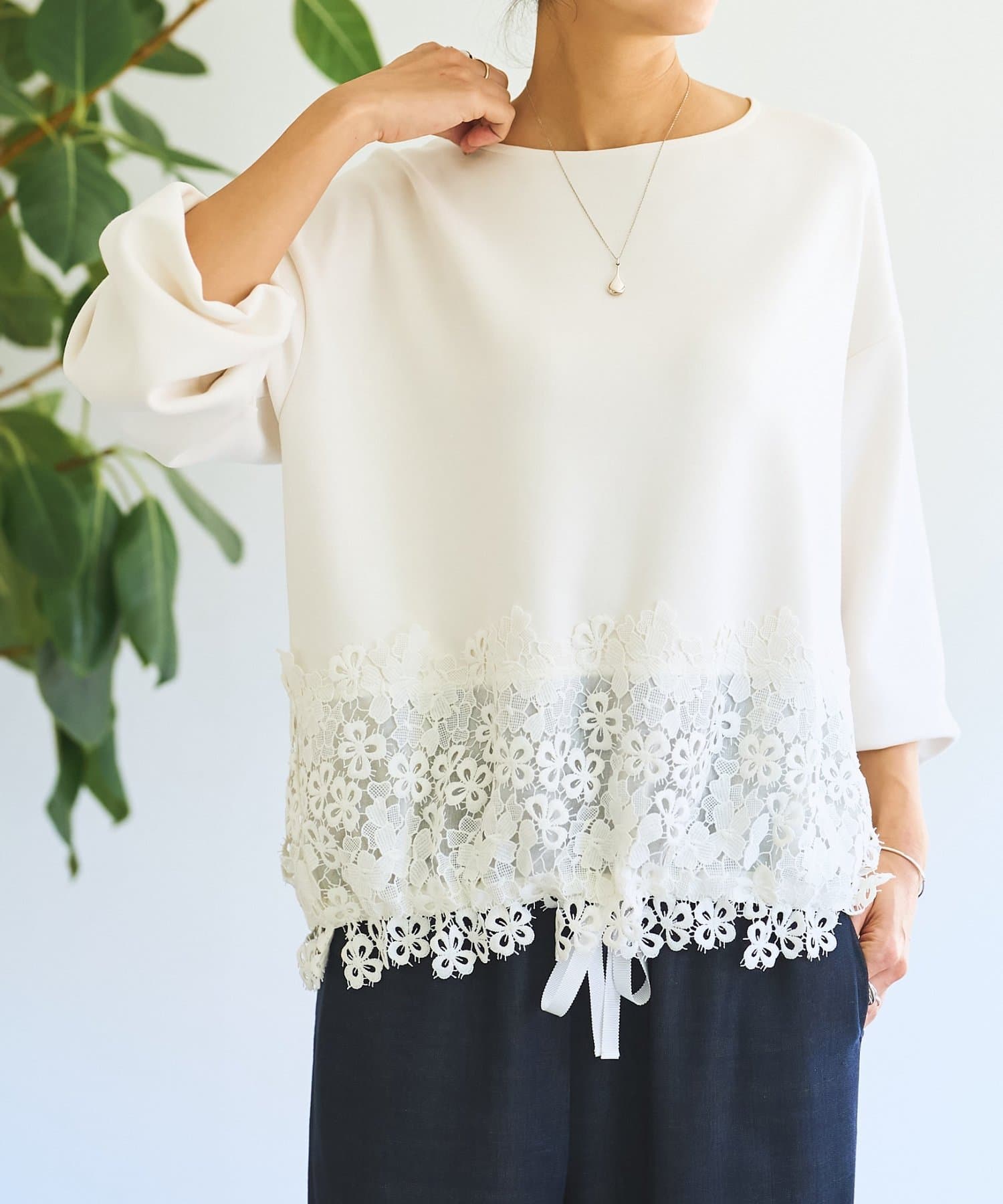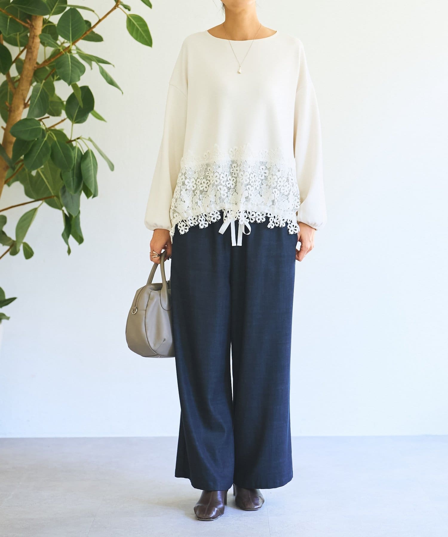 身頃とレースを同系色でまとめることで、甘さを抑えつつ大人に似合う品の良さをプラスした、デイリーに取り入れやすい一枚です。