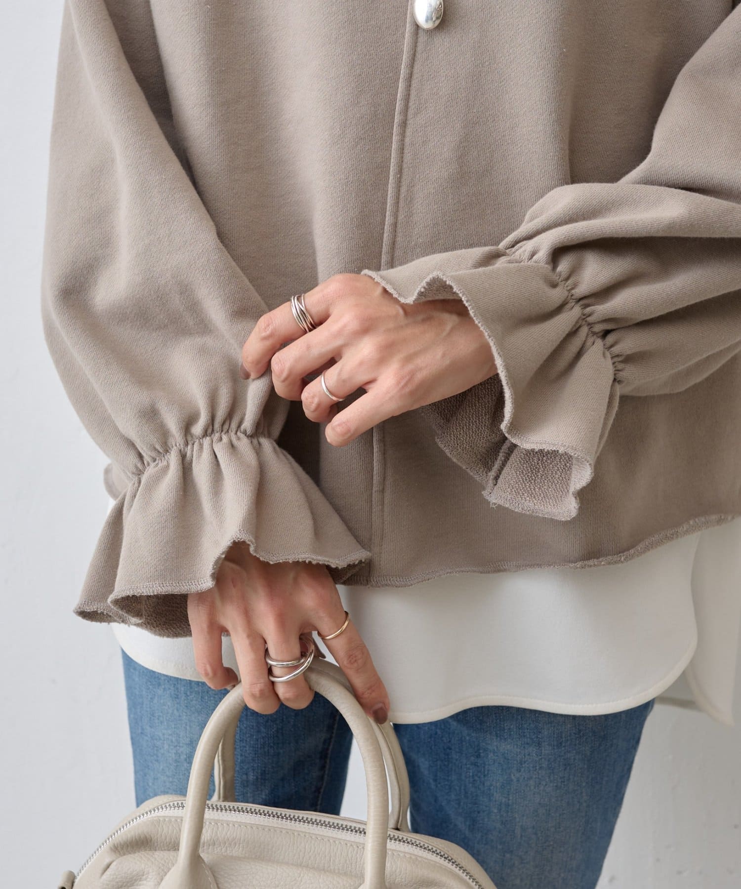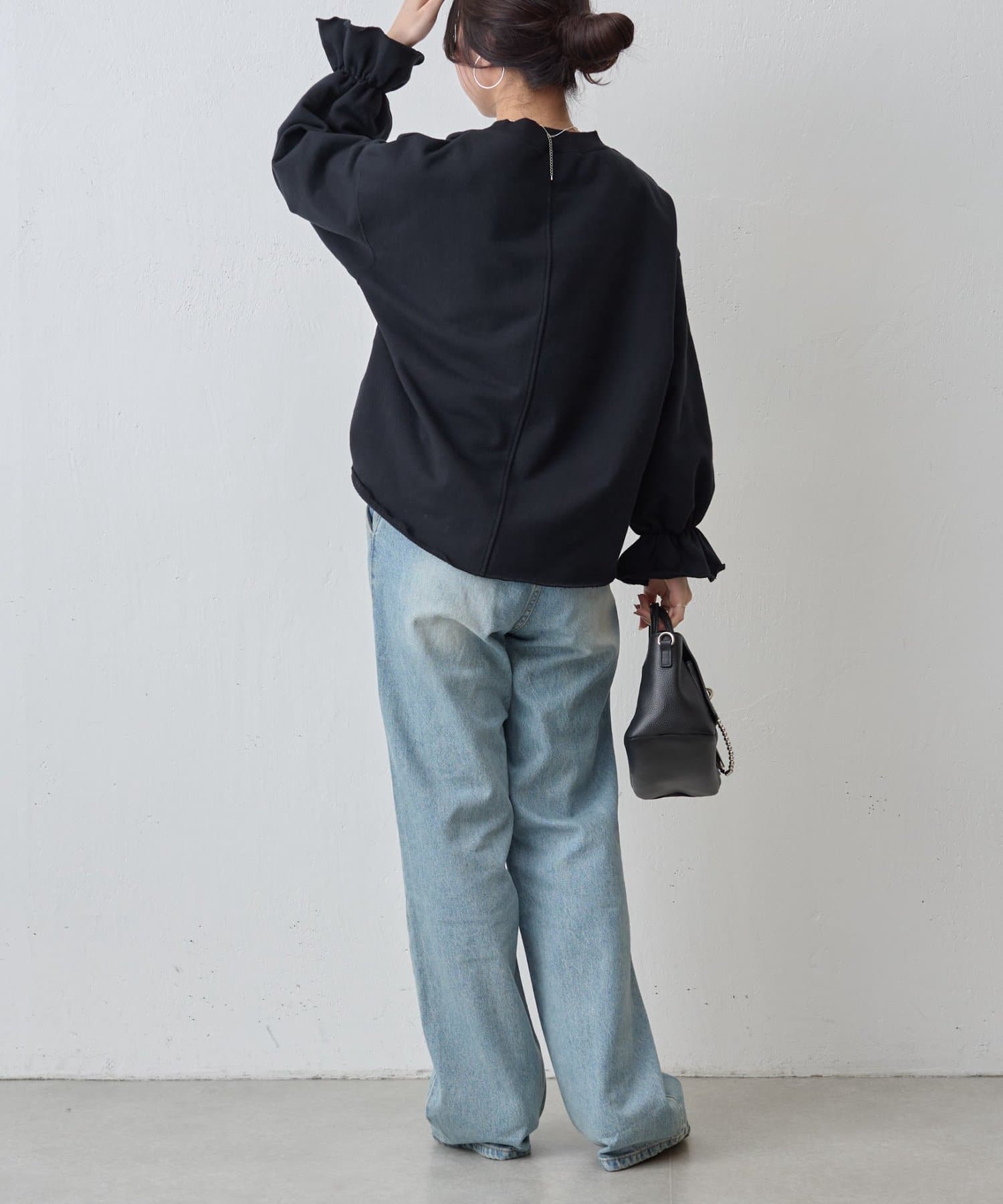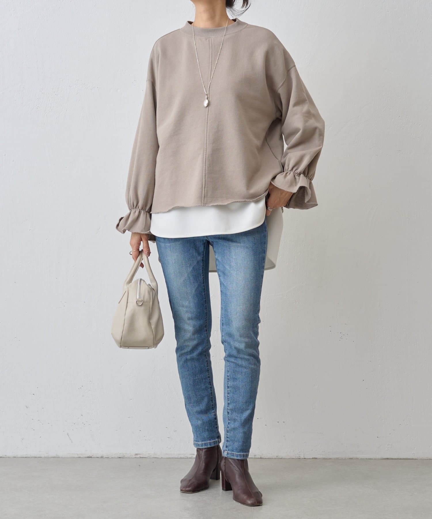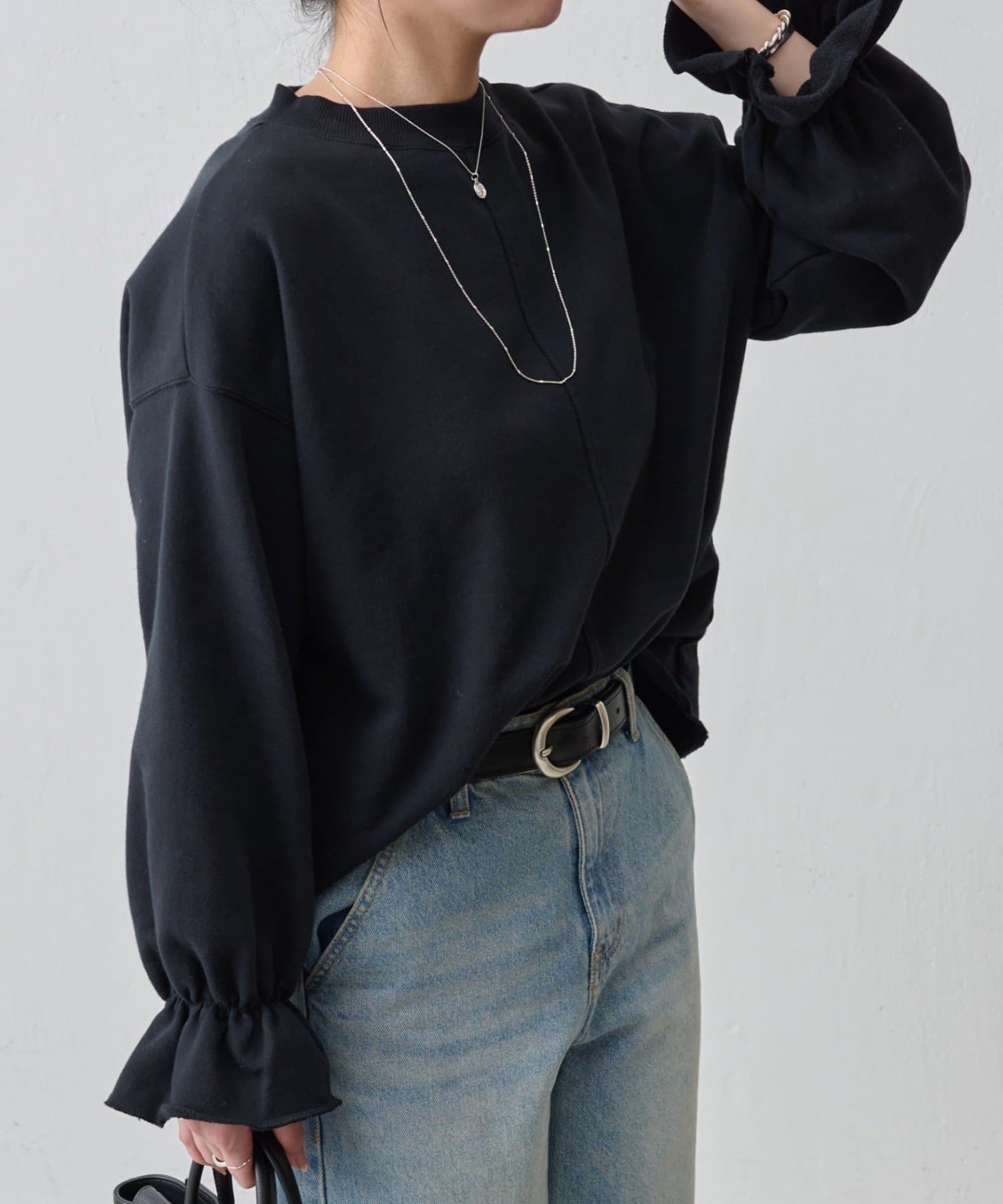 袖口のフリルと、裾・袖口をロックミシンで仕上げたラフさが絶妙なバランスで、甘さを控えた大人のスウェットスタイルが楽しめます。