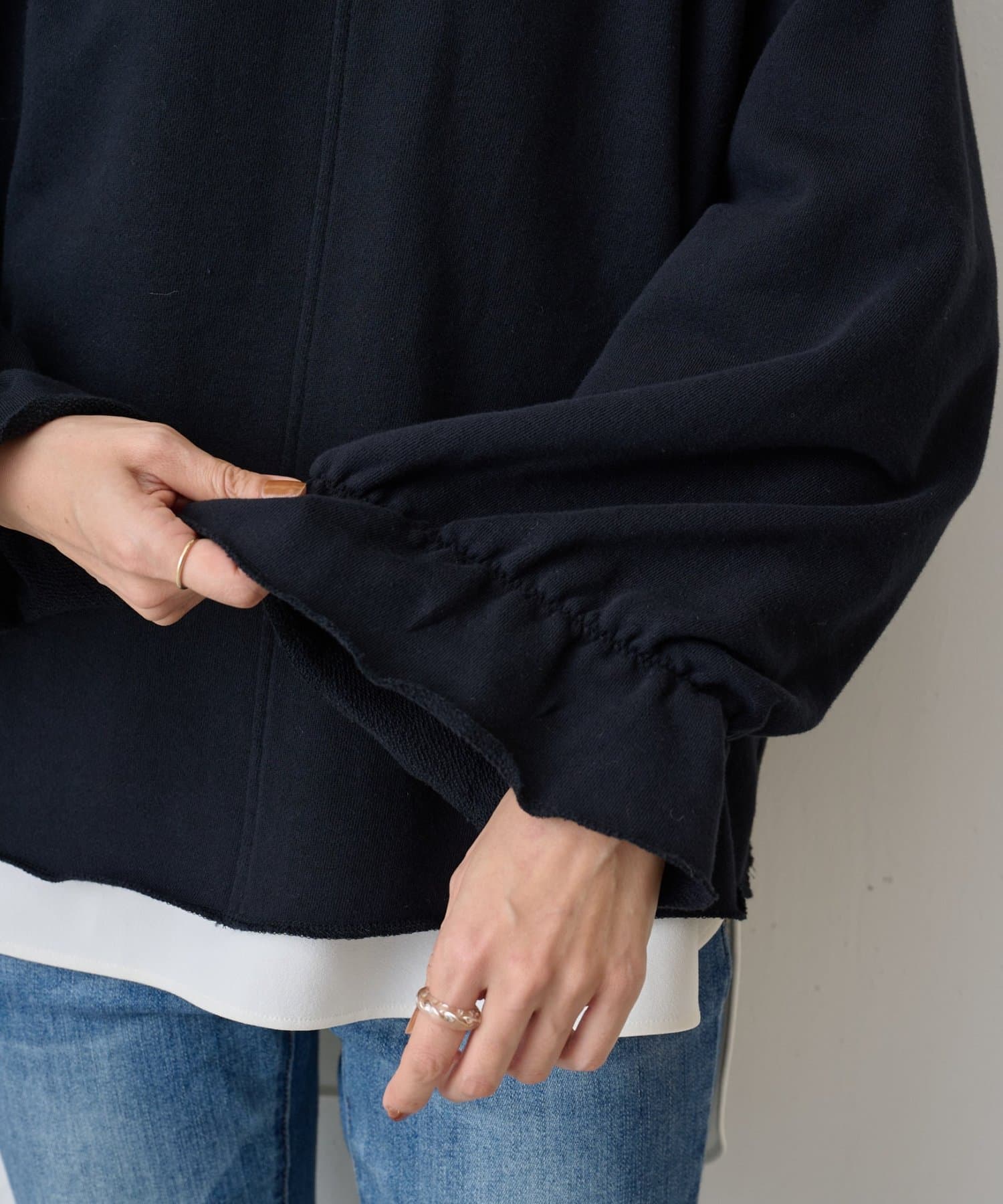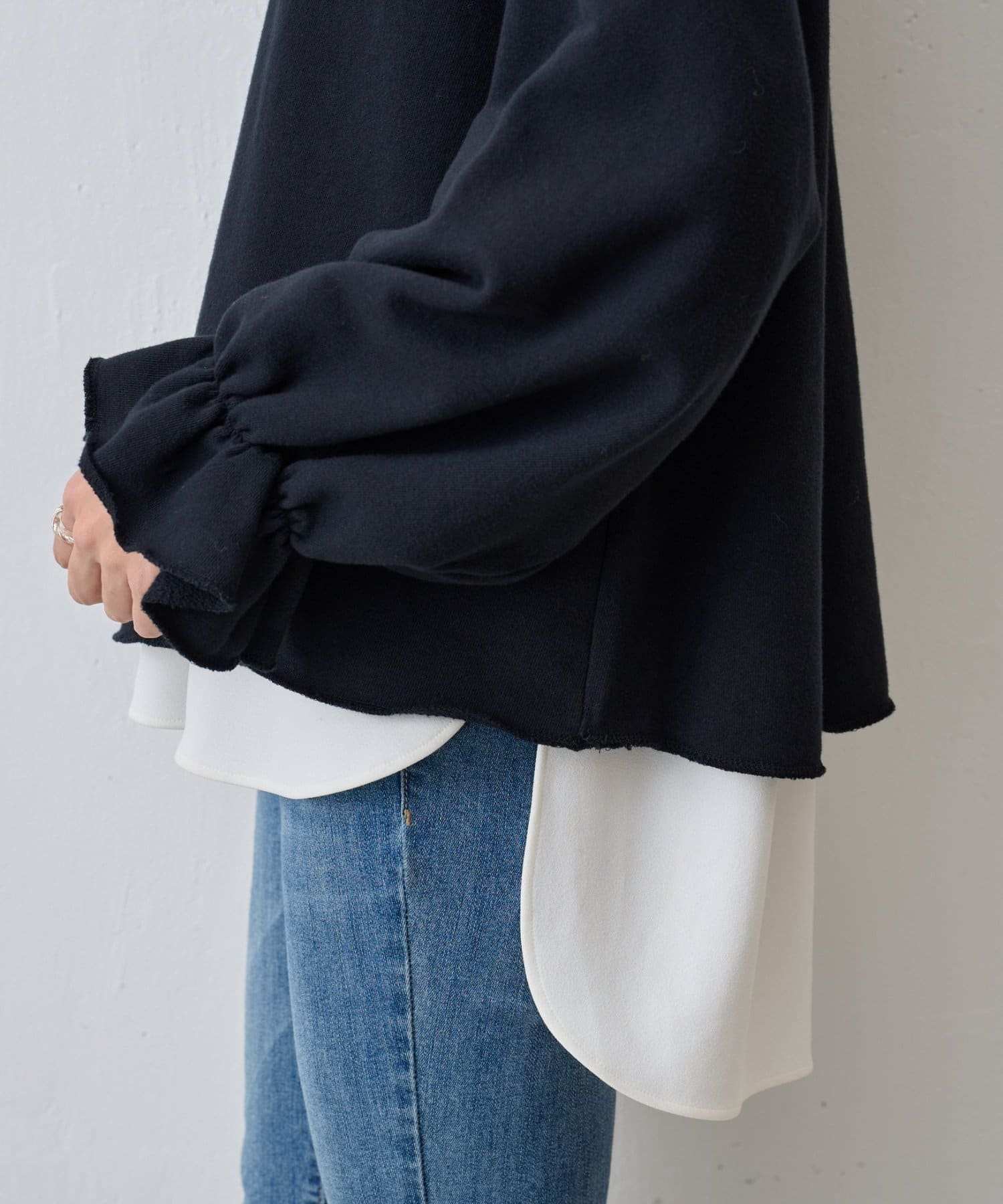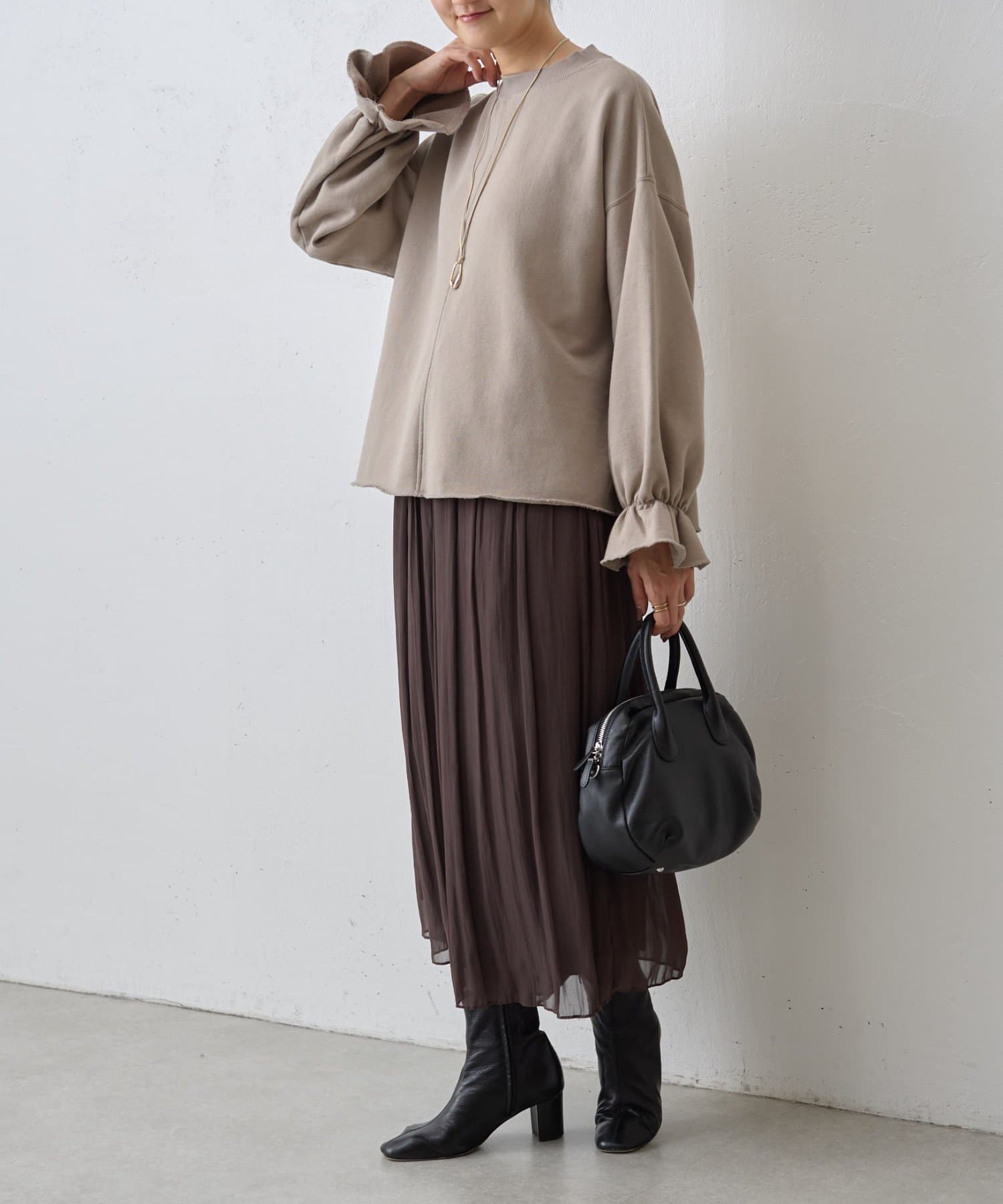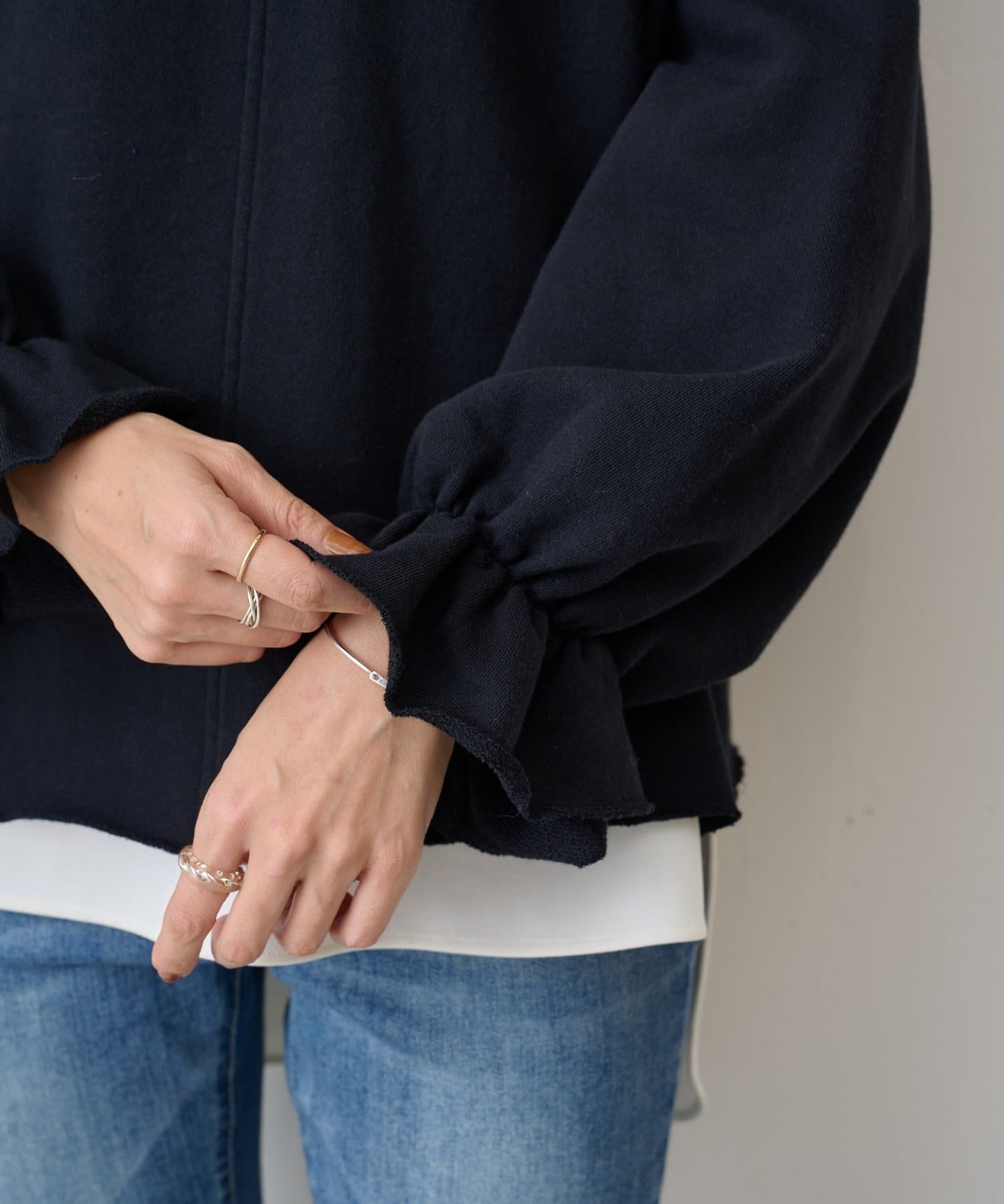 袖口のフリルと、裾・袖口をロックミシンで仕上げたラフさが絶妙なバランスで、甘さを控えた大人のスウェットスタイルが楽しめます。