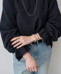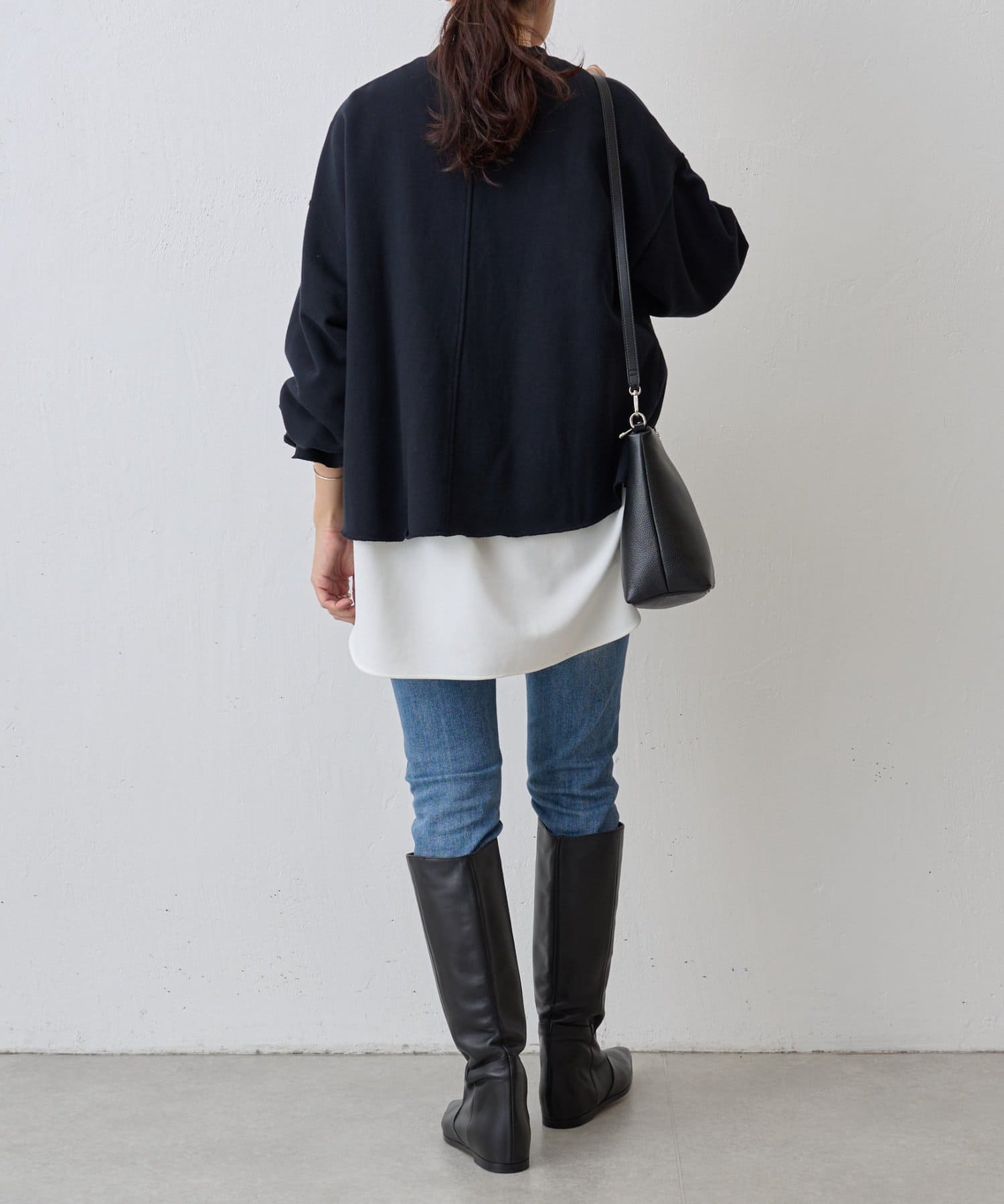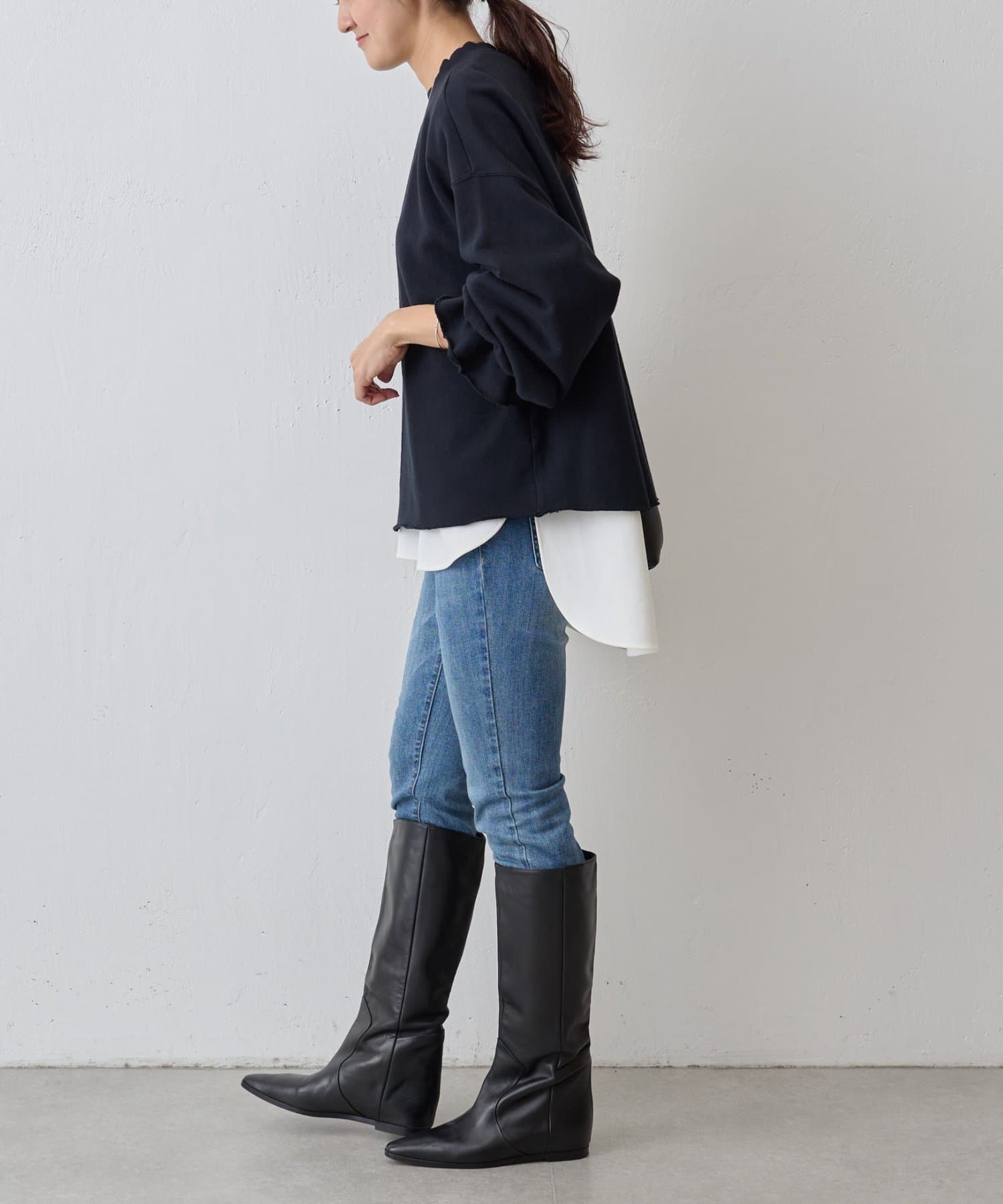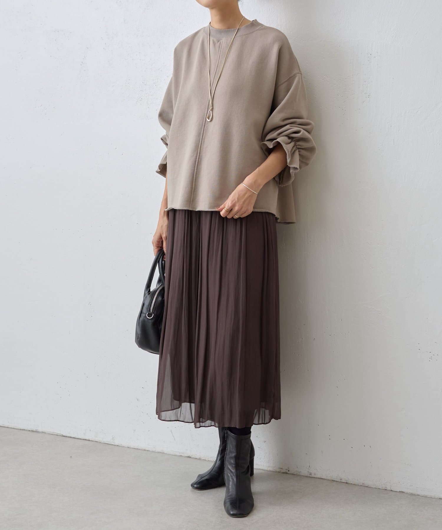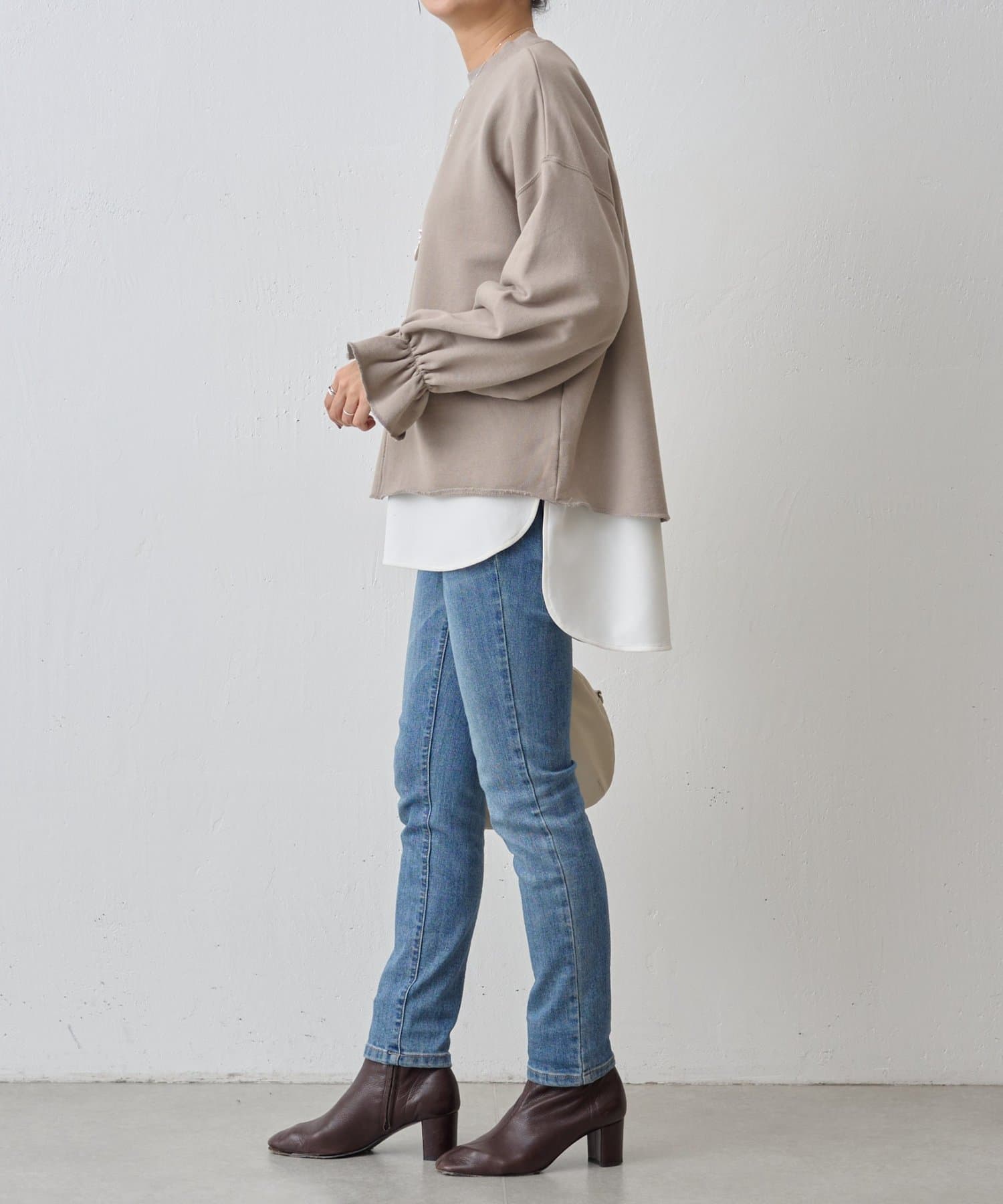 袖口のフリルと、裾・袖口をロックミシンで仕上げたラフさが絶妙なバランスで、甘さを控えた大人のスウェットスタイルが楽しめます。