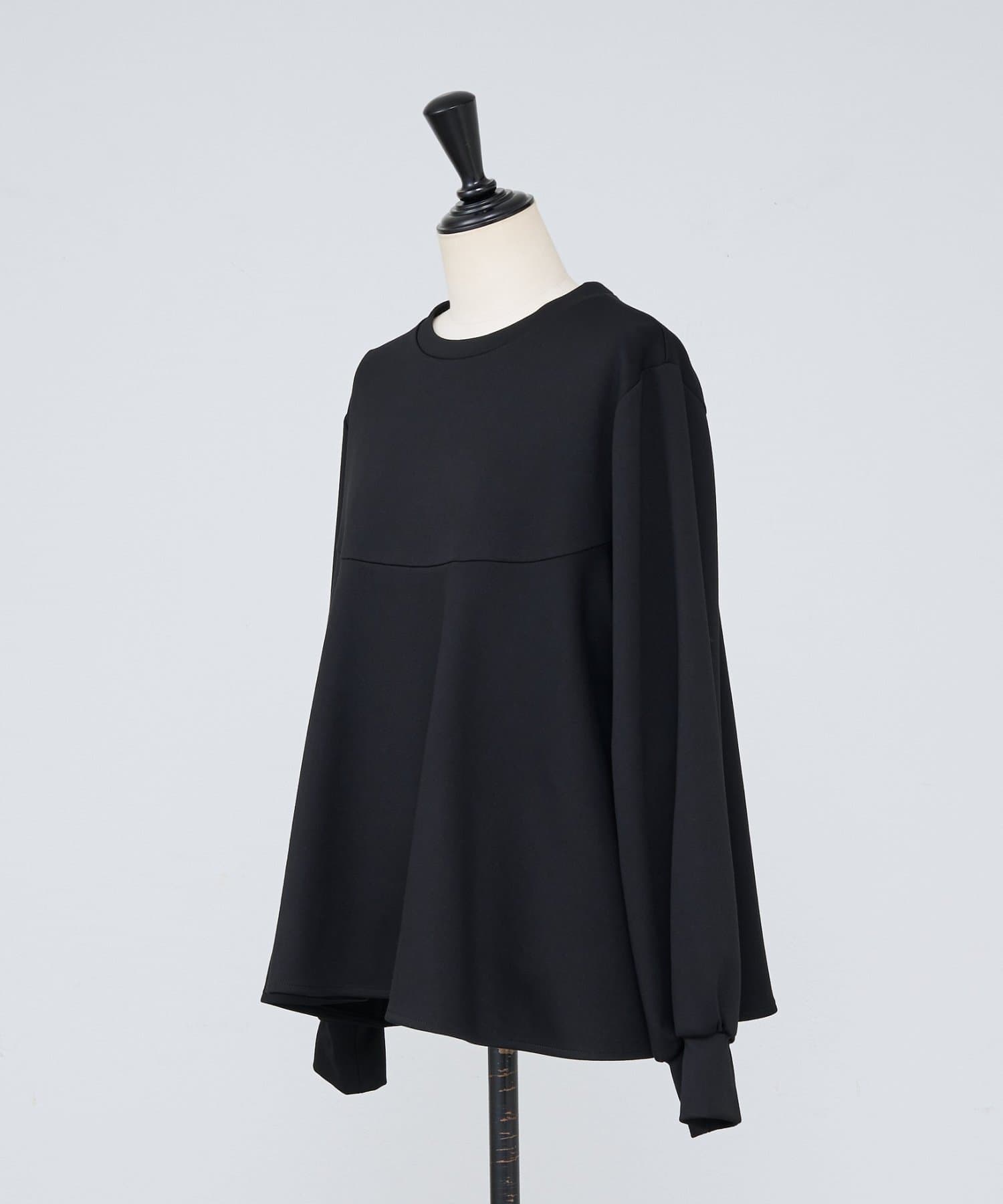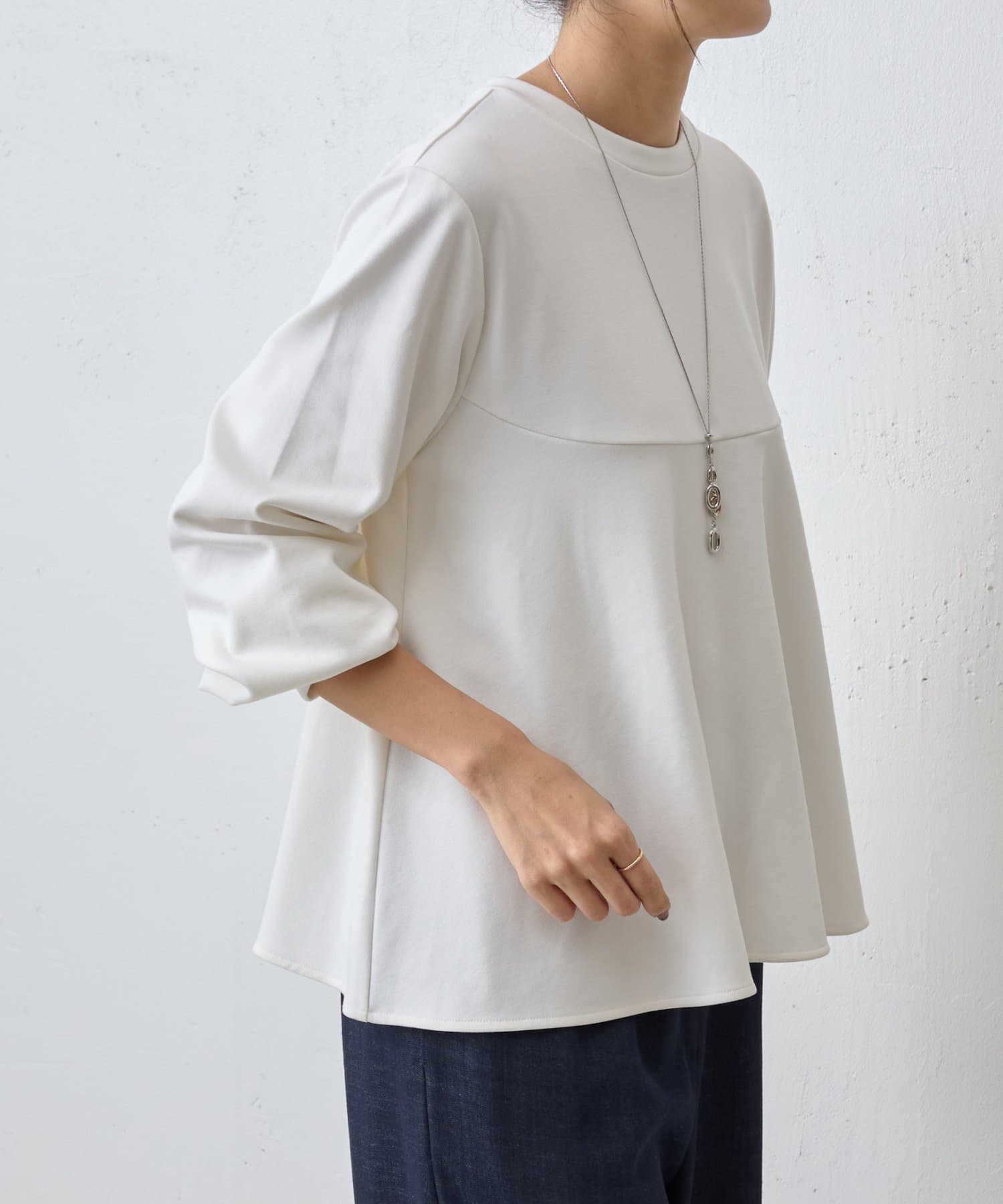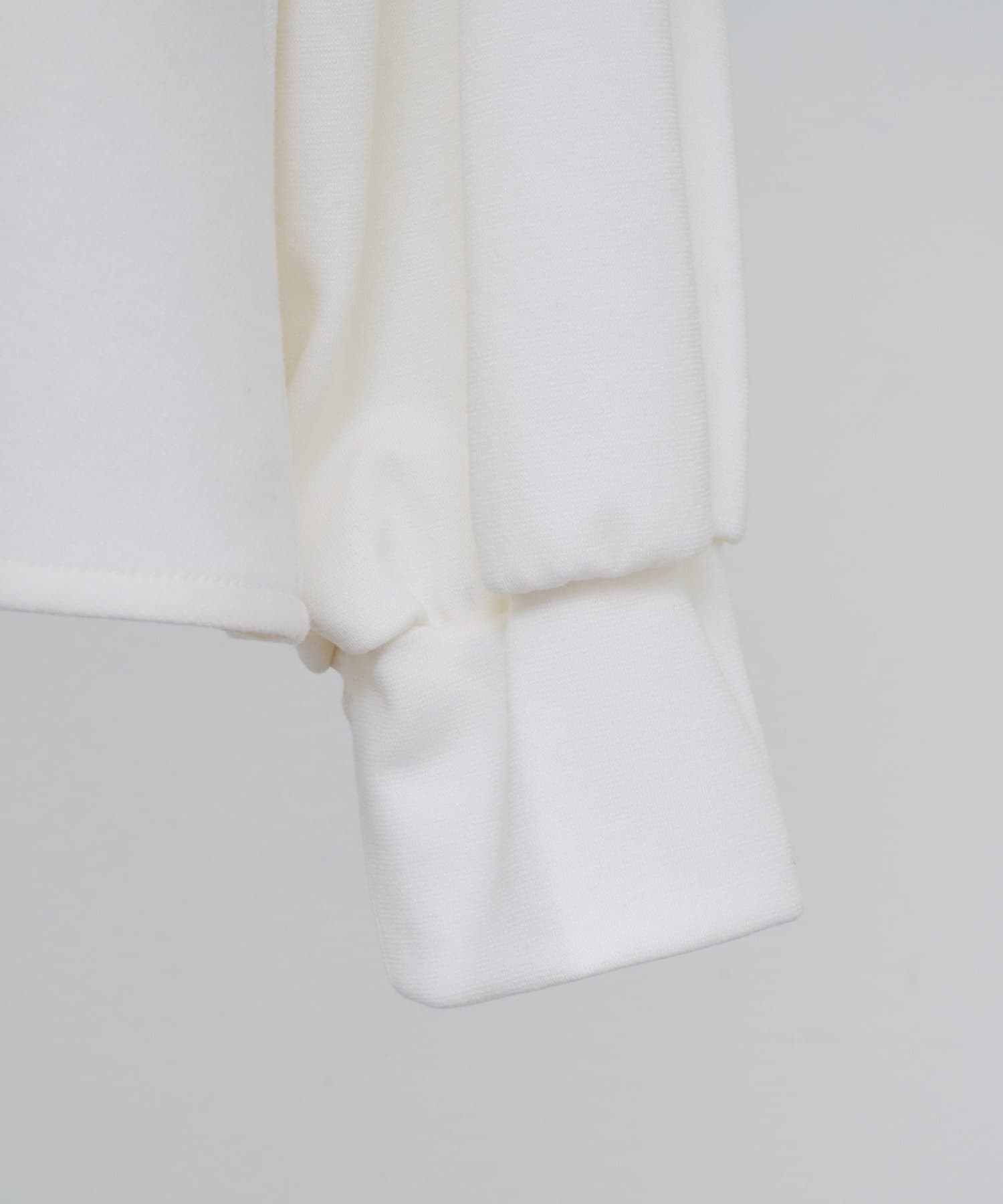 袖口も同じカットソー素材で仕立て、ギャザーを寄せることでやわらかなパフスリーブに。