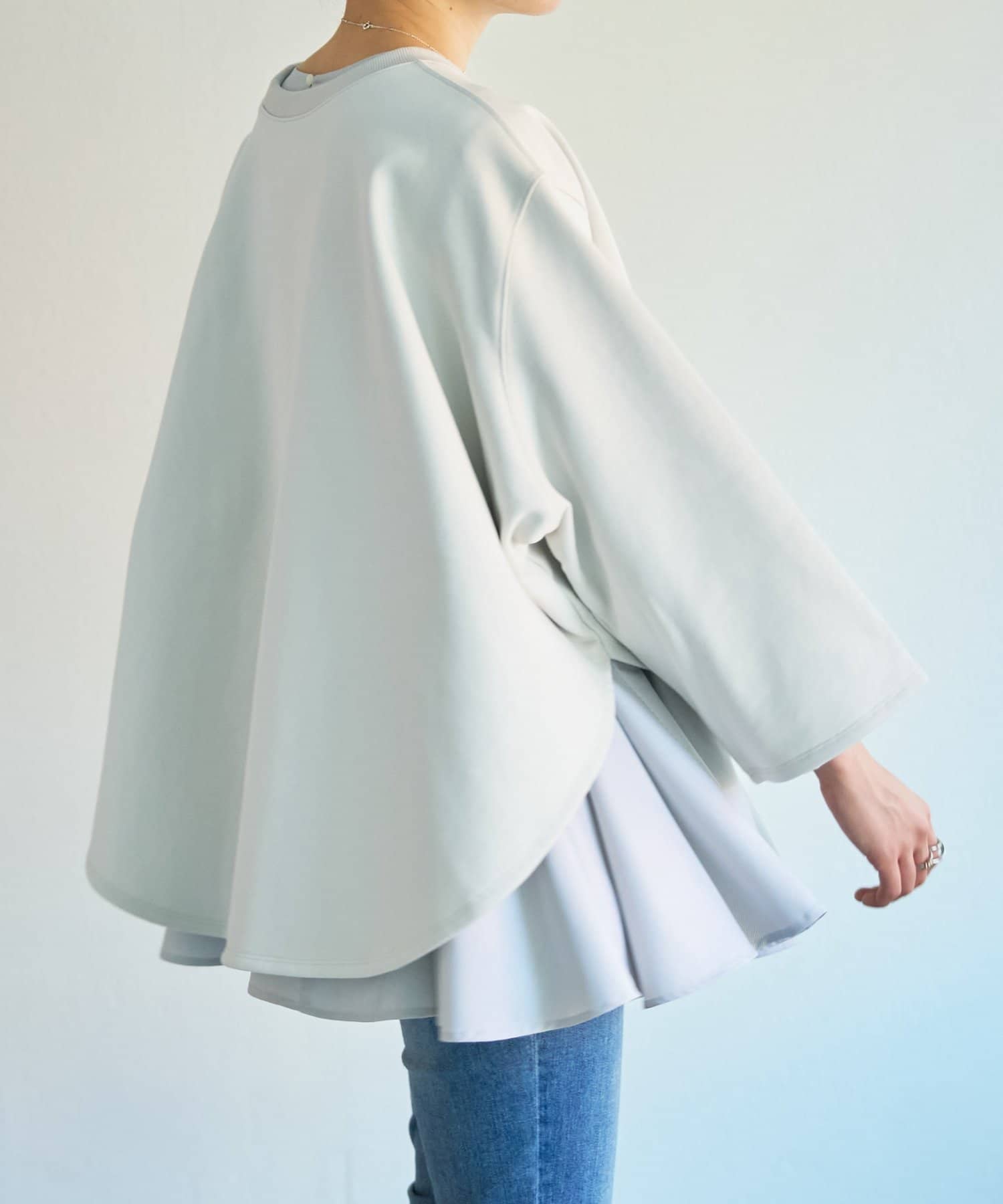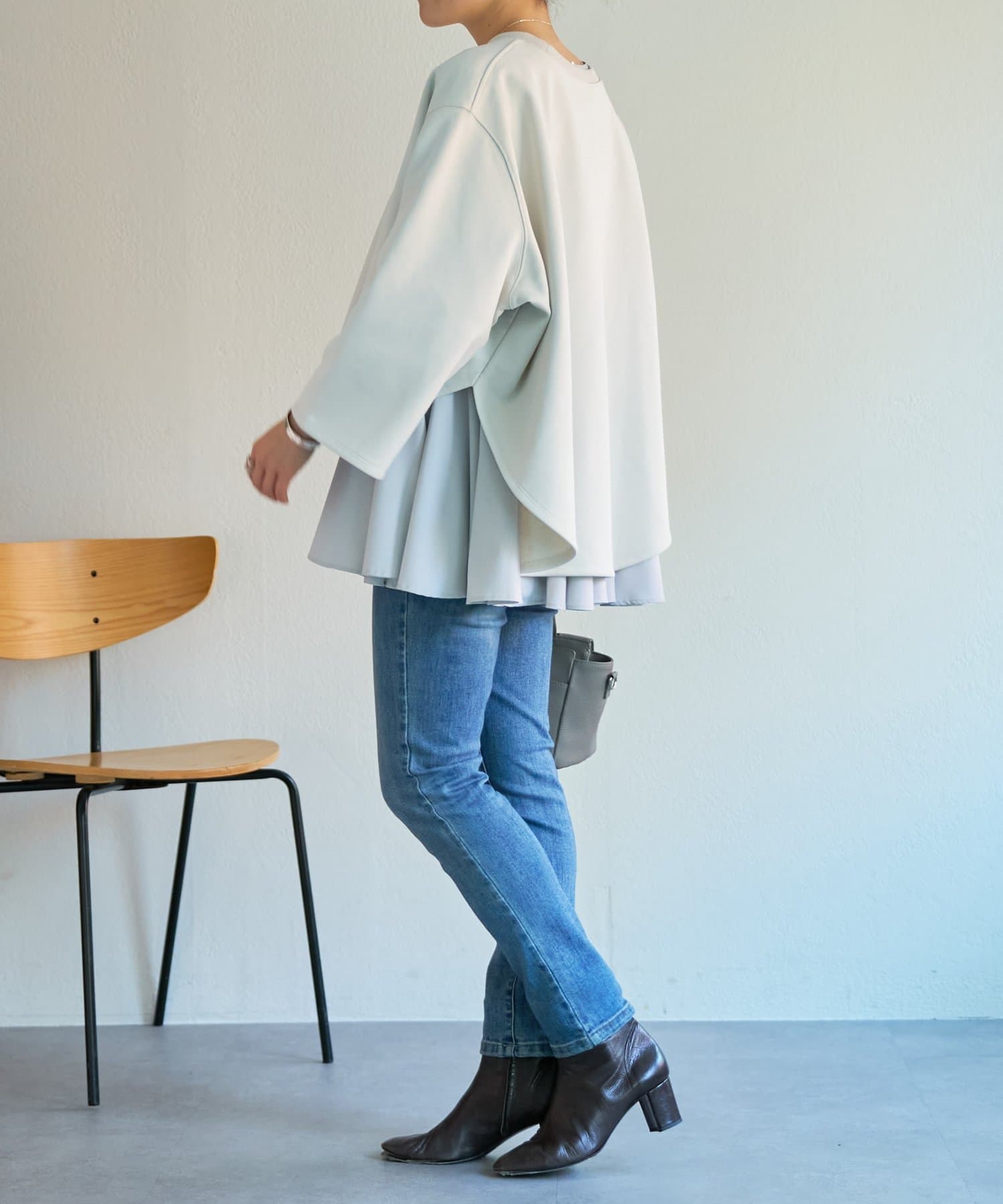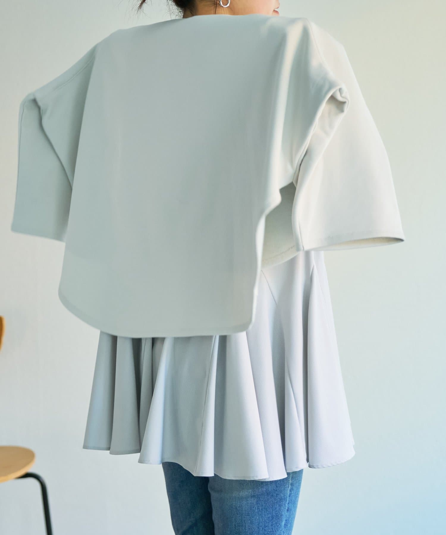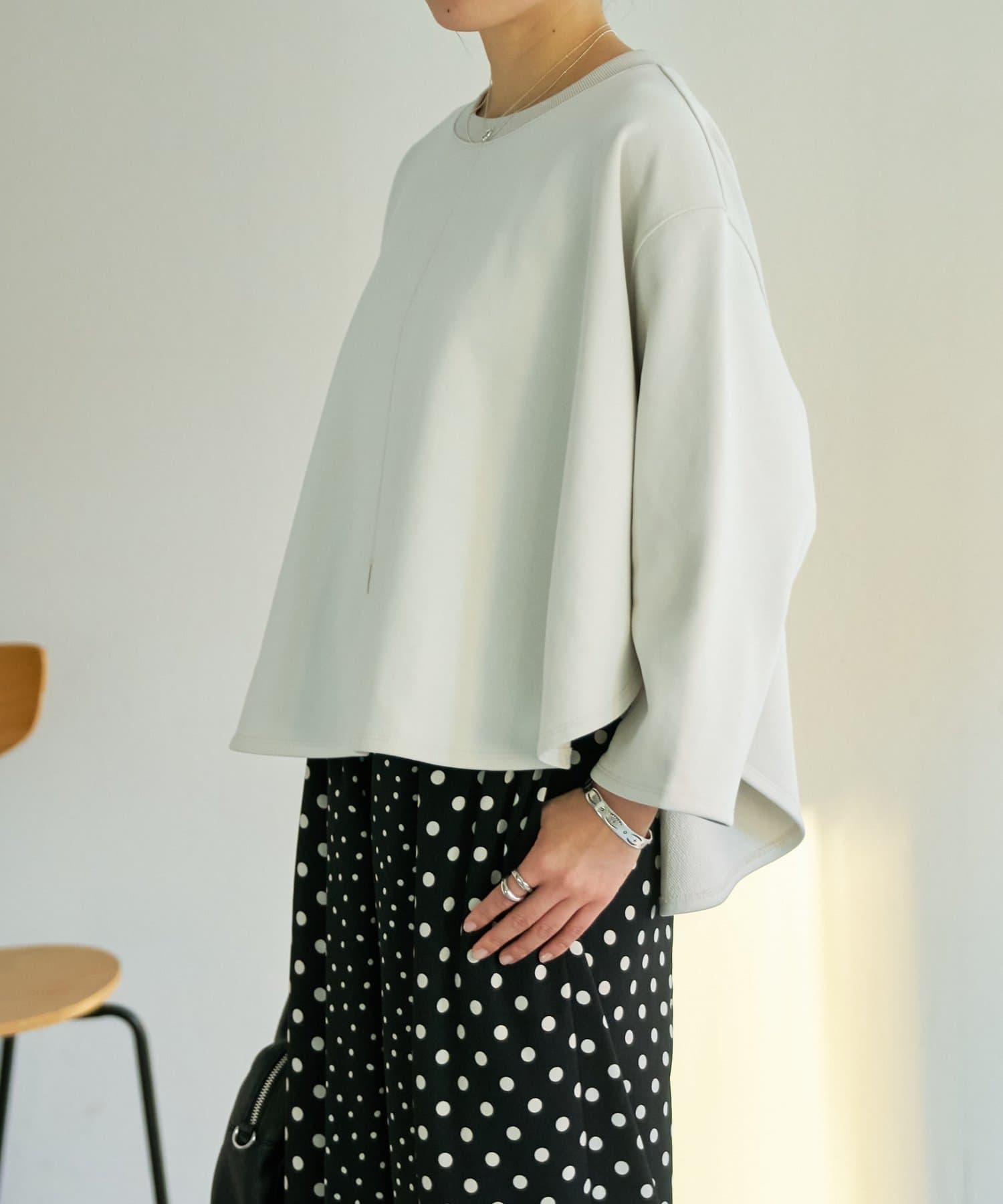 身頃はゆったりとしたシルエットながら、着丈はコンパクトに設定されているため、