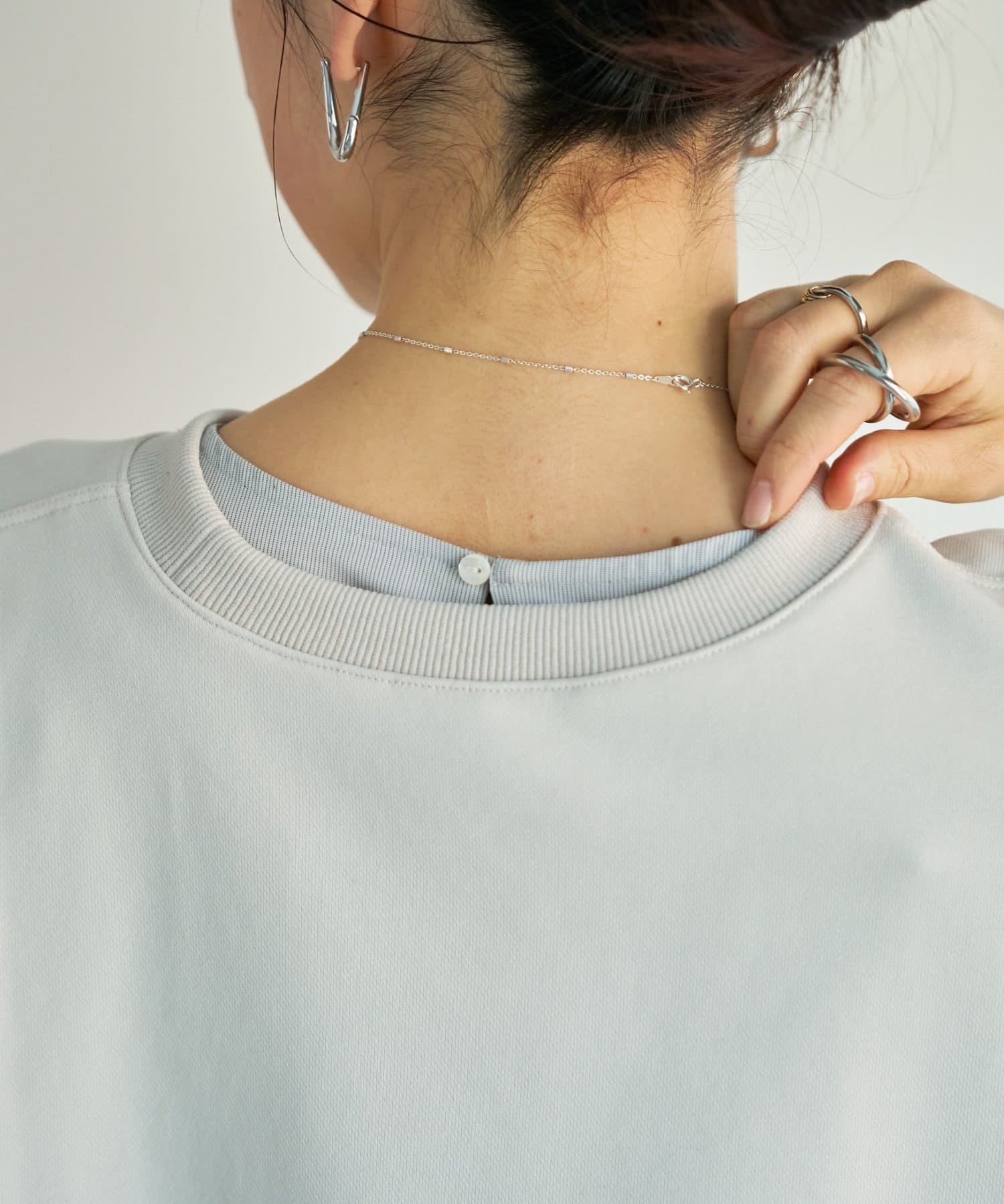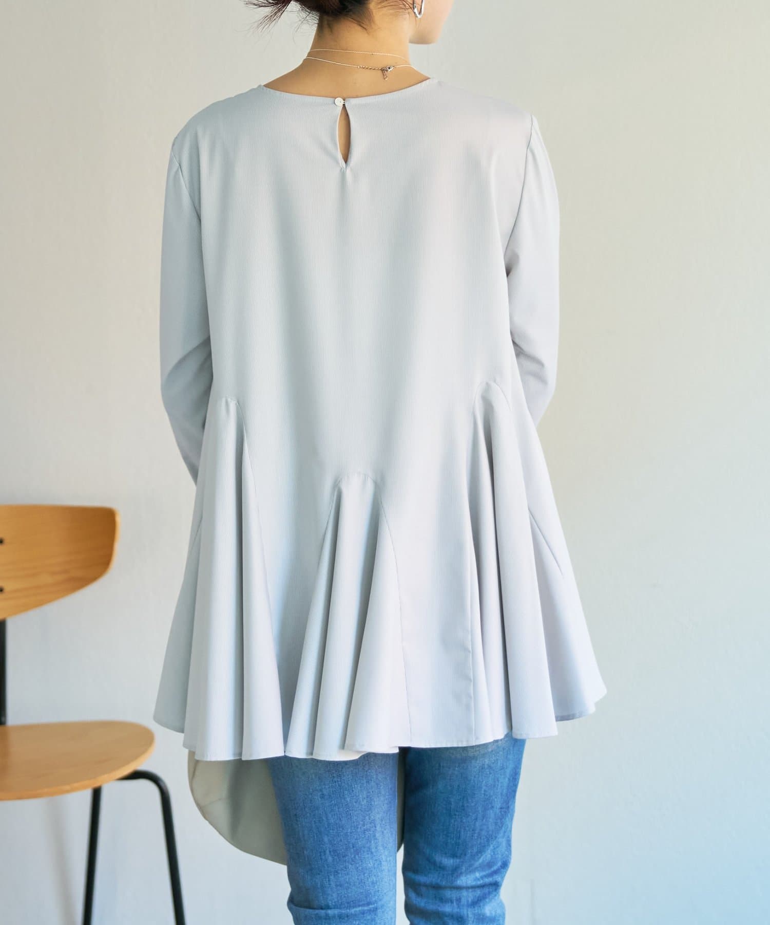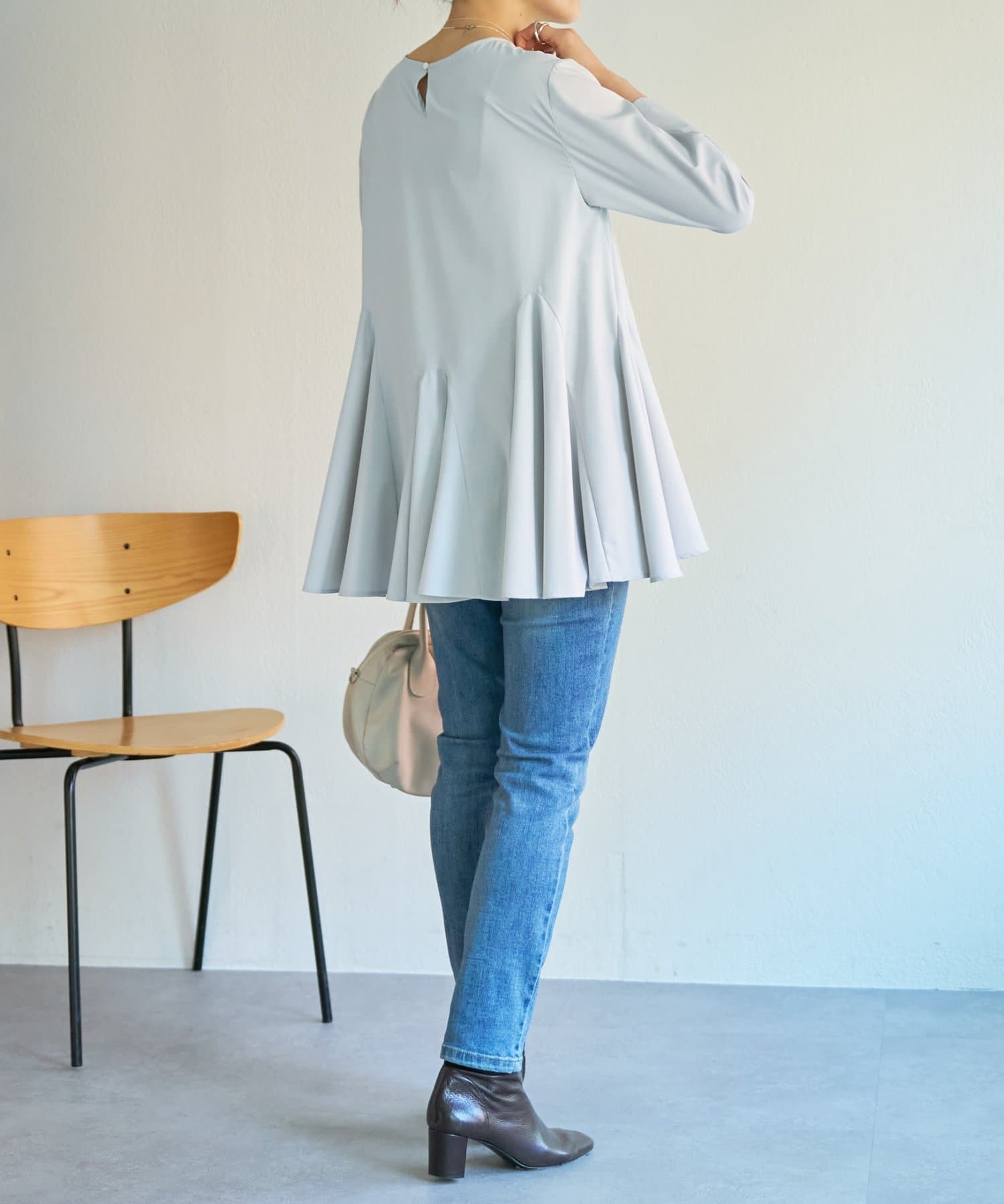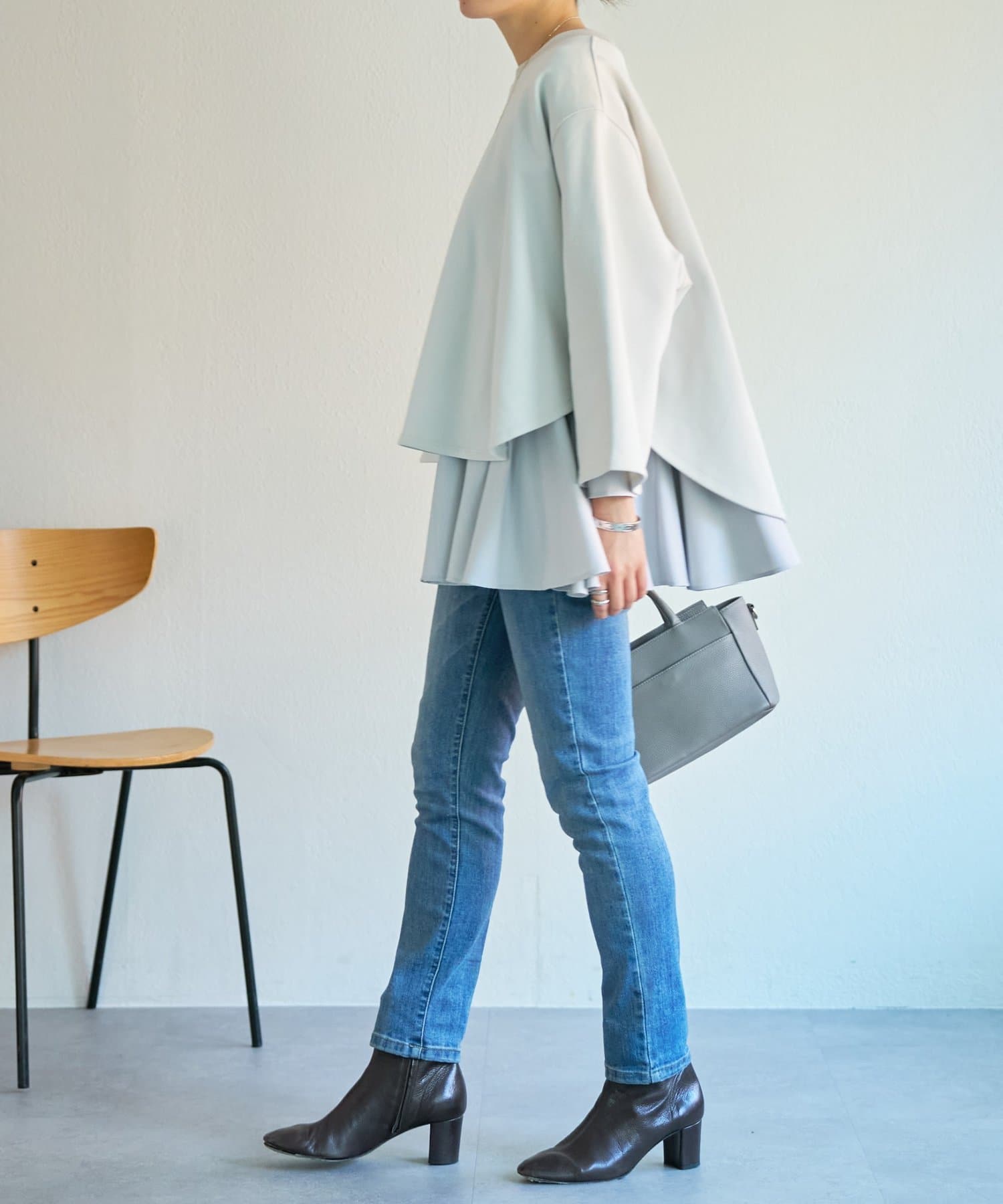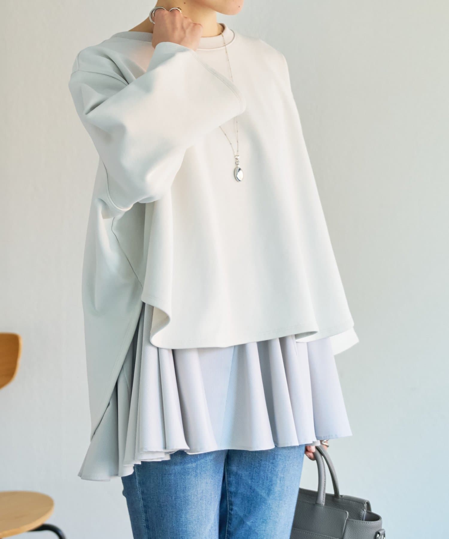 身頃はゆったりとしたシルエットながら、着丈はコンパクトに設定されているため、