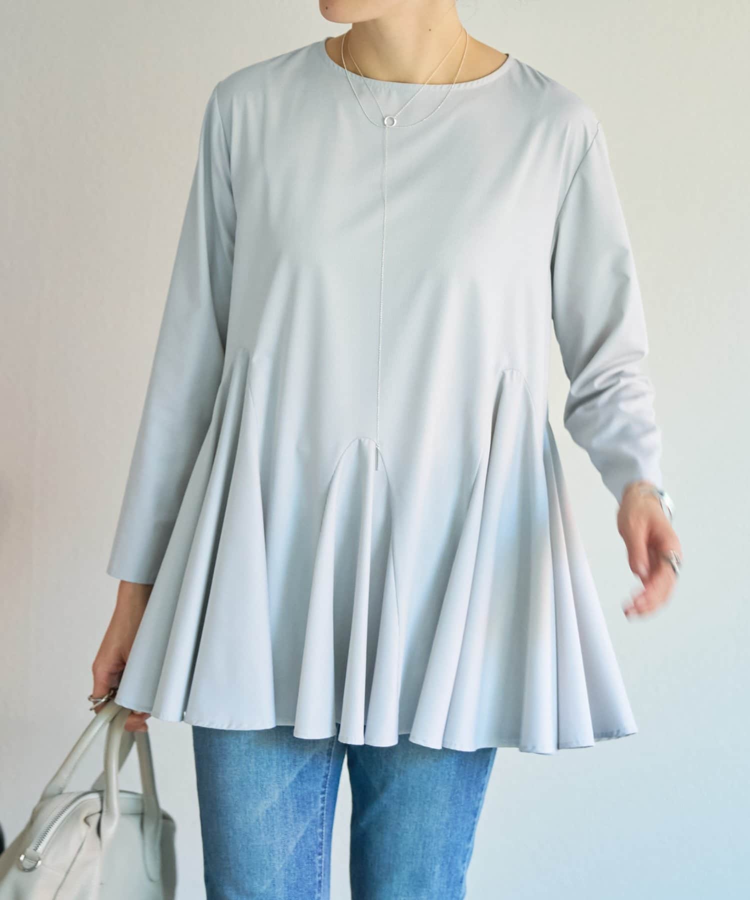 裾から覗く長袖ブラウスは、色ごとに異なる素材を使用し、