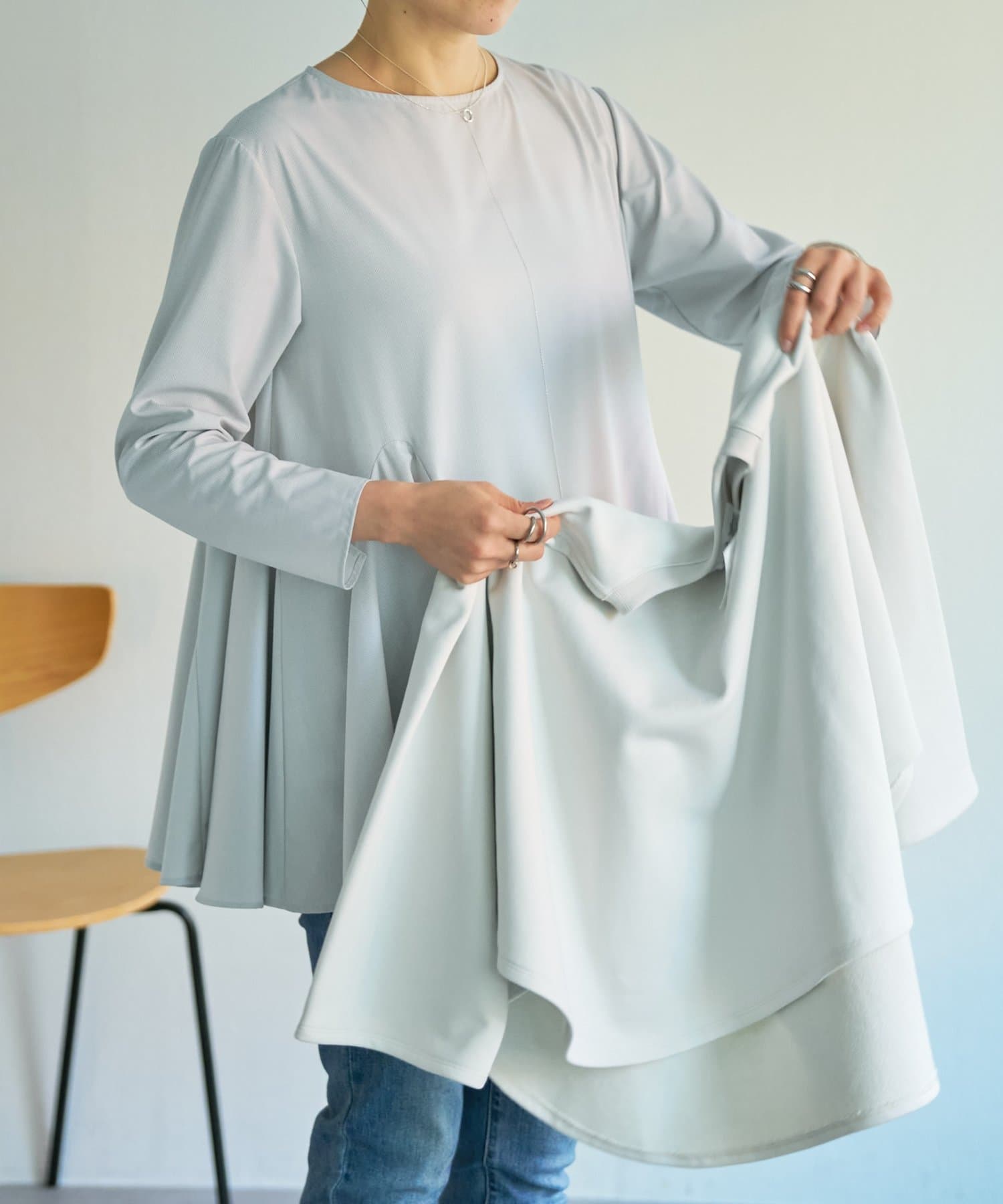歩くたびにふわりと揺れる裾が、シンプルなトレーナースタイルに華やかさをプラス。