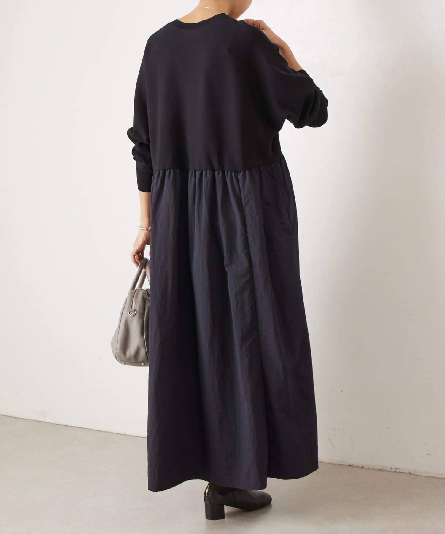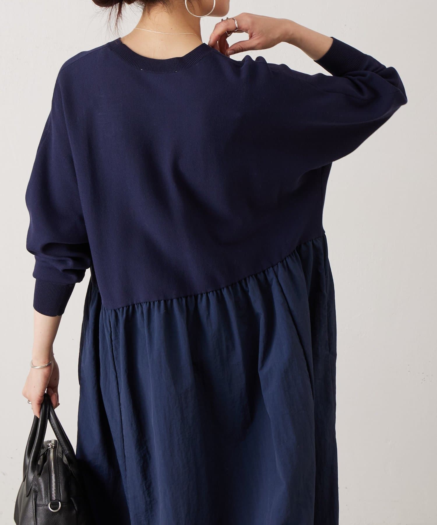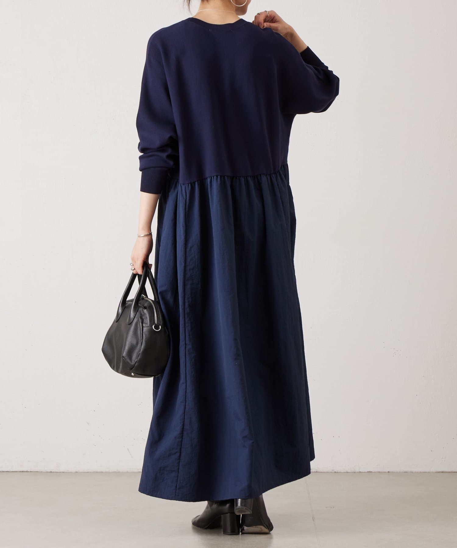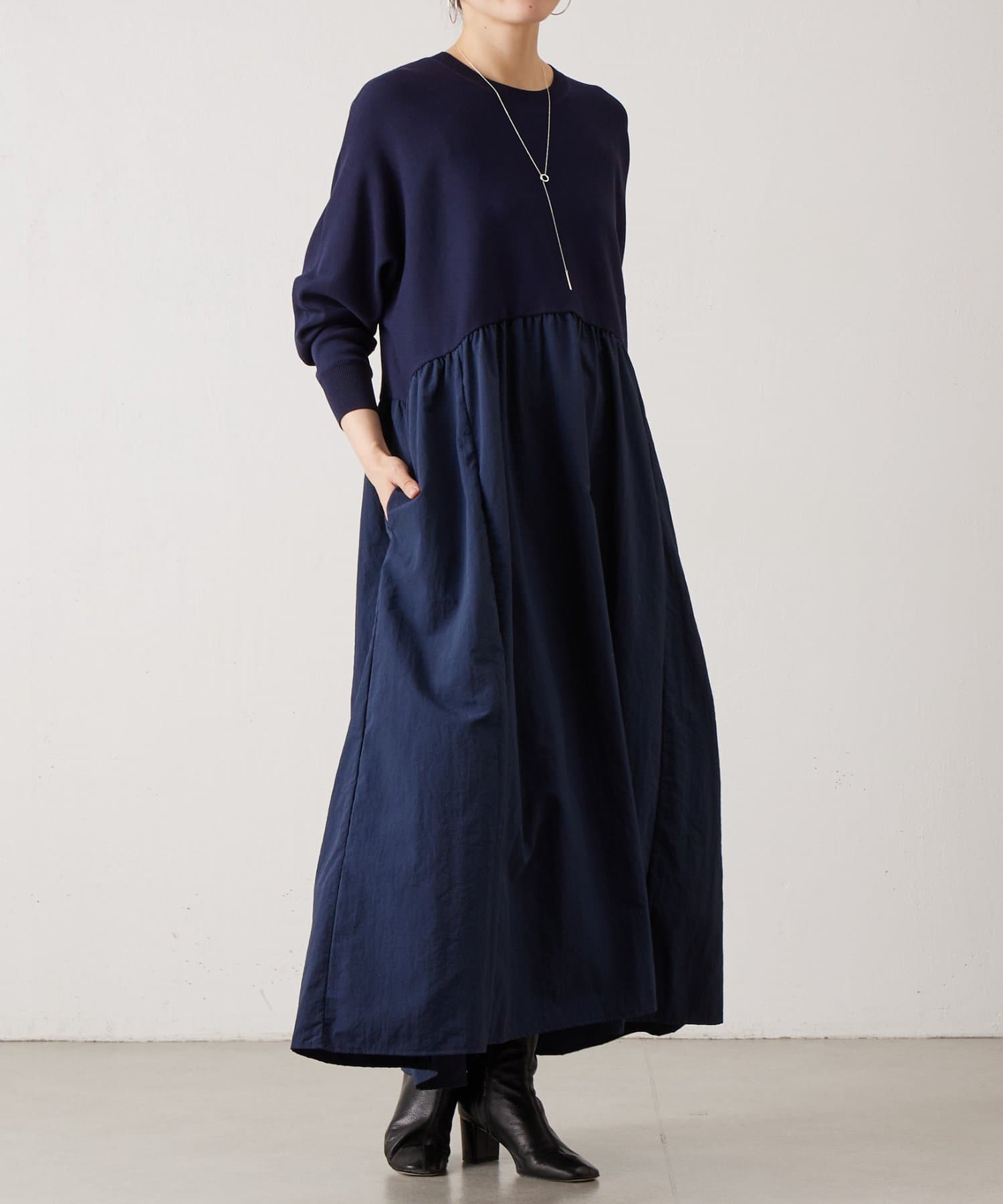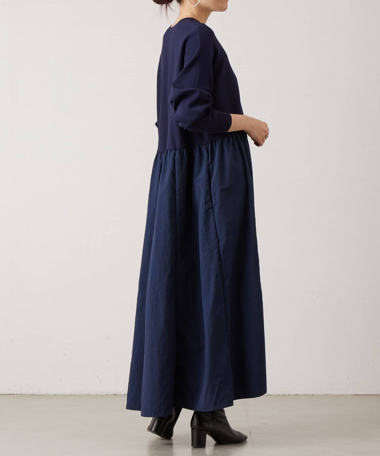 ニット×ナイロンスカートの異素材コンビワンピース。