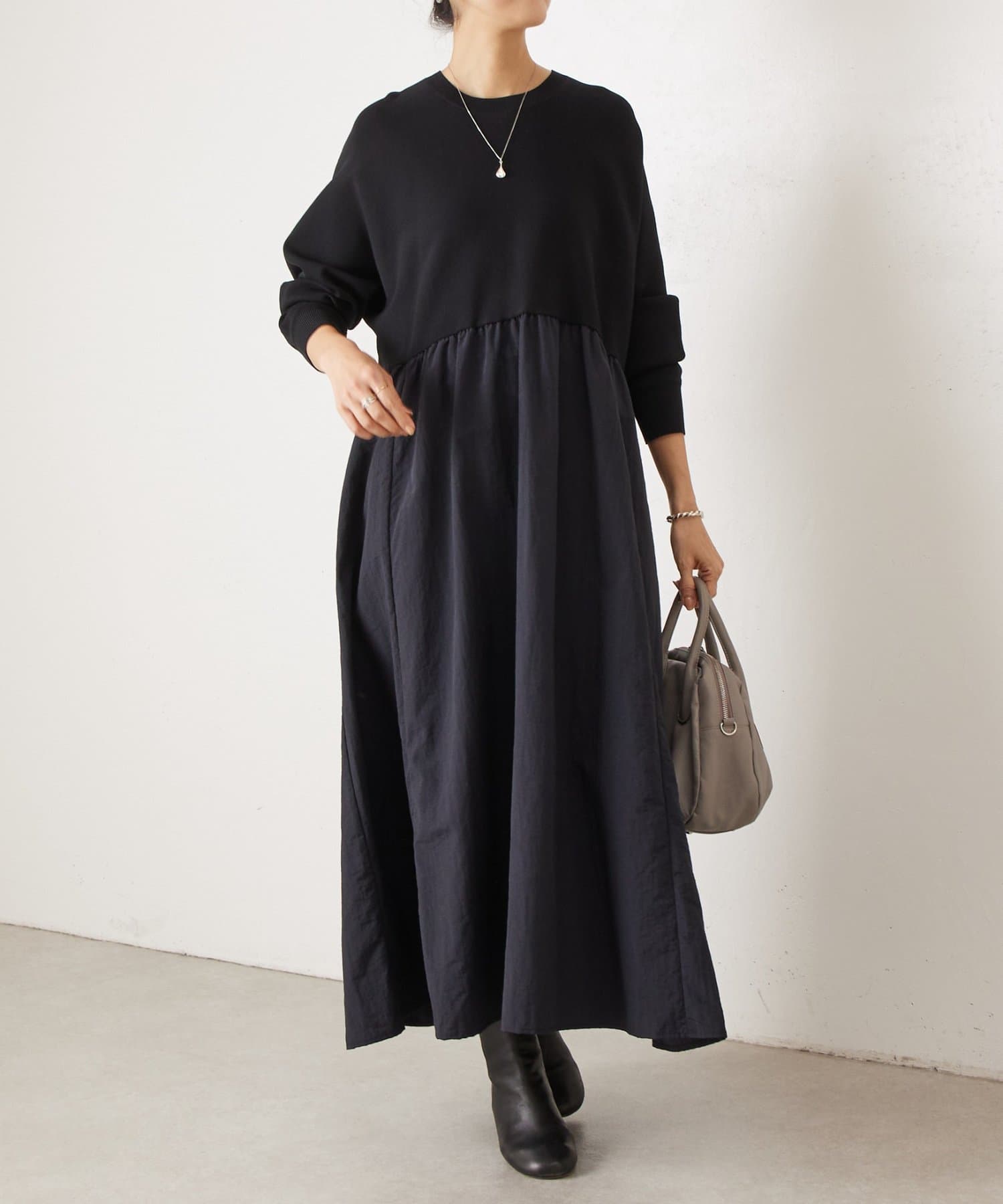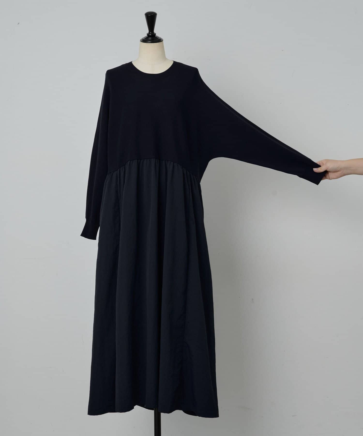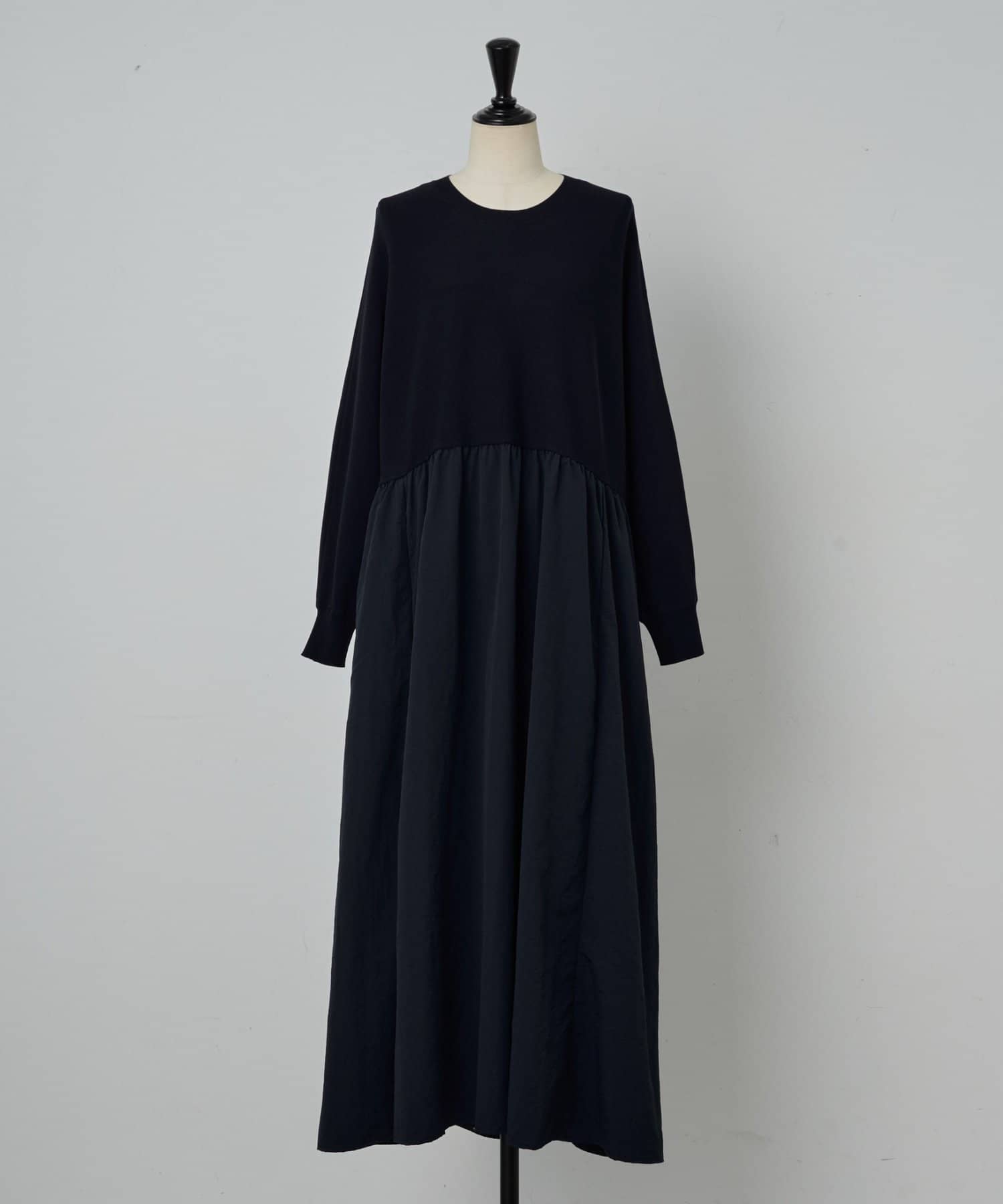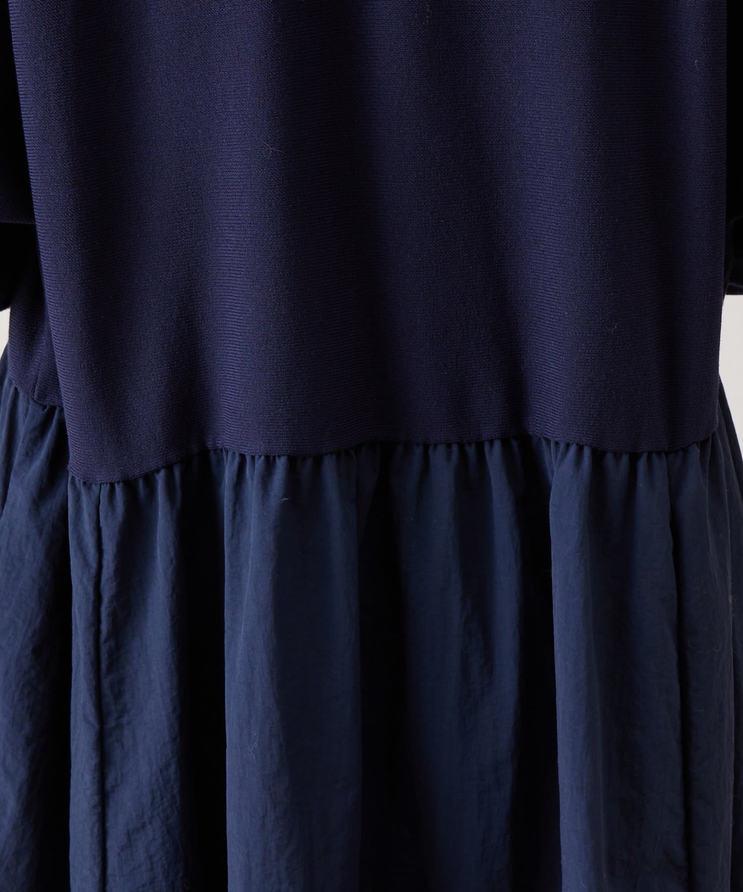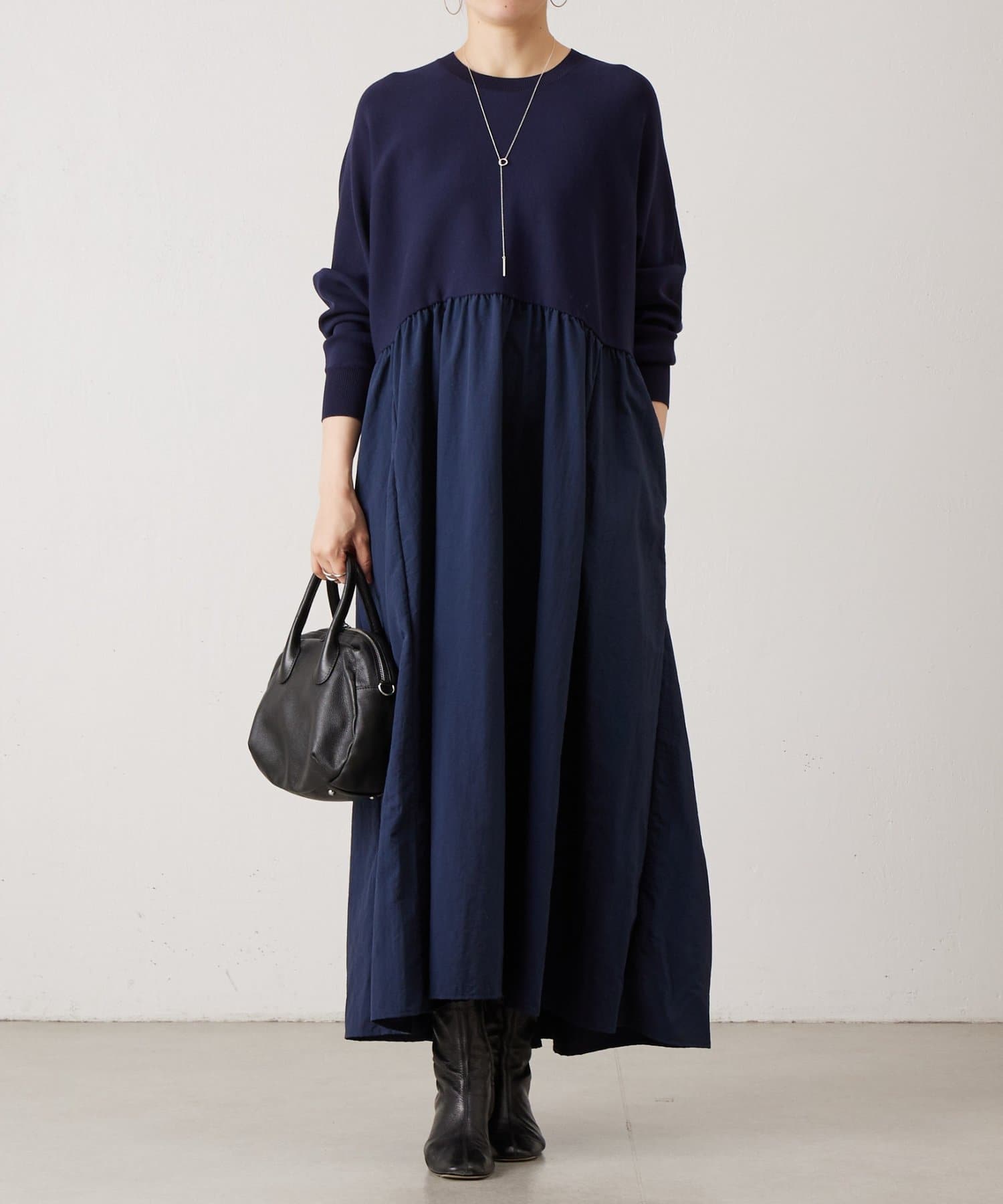ニット×ナイロンスカートの異素材コンビワンピース。
