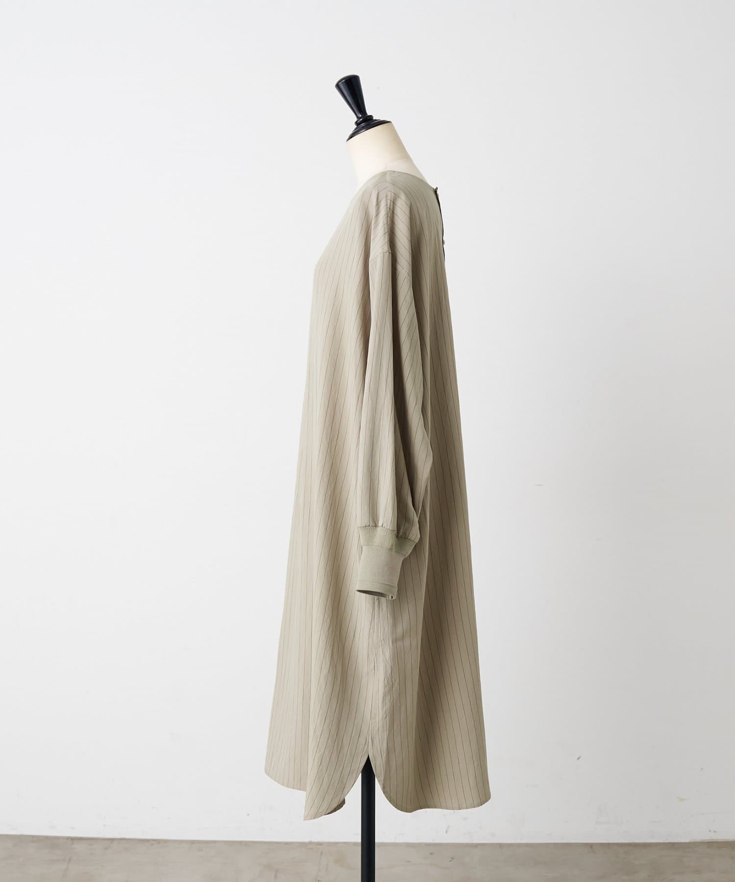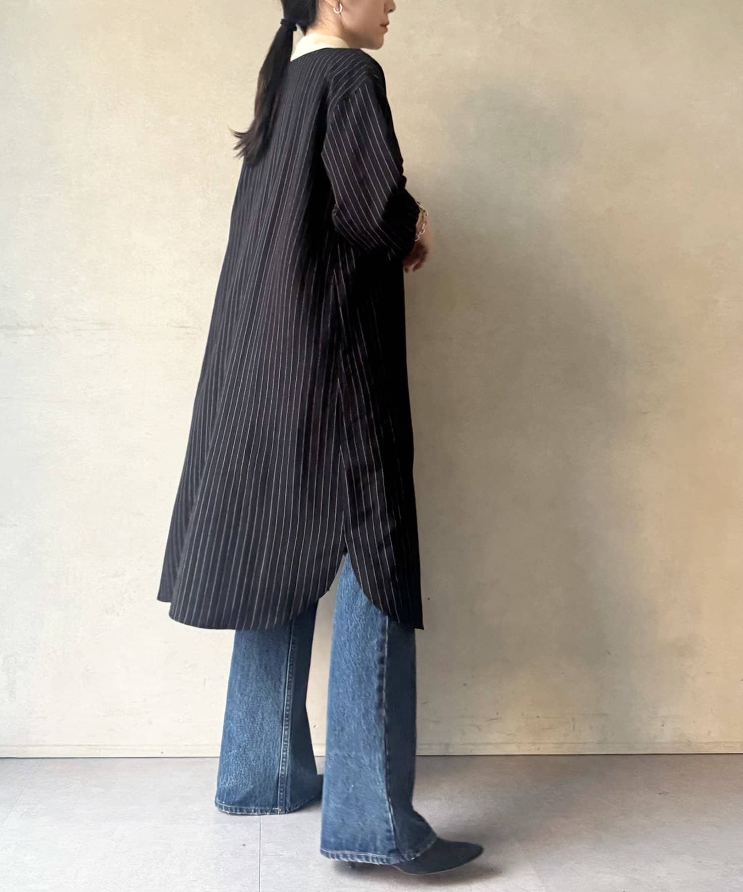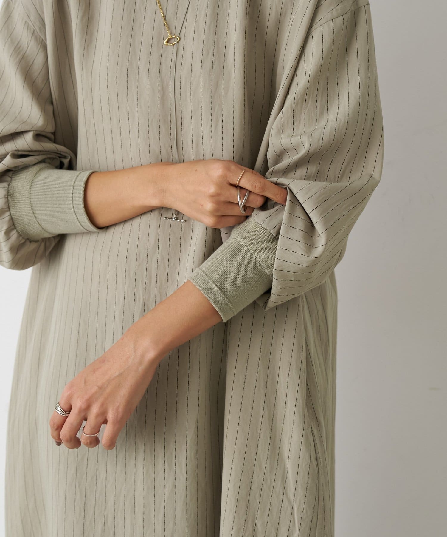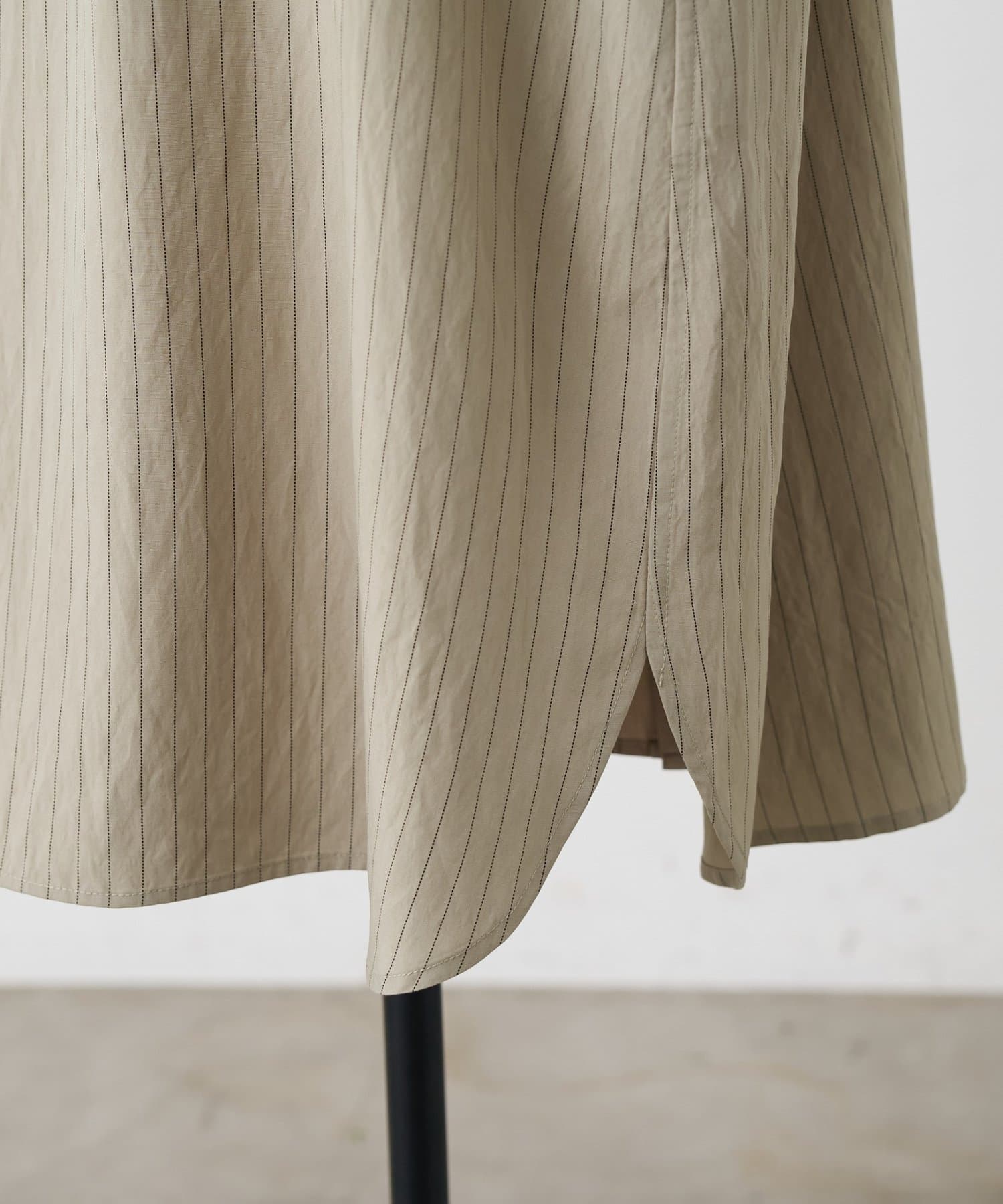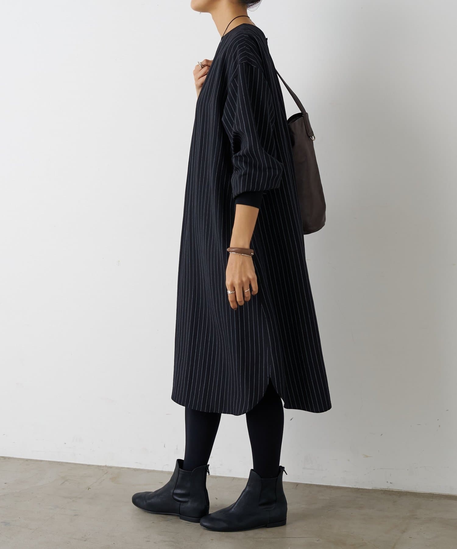 ペンシルストライプ生地を用いた、クリーンな表情のシャツワンピース。