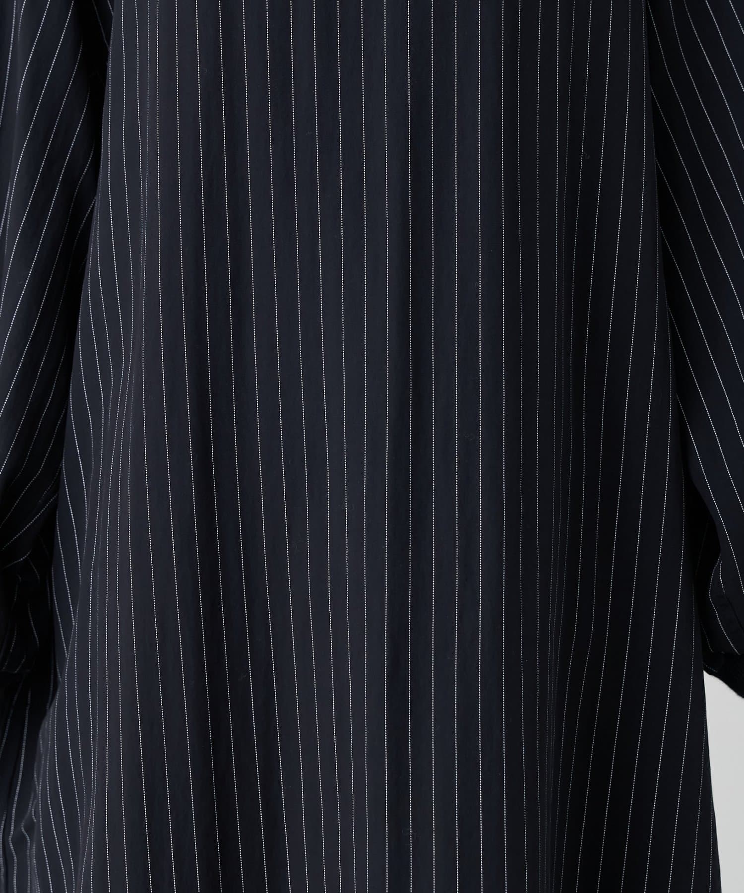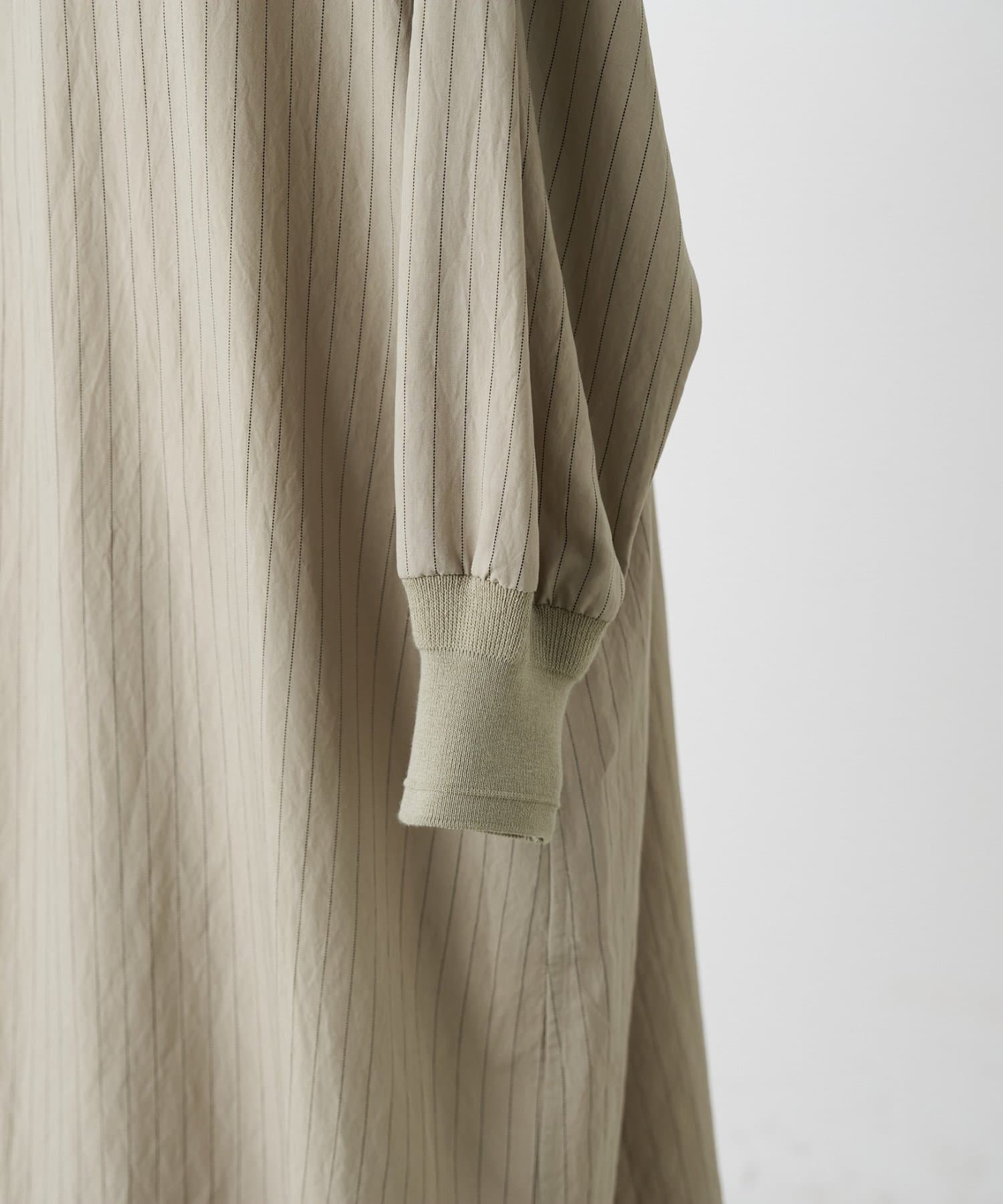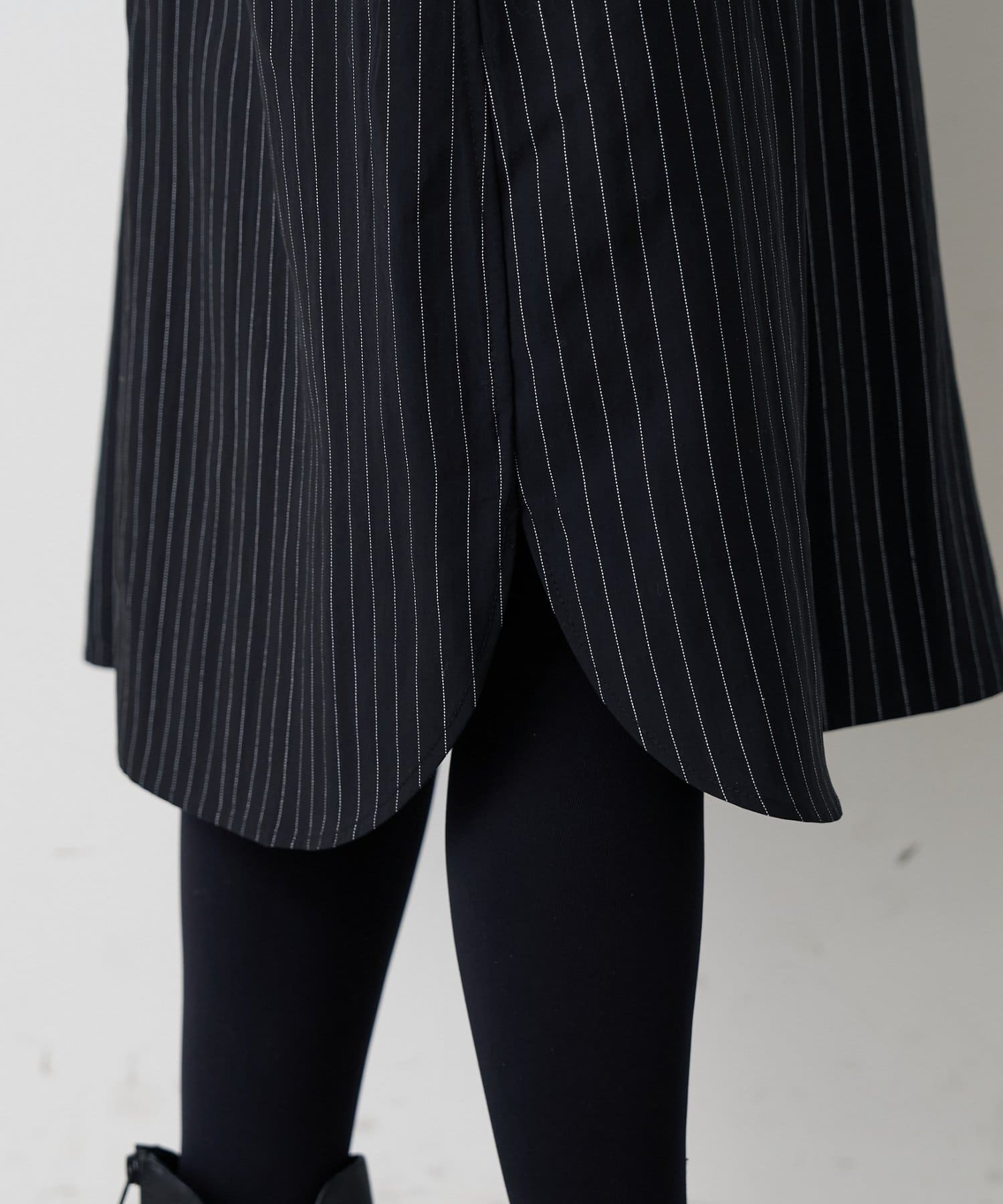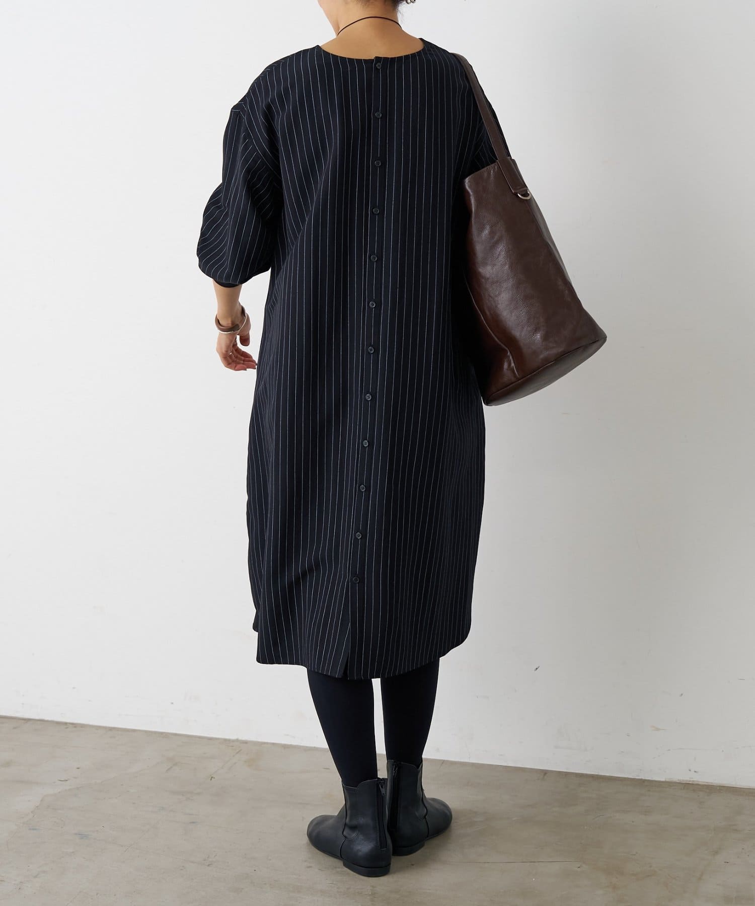 ペンシルストライプ生地を用いた、クリーンな表情のシャツワンピース。
