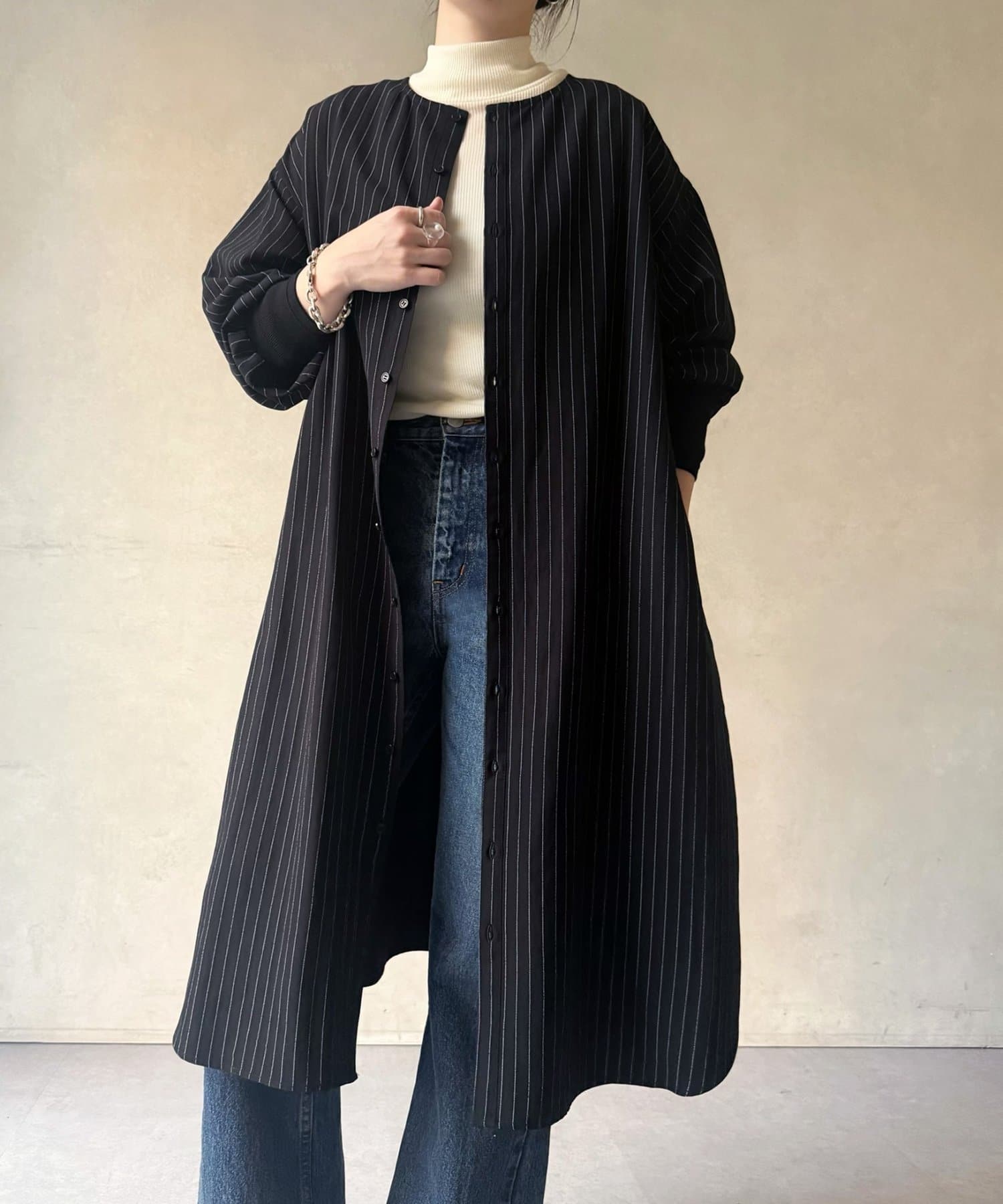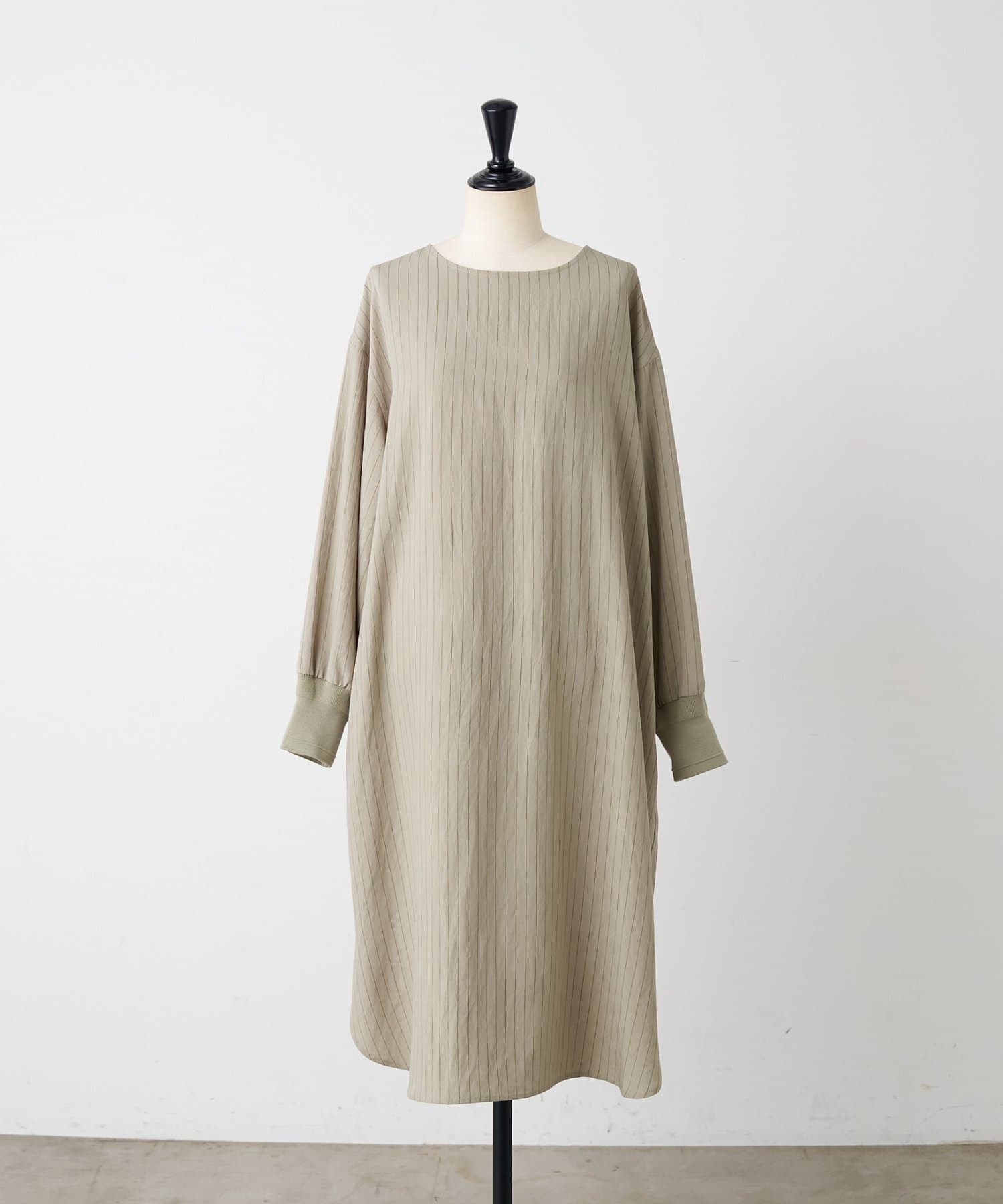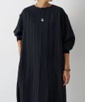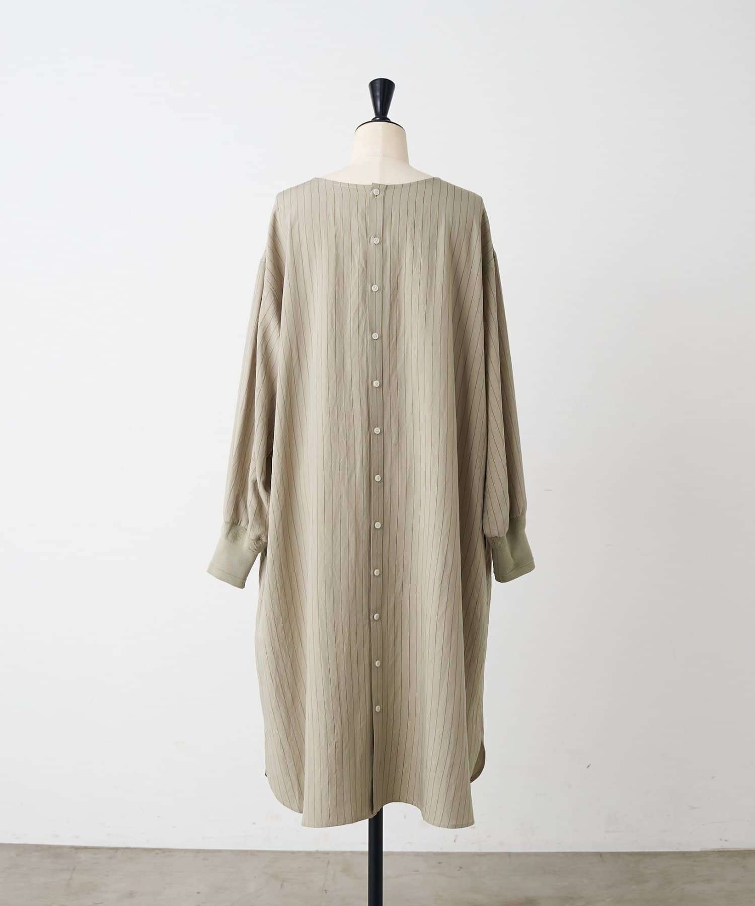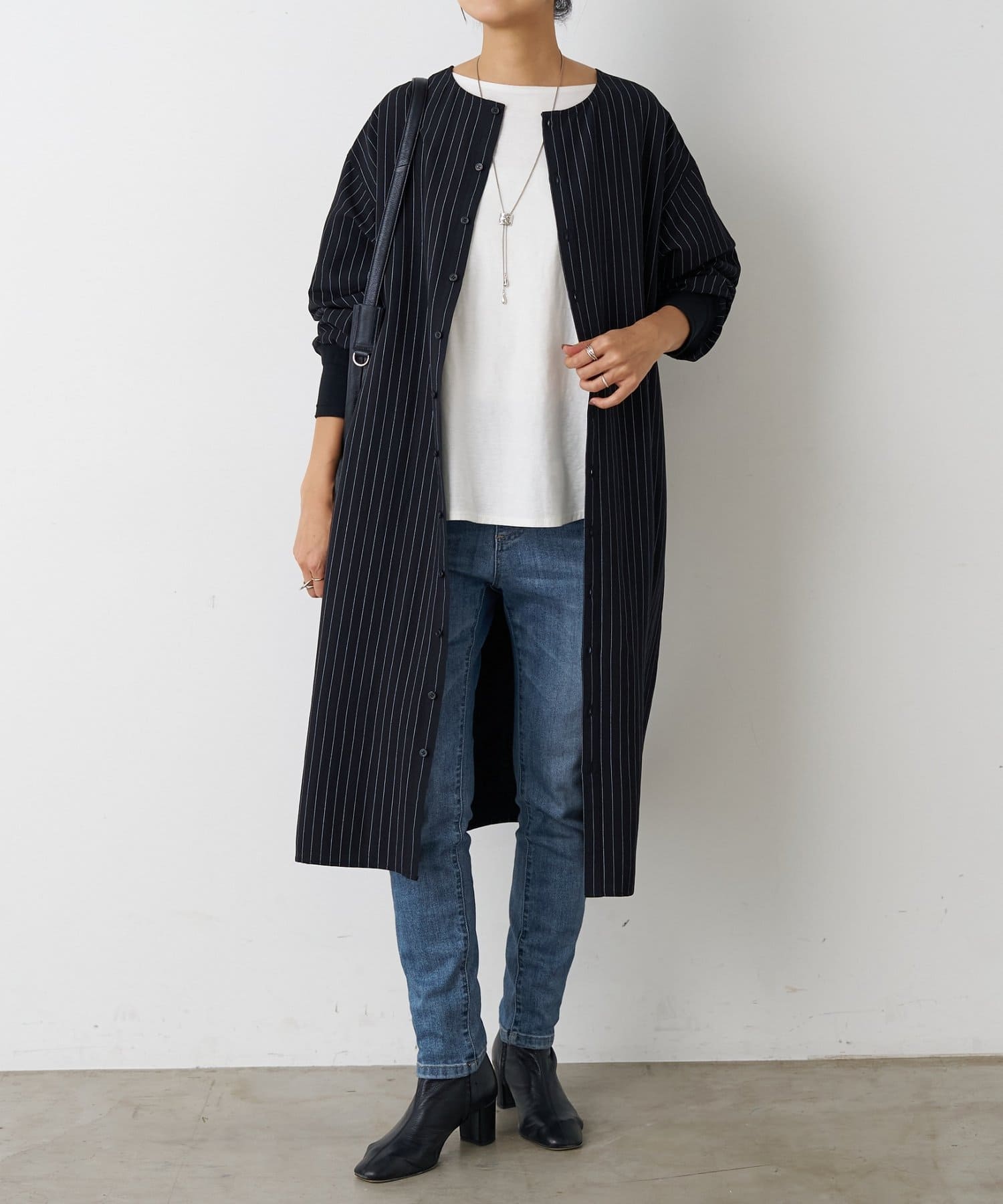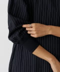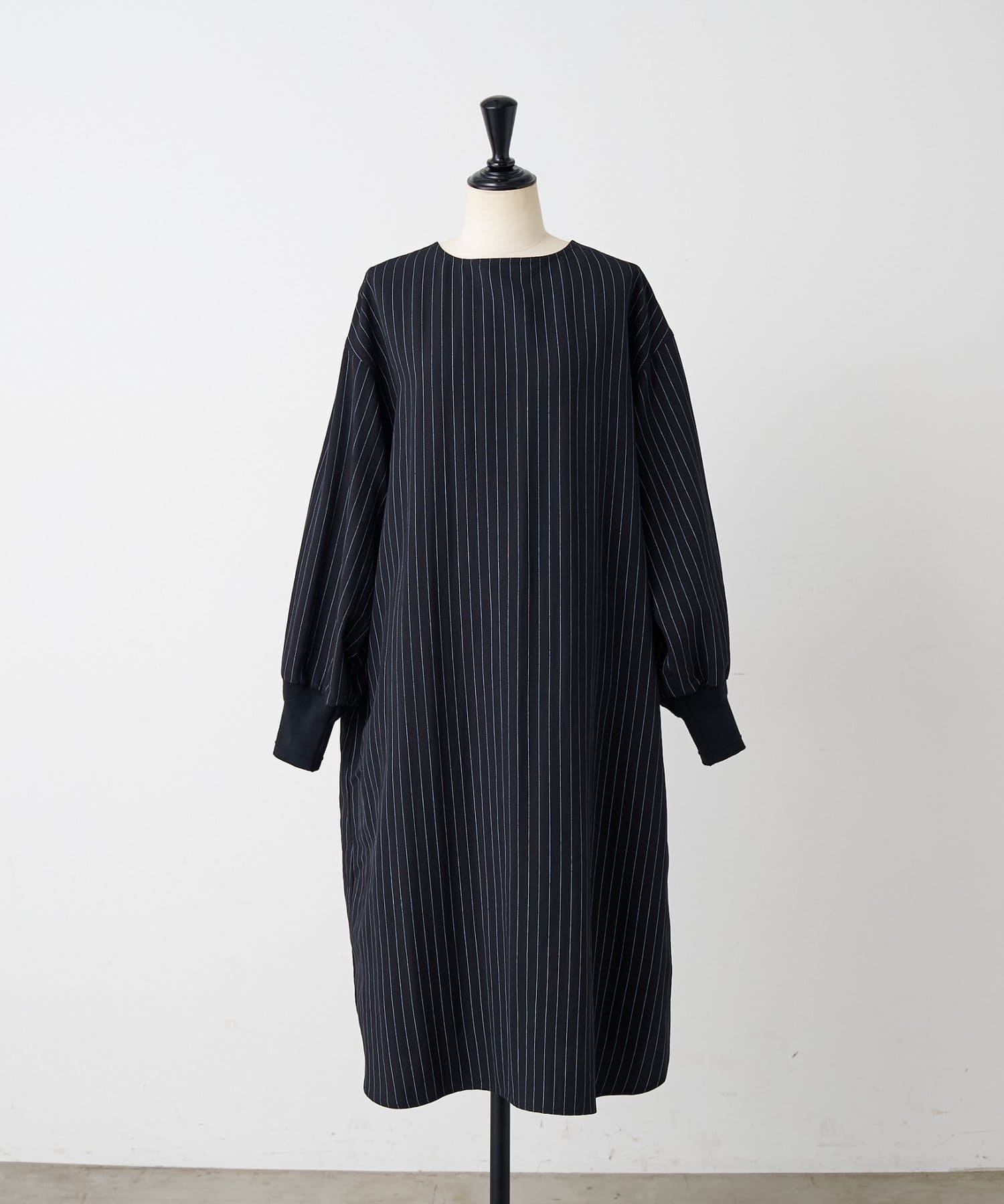 ペンシルストライプ生地を用いた、クリーンな表情のシャツワンピース。
