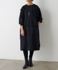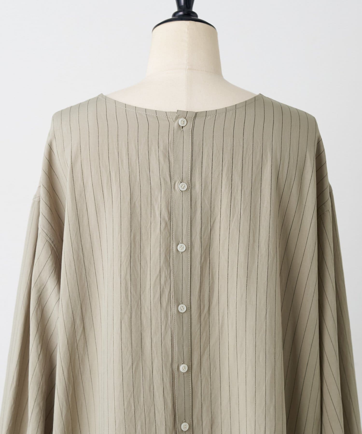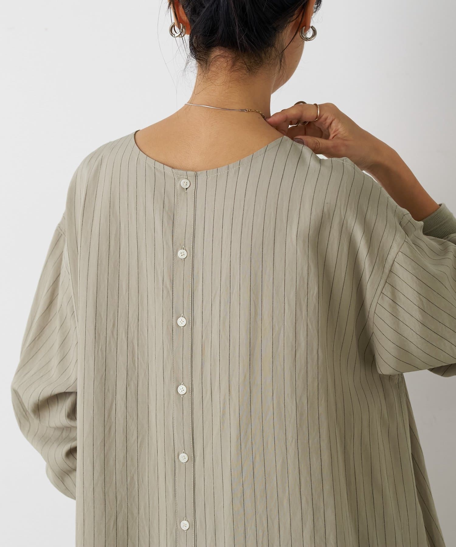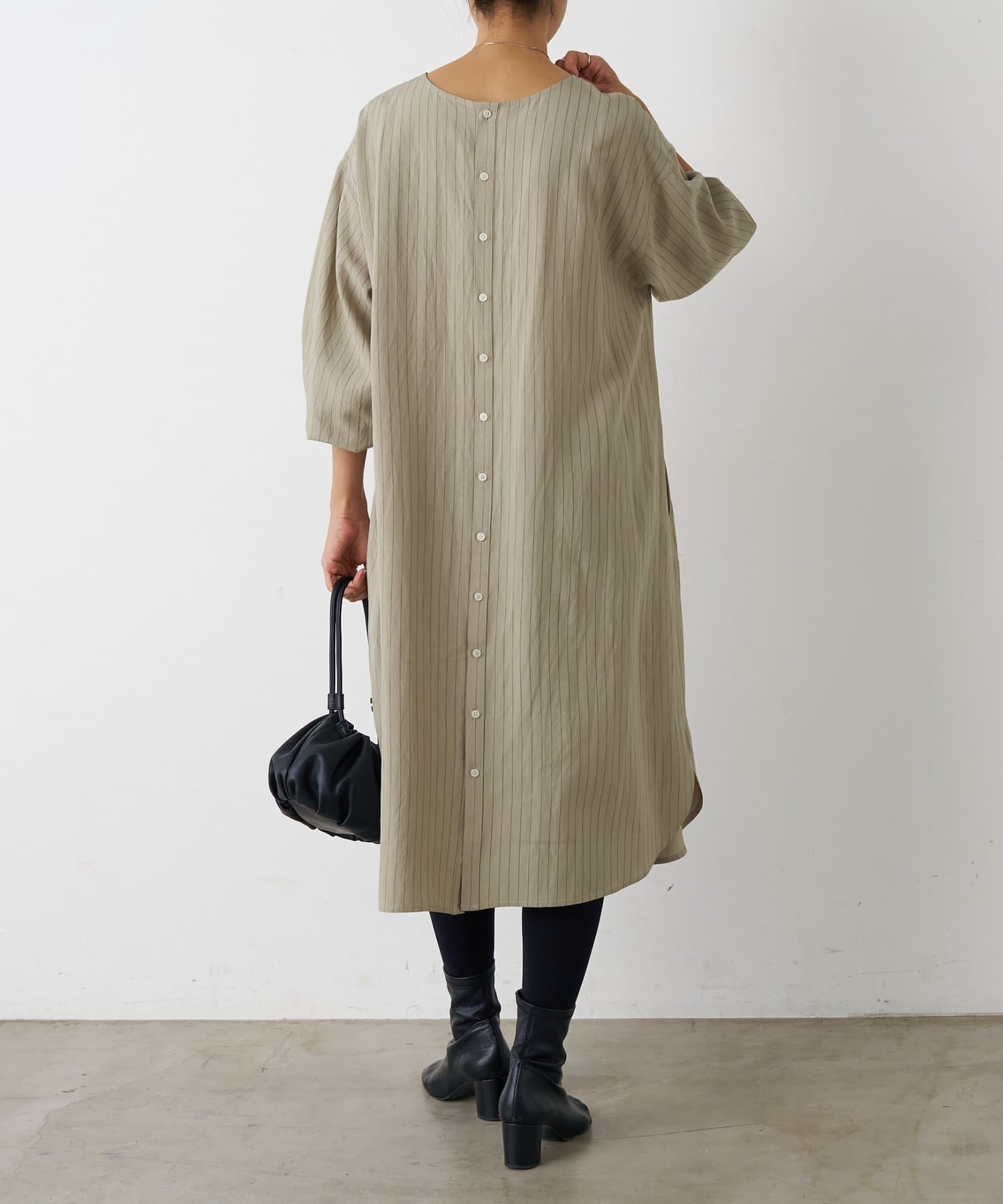後ろボタンのワンピースだけでなく、前を開ければ軽い羽織りとしても活躍し、着こなしの幅がぐっと広がります。