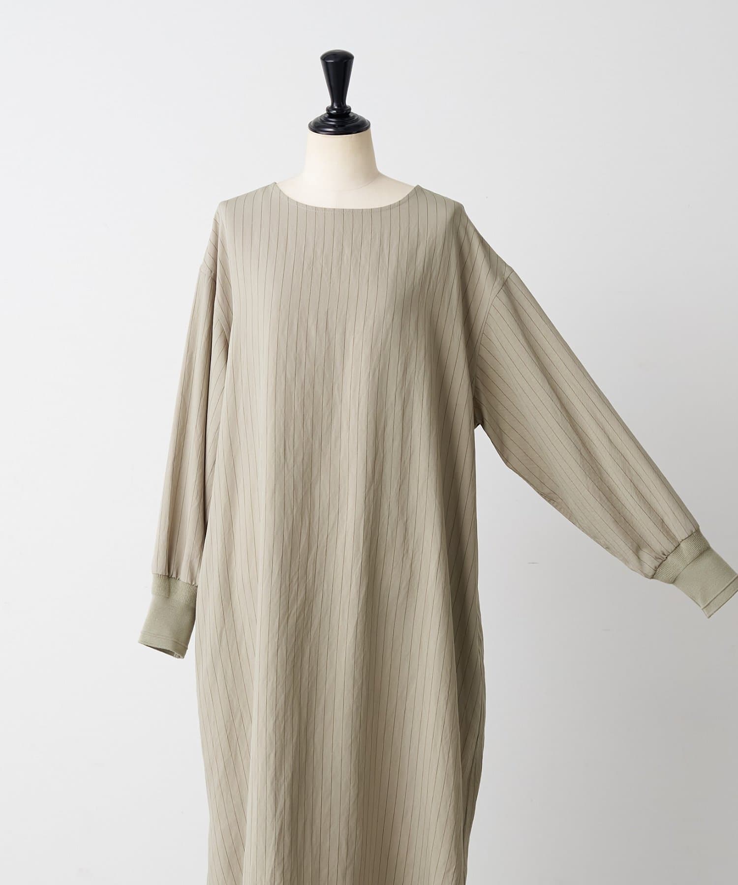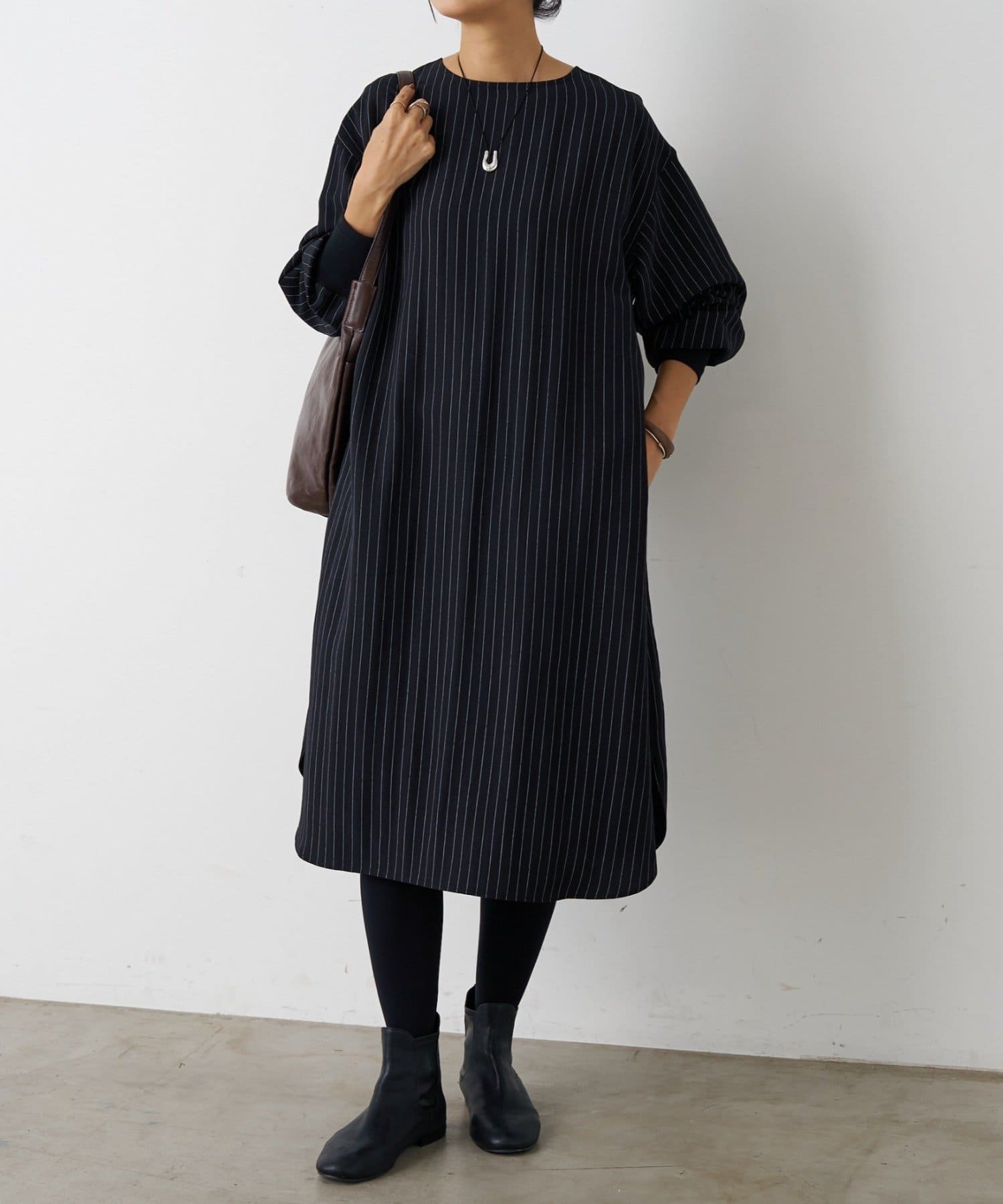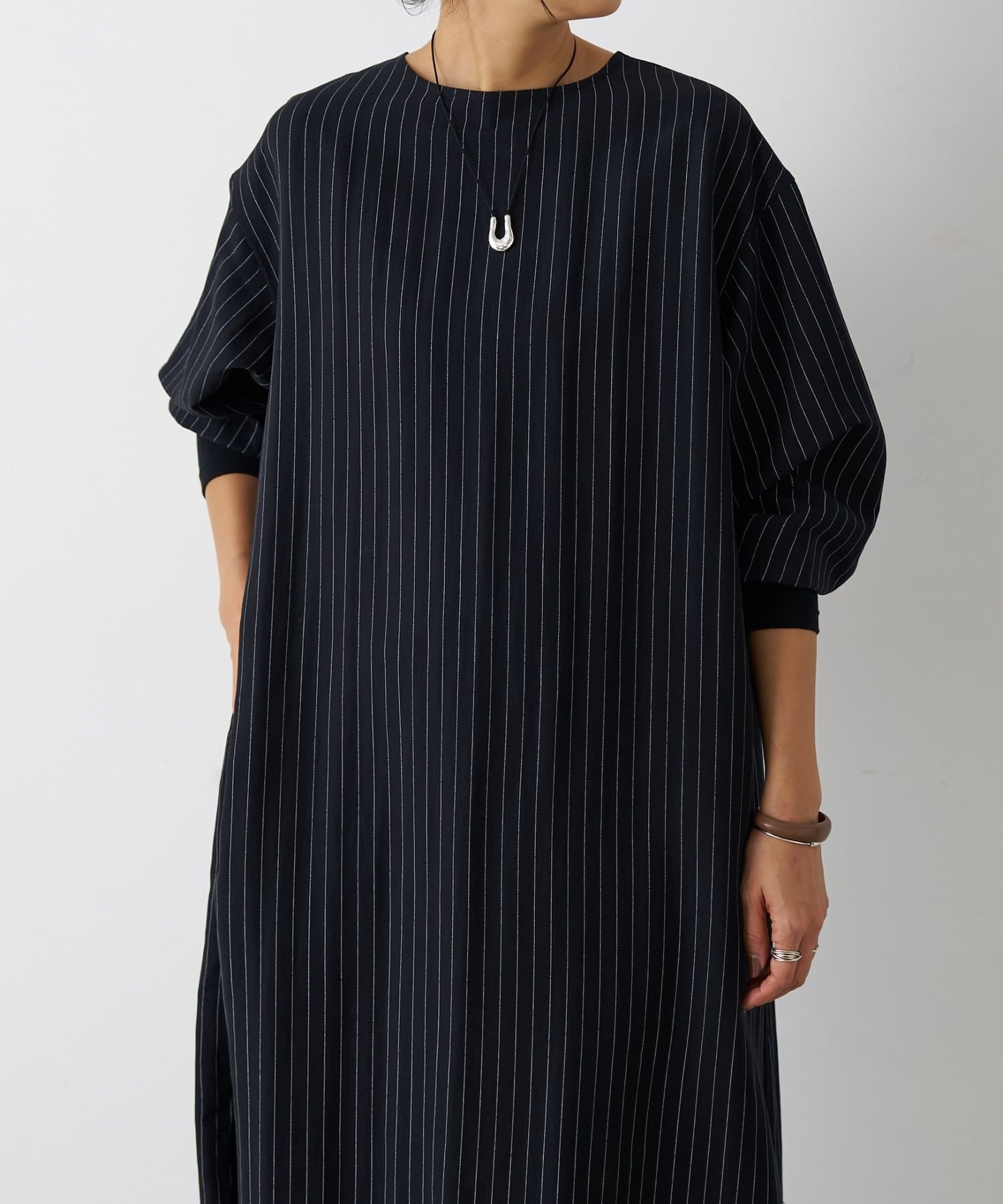 一枚で様になる上品さと、レイヤードにも使いやすい万能さを兼ね備えた、大人のためのストライプワンピースです。