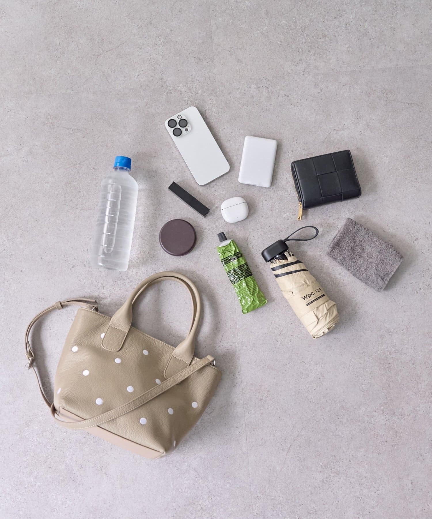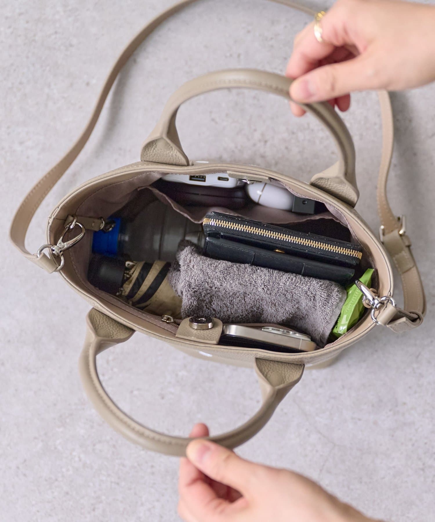 コンパクトながらマチがしっかりあり、長財布やポーチ、ペットボトルもすっきり収納。