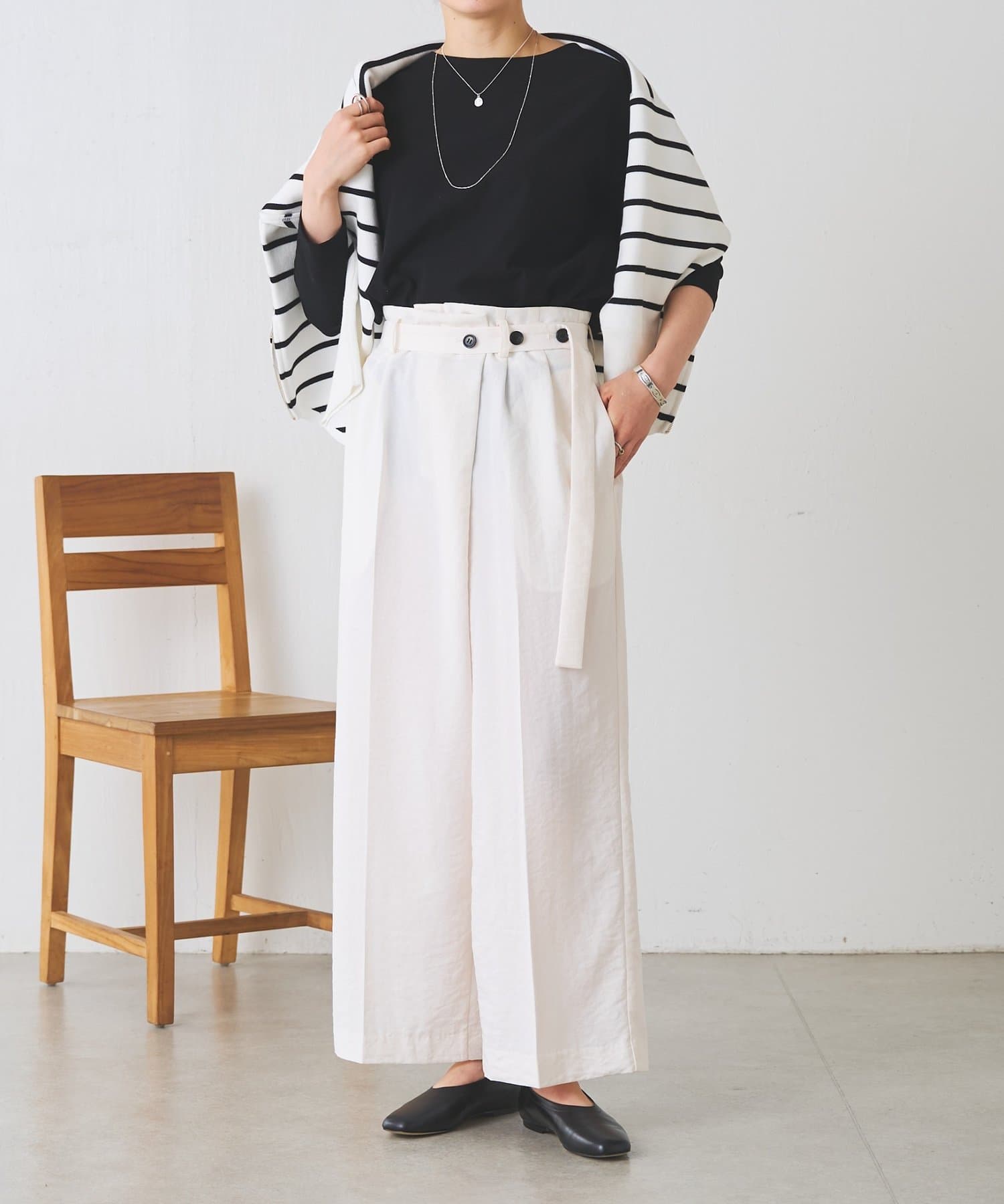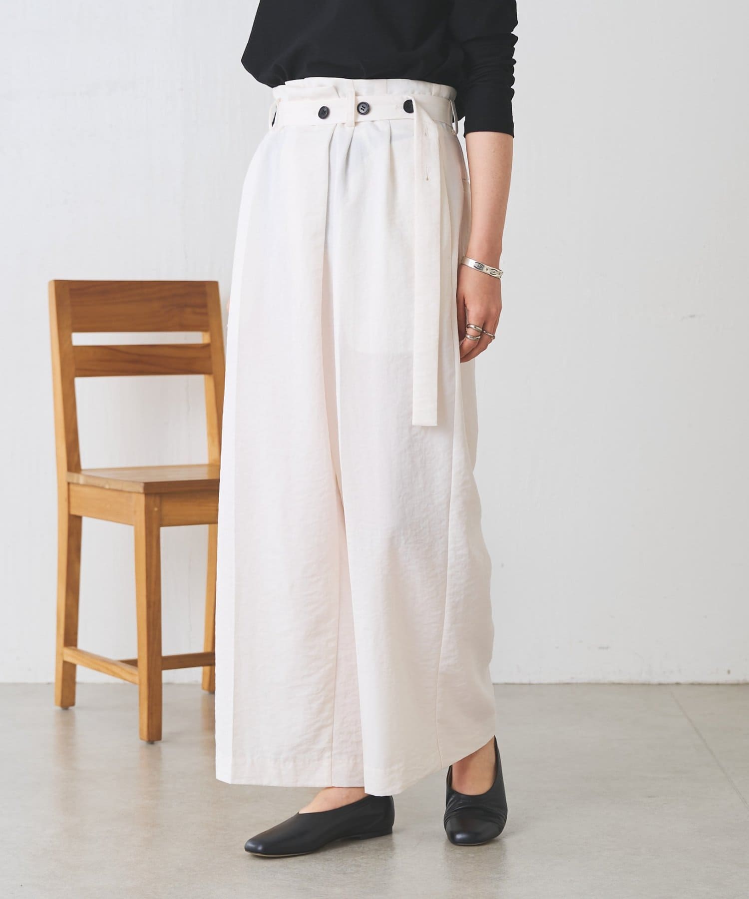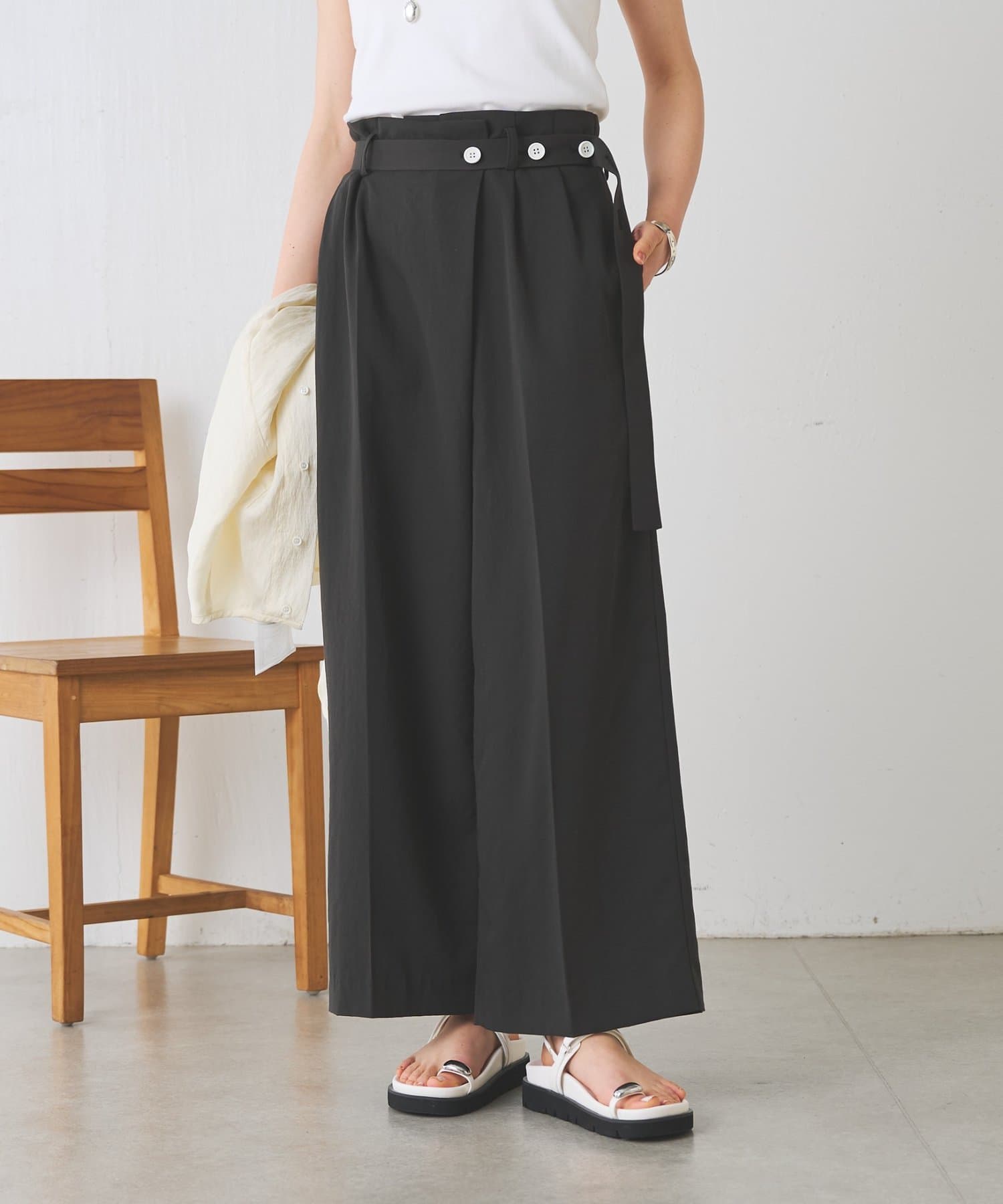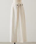 ウエストの前開きをサイドにずらした、アシンメトリーなデザインが目を惹くワイドパンツ。