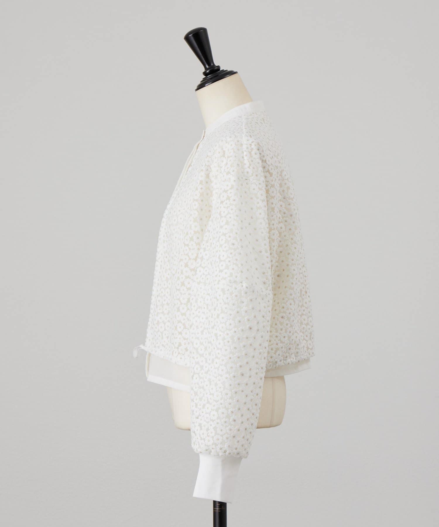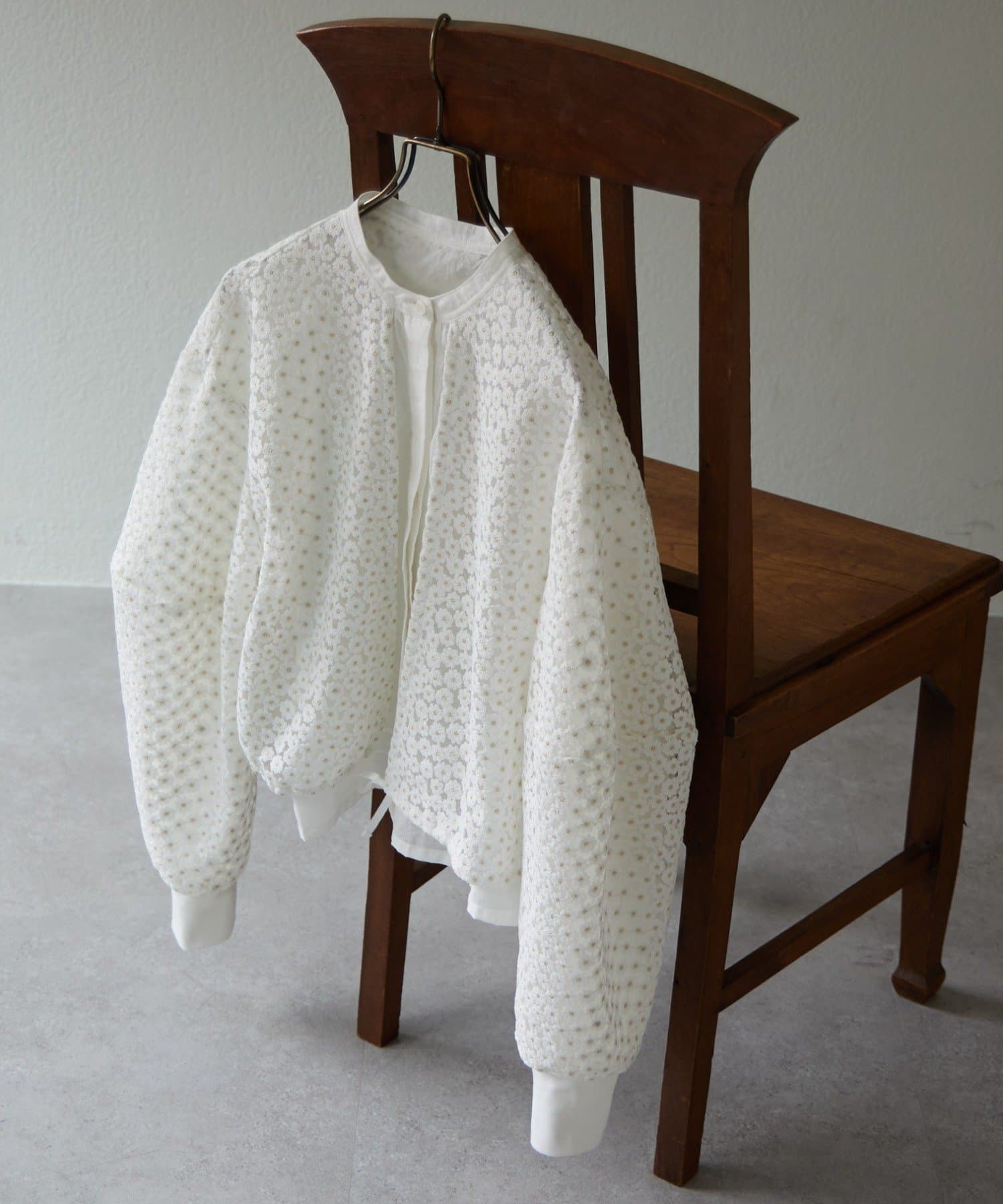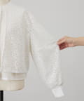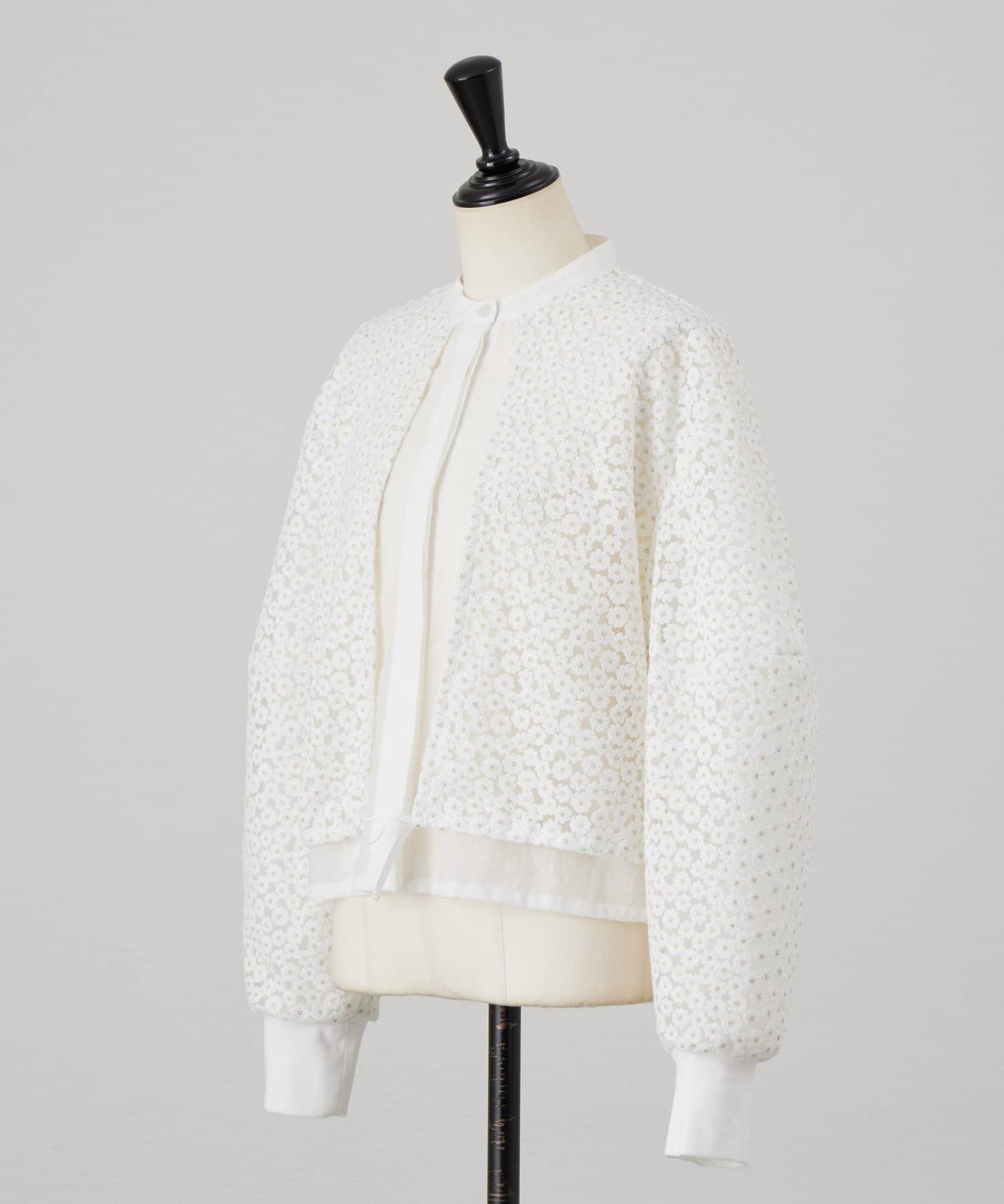 透け感のある刺繍生地の内側には、さらにシアー素材を重ねることで、奥行きのある表情に仕上げています。