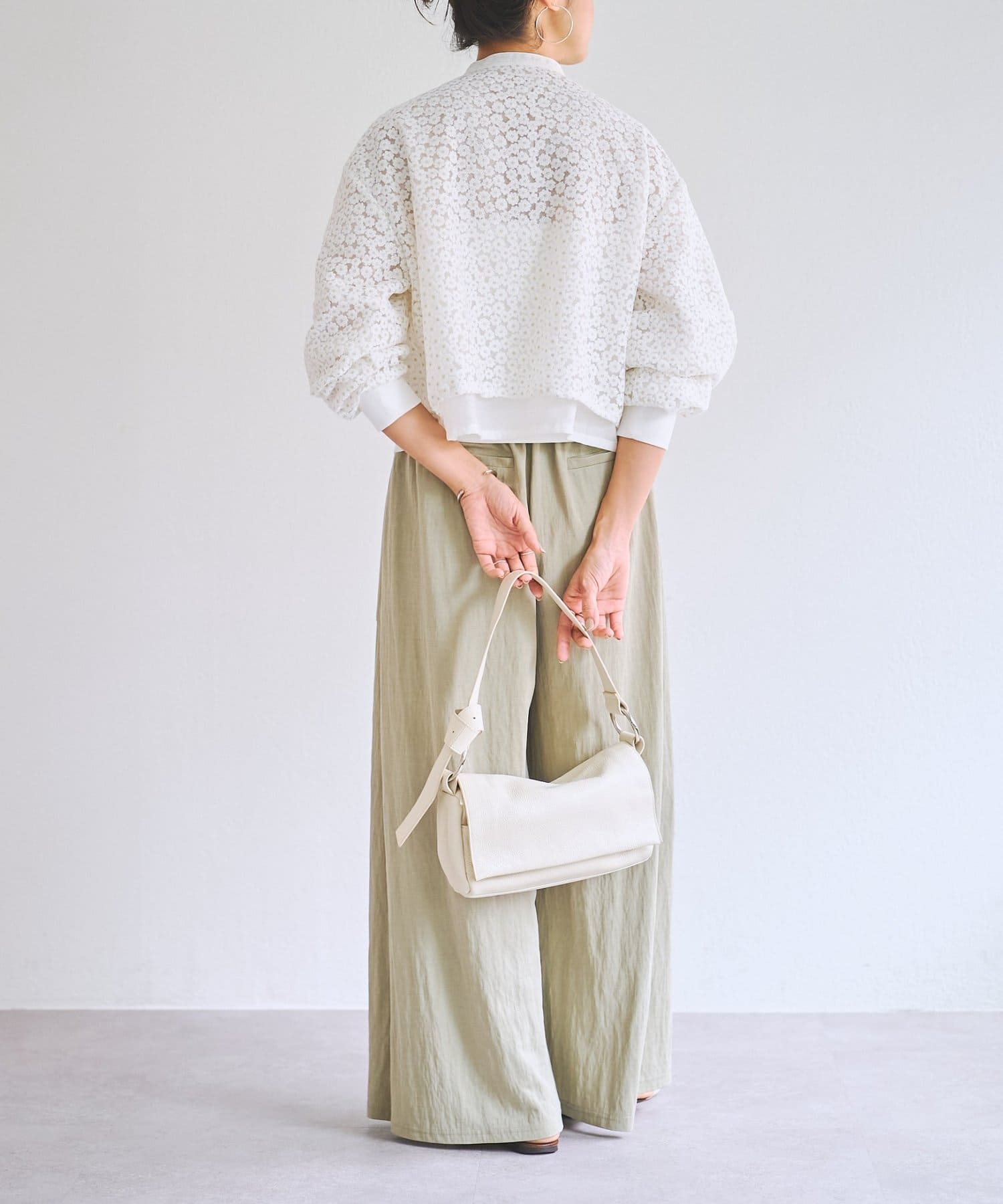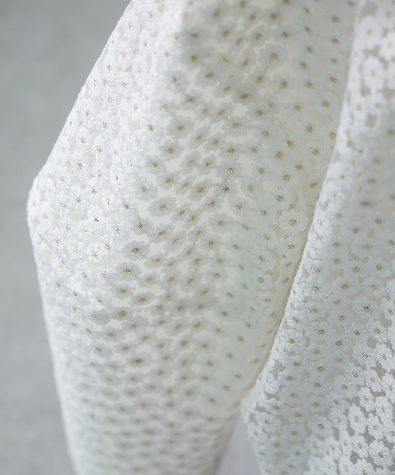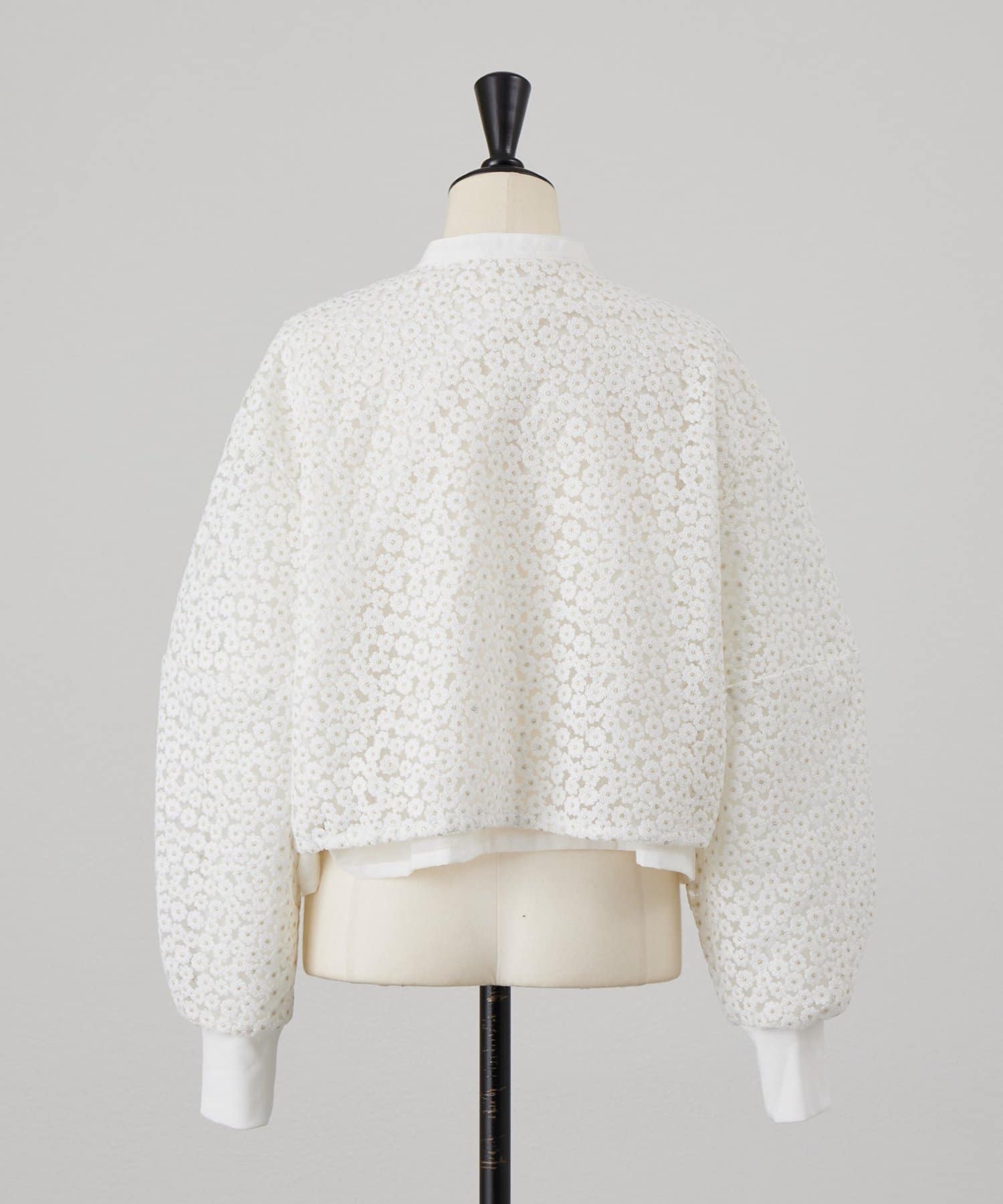 透け感のある刺繍生地の内側には、さらにシアー素材を重ねることで、奥行きのある表情に仕上げています。