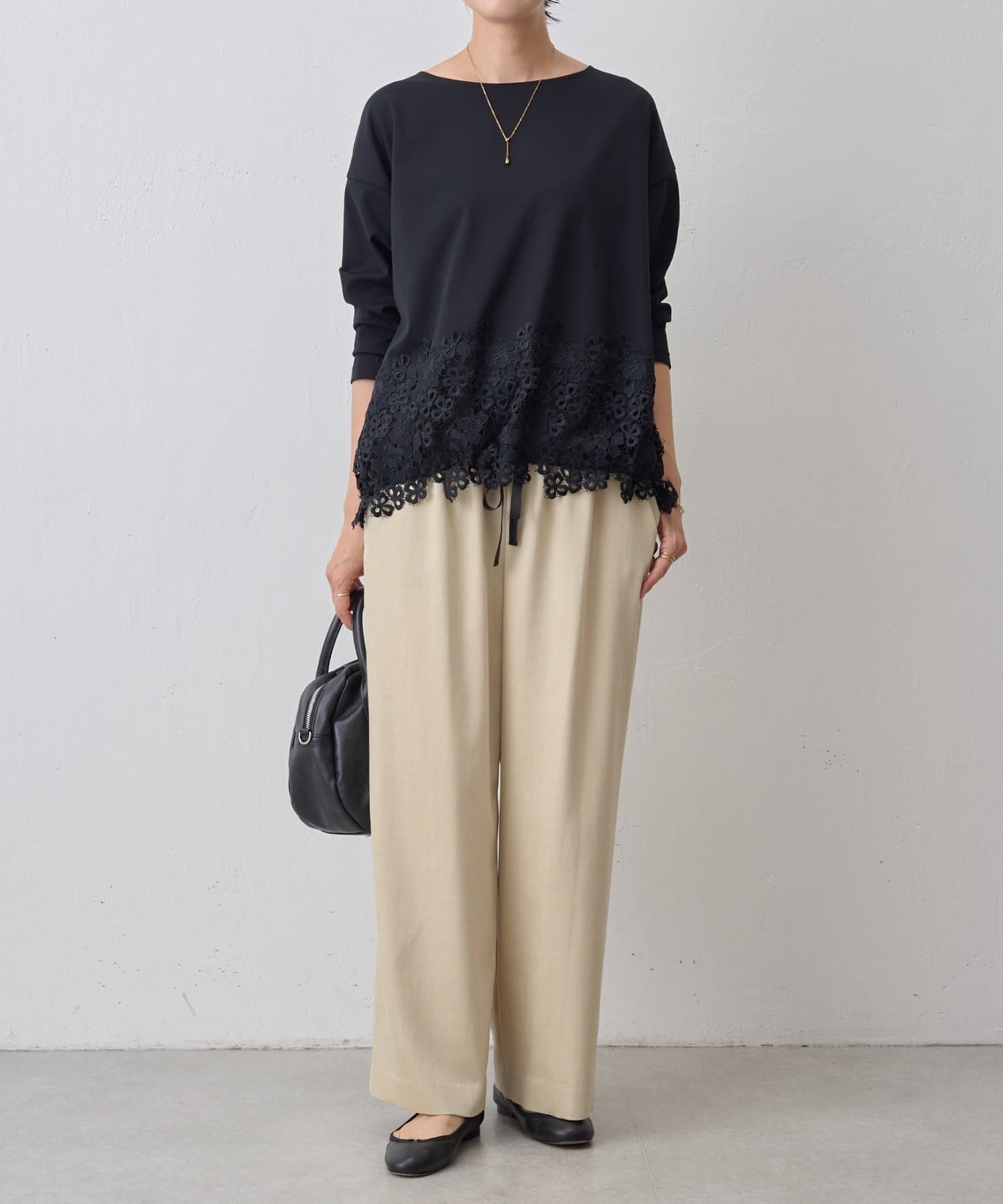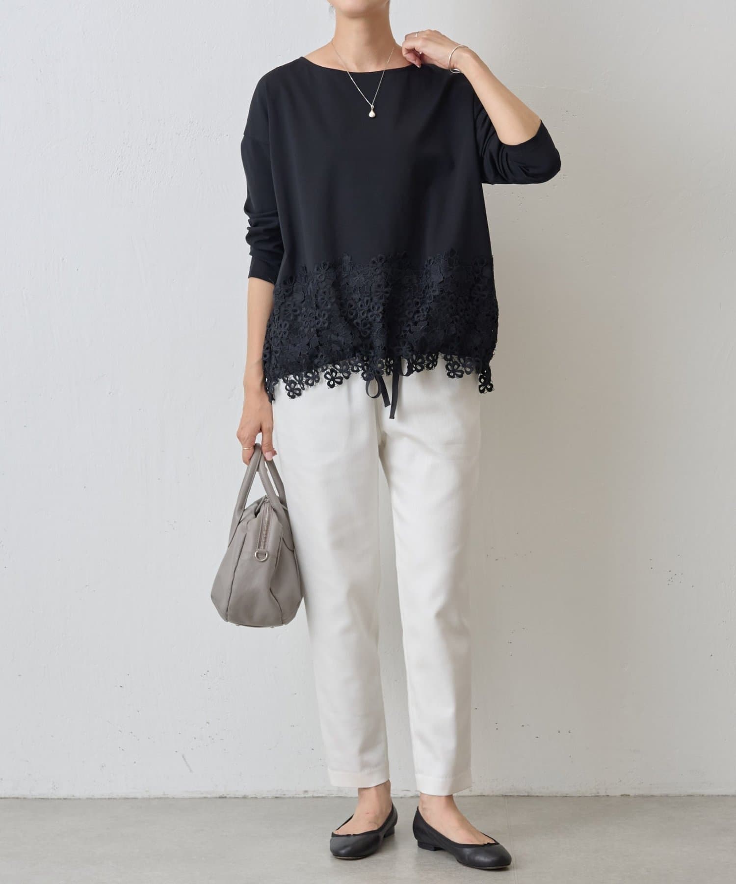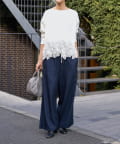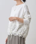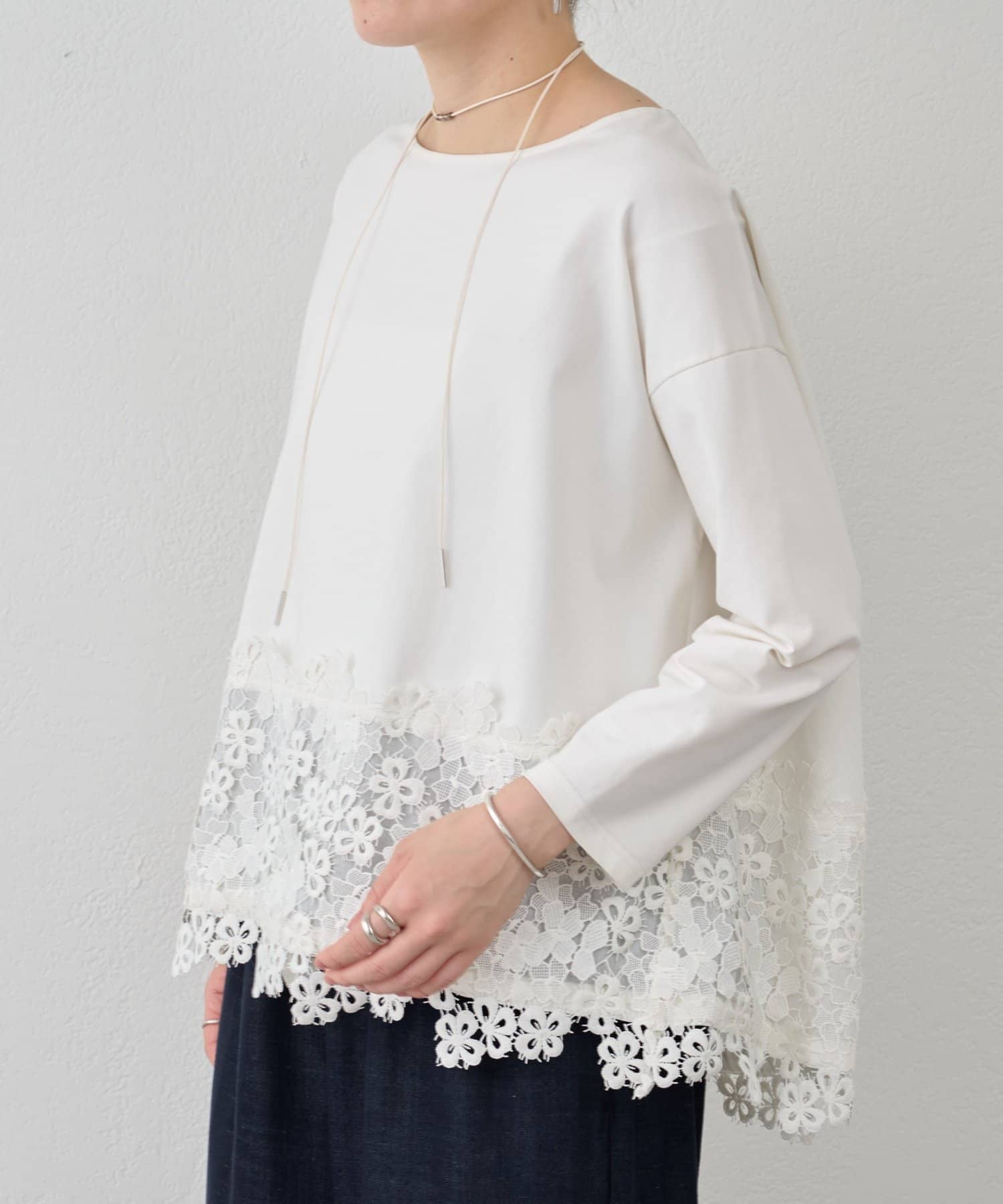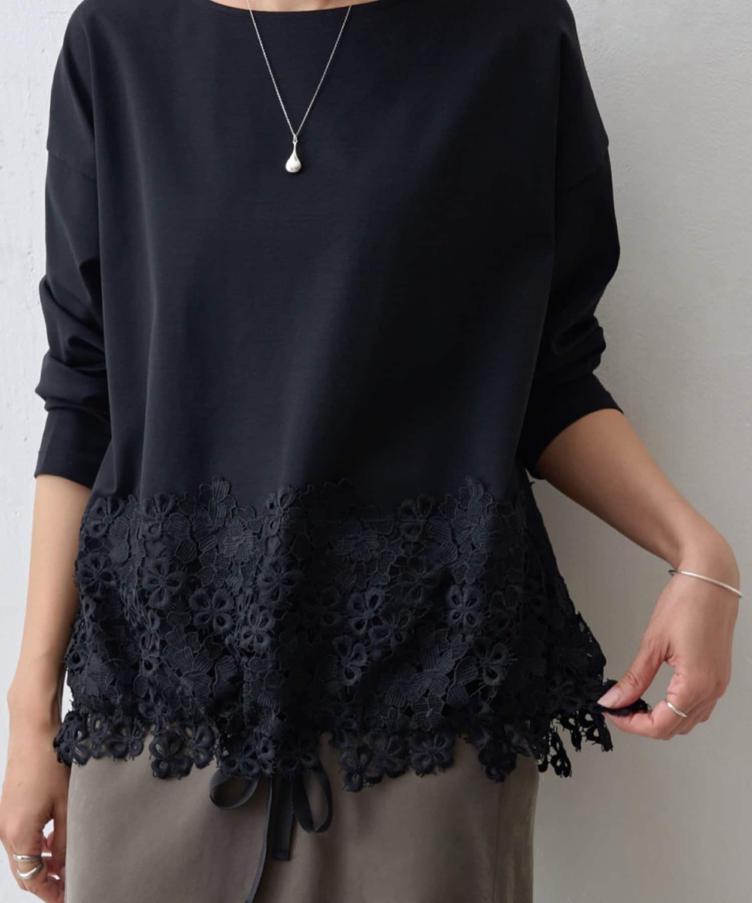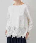 ボディ部分にはカットソー素材を使用し、レースのエレガントさとカジュアルな素材感が絶妙に融合した他にはない一着。