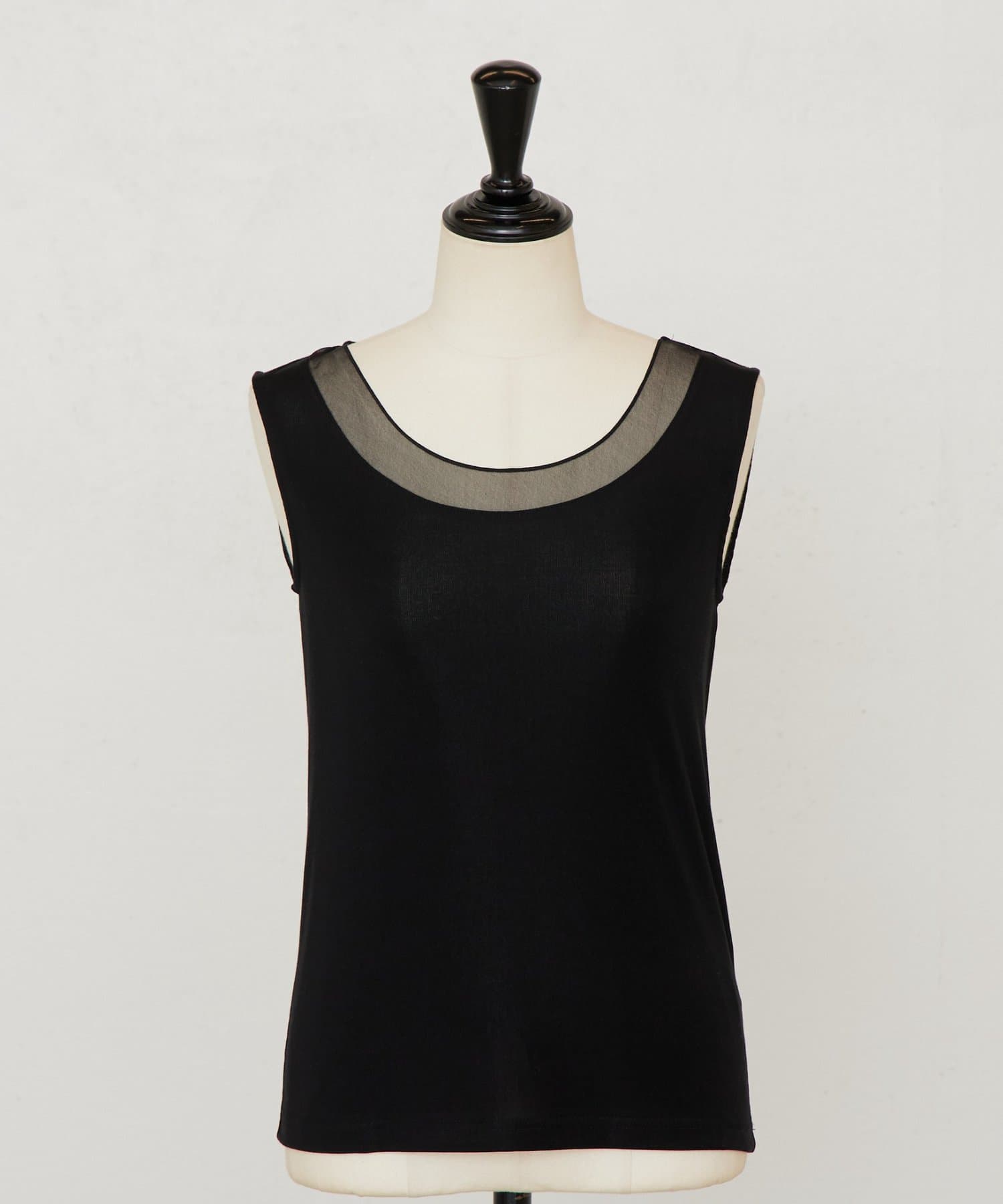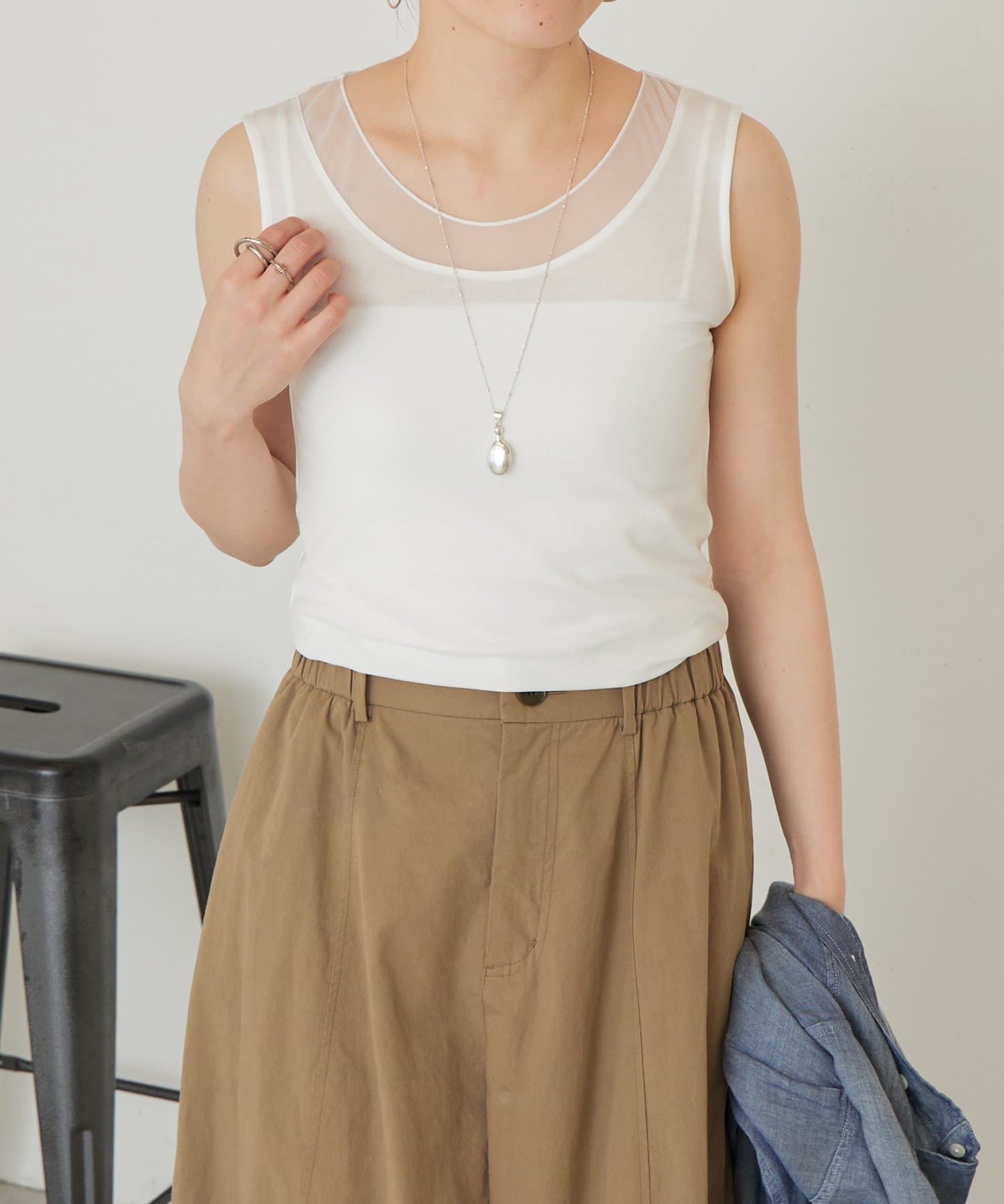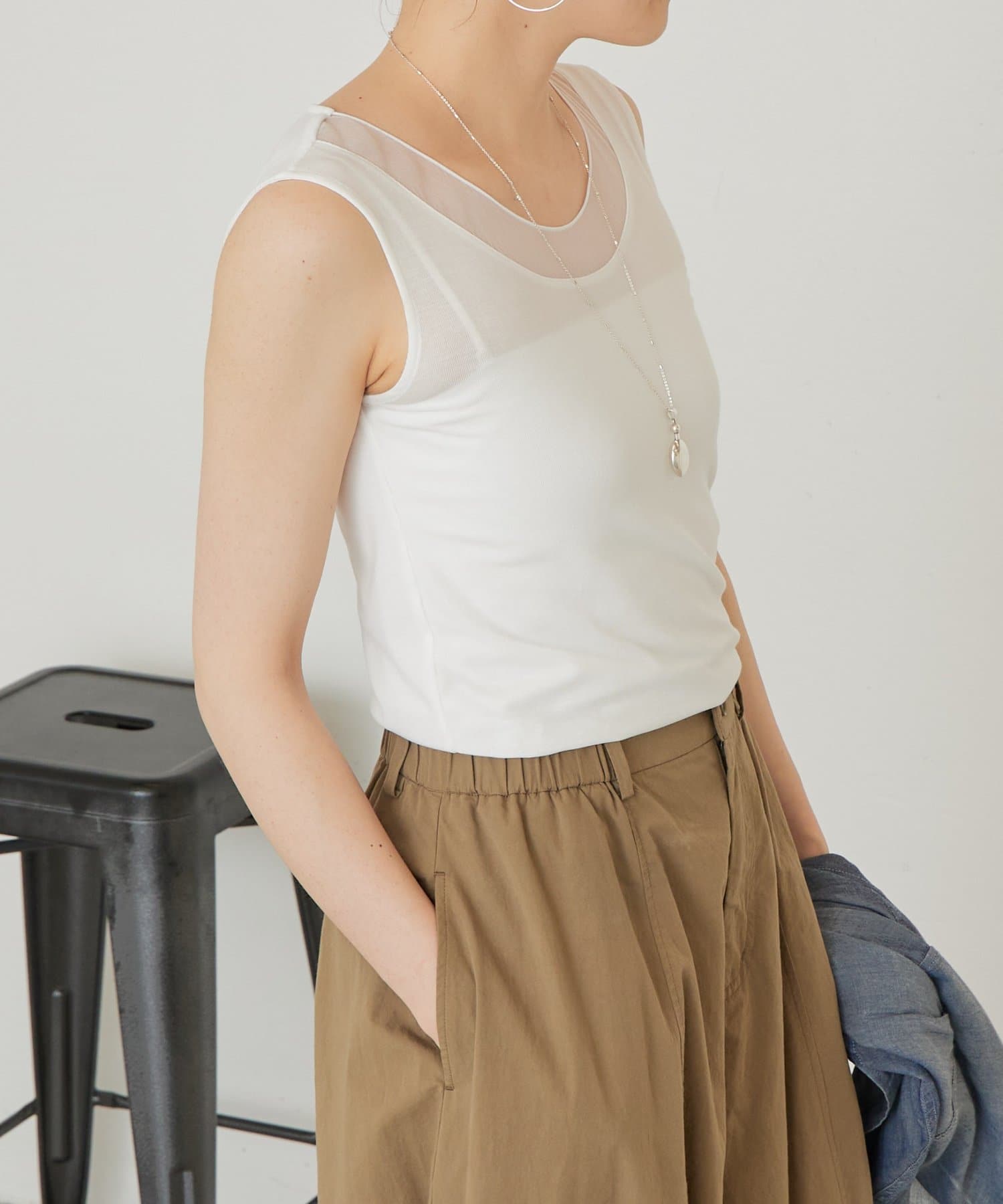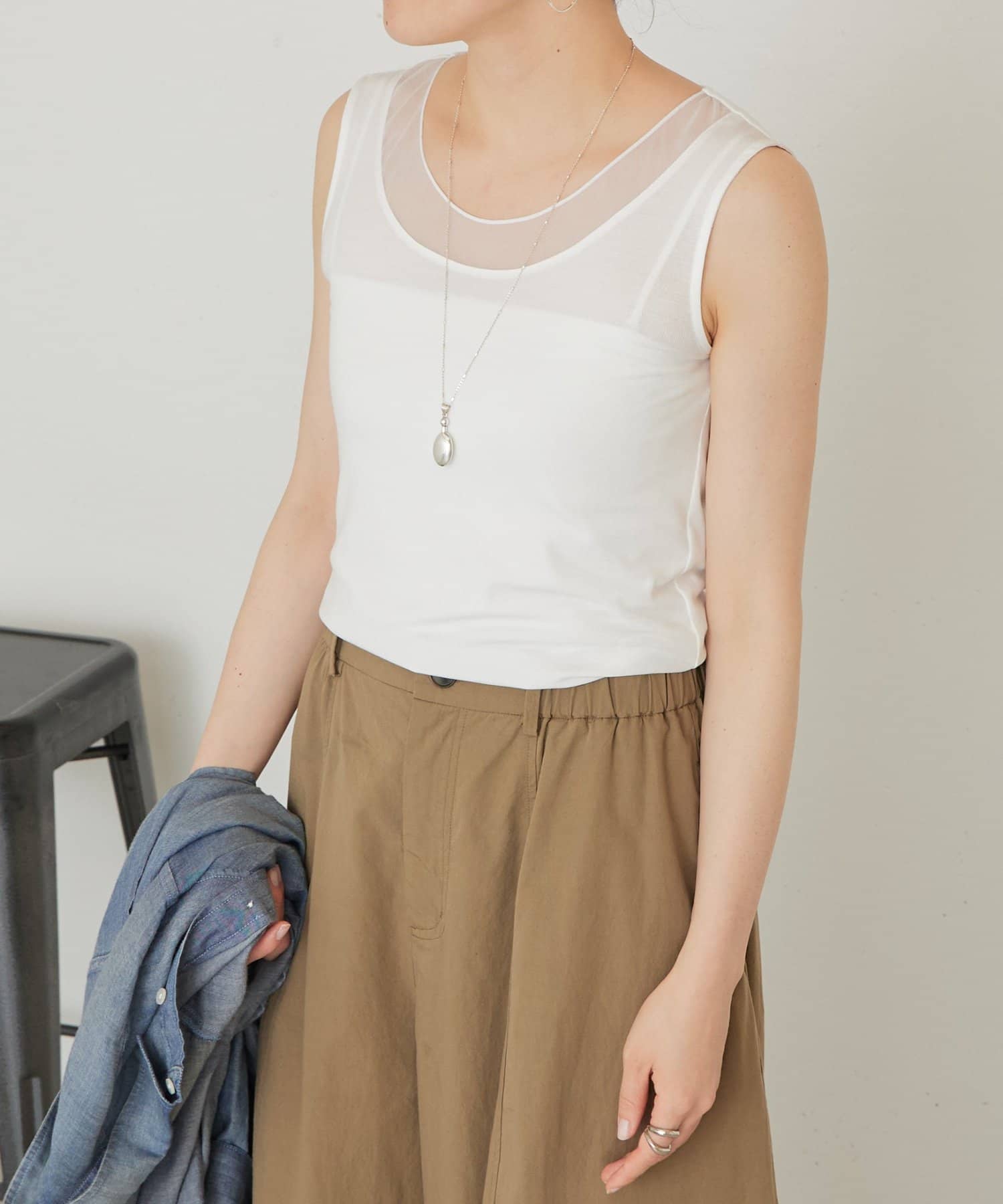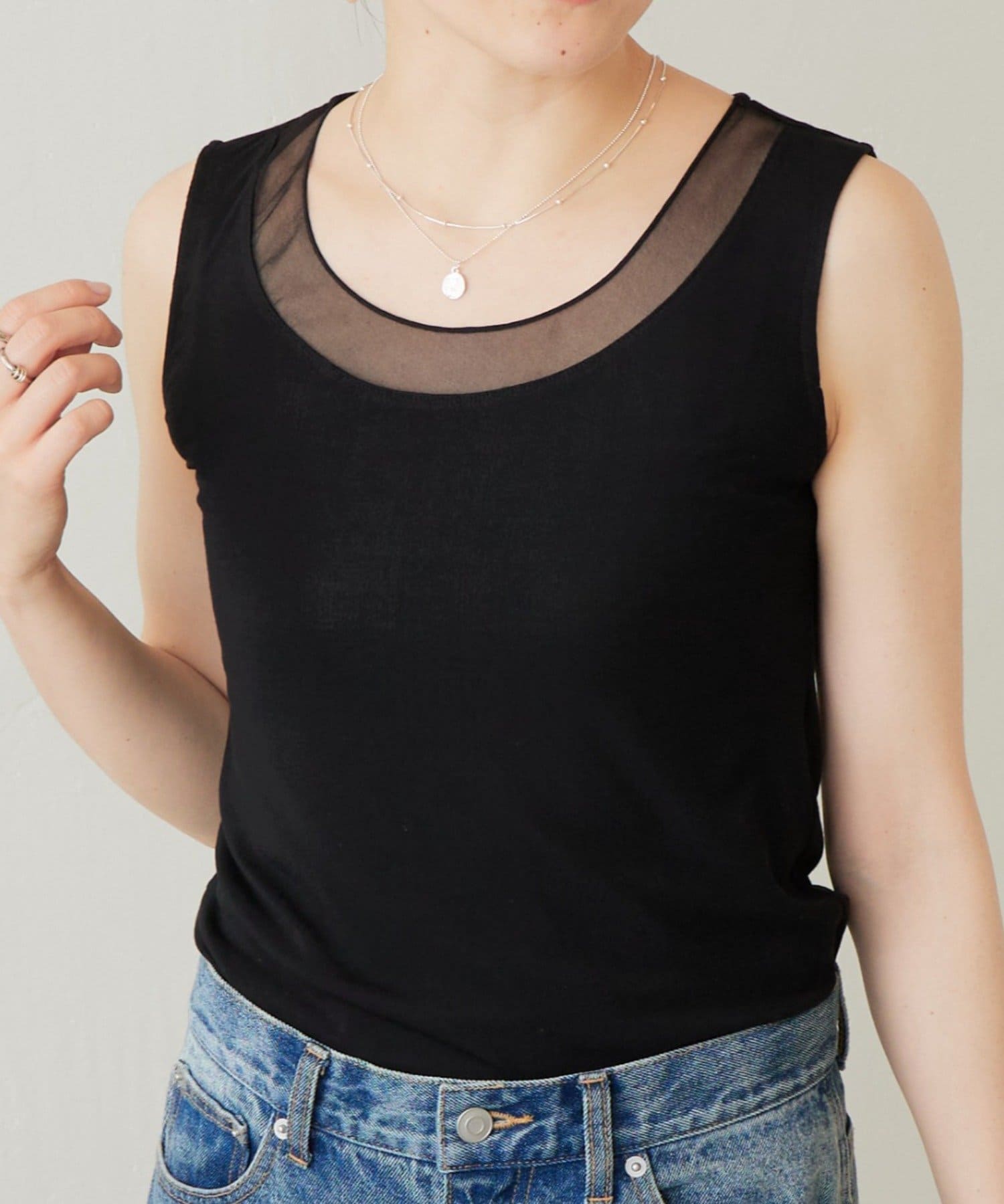 襟元のチュール切り替えが一枚でニュアンスのあるタンクトップ。