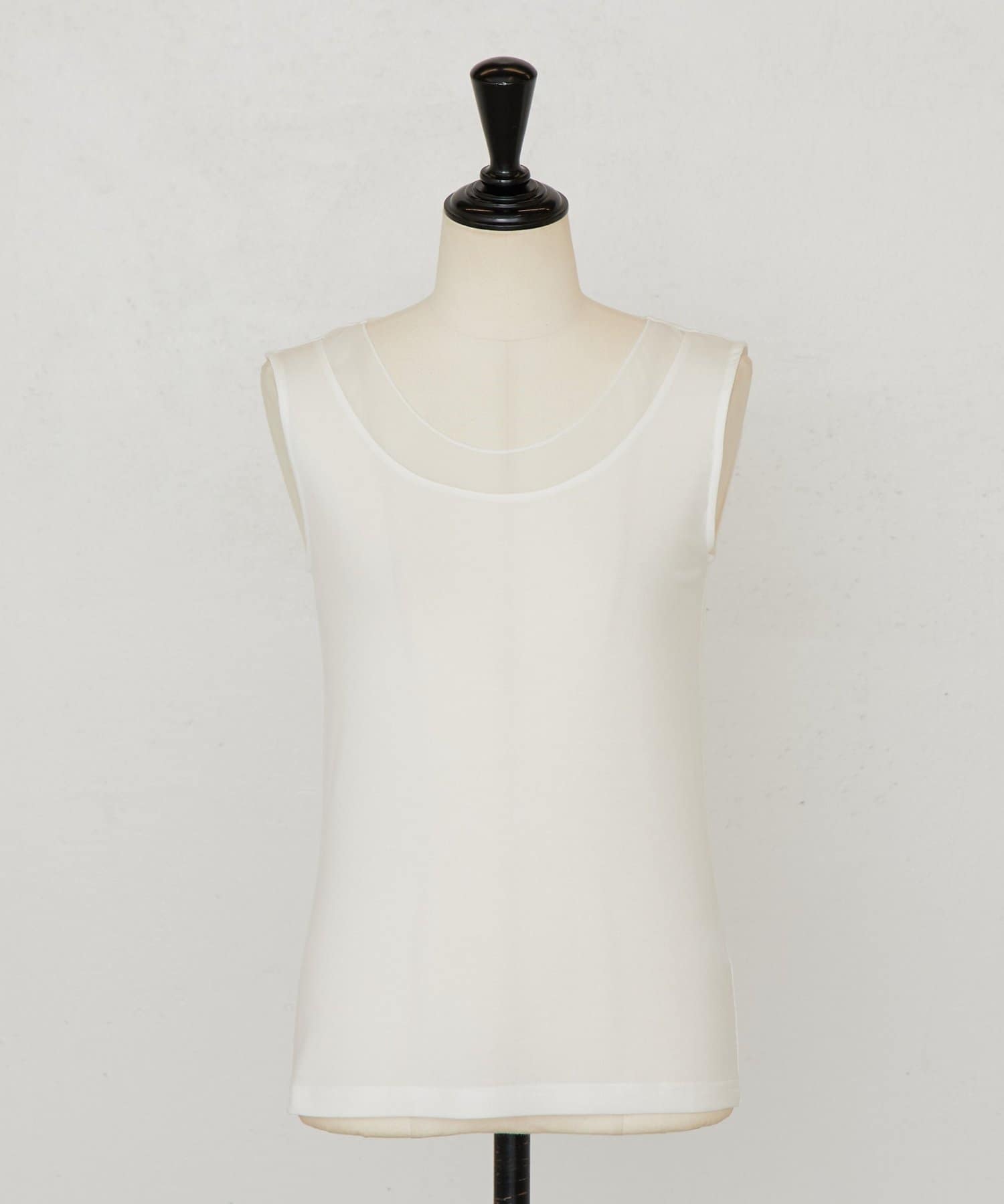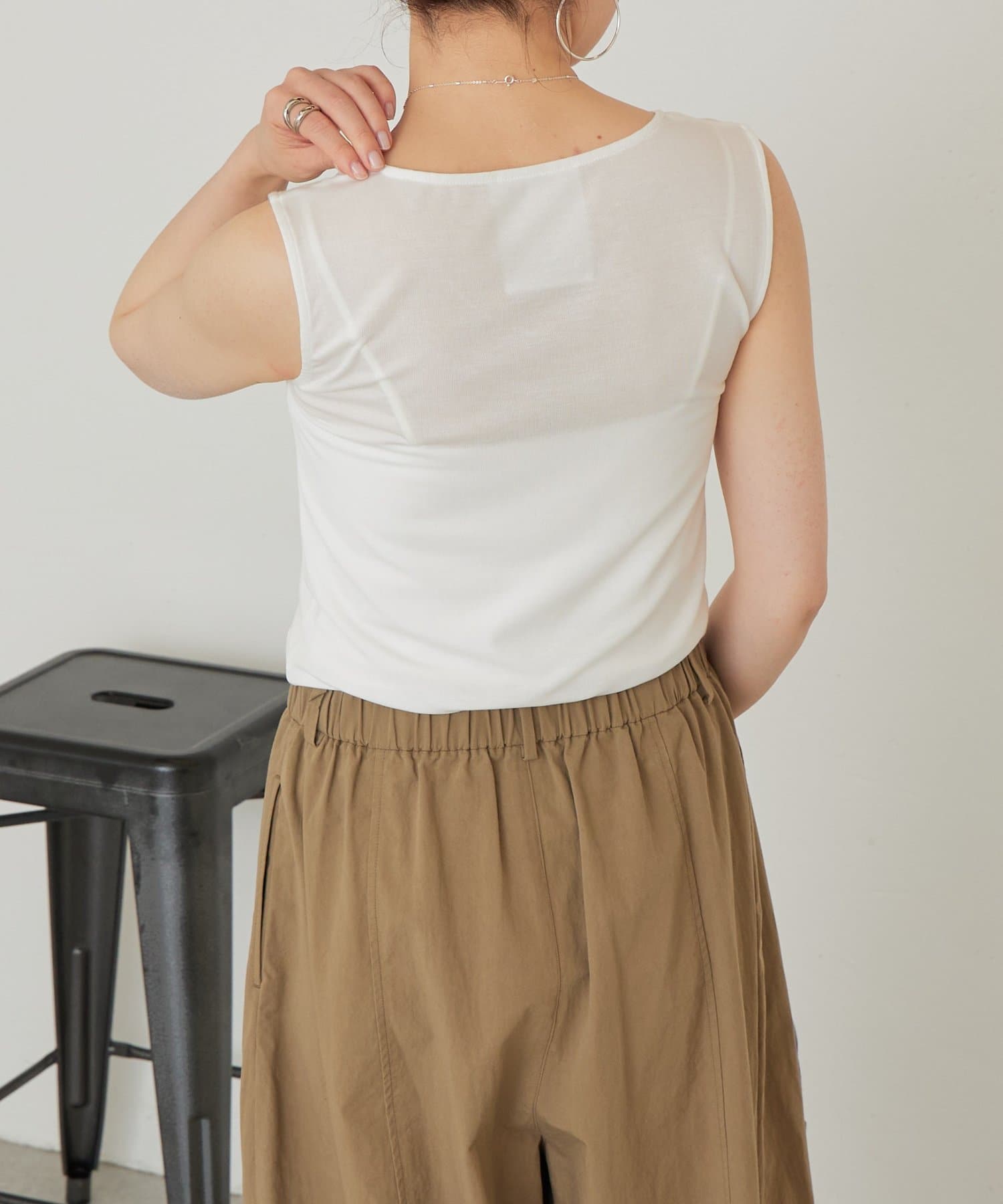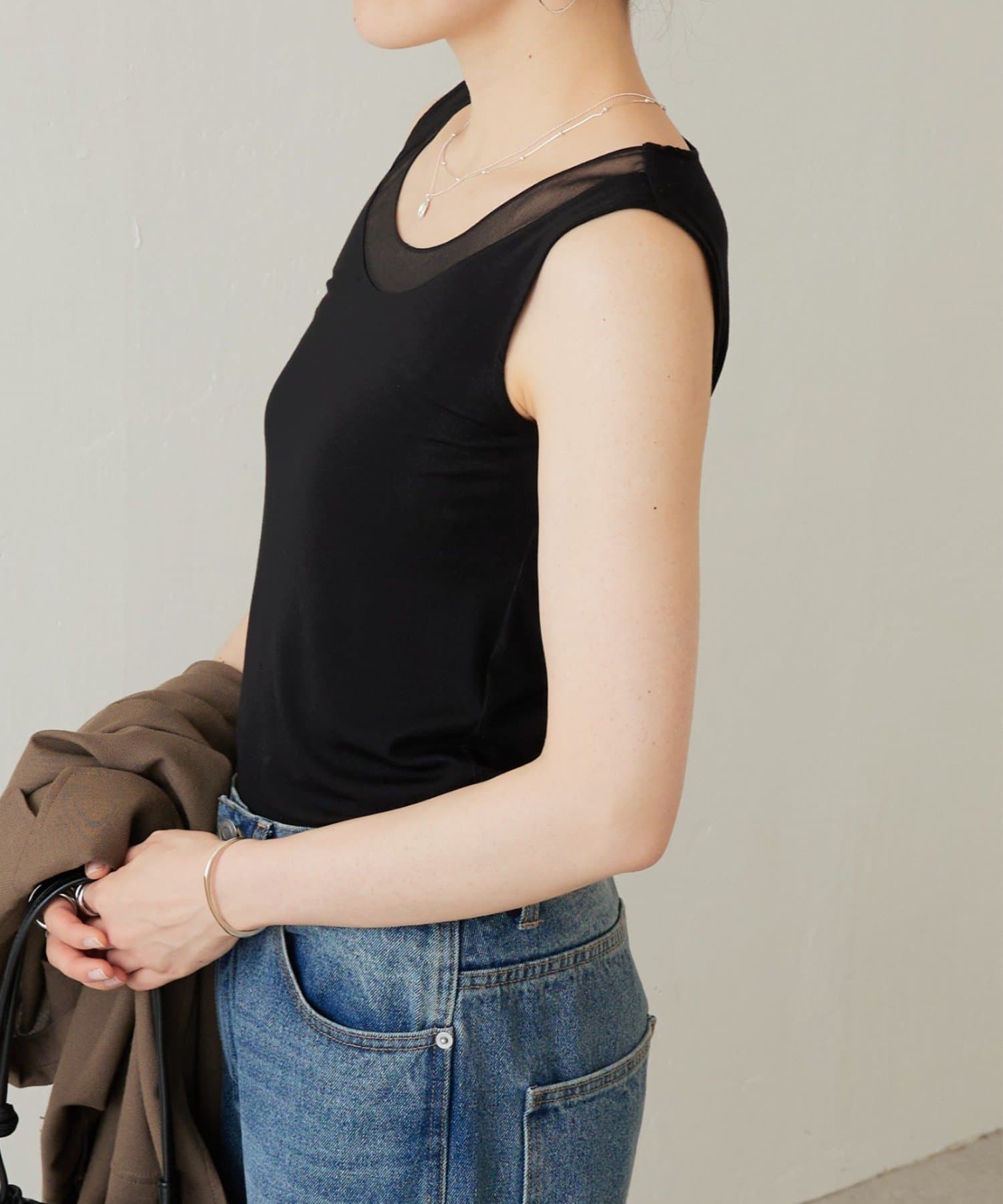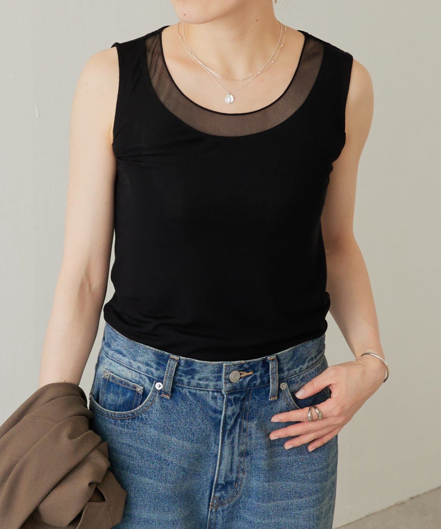襟元のチュール切り替えが一枚でニュアンスのあるタンクトップ。