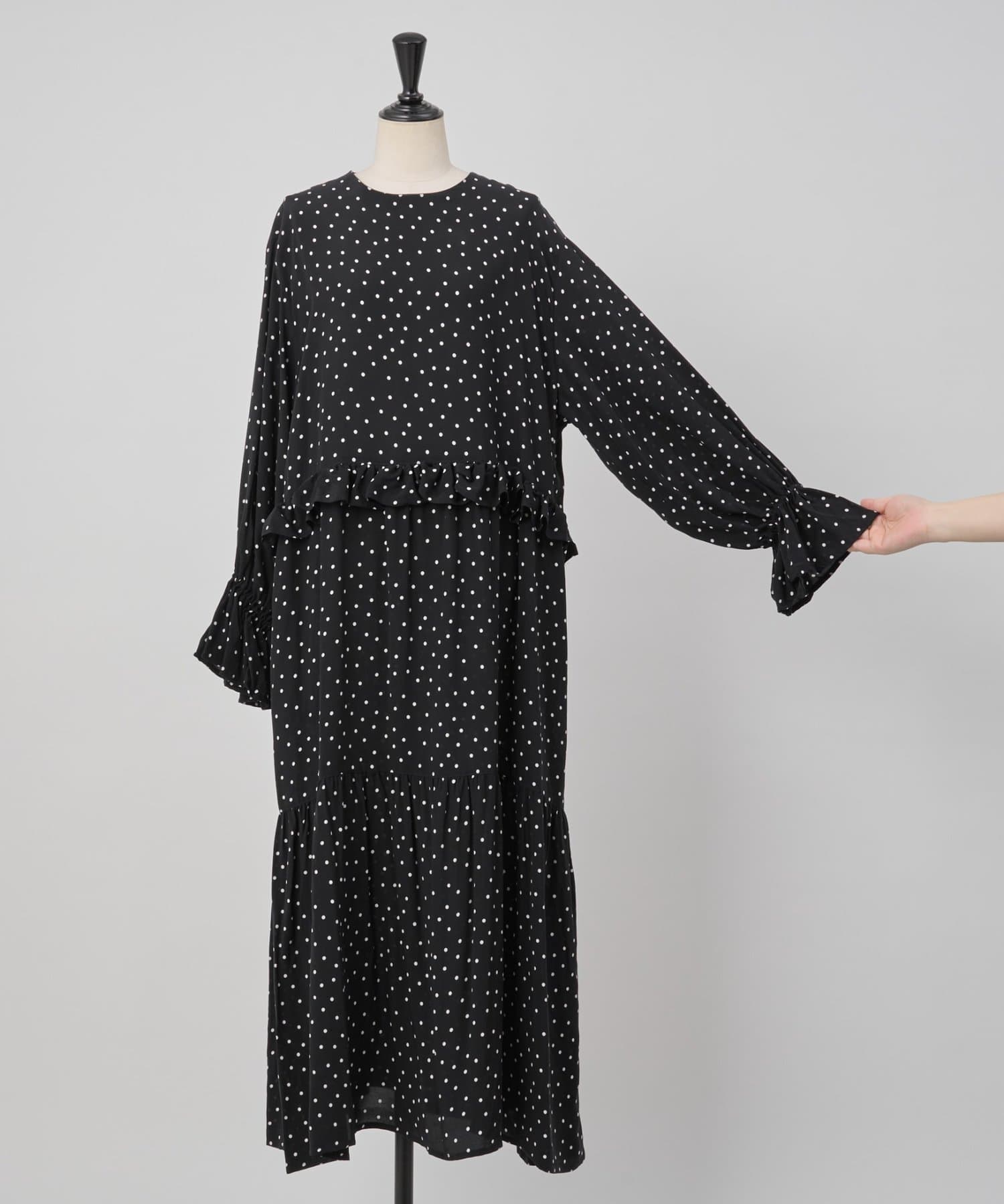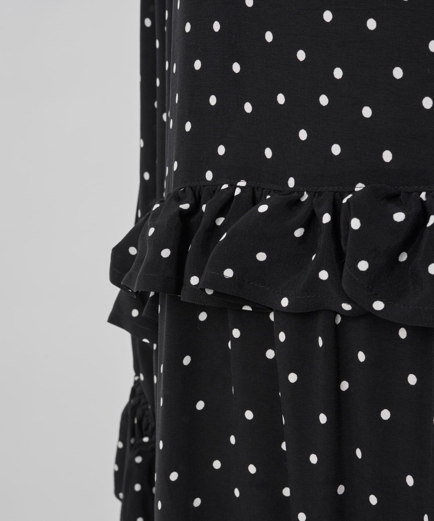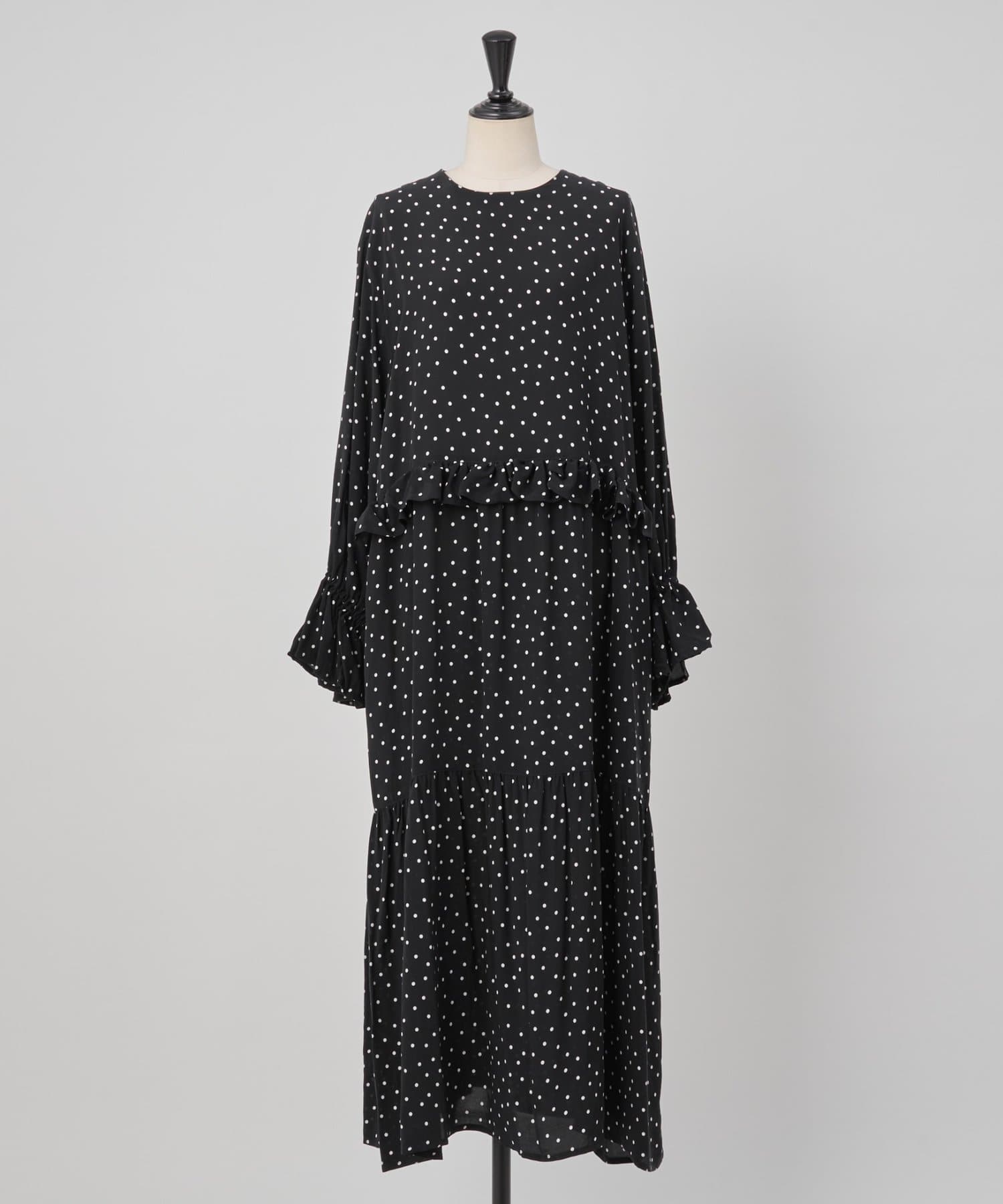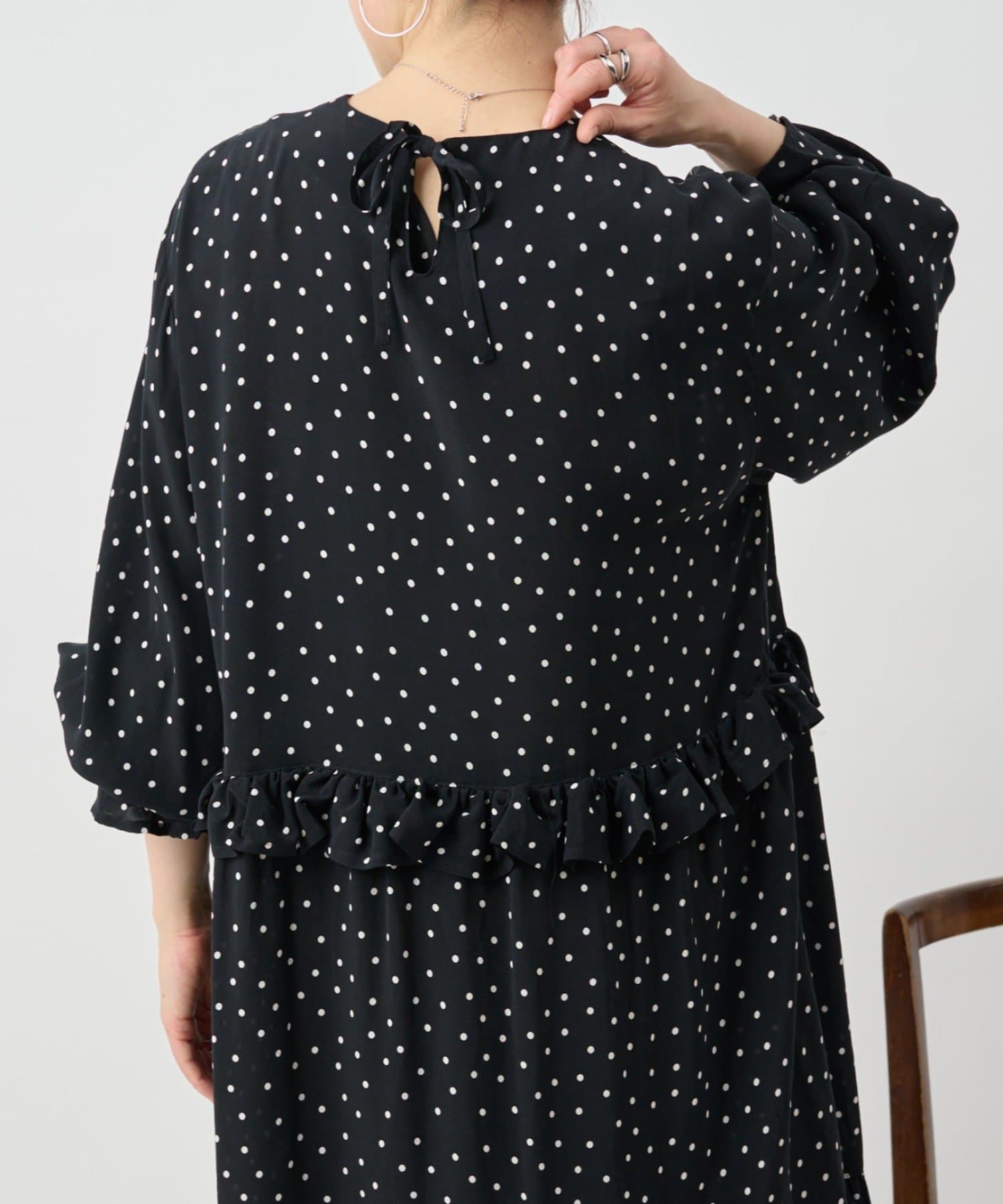 ランダムドット柄が目を惹く、華やかなフリルコンビワンピース。