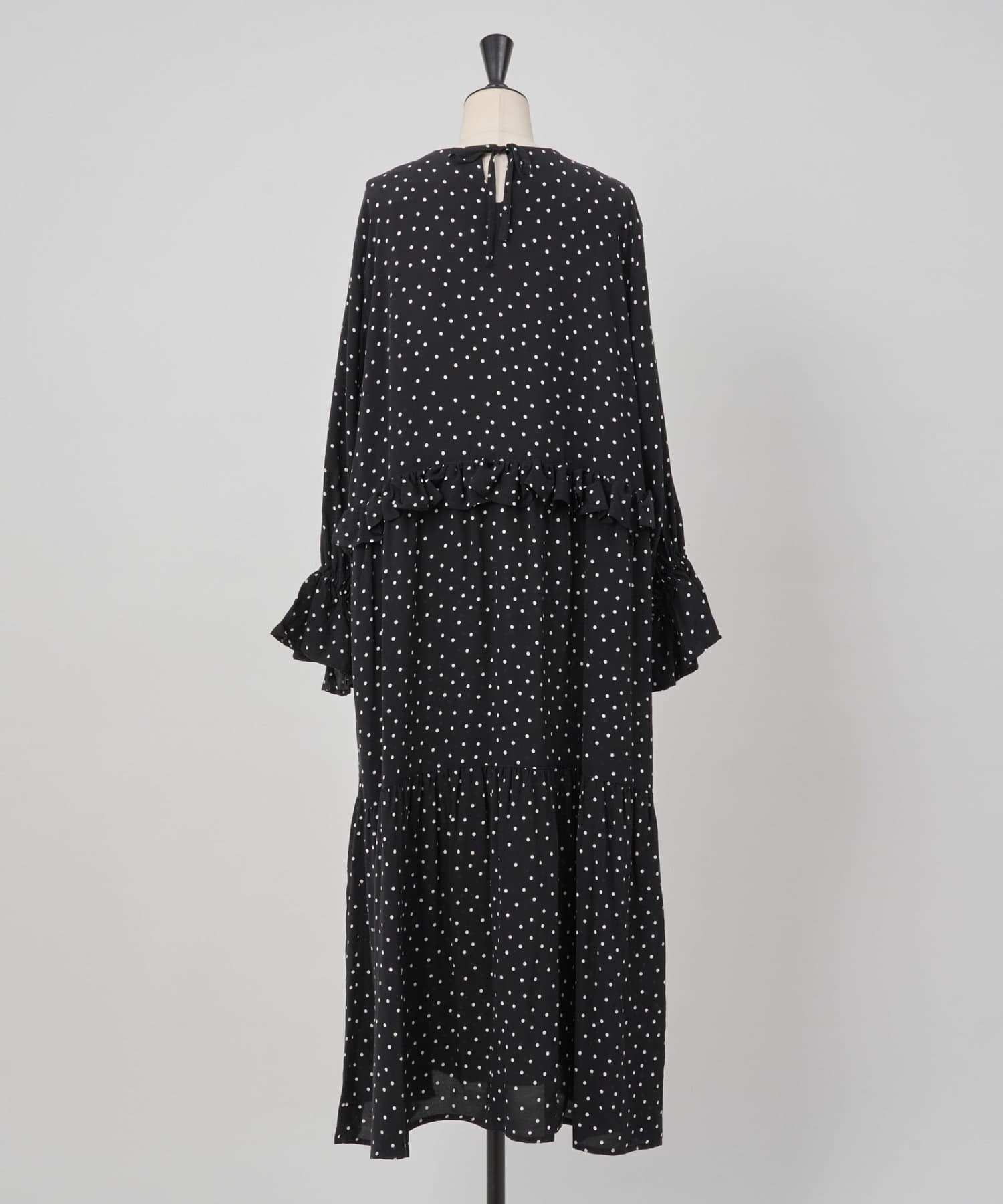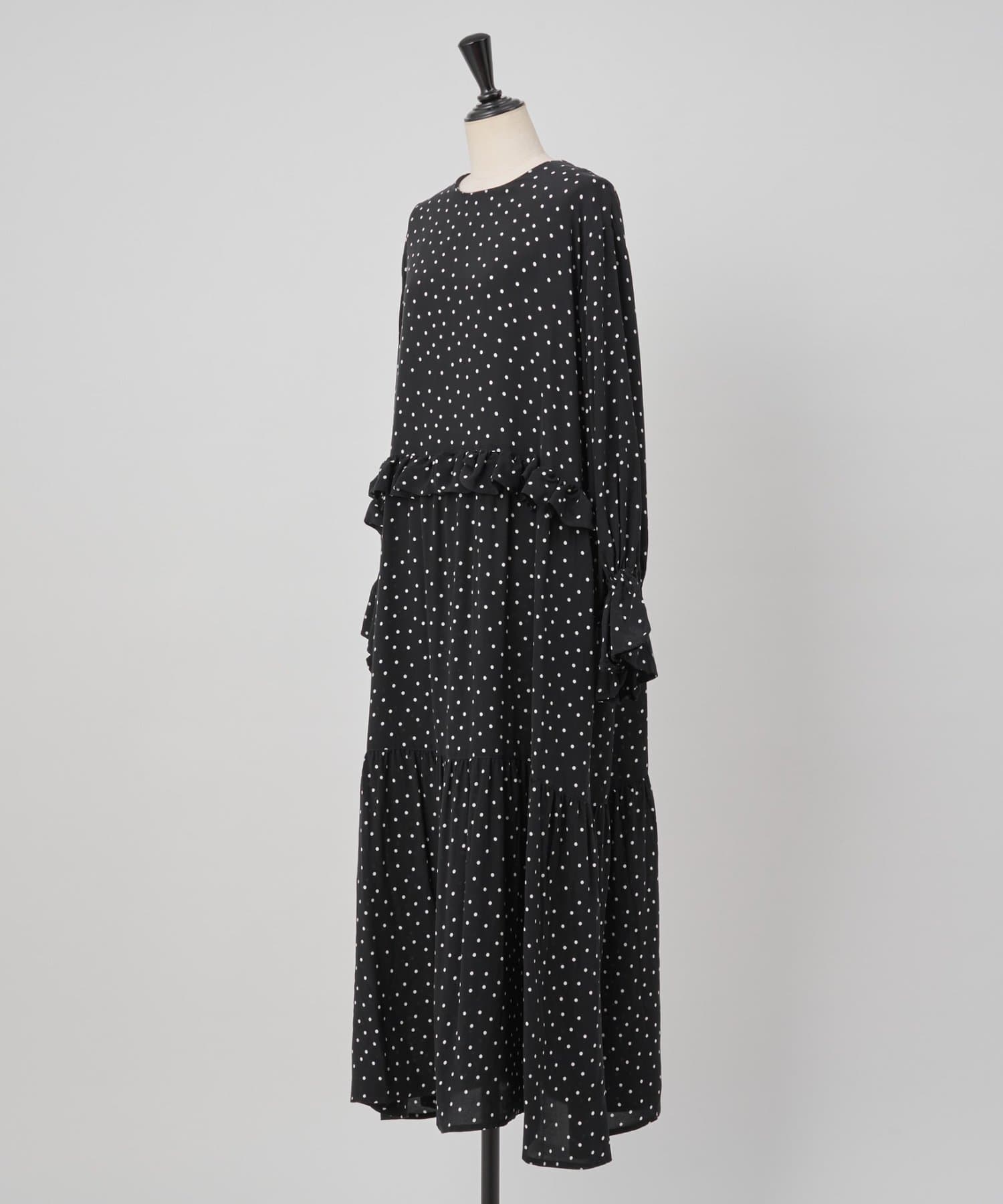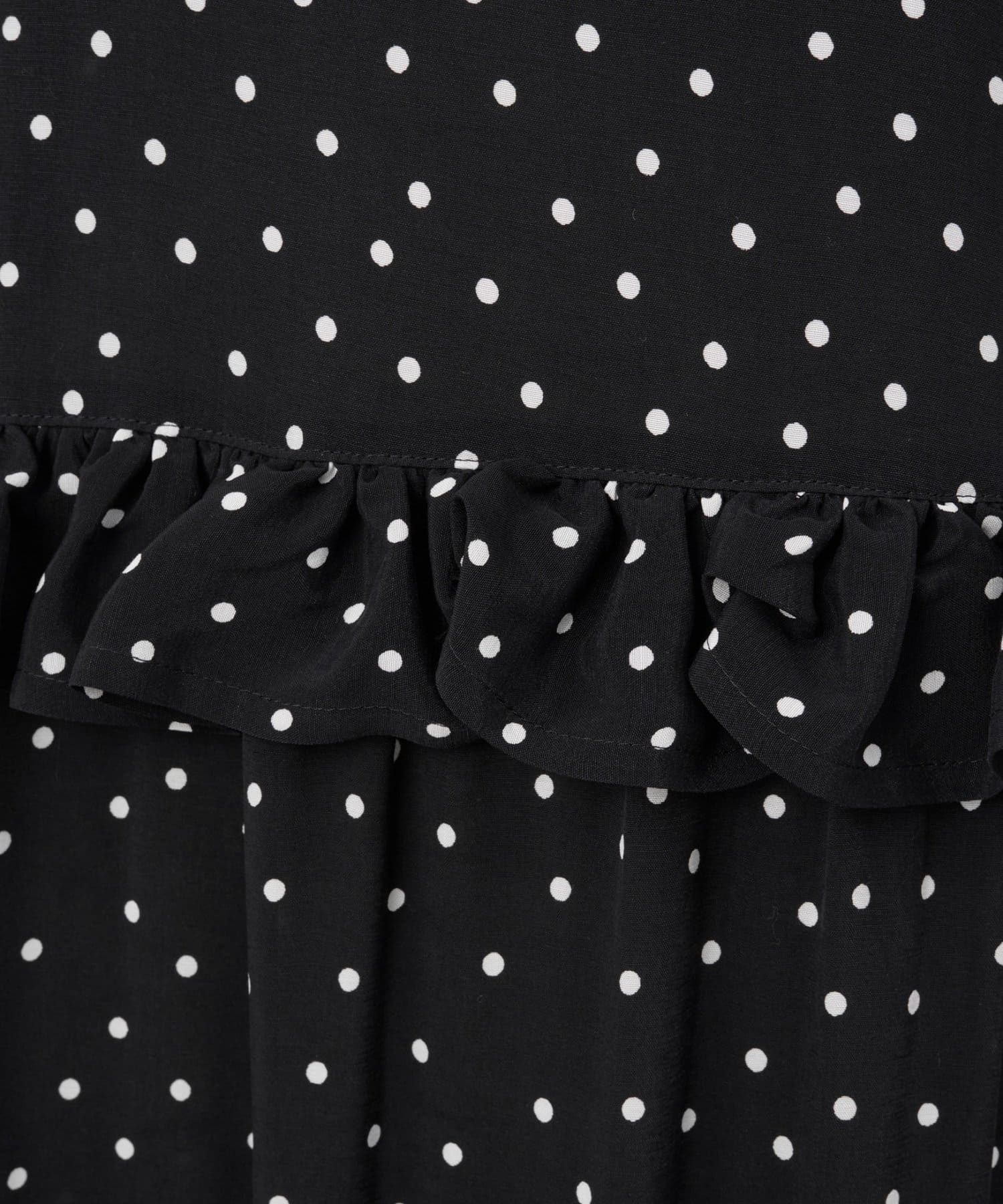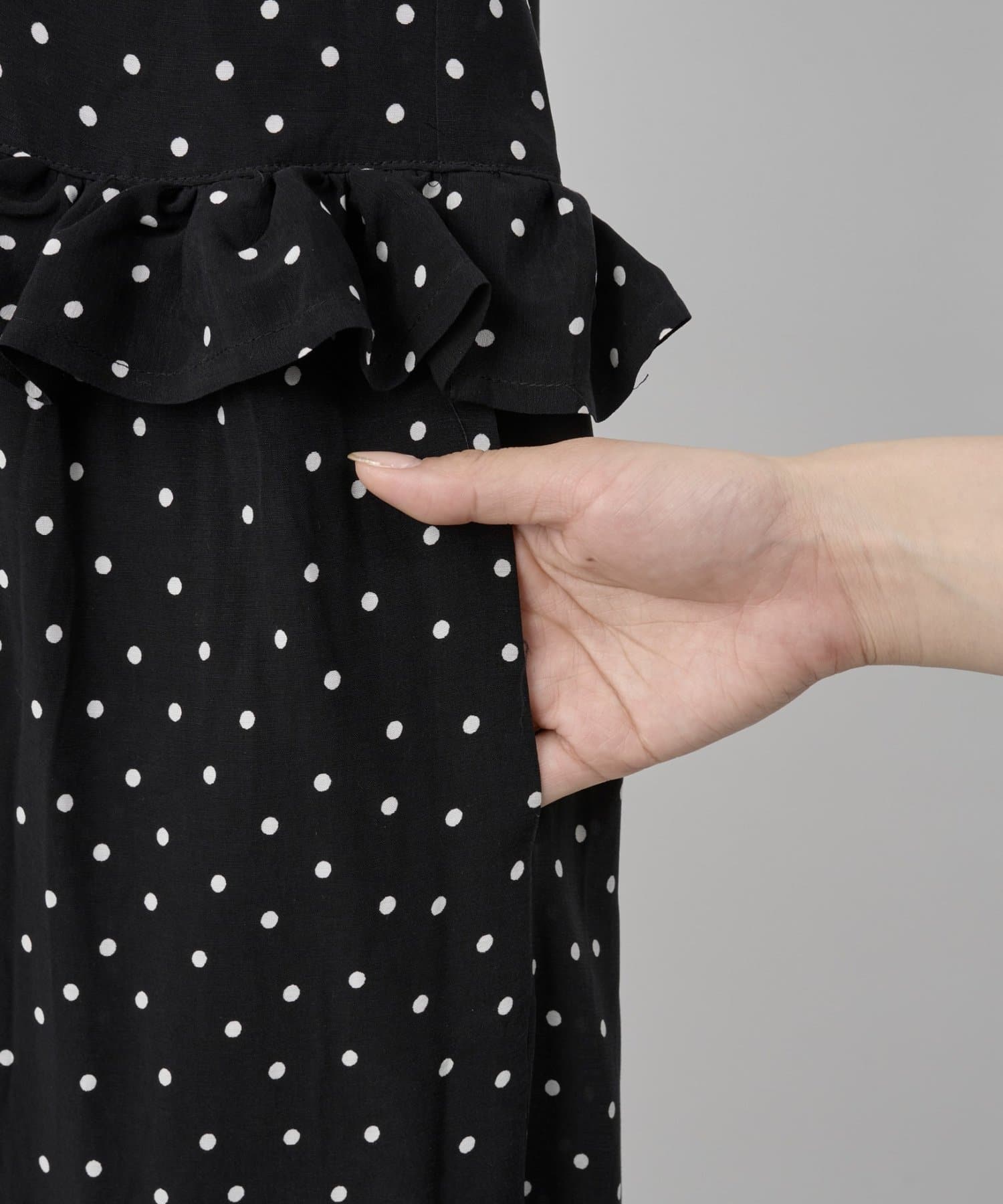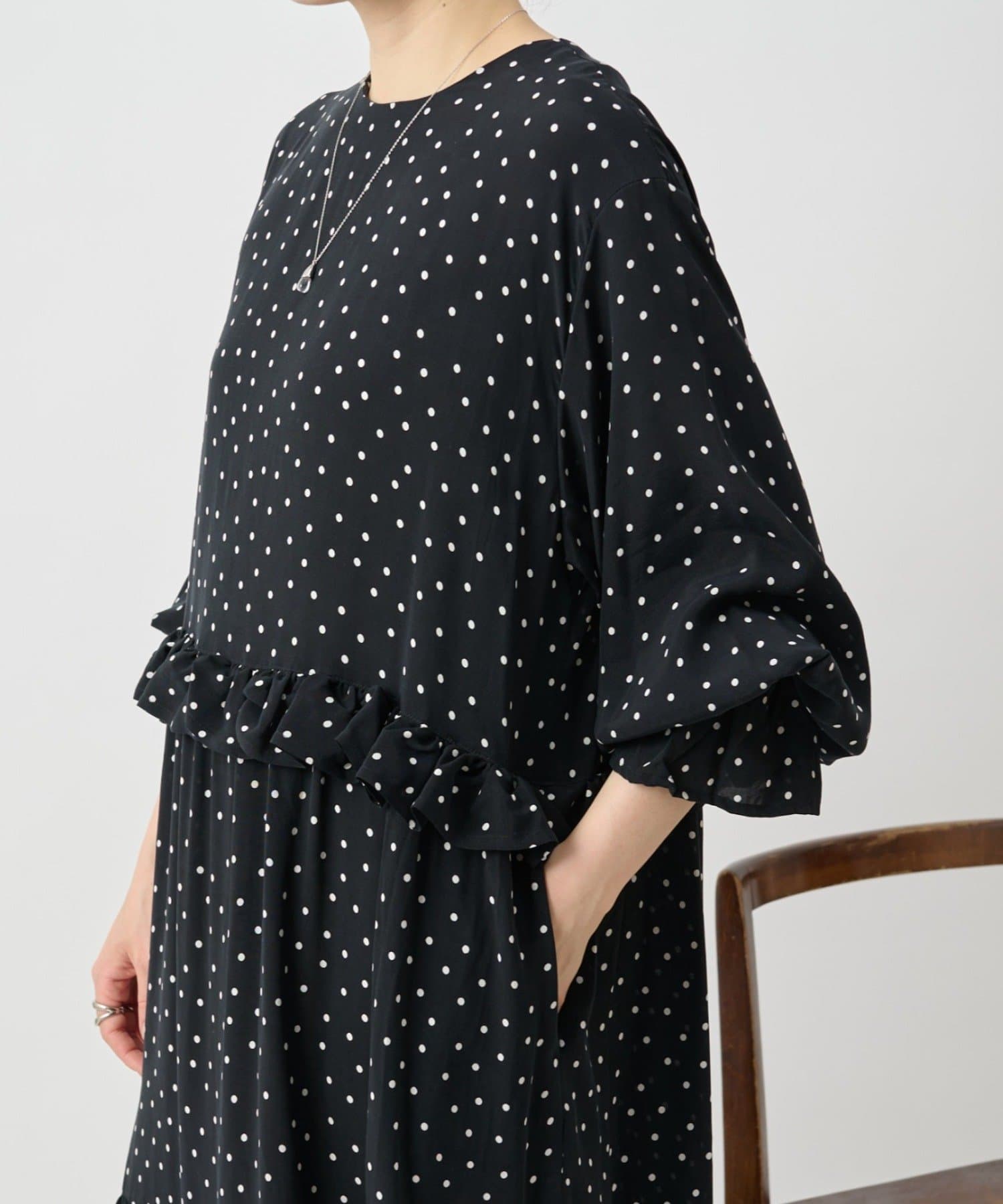 ランダムドット柄が目を惹く、華やかなフリルコンビワンピース。
